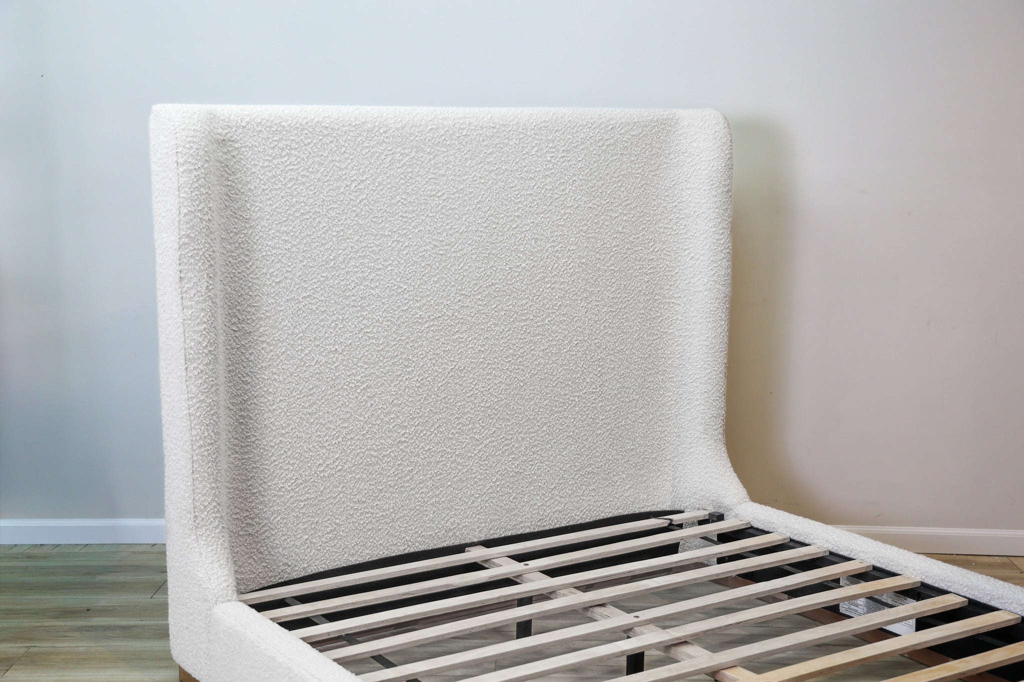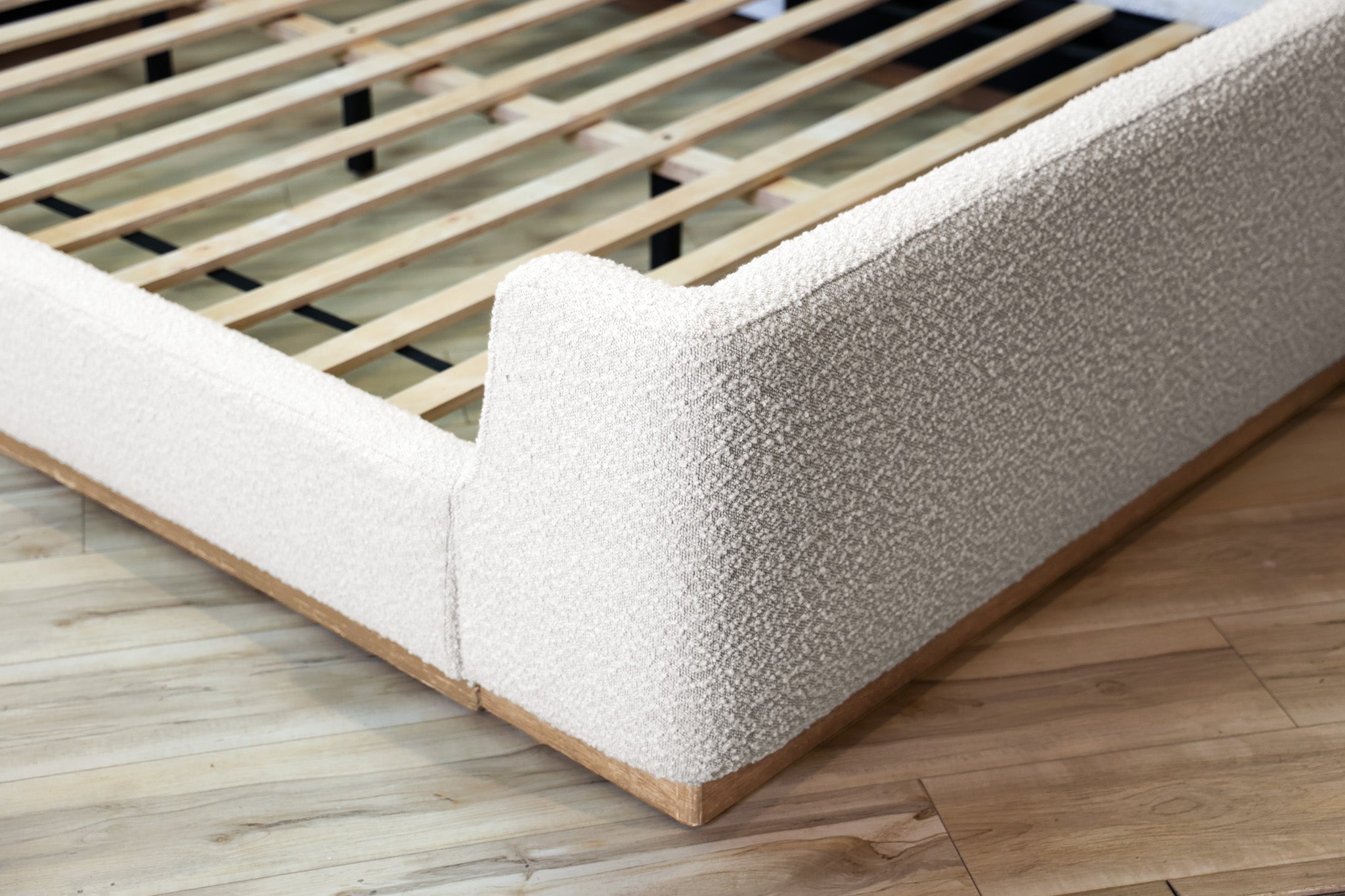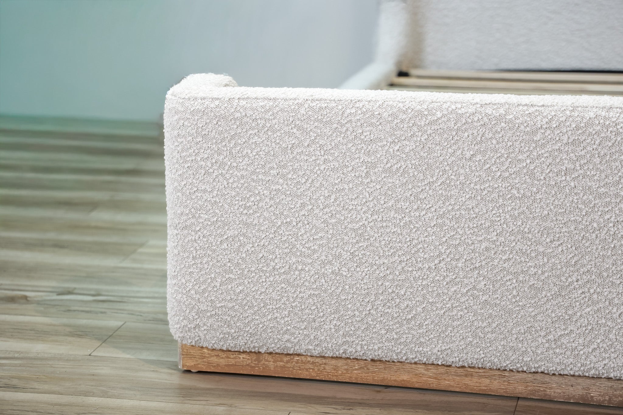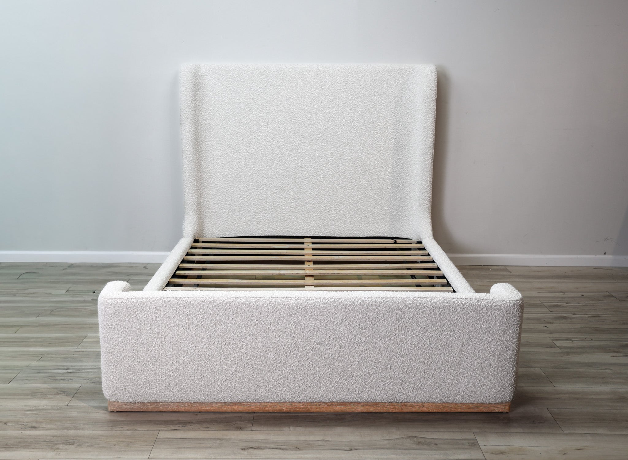 Sleek and modern lines with a touch of traditional charm, the Alan Sleigh bed takes a classic silhouette and brings it to the modern age with a light boucle performance fabric. The touch of oak finished wood at the base also brings in an organic touch and warmth to the bed design, making it bold without being overstated! Available in King and Queen sizes, complete you bedroom space today with the Alan Sleigh Bed!