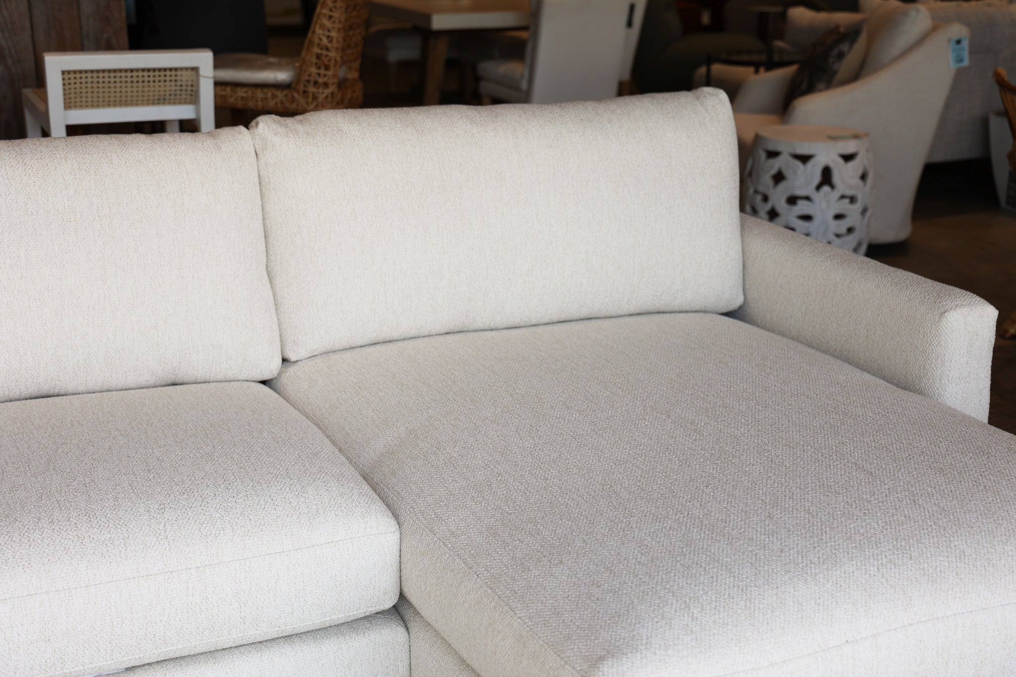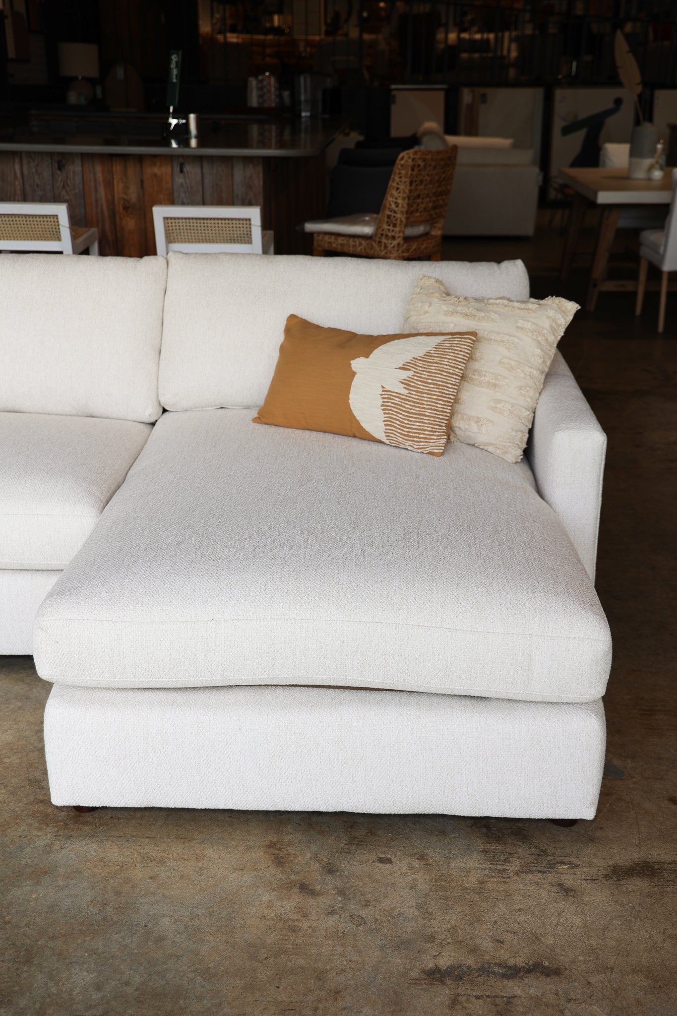 Luxurious Revolution performance fabric offers both peace of mind, durability, and ultimate comfort and feel. A warm white color offers a welcoming embrace with its boucle texture adds an extra layer of style and comfort. Modular in thousands on configurations to make it work best for you and your space. The Allure dreamy can also be customized in a variety of fabrics and other modifications to make it work best for YOU. Make your space absolutely dreamy today.