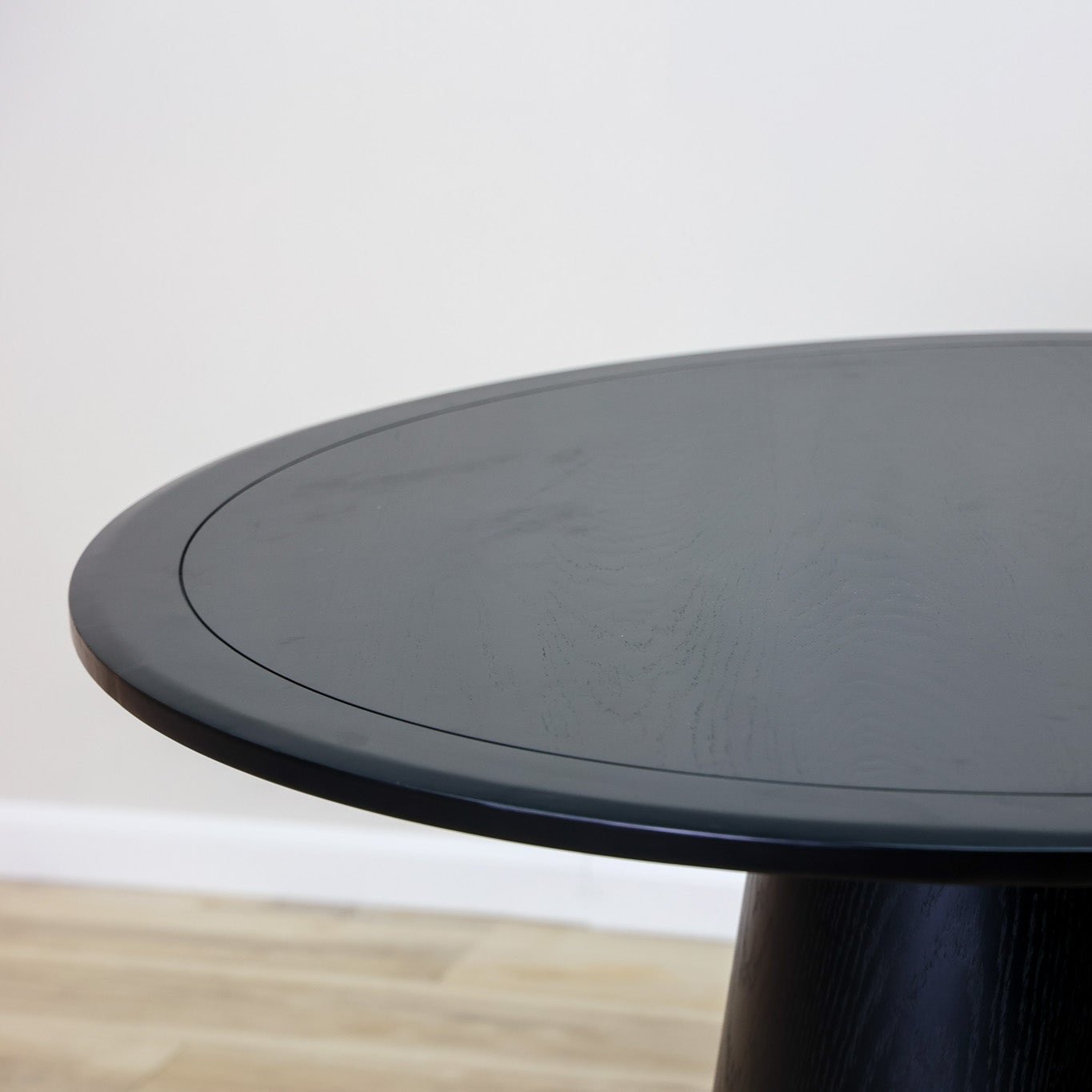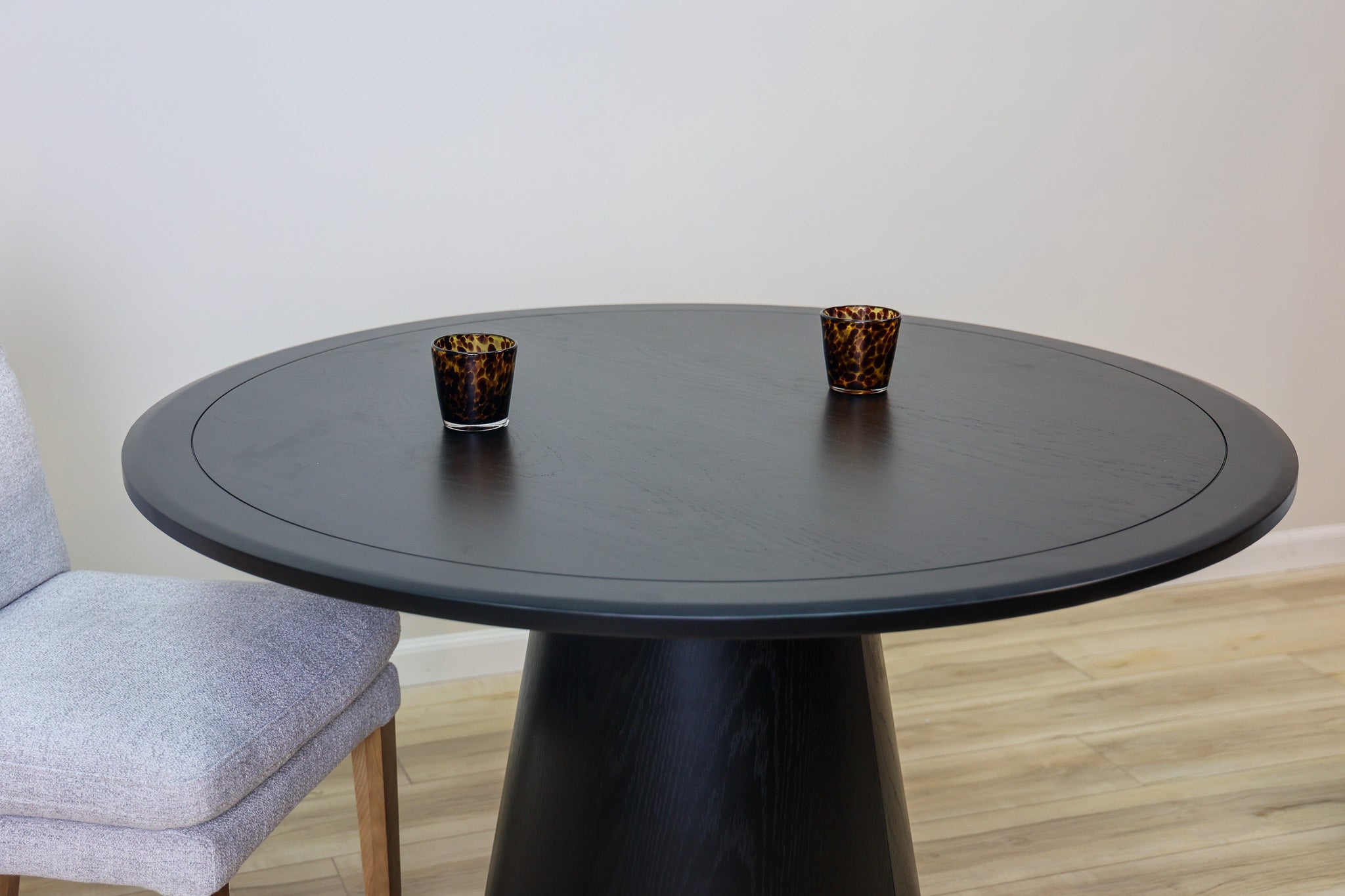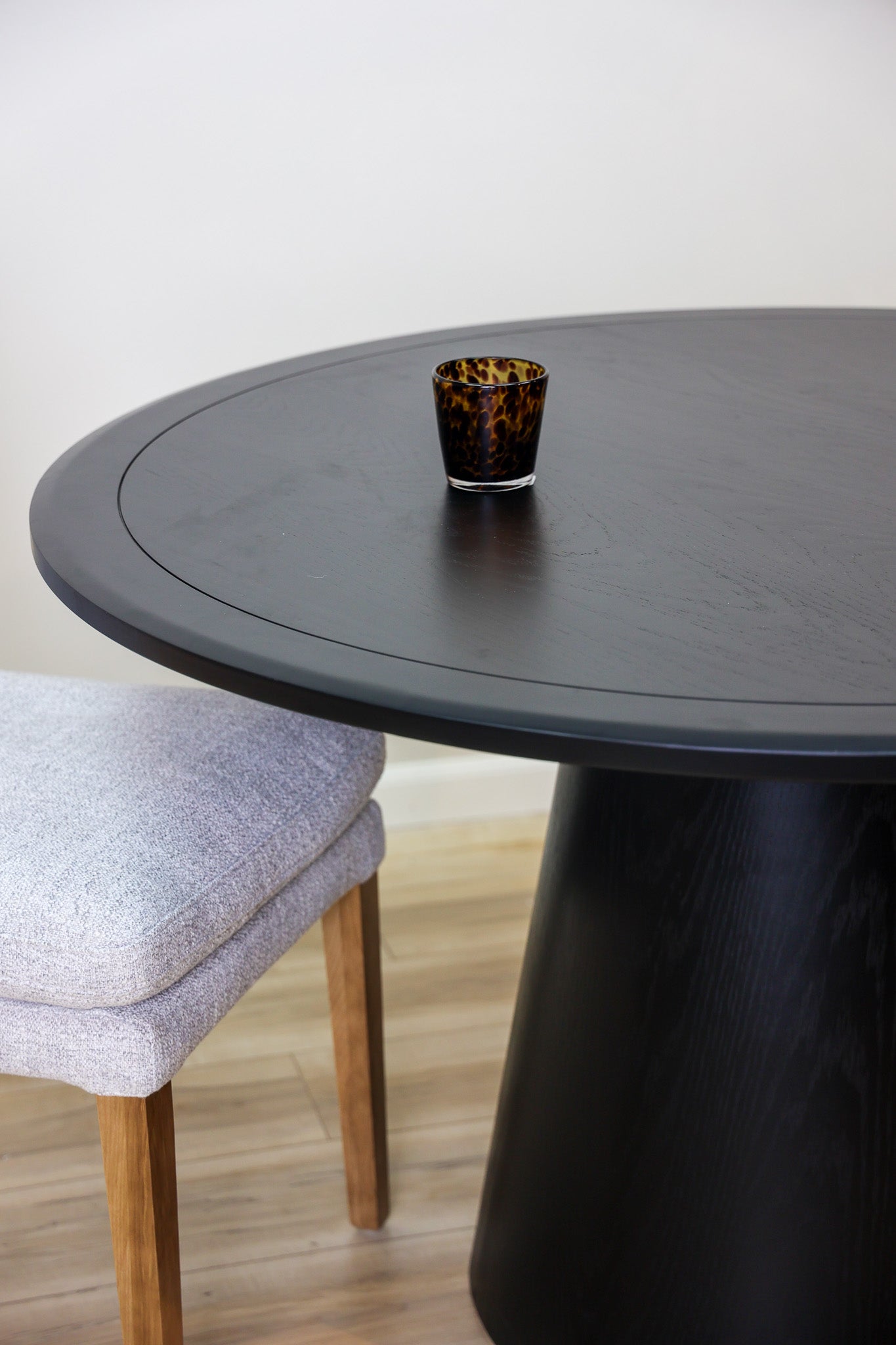 This Bridget Round Dining Table features a sleek black pedestal base, offering a modern and sophisticated aesthetic to any dining space. Its round shape allows for easy conversation and flow, making it a great addition to any social setting. Expertly crafted, this table is both stylish and functional.