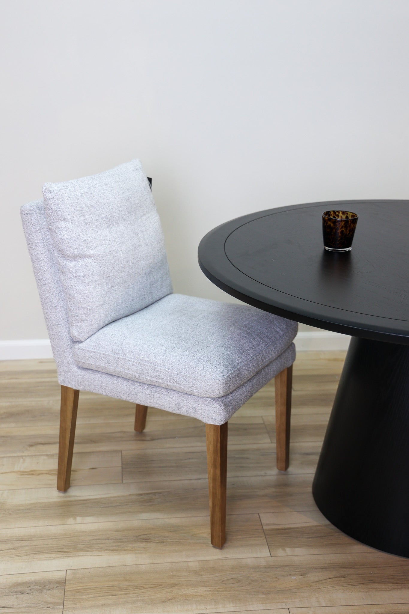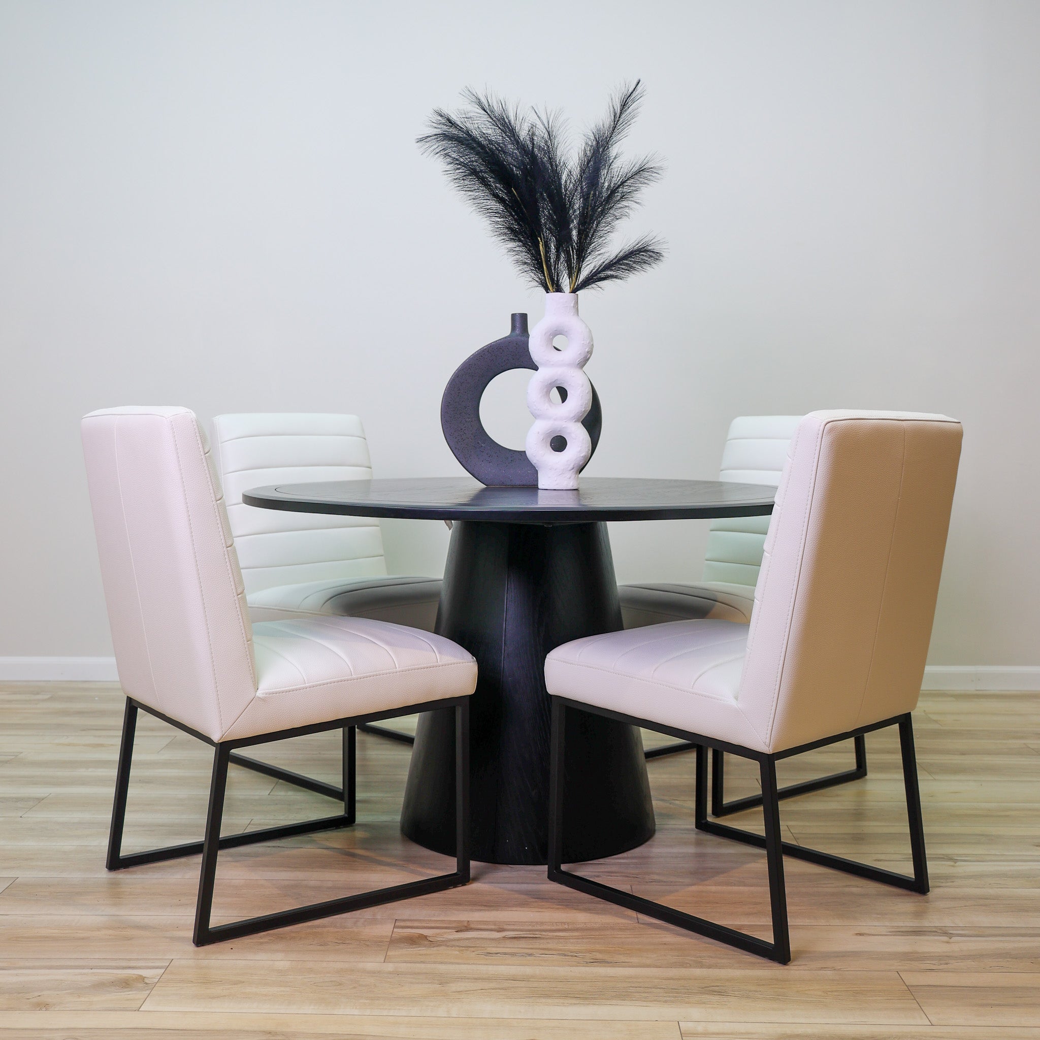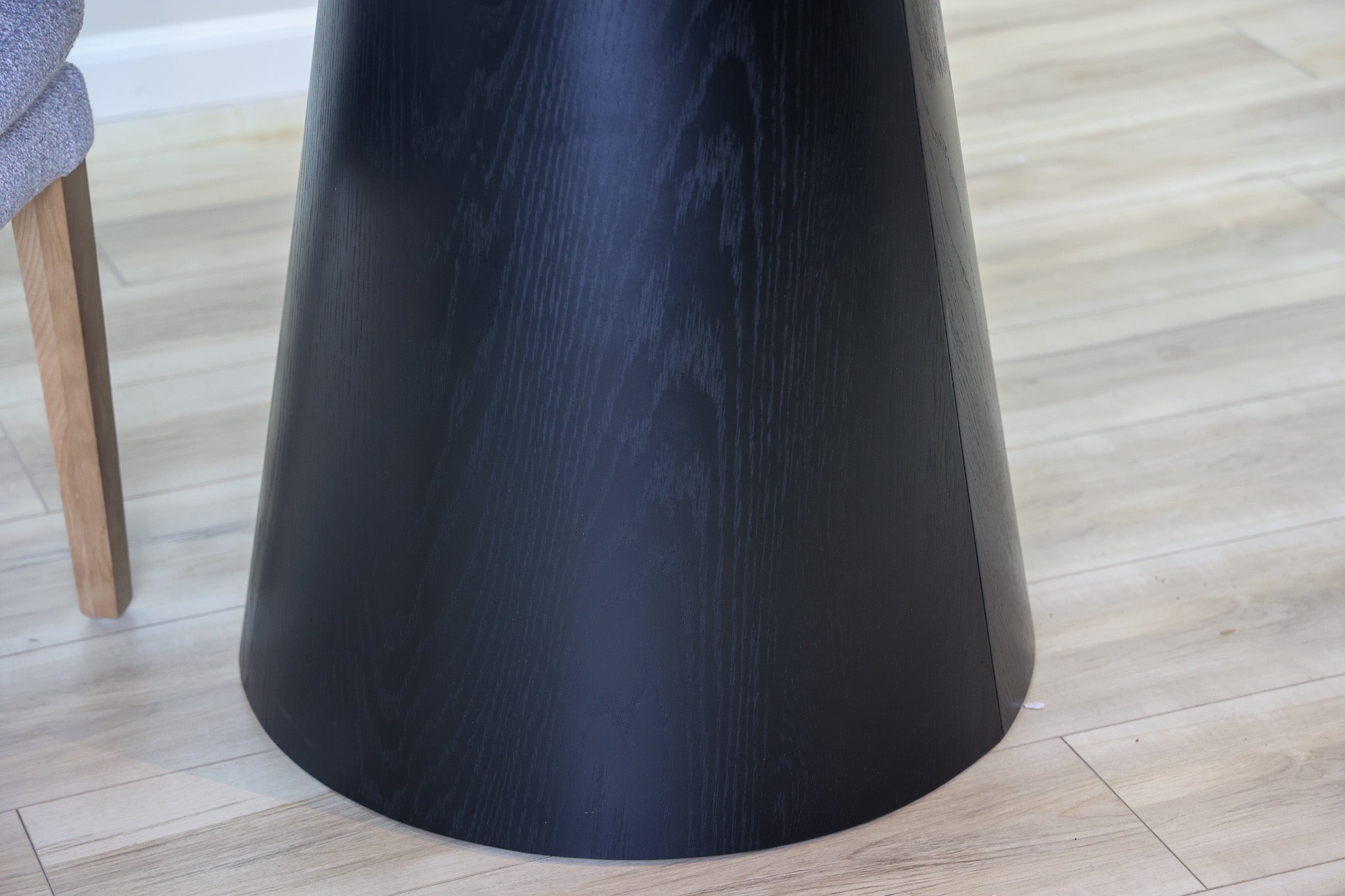 This Bridget Round Dining Table features a sleek black pedestal base, offering a modern and sophisticated aesthetic to any dining space. Its round shape allows for easy conversation and flow, making it a great addition to any social setting. Expertly crafted, this table is both stylish and functional.