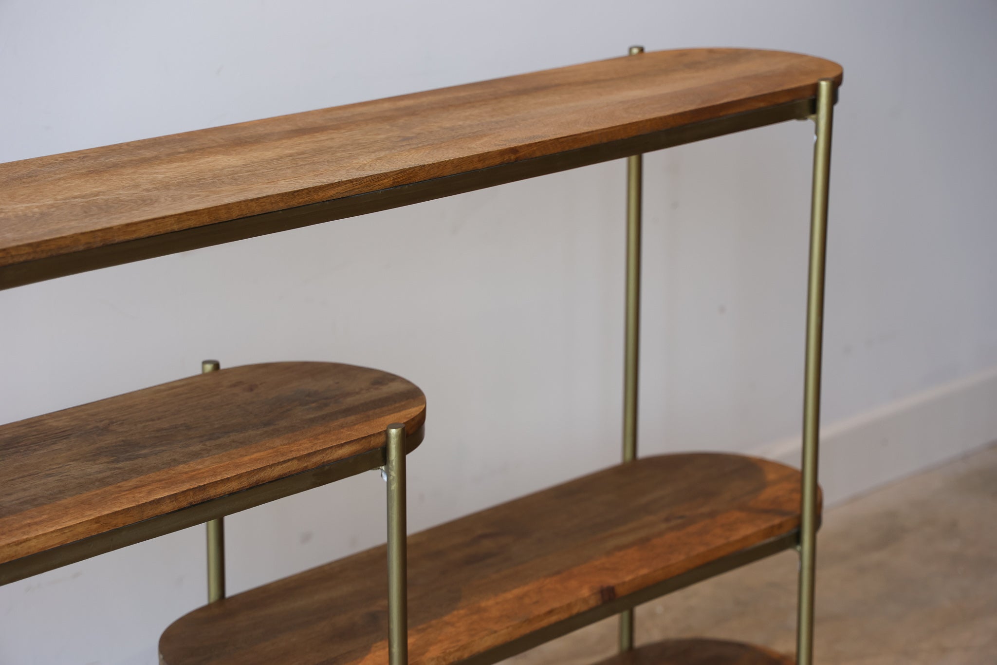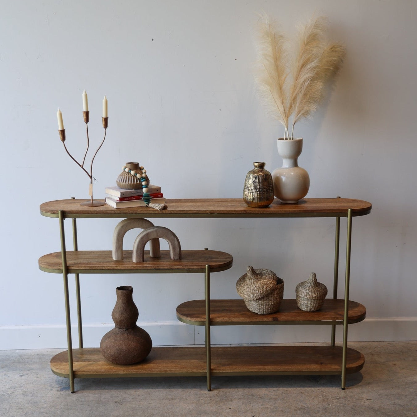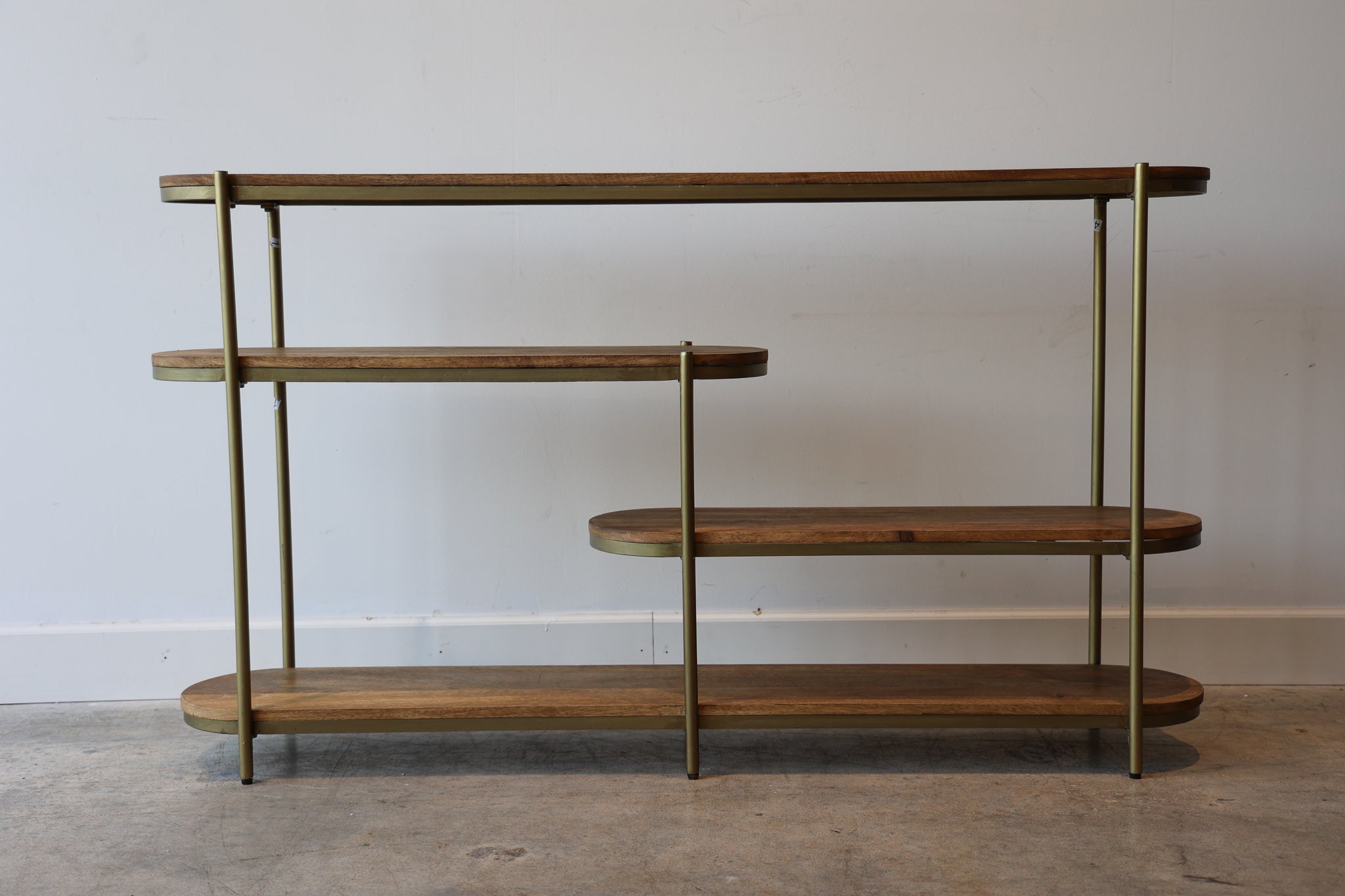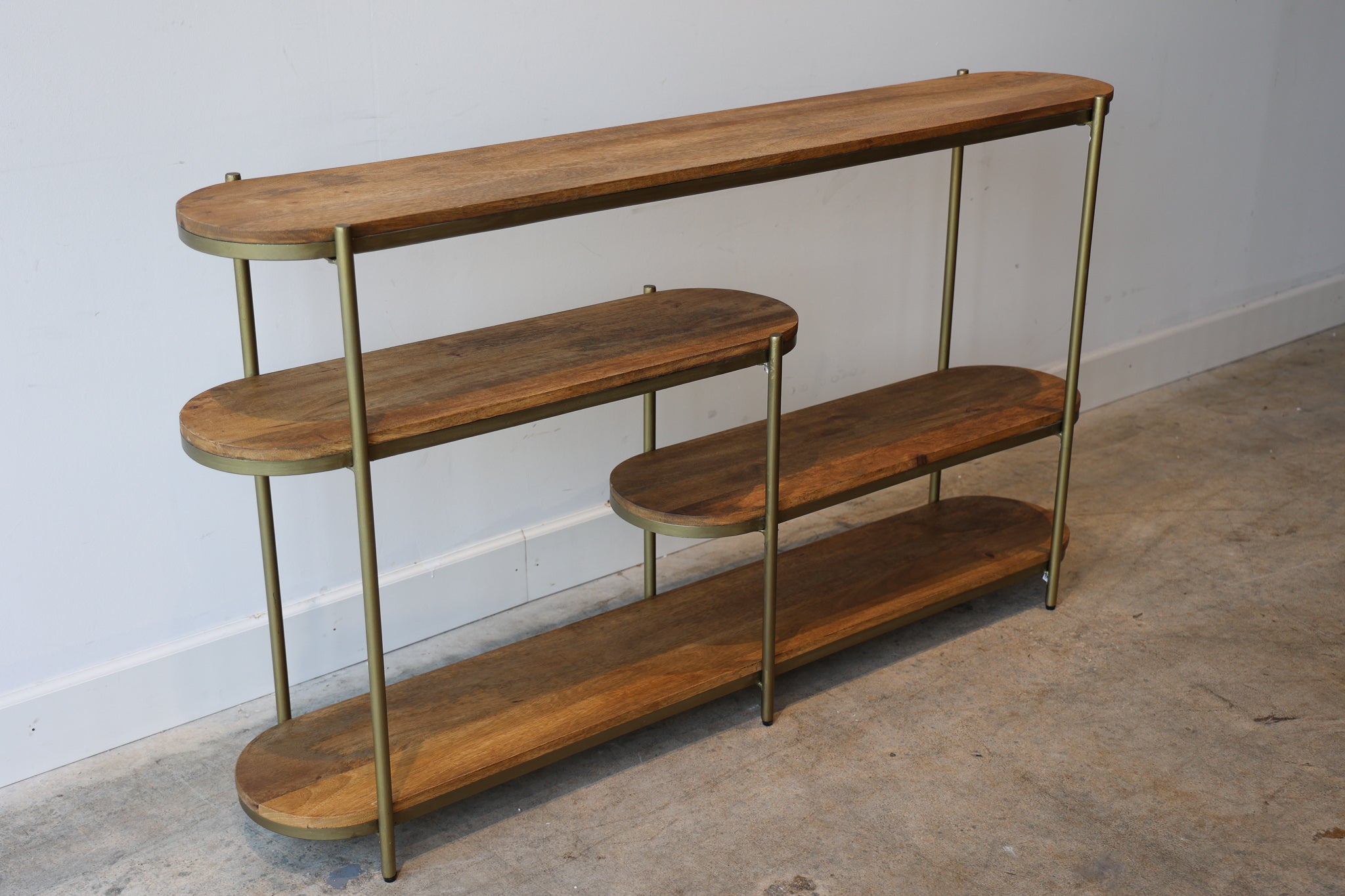Spruce up your space with this chic Callie Wood & Gold Metal Console table. Build out the display of your dreams with the varying heights of the curved wood shelves, made to put all of your favorite vases, pictures and plants on.
