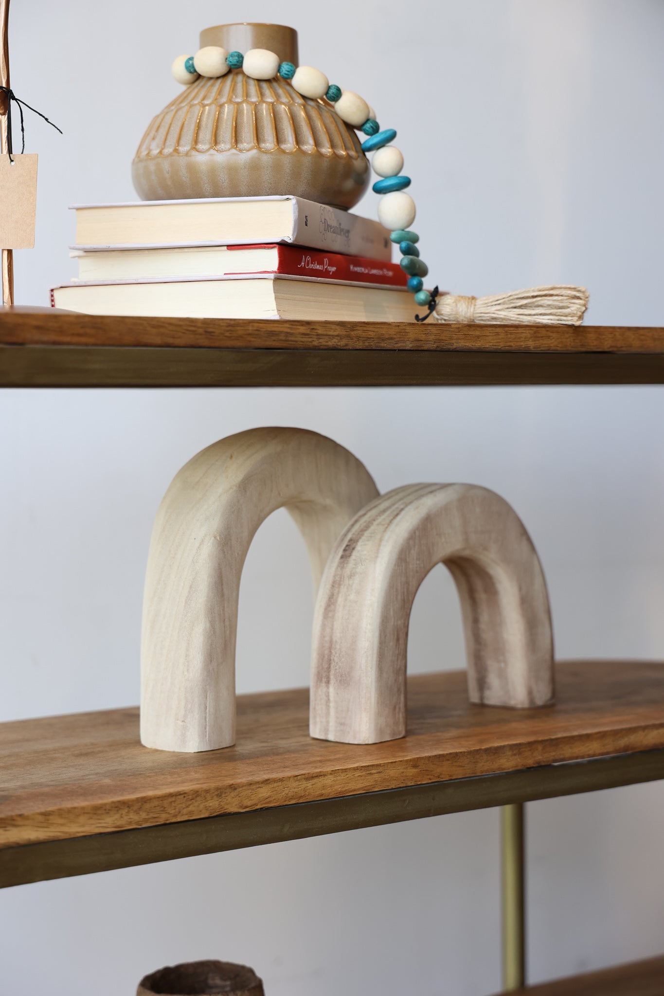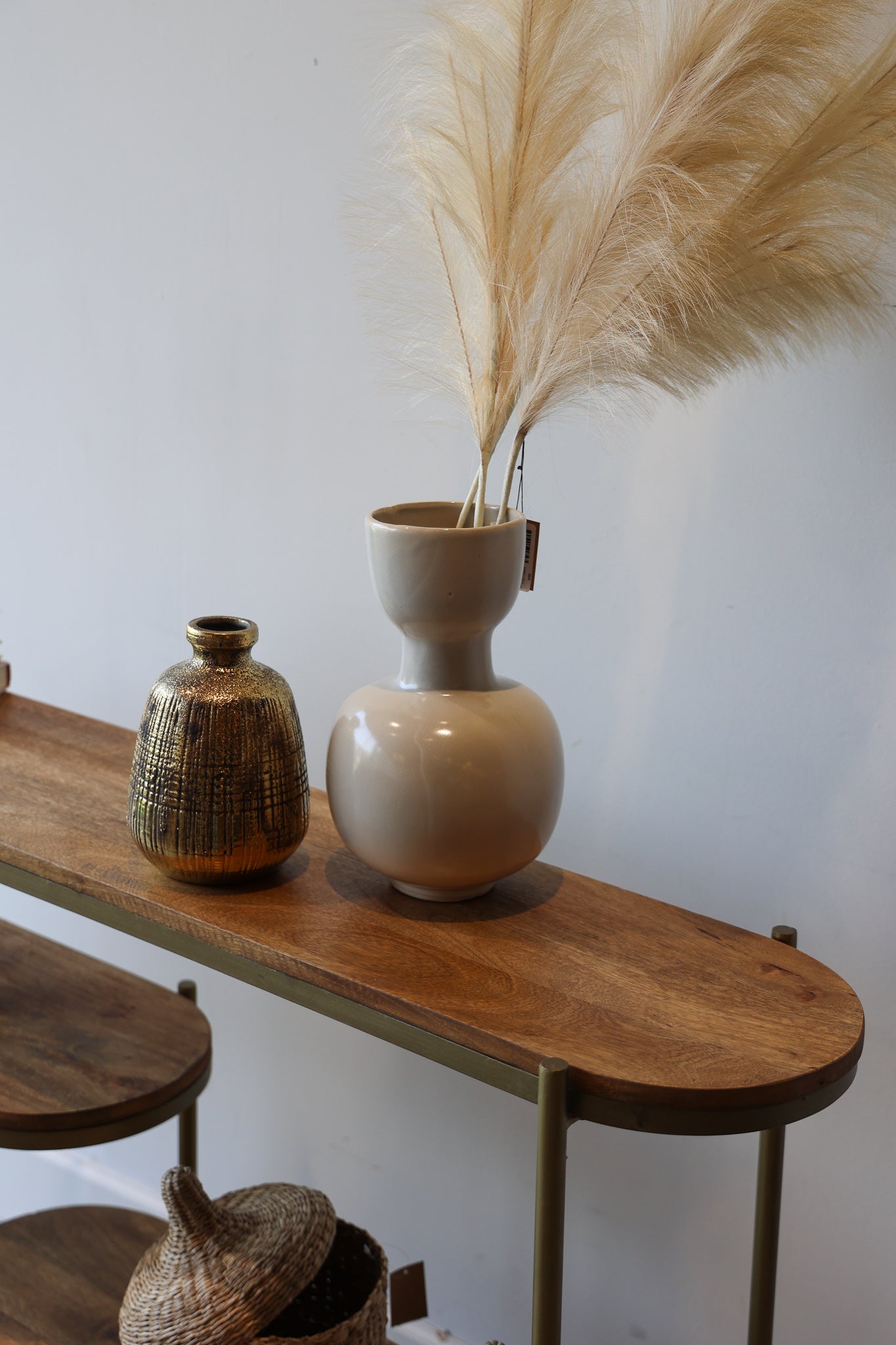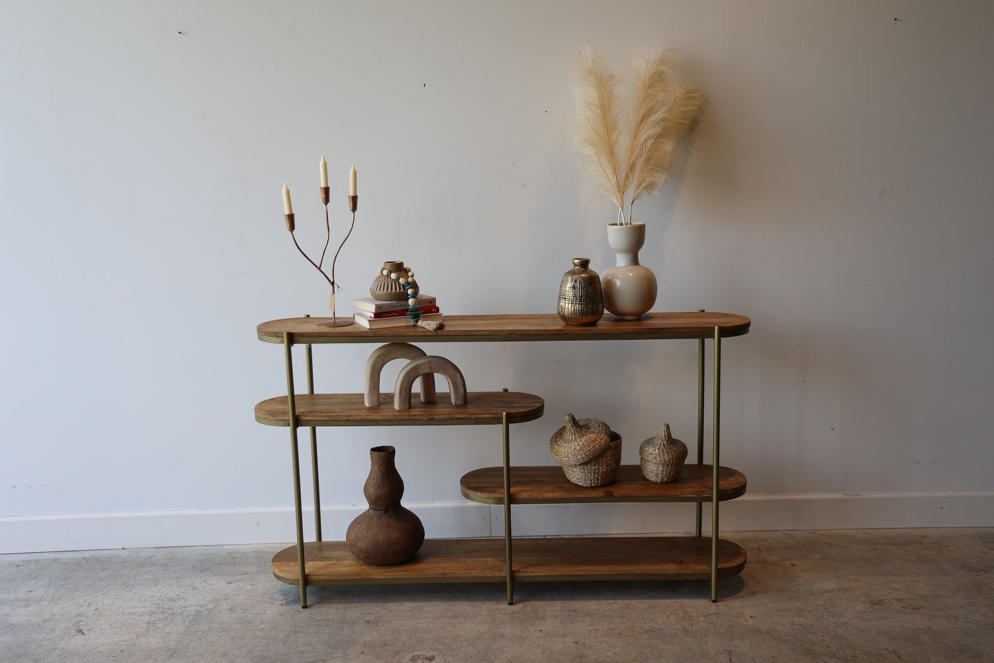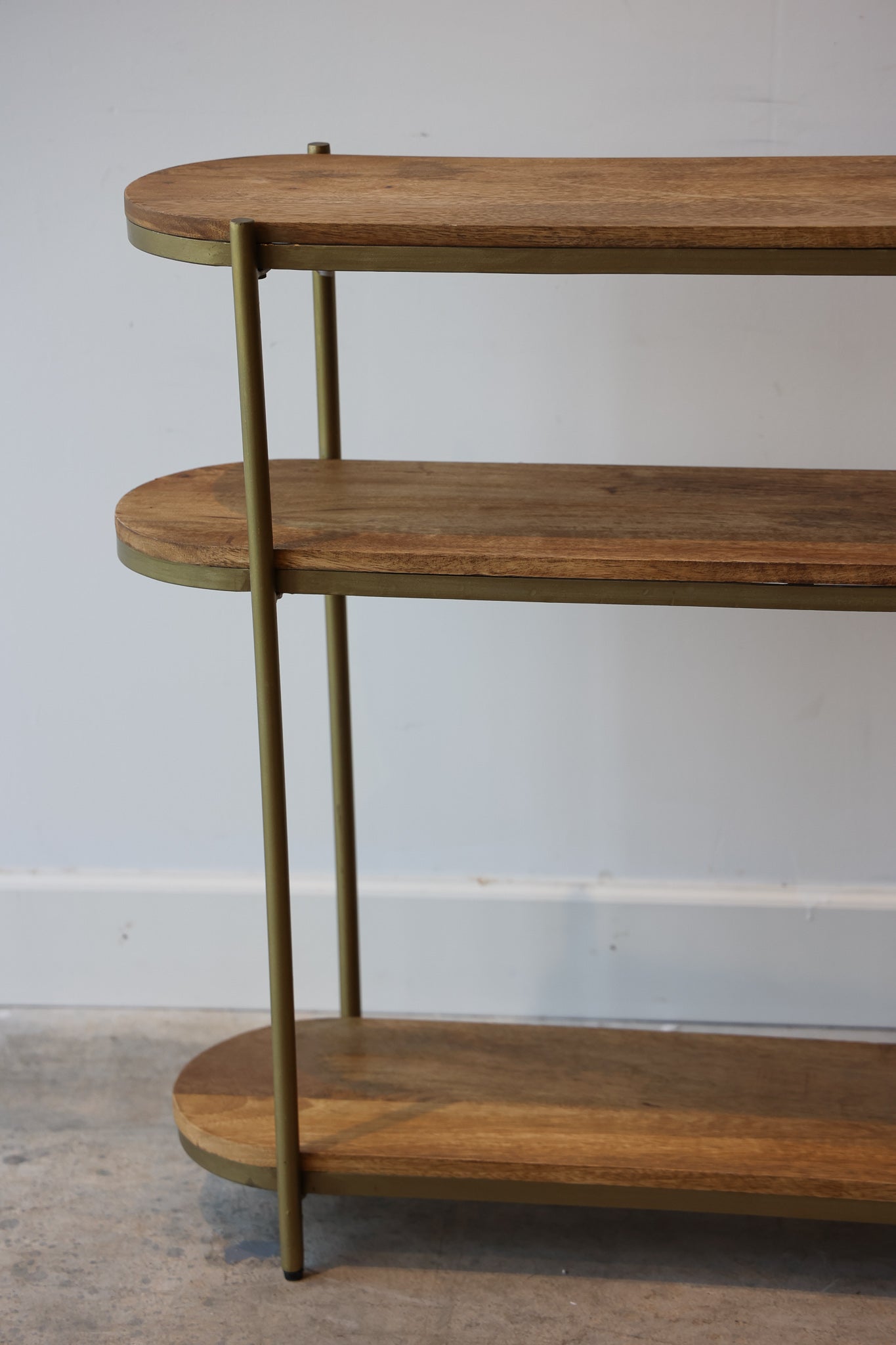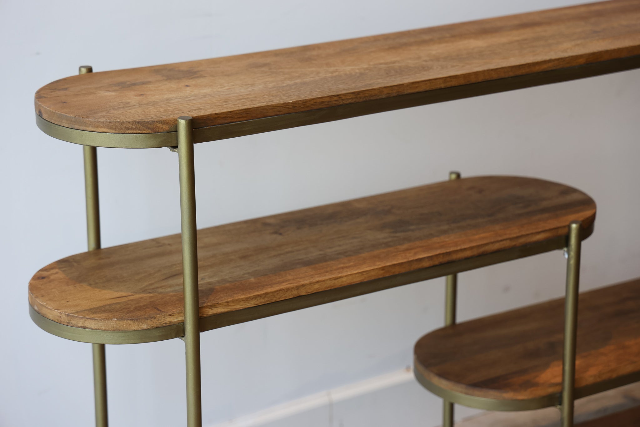 Spruce up your space with this chic Callie Wood & Gold Metal Console table. Build out the display of your dreams with the varying heights of the curved wood shelves, made to put all of your favorite vases, pictures and plants on.