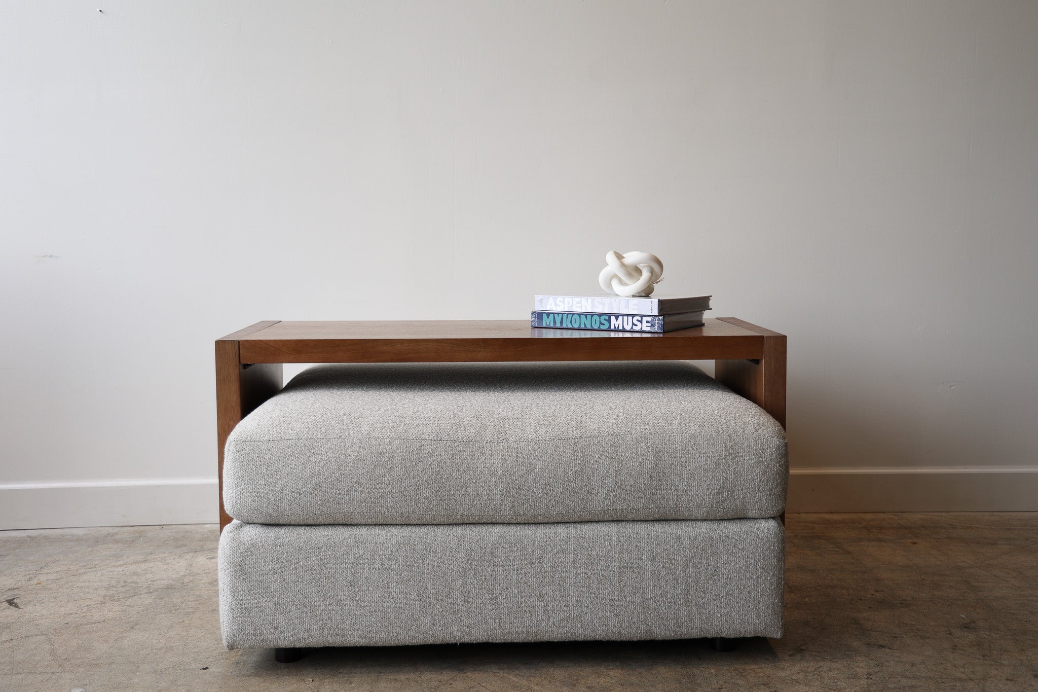 This Dark Wood Over Ottoman Table is an original design from Dwell, made with solid wood and equipped with wheels for added functionality. Sleek and well-made, it offers a stylish and practical addition to any living space. Transform your ottoman into a versatile surface for work or relaxation with this elegant and expertly crafted piece.