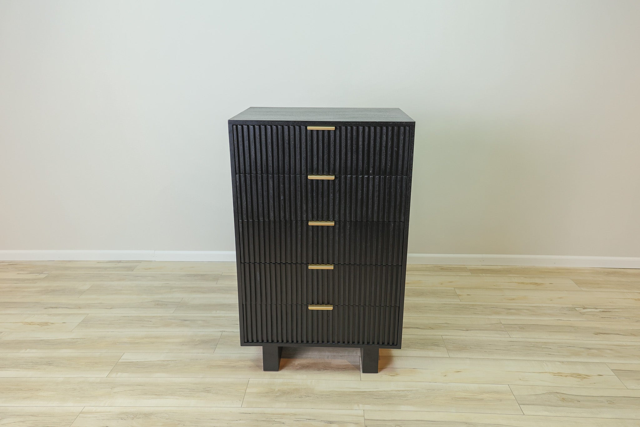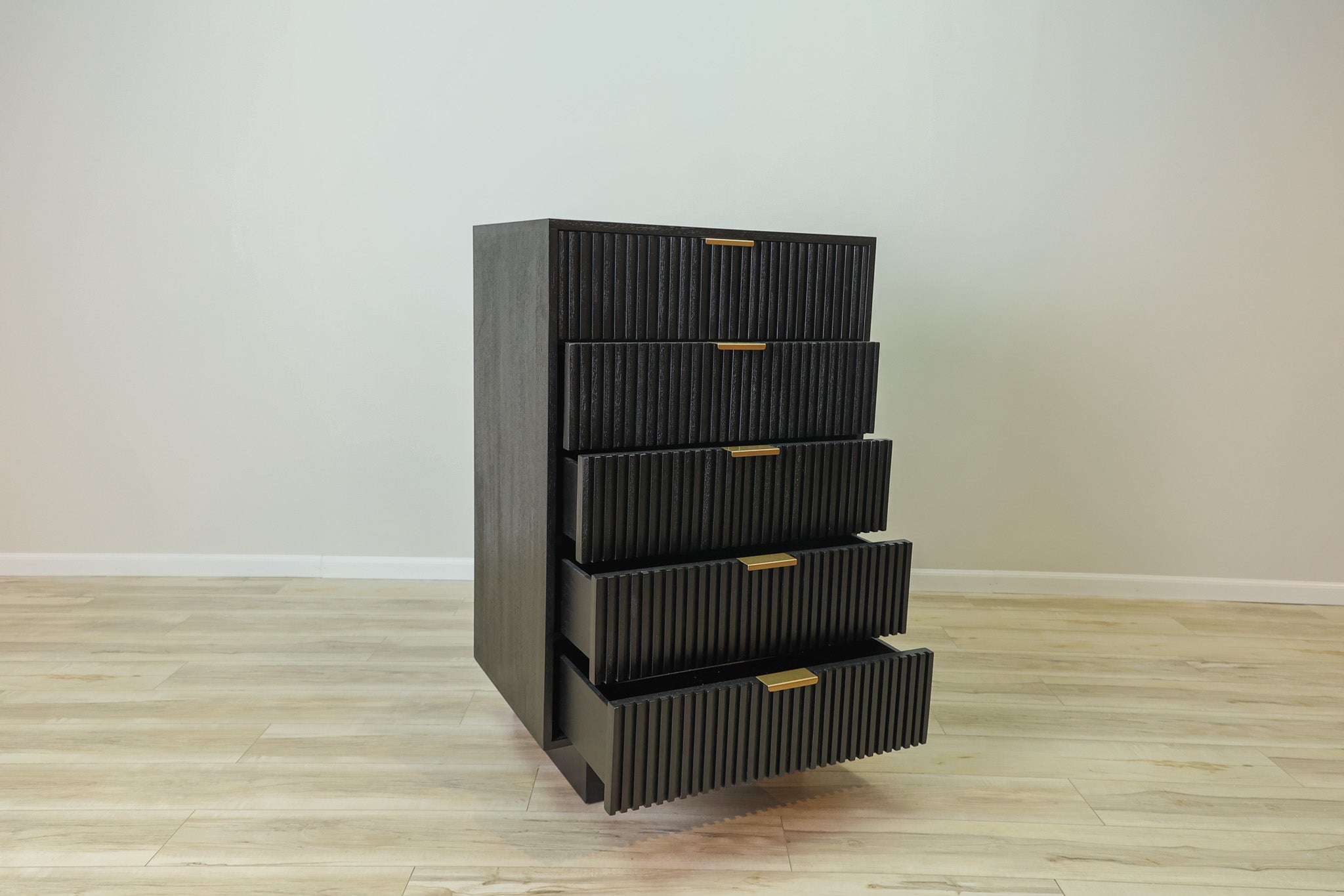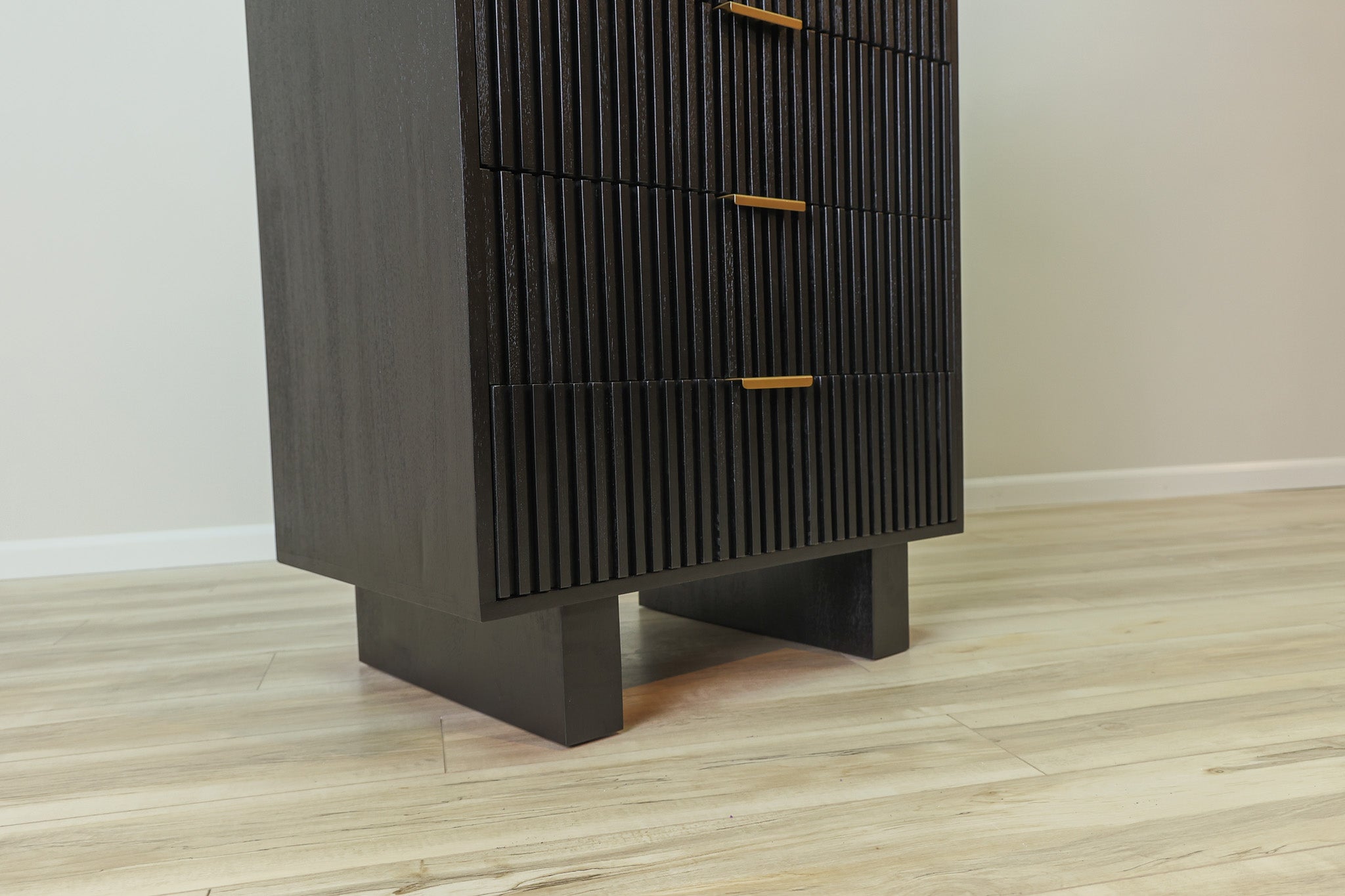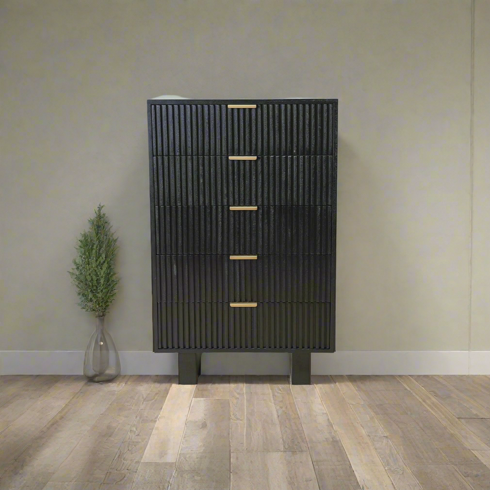 Maximize your storage space with the Dunn Chest. This sleek and sophisticated chest features black fluted soft close drawers, providing a modern touch to your bedroom. Enjoy the convenience of a quiet closure, while keeping your items organized and easily accessible.