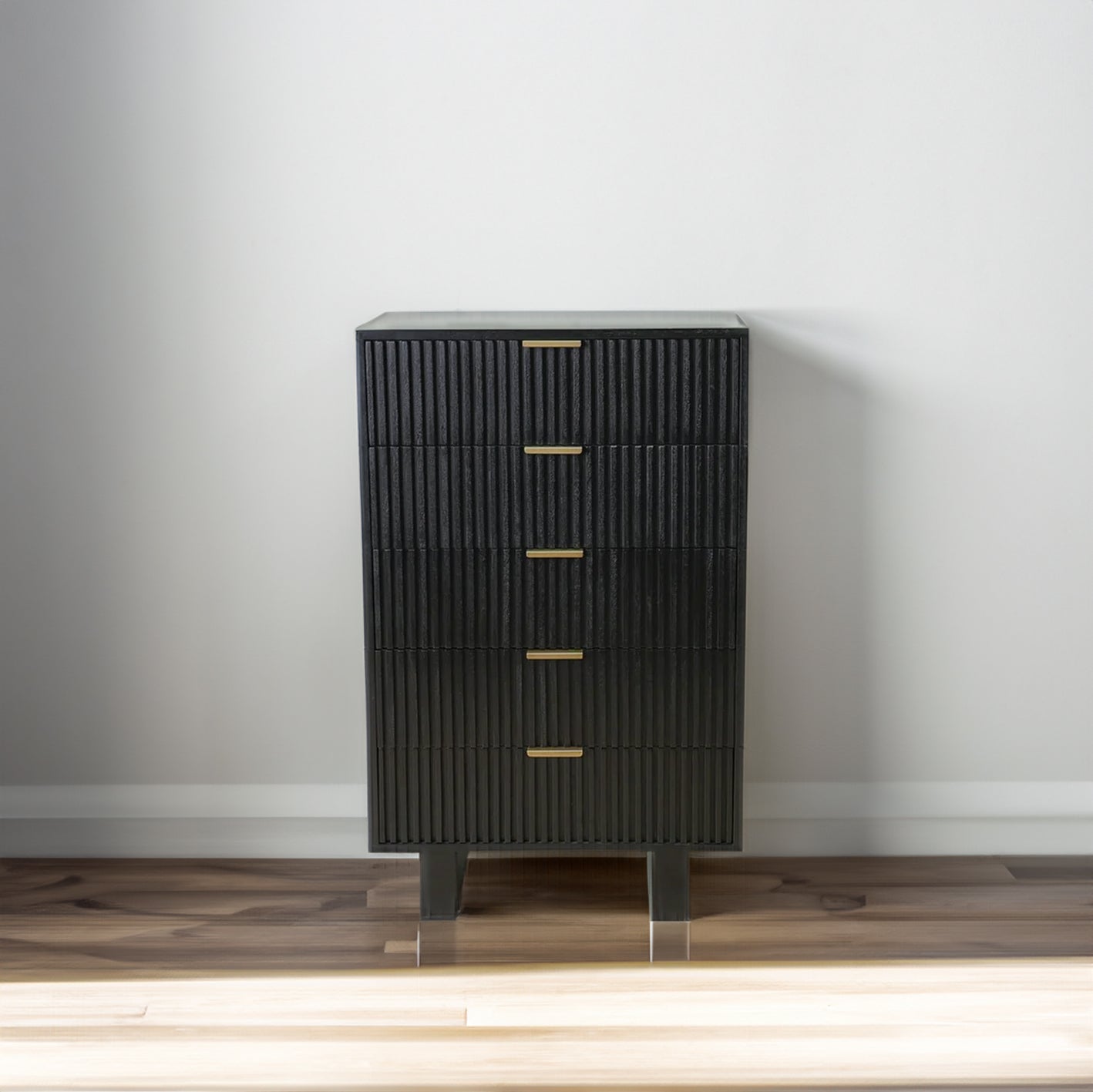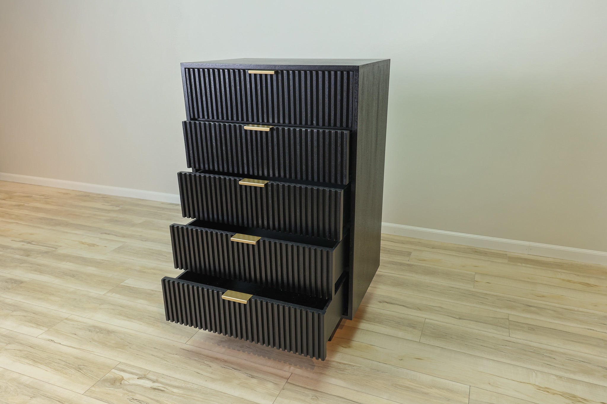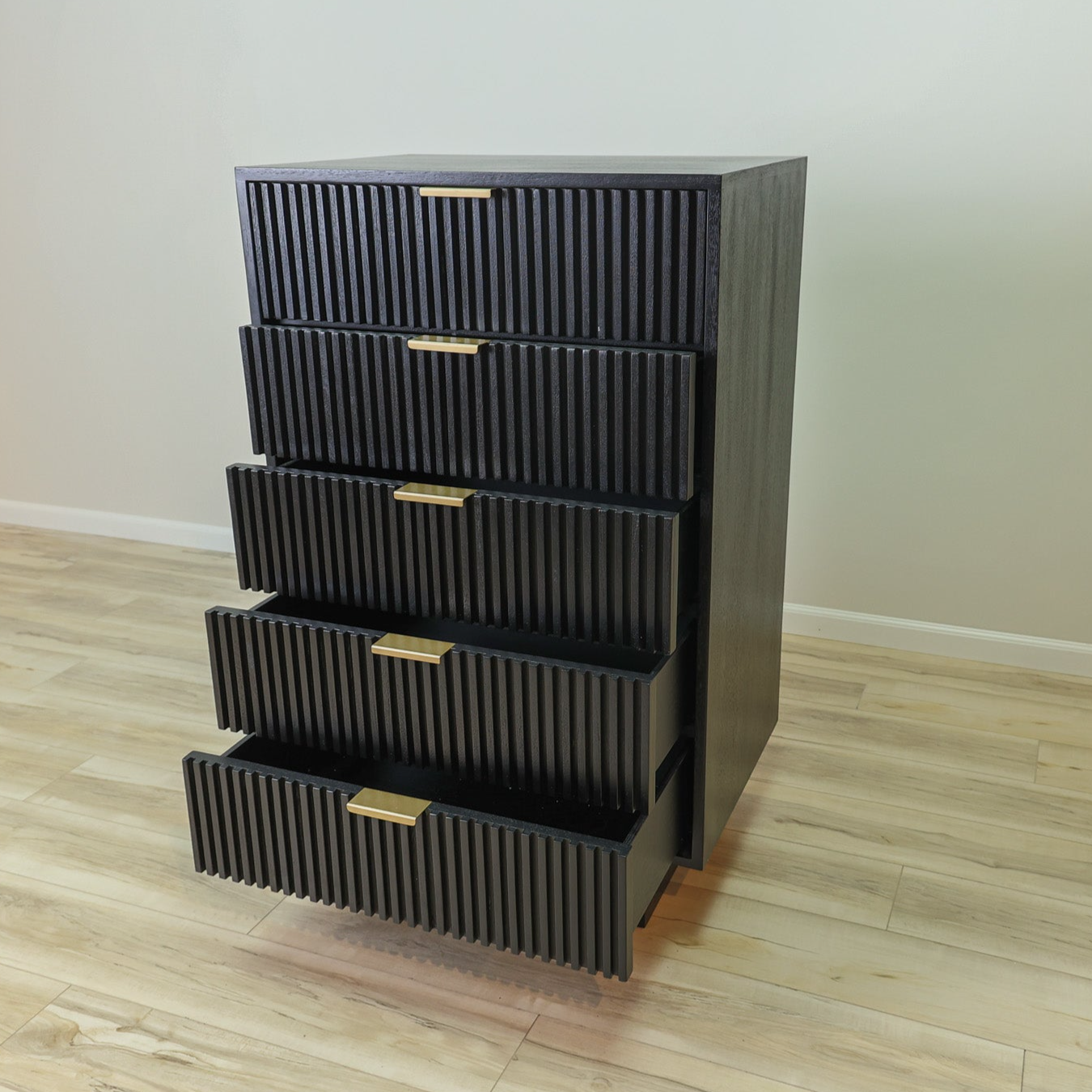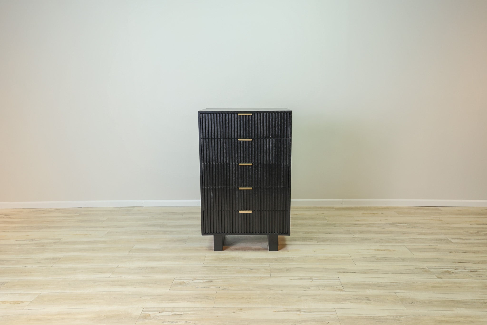 Maximize your storage space with the Dunn Chest. This sleek and sophisticated chest features black fluted soft close drawers, providing a modern touch to your bedroom. Enjoy the convenience of a quiet closure, while keeping your items organized and easily accessible.