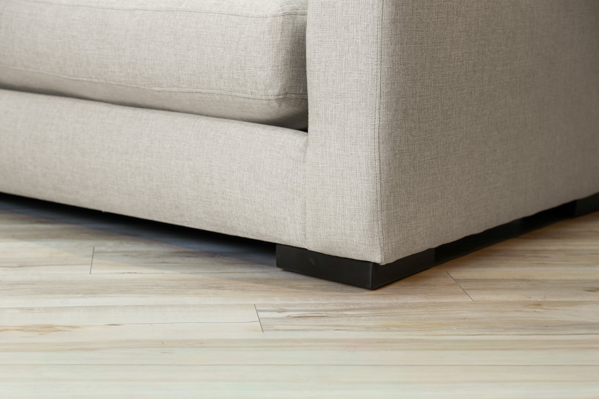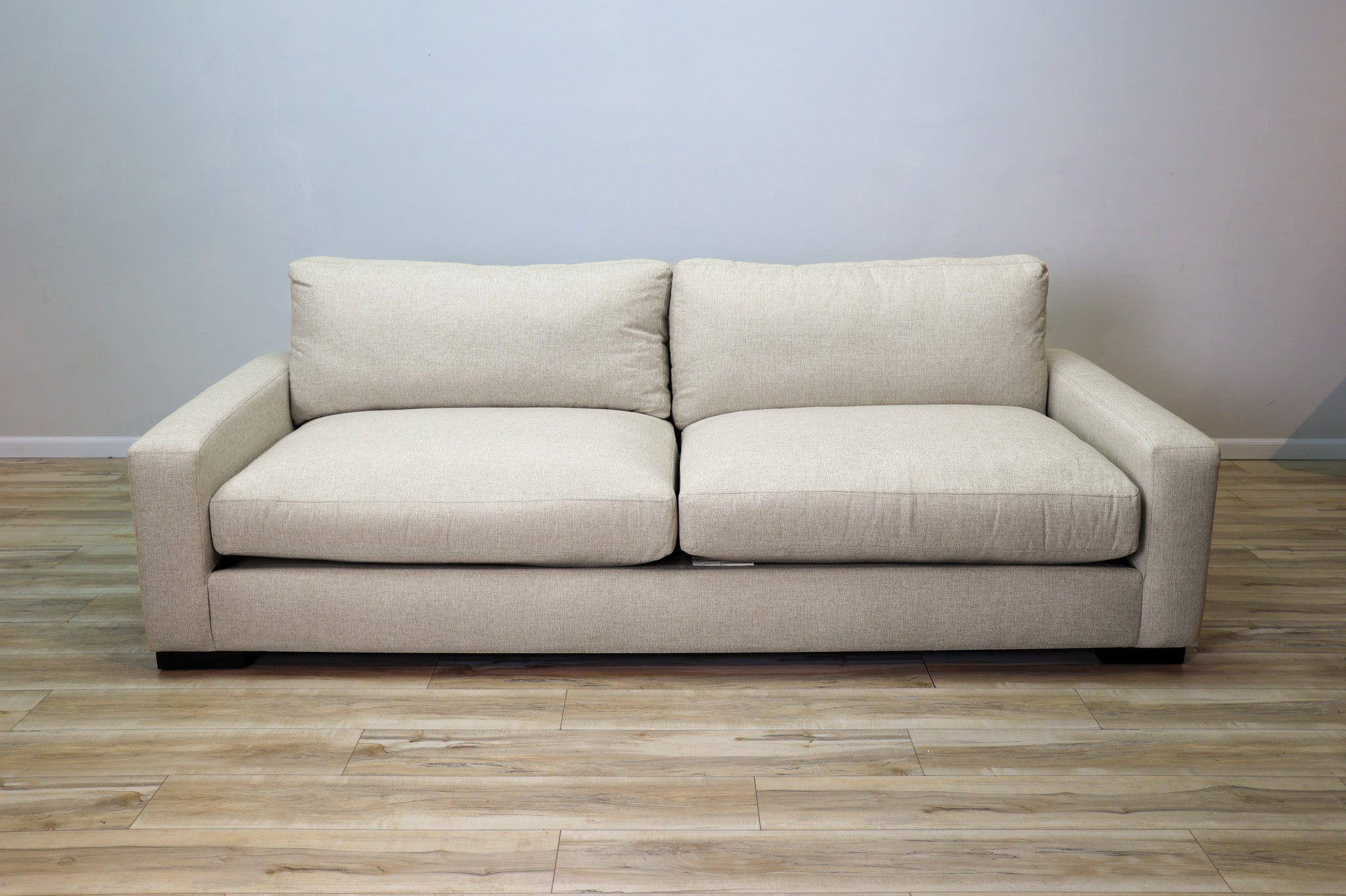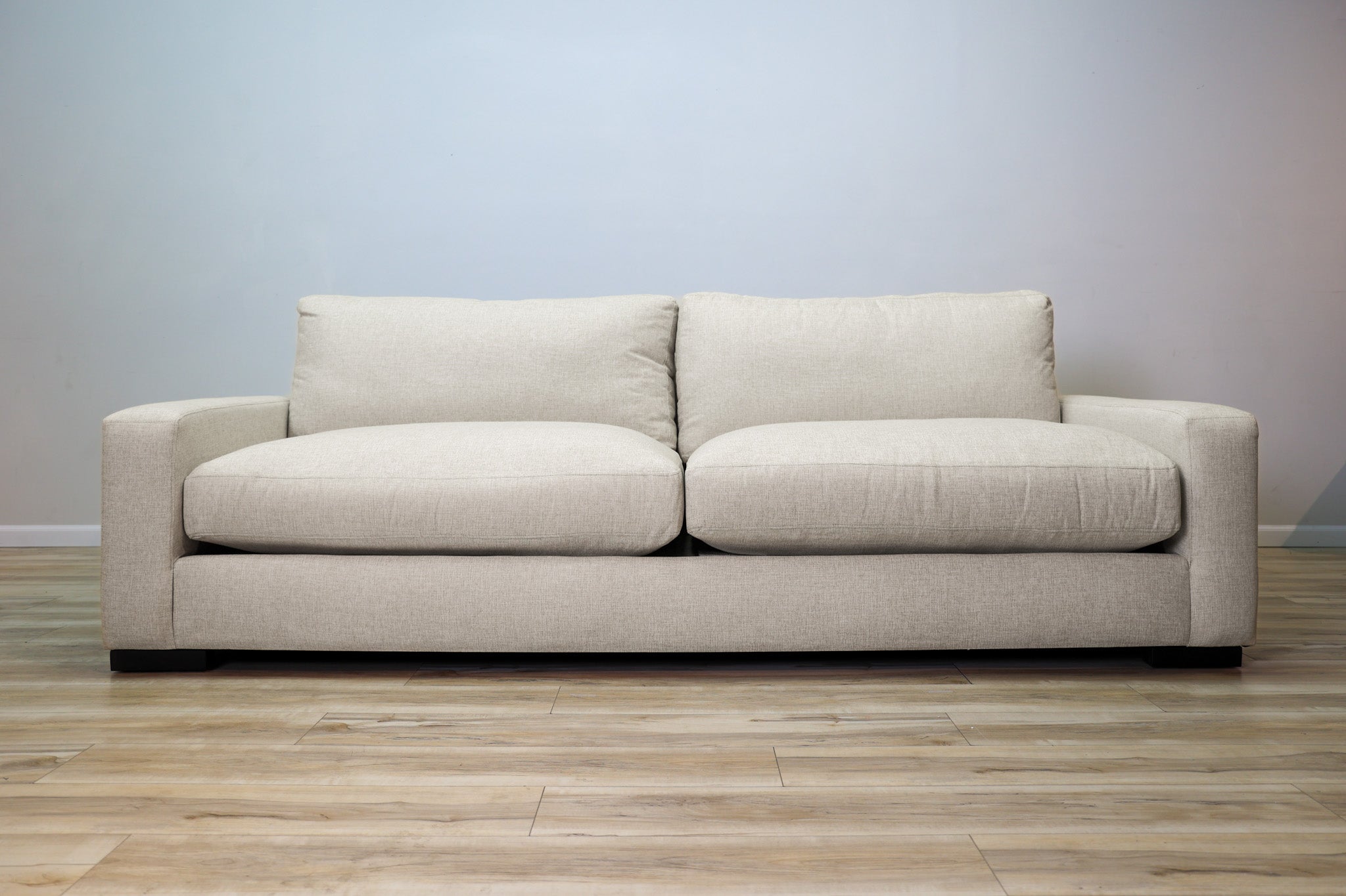 A deep, large, clean lined, and modern sofa with plush cushions you wont want to get up from! Covered in a Revolution fabric that will stand the test against everyday wear and stains. Wrapped in an elegant linen colored fabric that will bring a touch of warmth to your living space, make the Everest sofa apart of your space today!