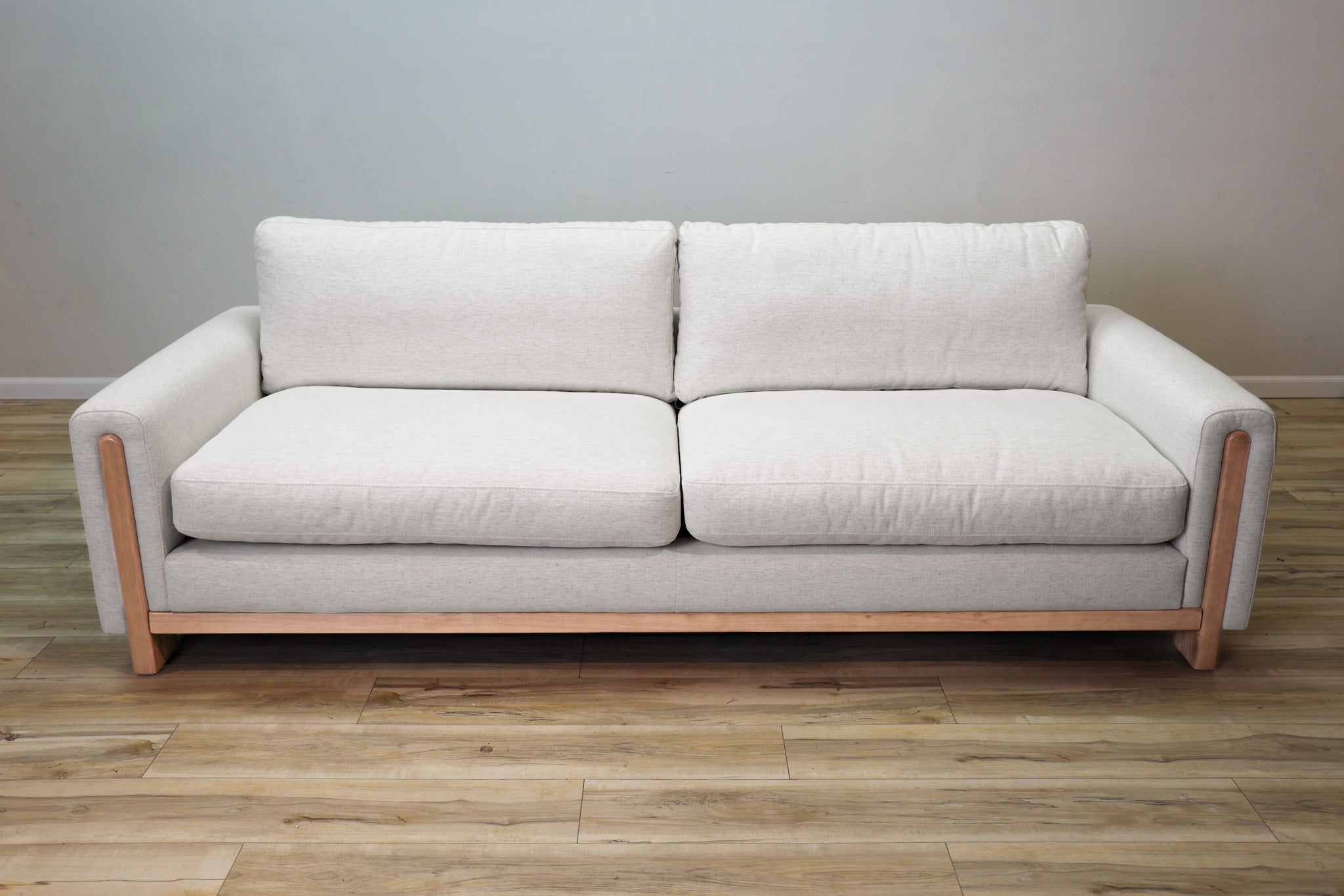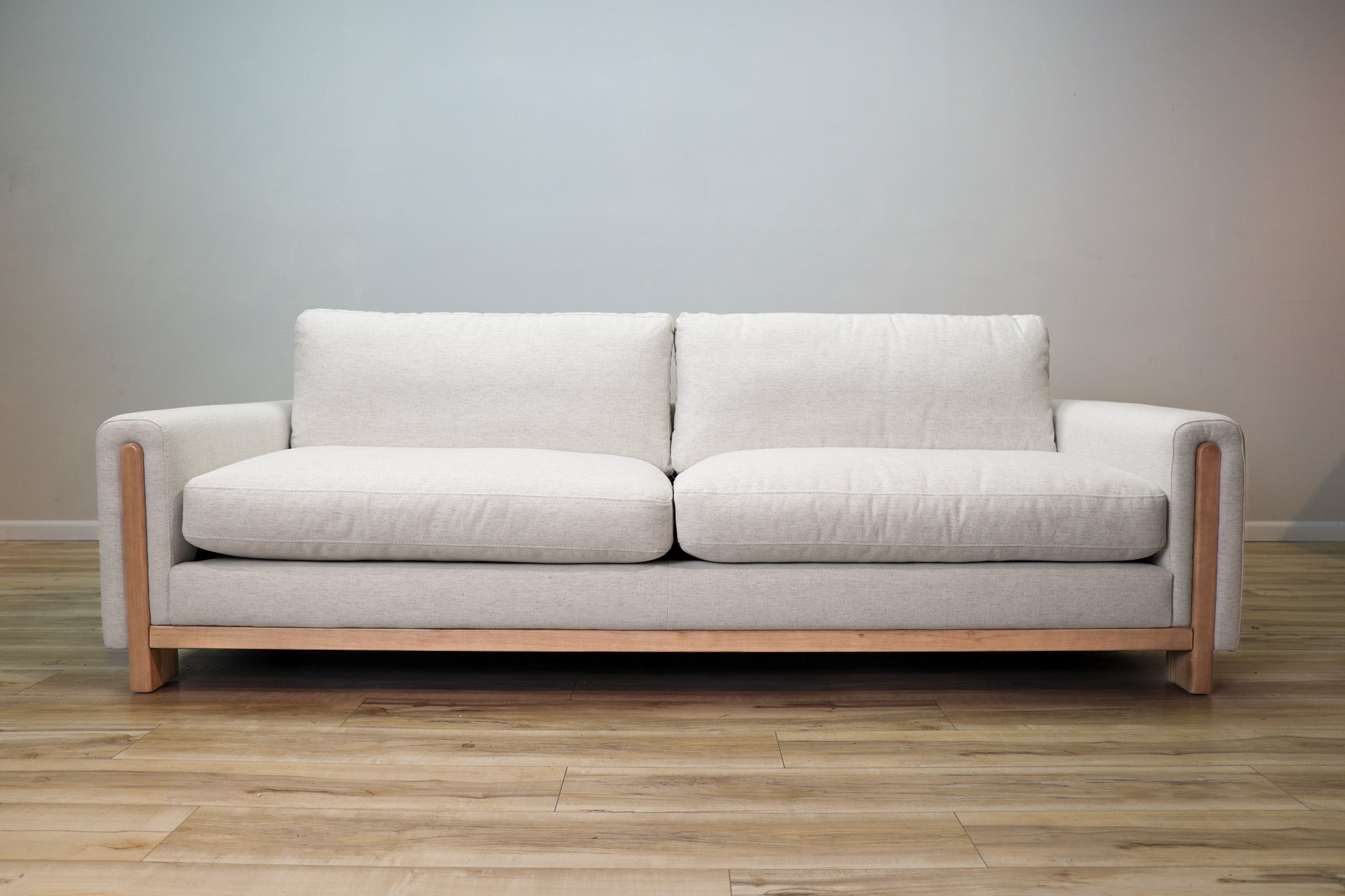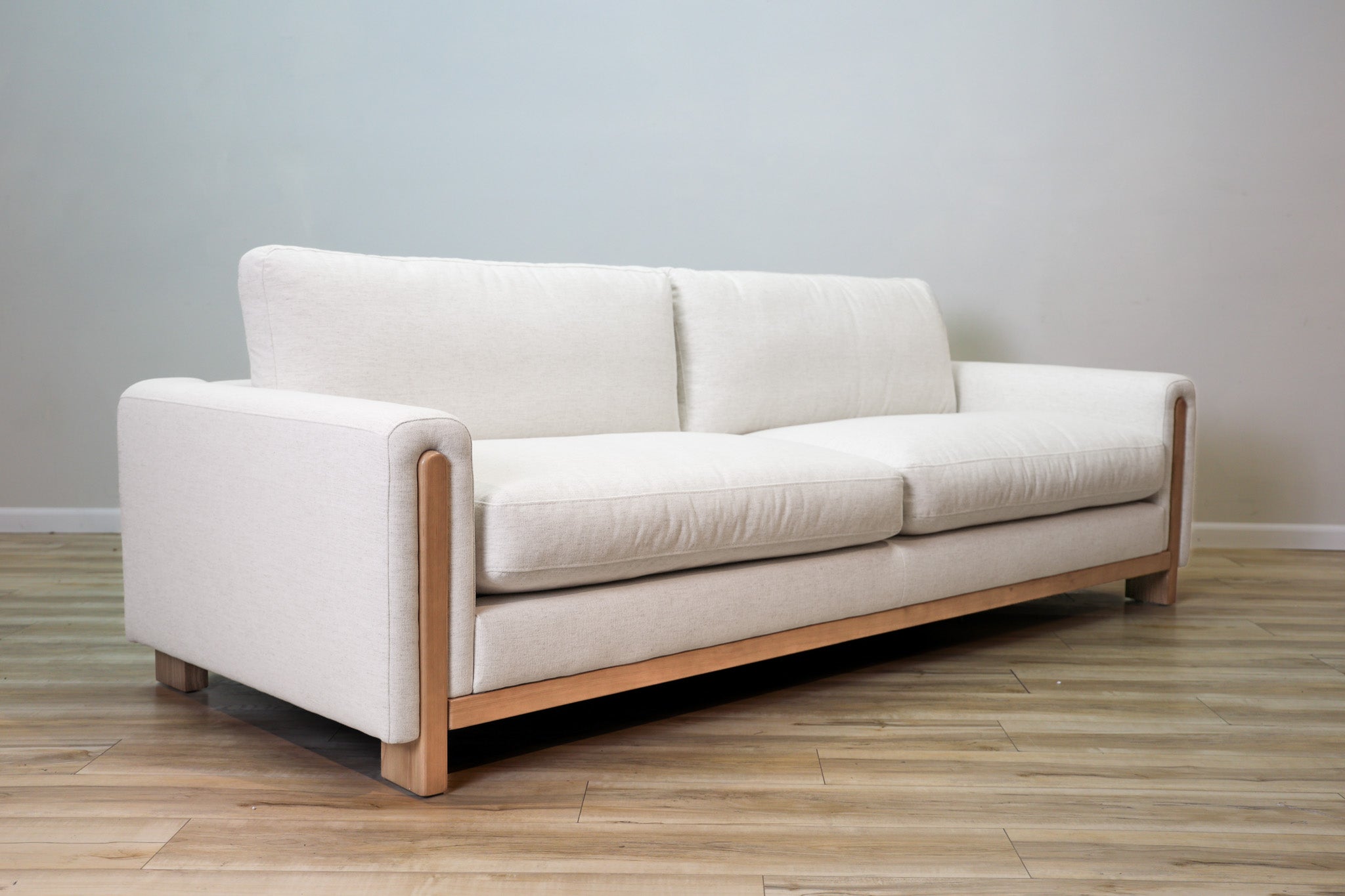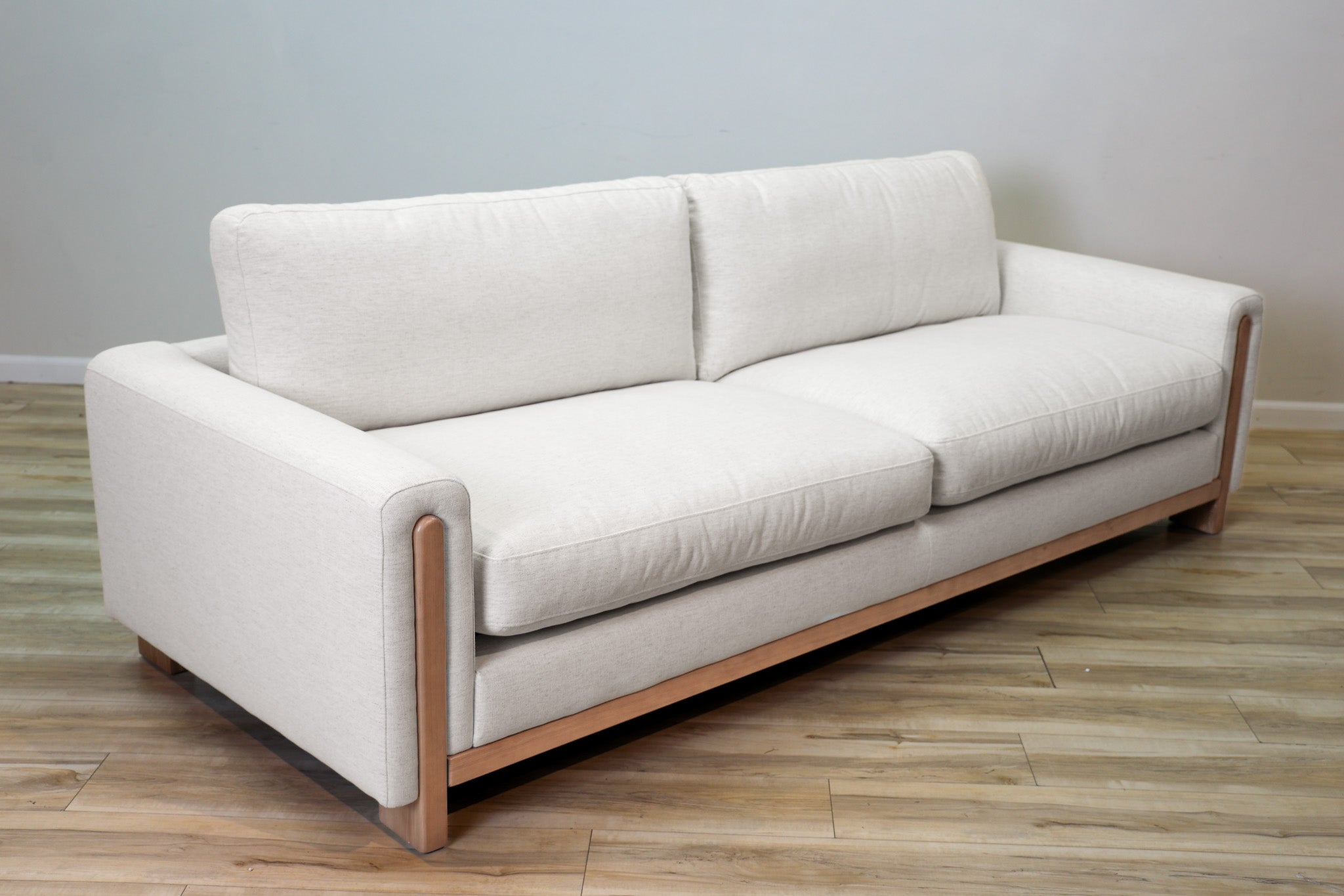 Our most popular Crypton fabric on a solid wood frame. Down filled cushions invite you to sit and get comfortable for a while - all while still offering ample support. The track arms with the wood element adds a touch of vintage style to this sleek, low, and modern silhouette.