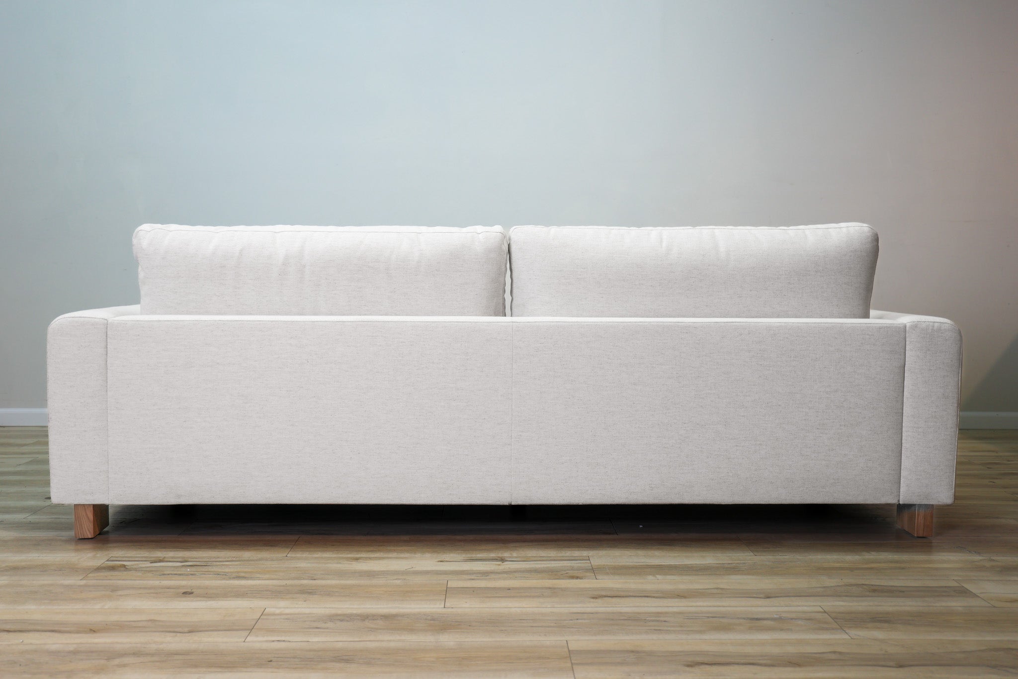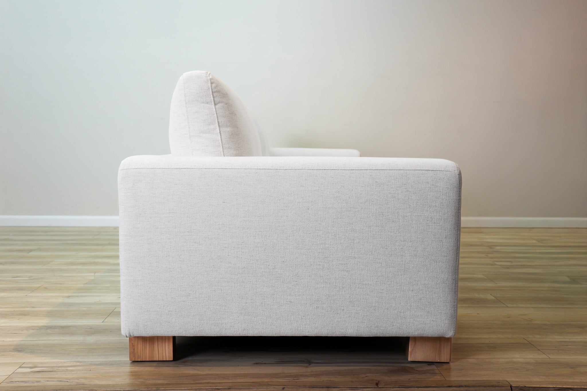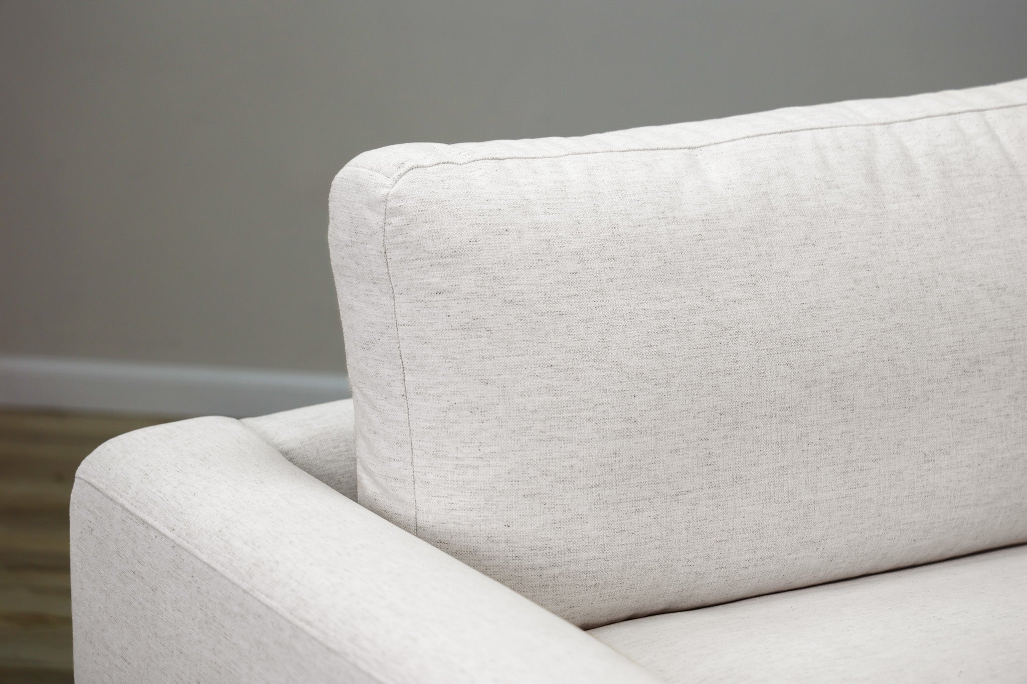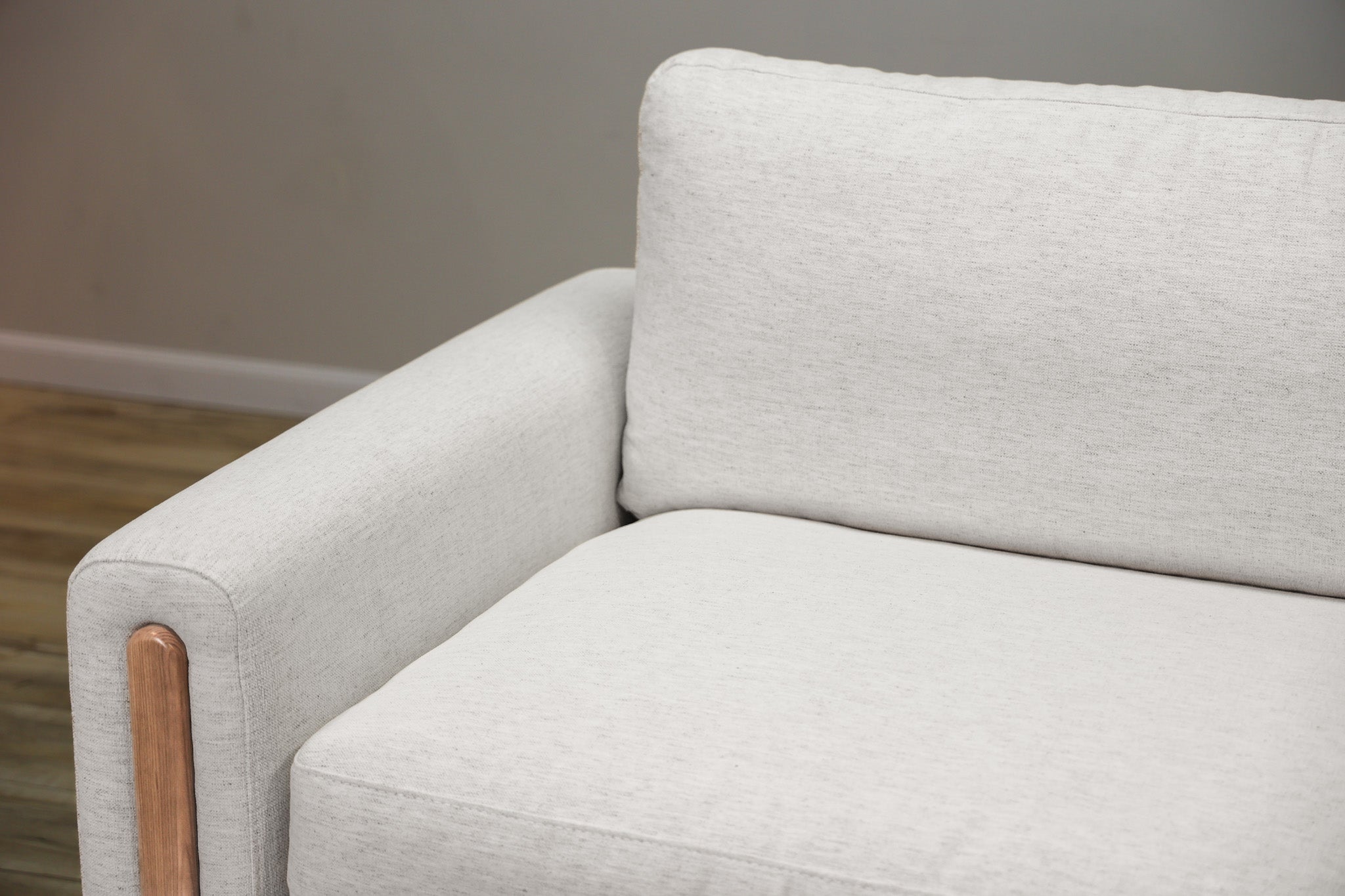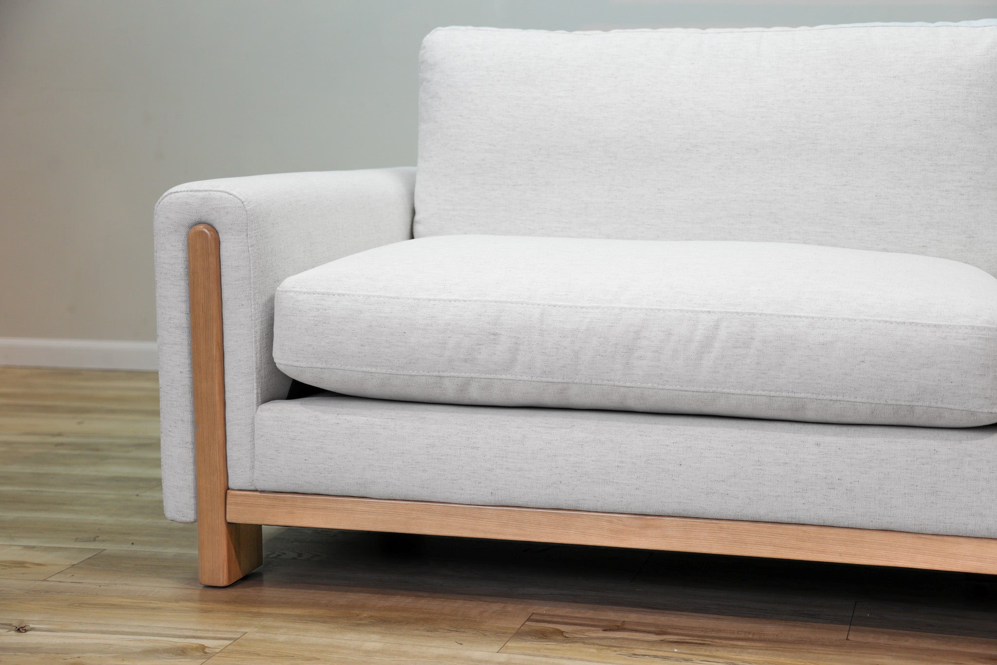 Our most popular Crypton fabric on a solid wood frame. Down filled cushions invite you to sit and get comfortable for a while - all while still offering ample support. The track arms with the wood element adds a touch of vintage style to this sleek, low, and modern silhouette.