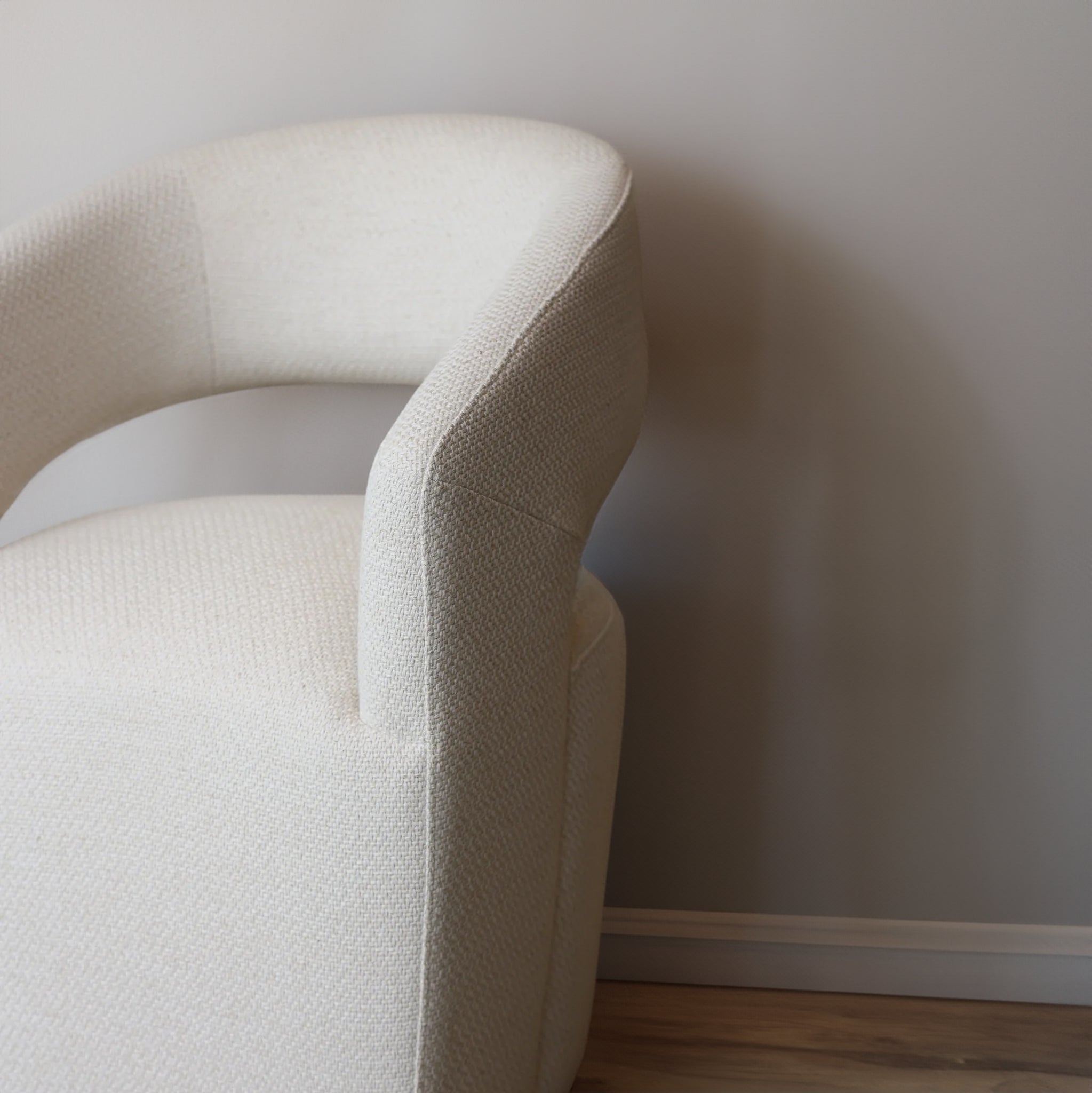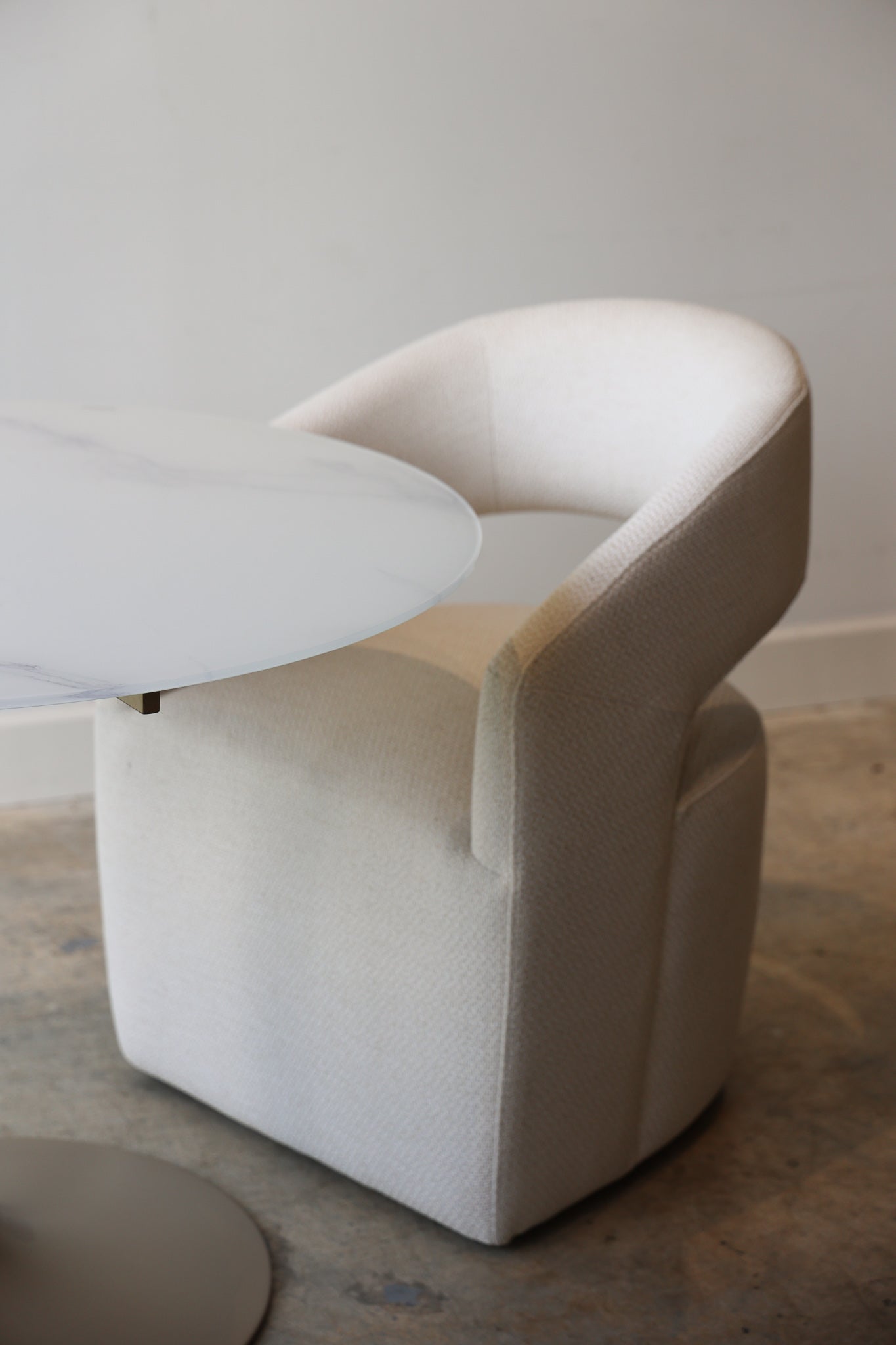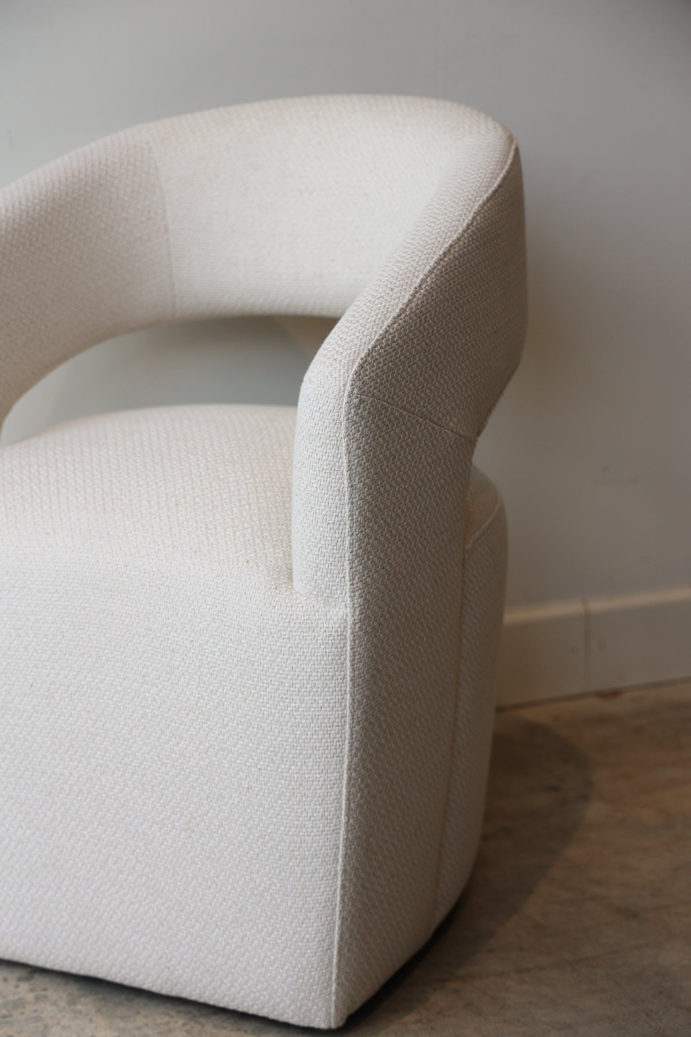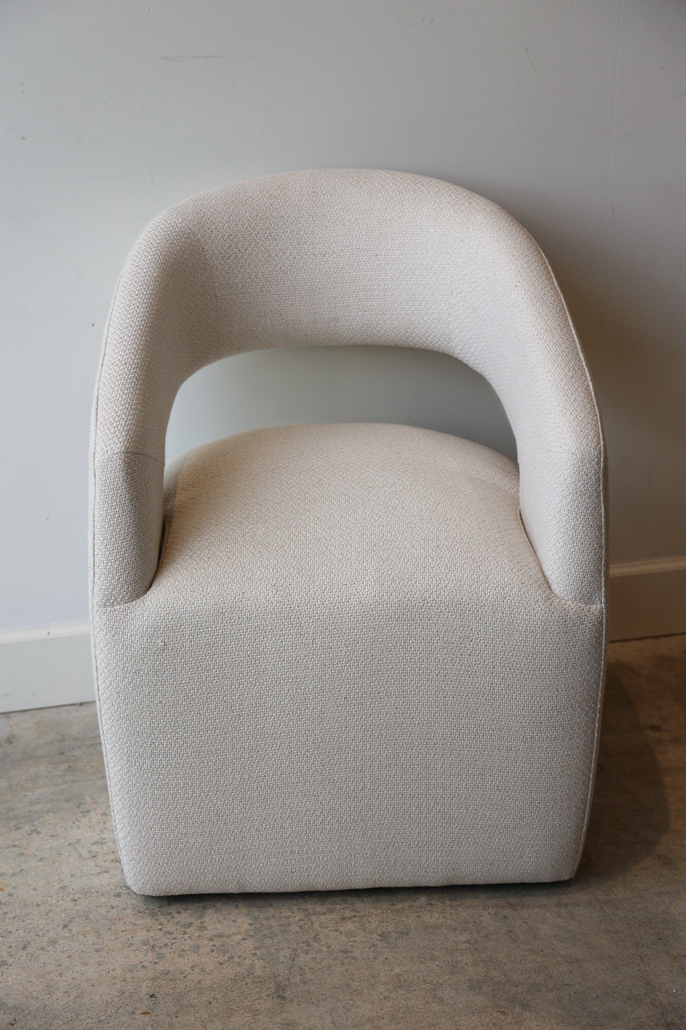 Our Fiona Rolling Dining Chair is the perfect addition to any dining room. Featuring a performance fabric upholstery and a warm white finish, this rolling dining chair adds both style and comfort to any space. With its contemporary look, it pairs well with existing décor.