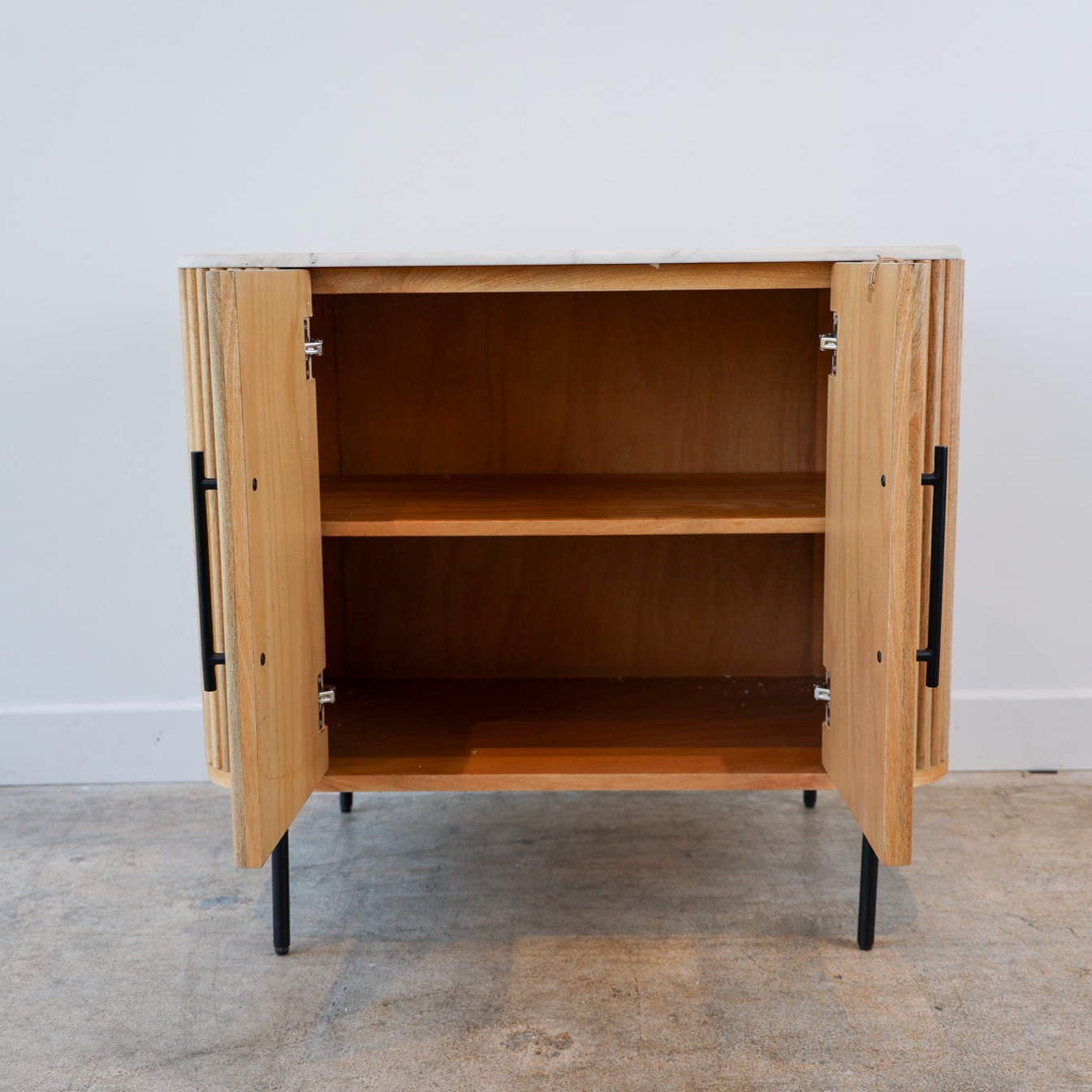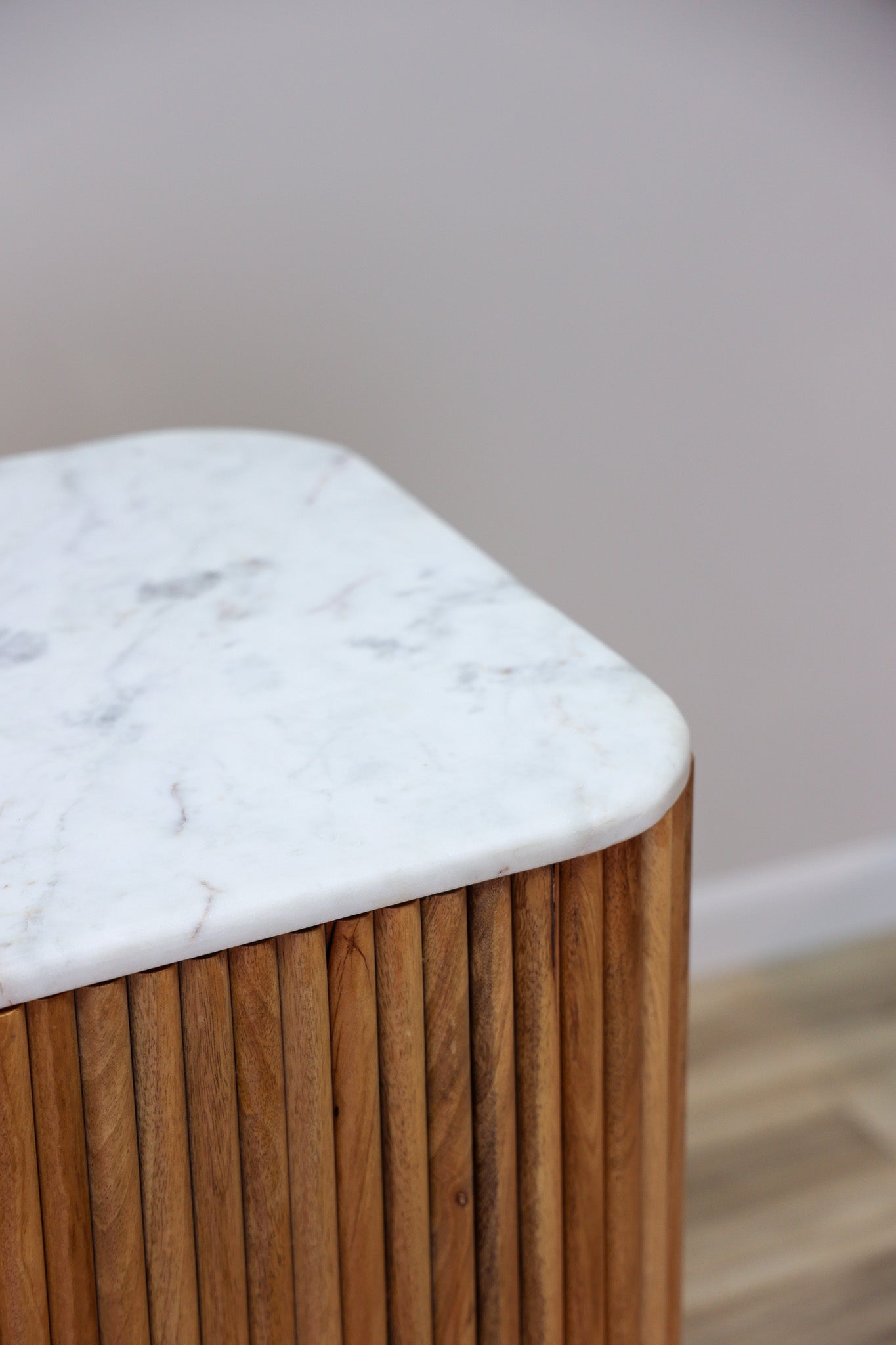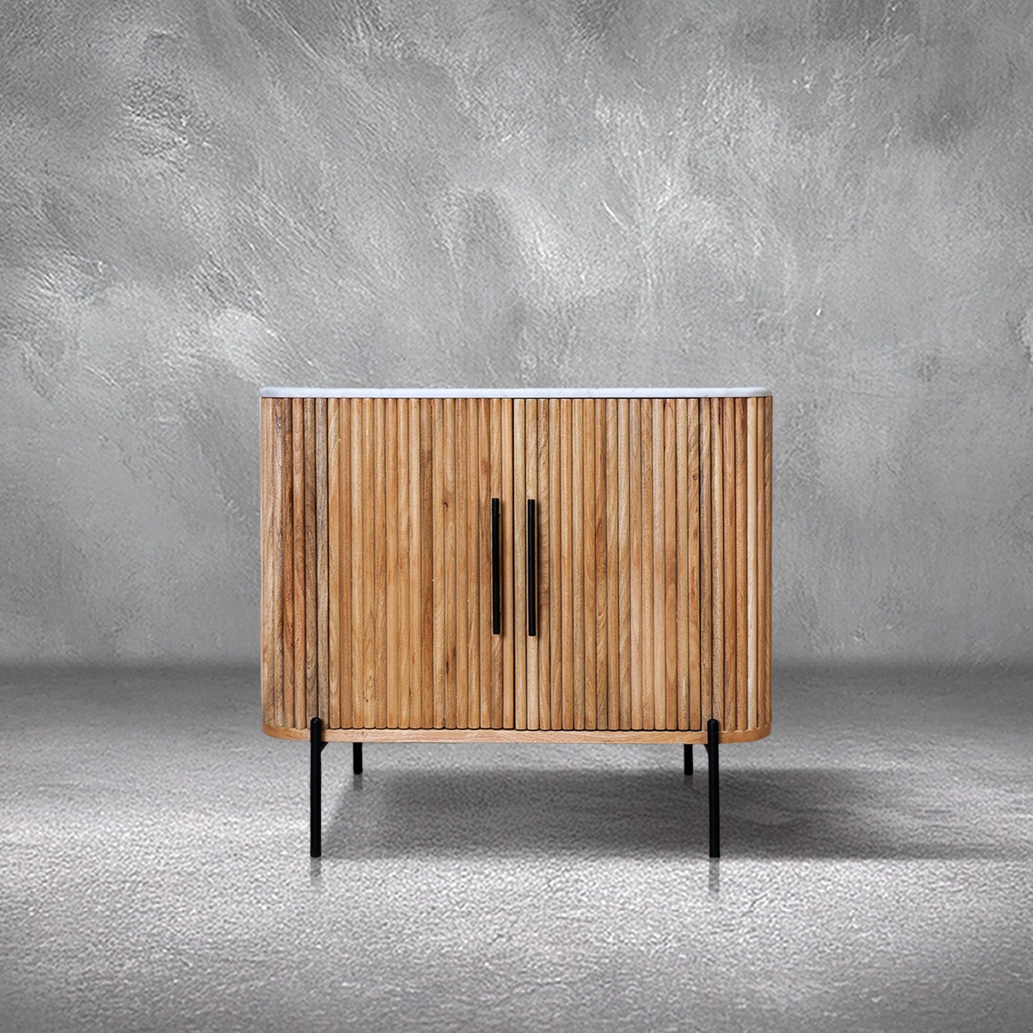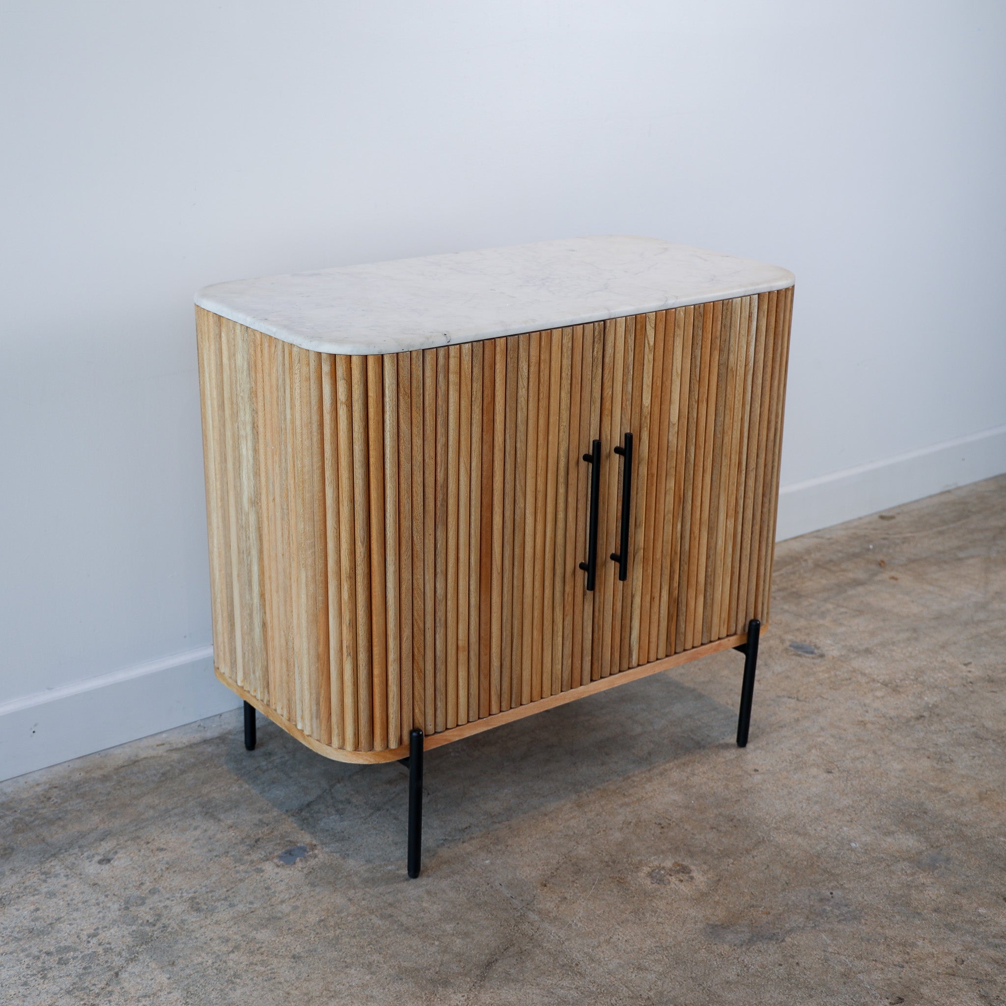 Crafted with a fluted mango wood frame and a sleek marble top, the Fitzgerald Cabinet combines sturdy construction with elegant design. Functional and stylish, it elevates any room and provides ample storage. Made with quality materials, it is built to last.