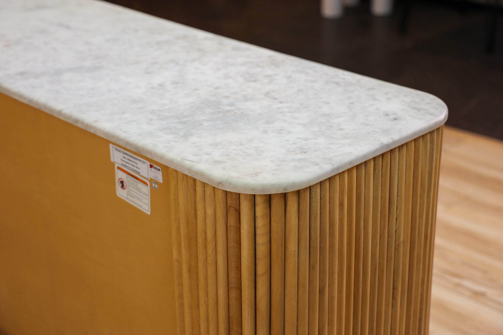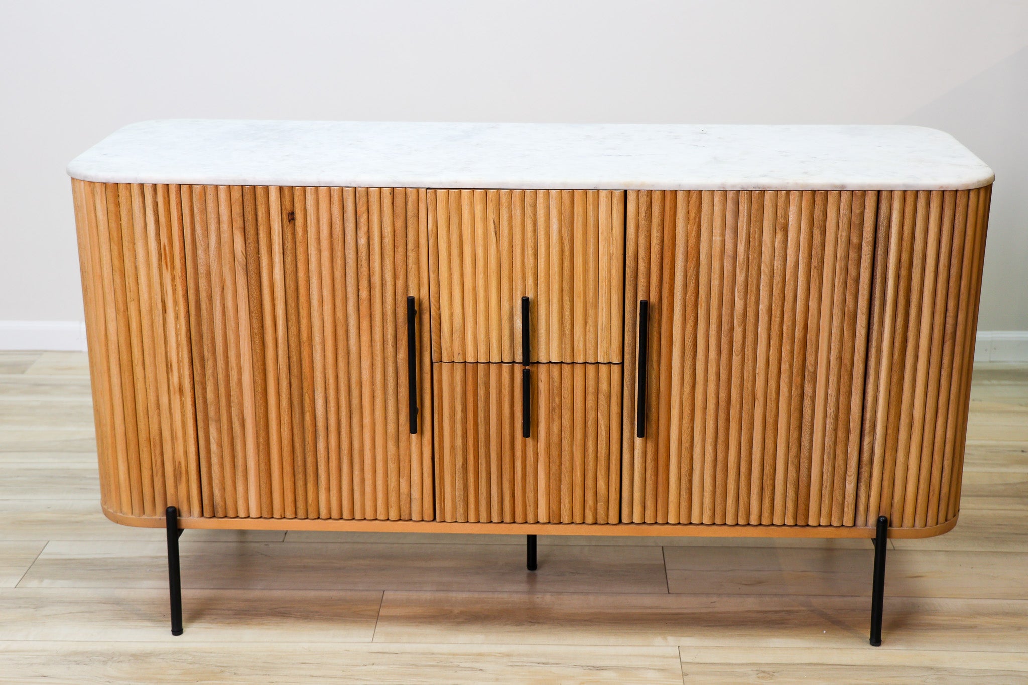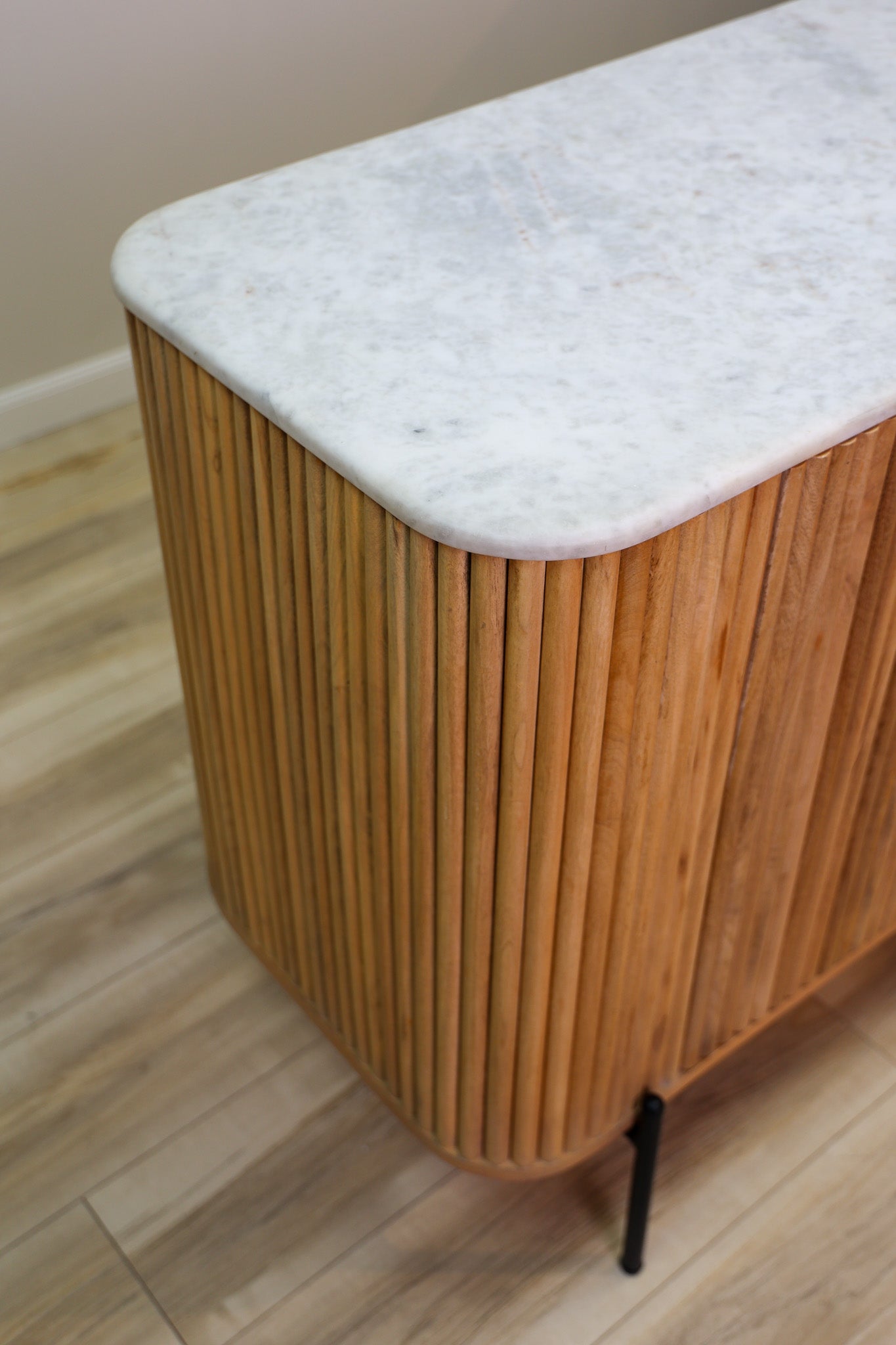 Expertly crafted by dwell, the Fitzgerald Credenza is a fluted masterpiece made from rich mango wood. Topped with luxurious marble, this credenza adds a touch of sophistication to any room. Enhance your home decor with this stylish and functional piece.