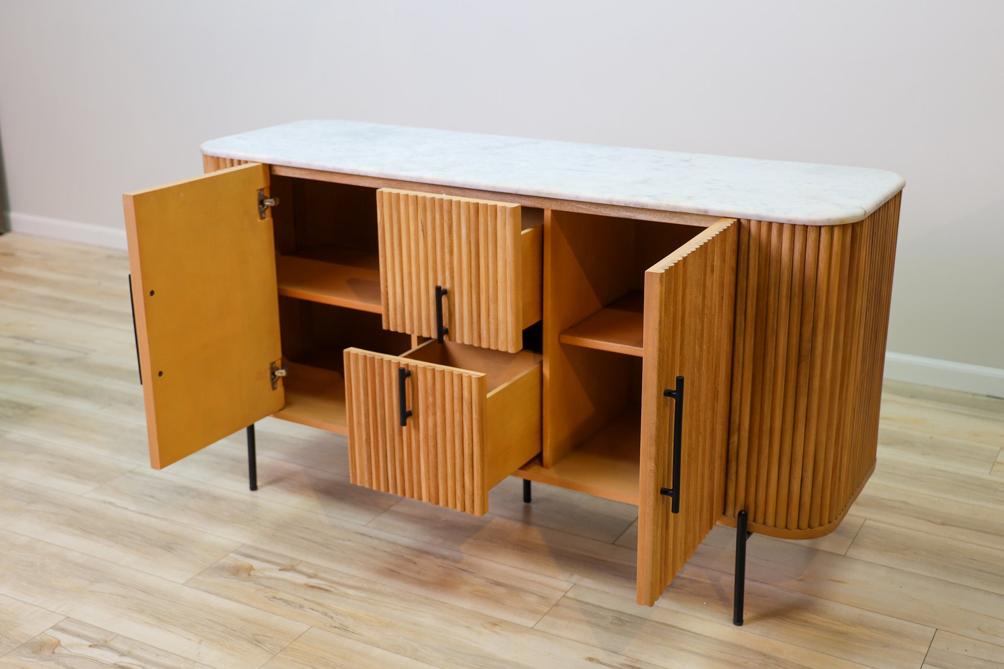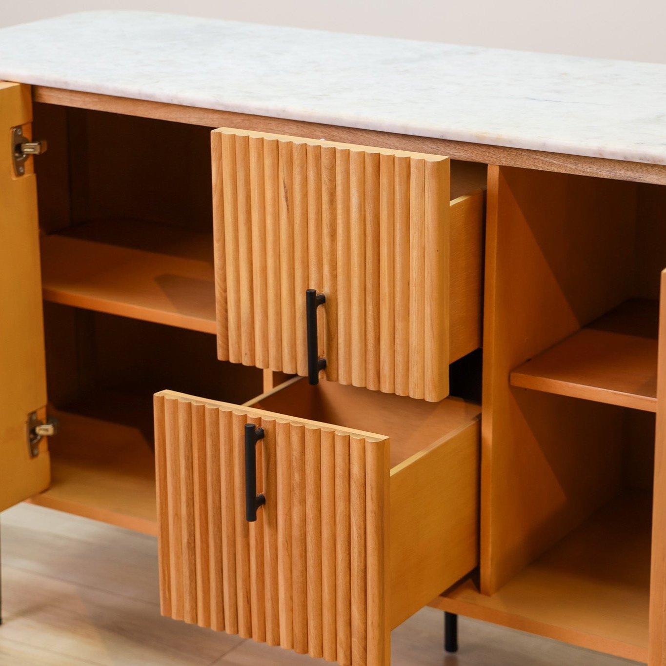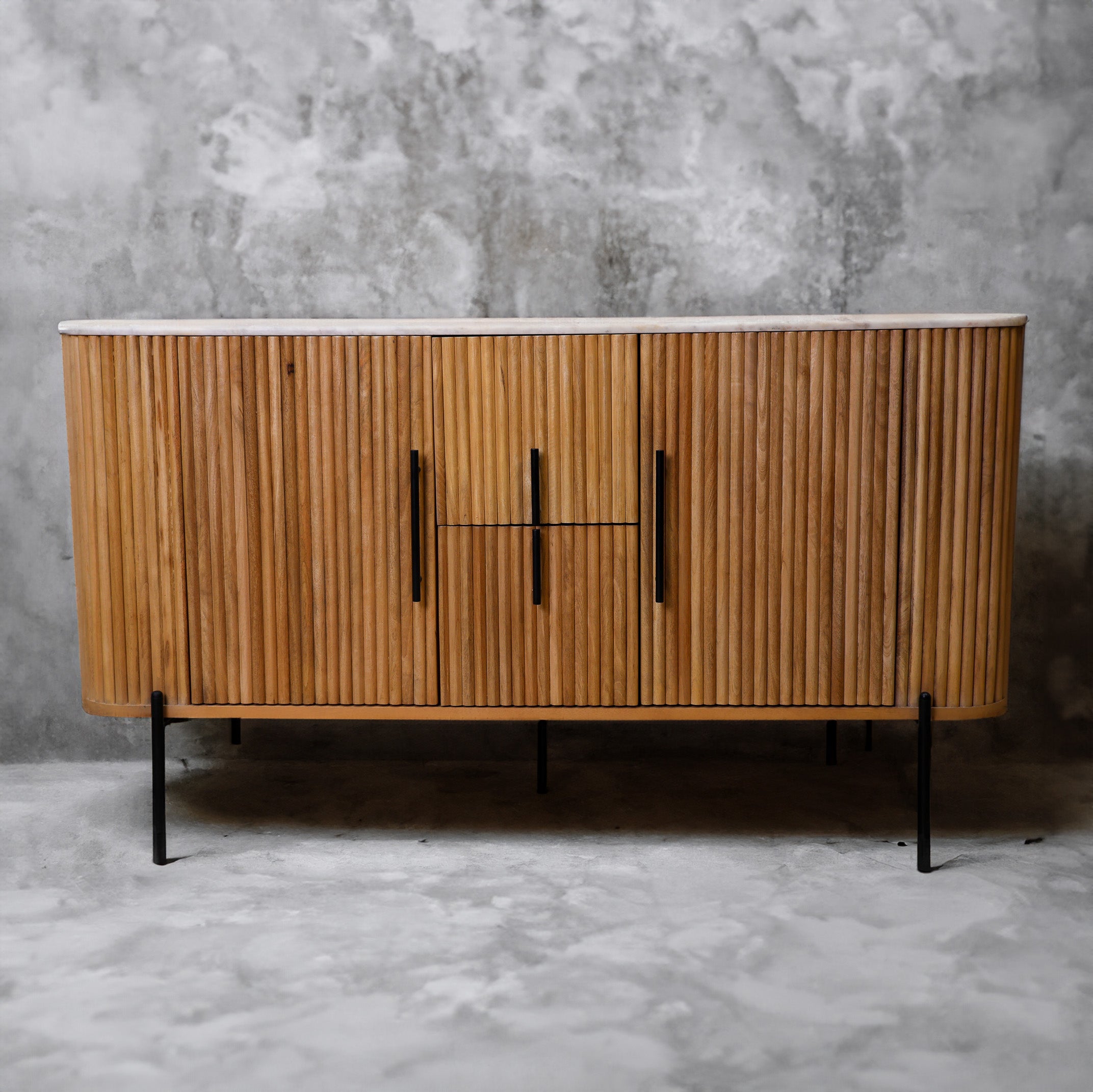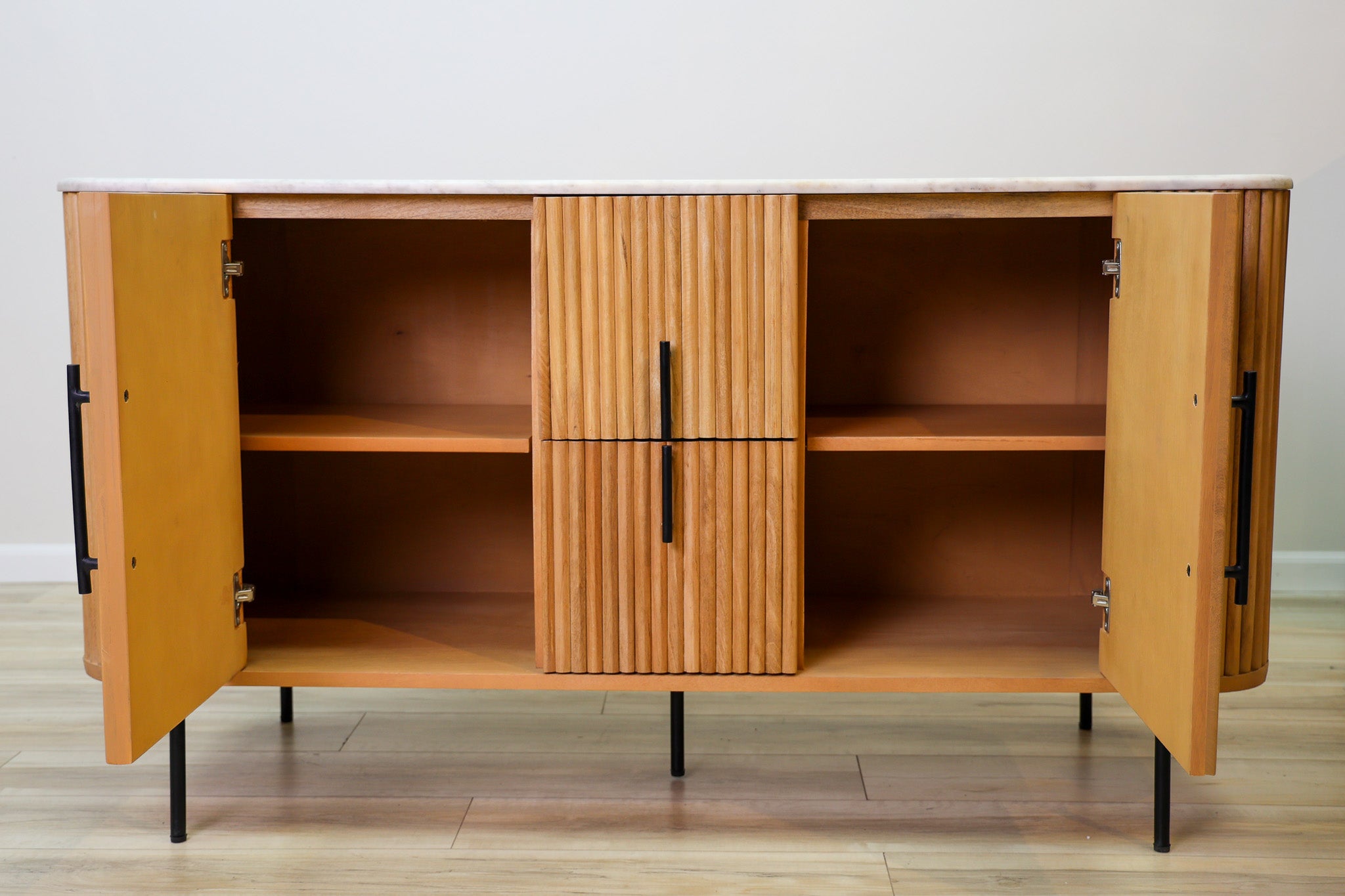 Expertly crafted by dwell, the Fitzgerald Credenza is a fluted masterpiece made from rich mango wood. Topped with luxurious marble, this credenza adds a touch of sophistication to any room. Enhance your home decor with this stylish and functional piece.