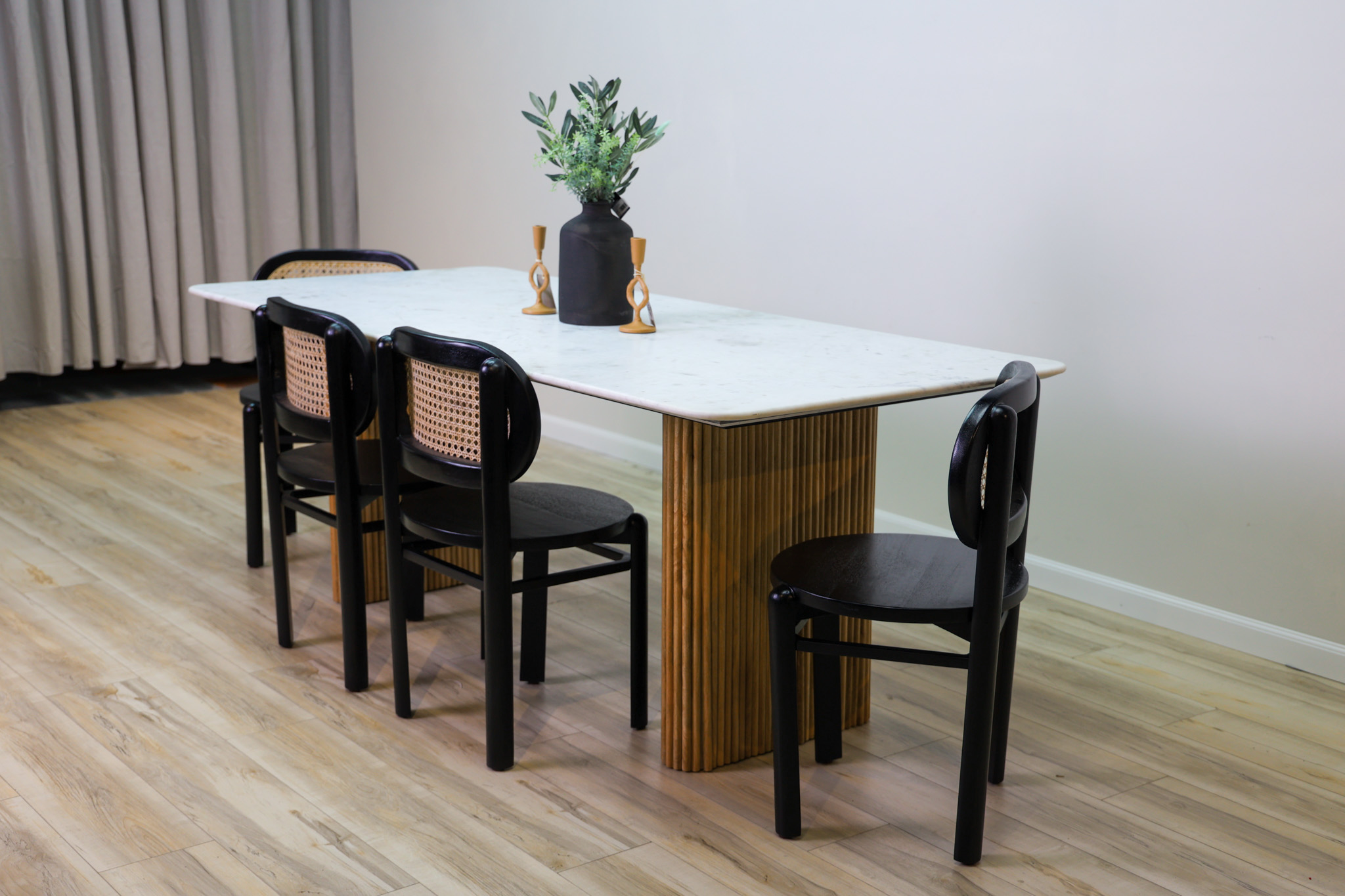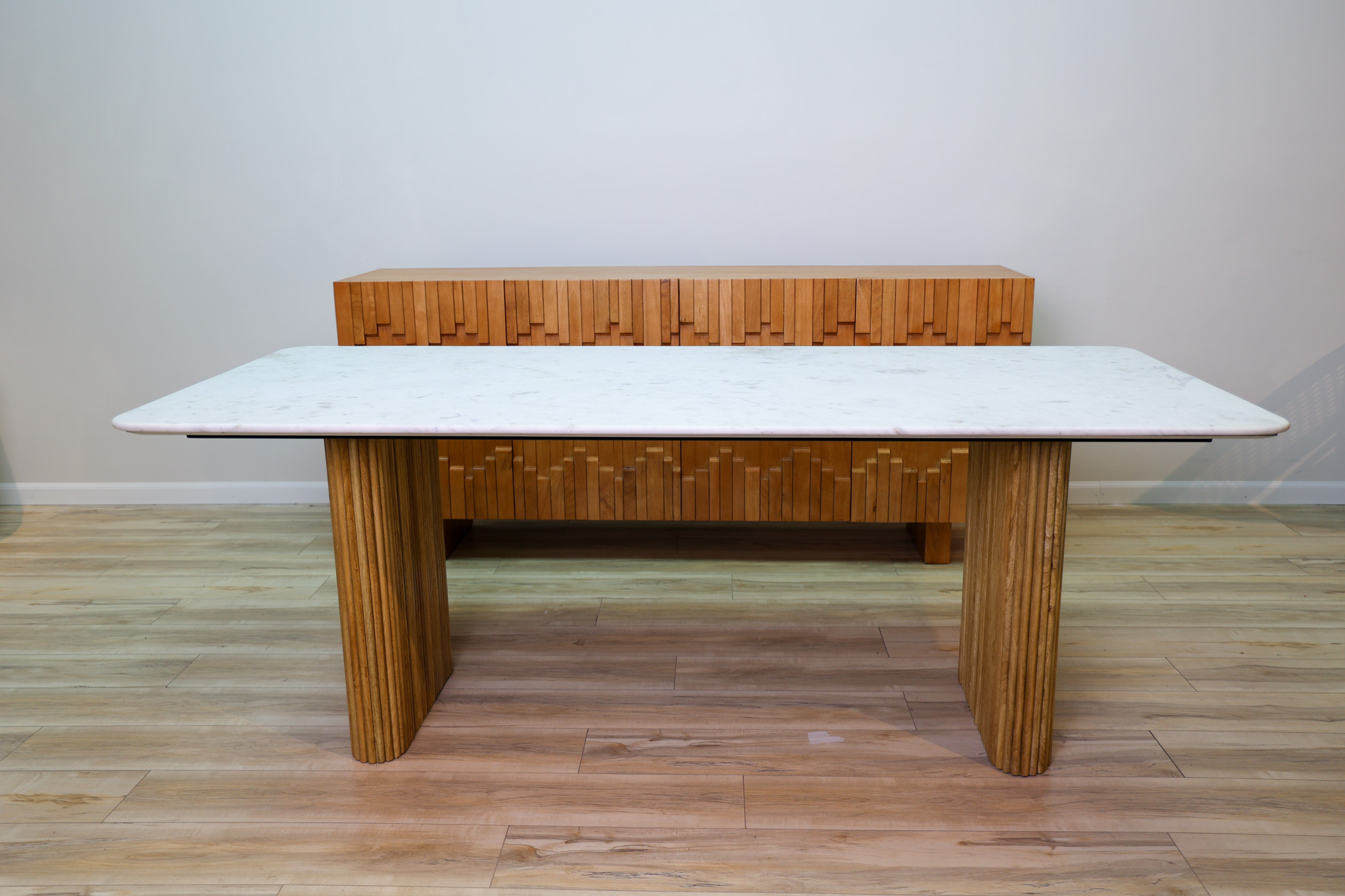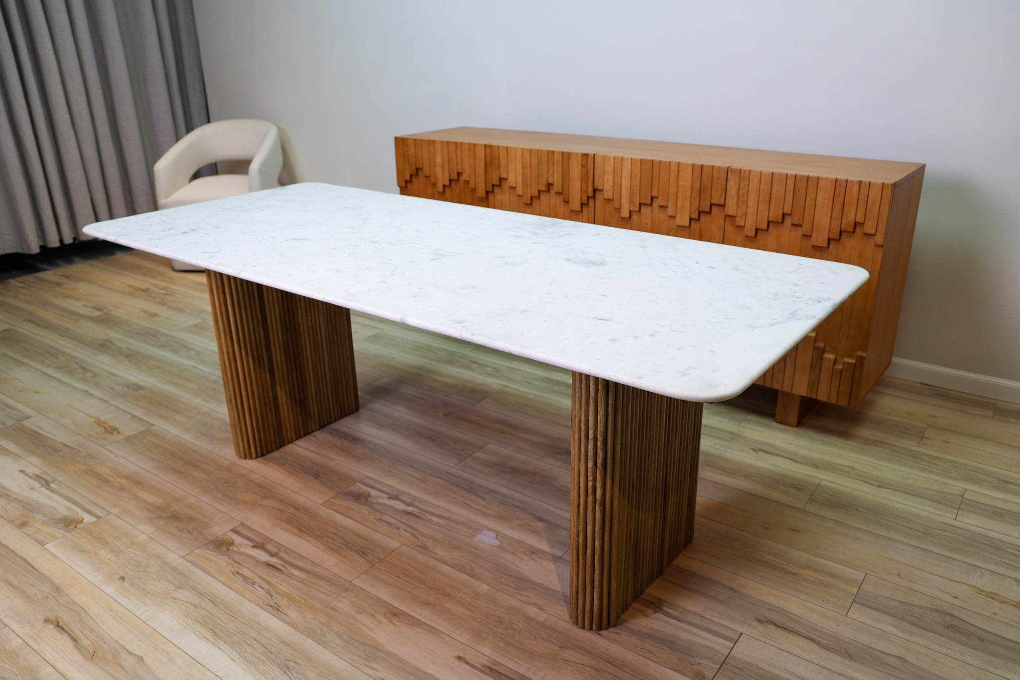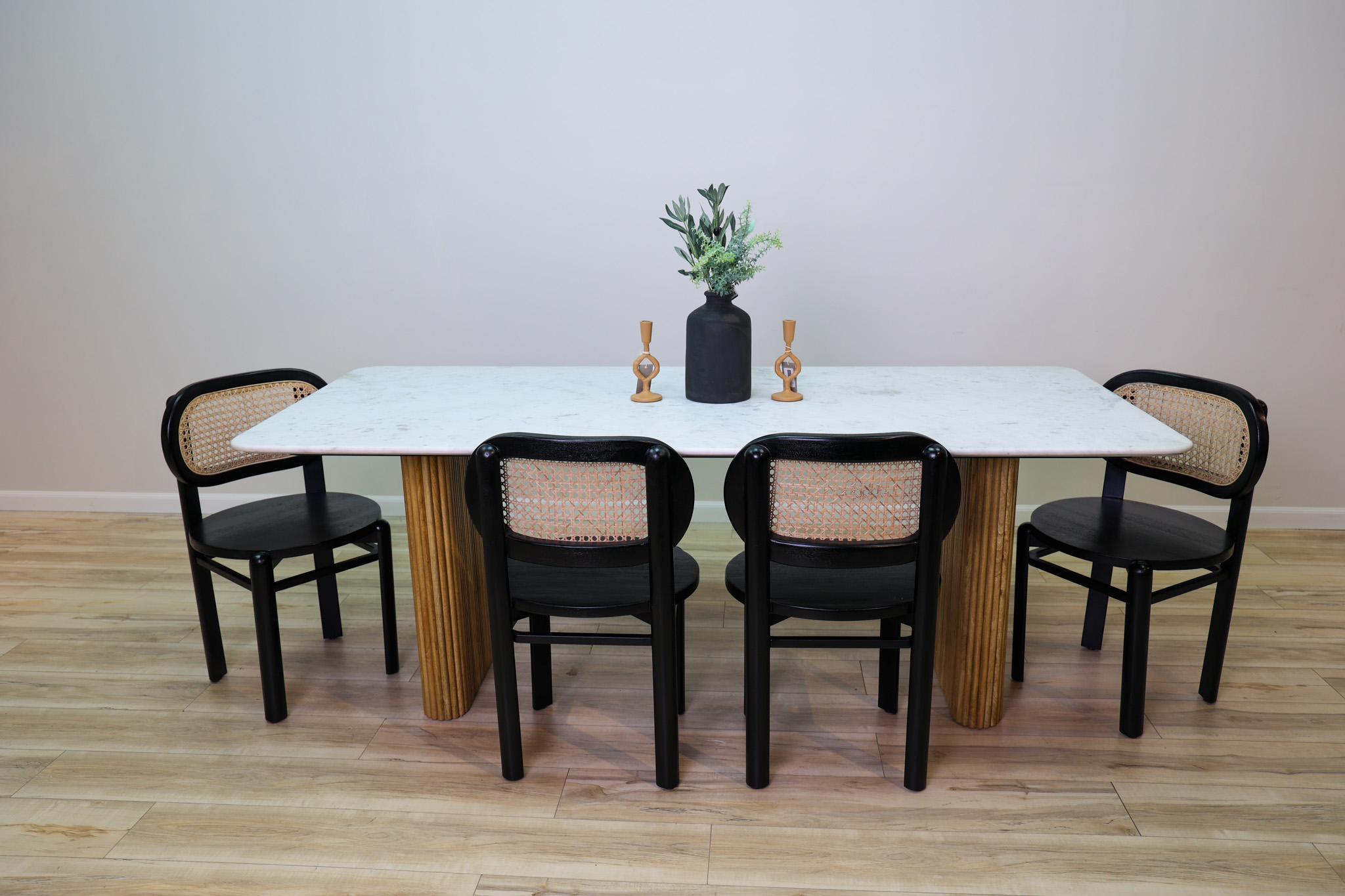Introduce an elegant touch to your dining experience with the Fitzgerald Rectangular Dining Table. Its luxurious marble top exudes sophistication while the reeded wood legs provide sturdy support. Enjoy a timeless and stylish addition to your dining room with this expertly crafted table.