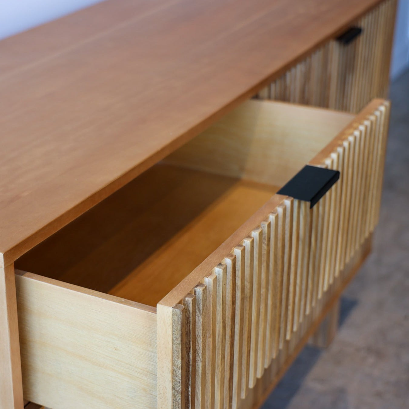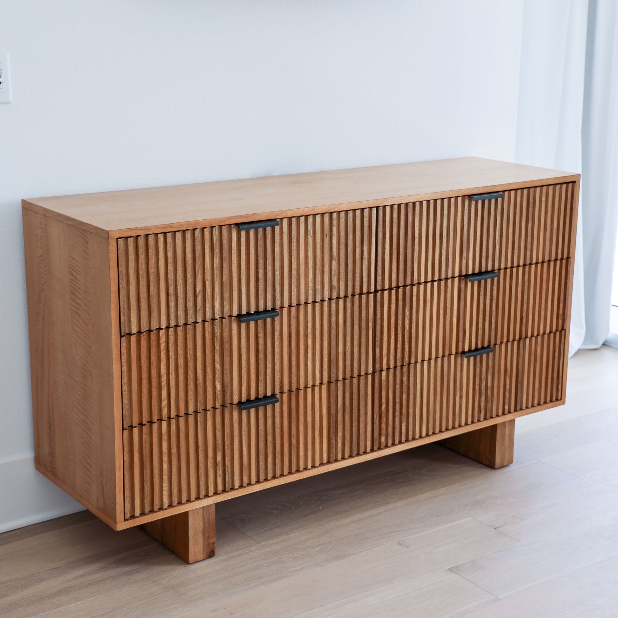 Expertly crafted with hand carved lines and sleek black hardware, the Fluted Dresser is a stunning addition to any bedroom. Featuring soft close drawers, this original design from Dwell now comes in a new, neutral color. Elevate your space with this functional and stylish piece.