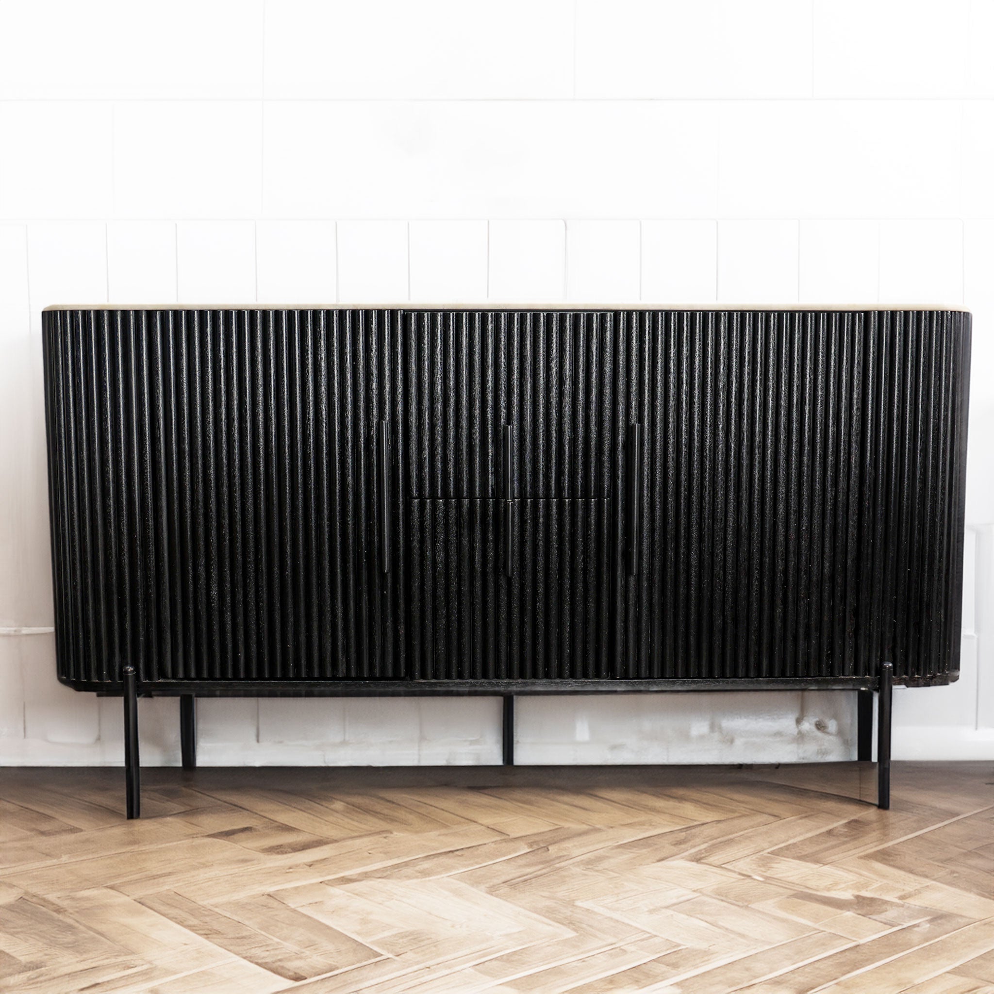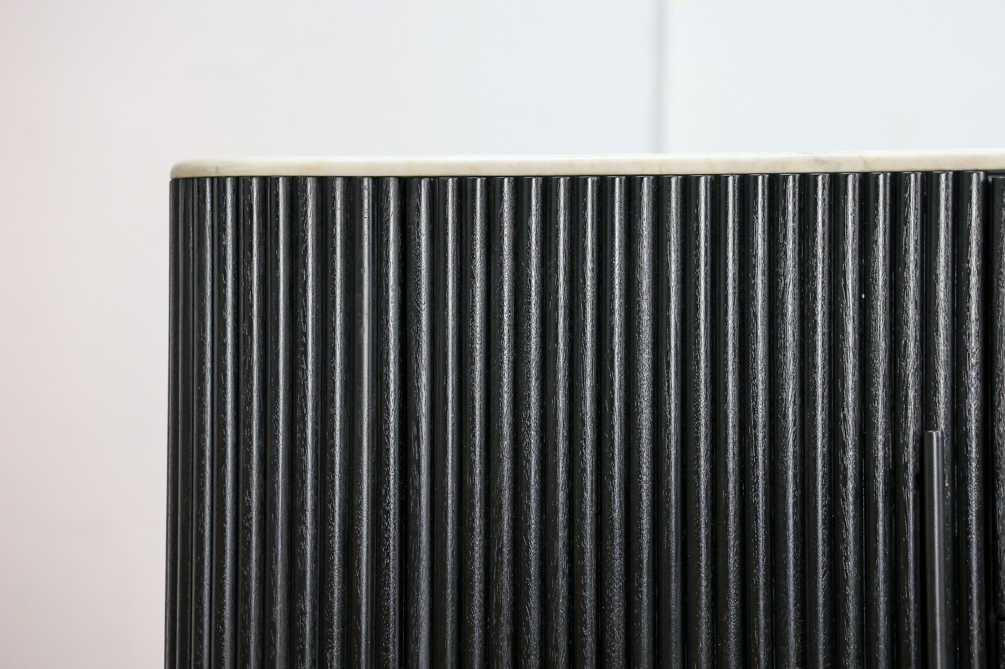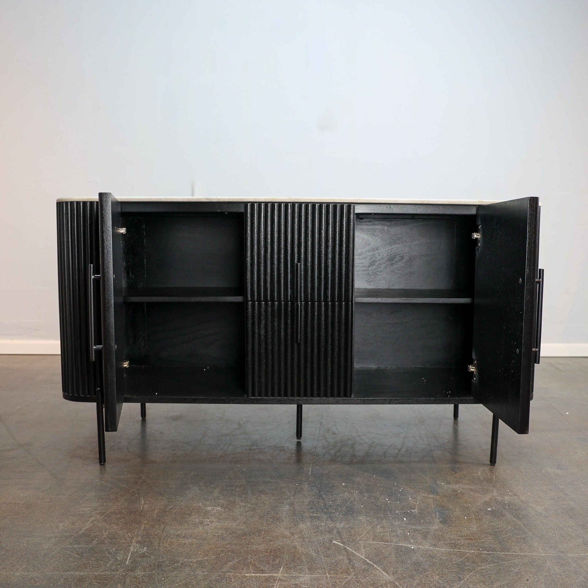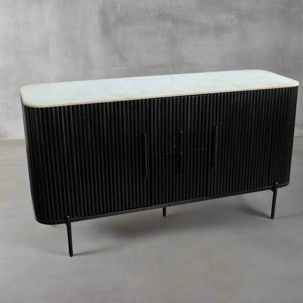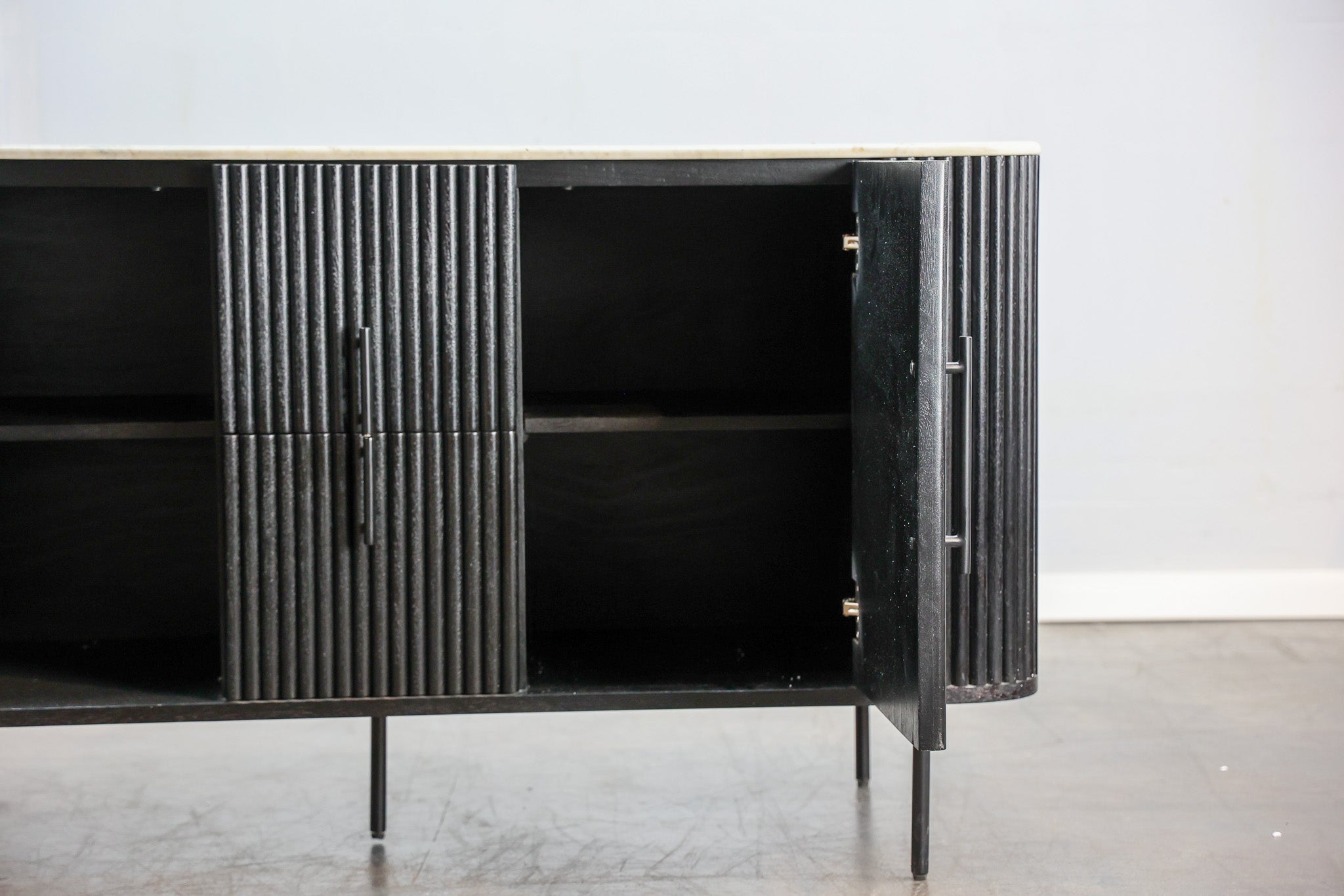 The Gatsby Credenza is a high-end piece made from black mango wood, featuring soft close drawers and doors for a sleek and polished look. The marble top adds an elegant touch to this original Dwell design. Enjoy the sophisticated style and functionality of the Gatsby Credenza in your home.