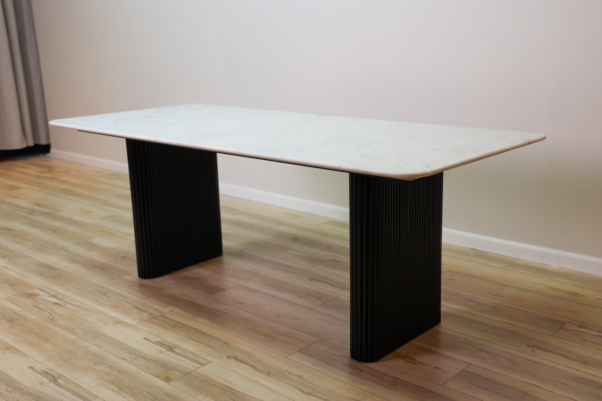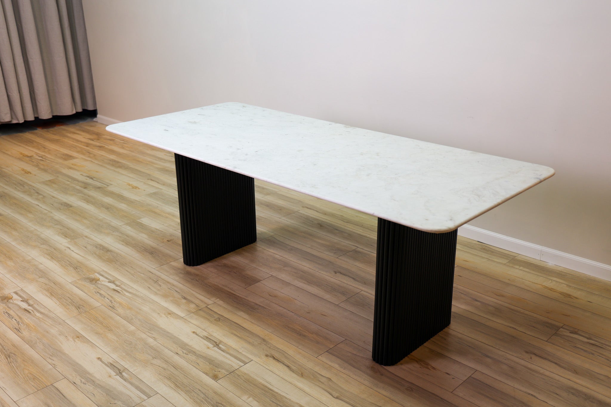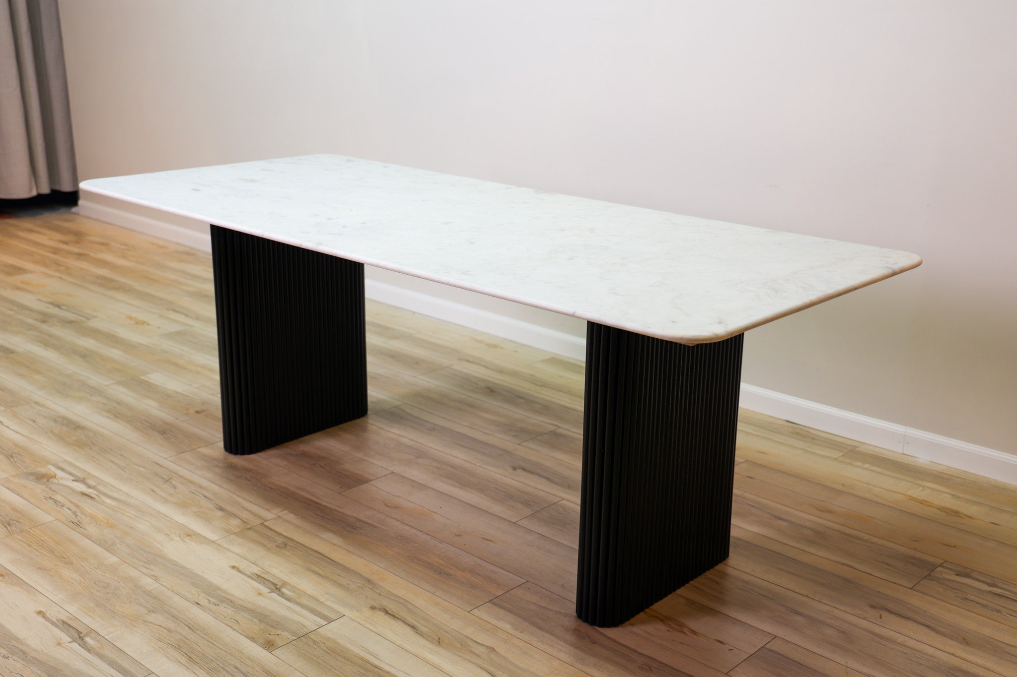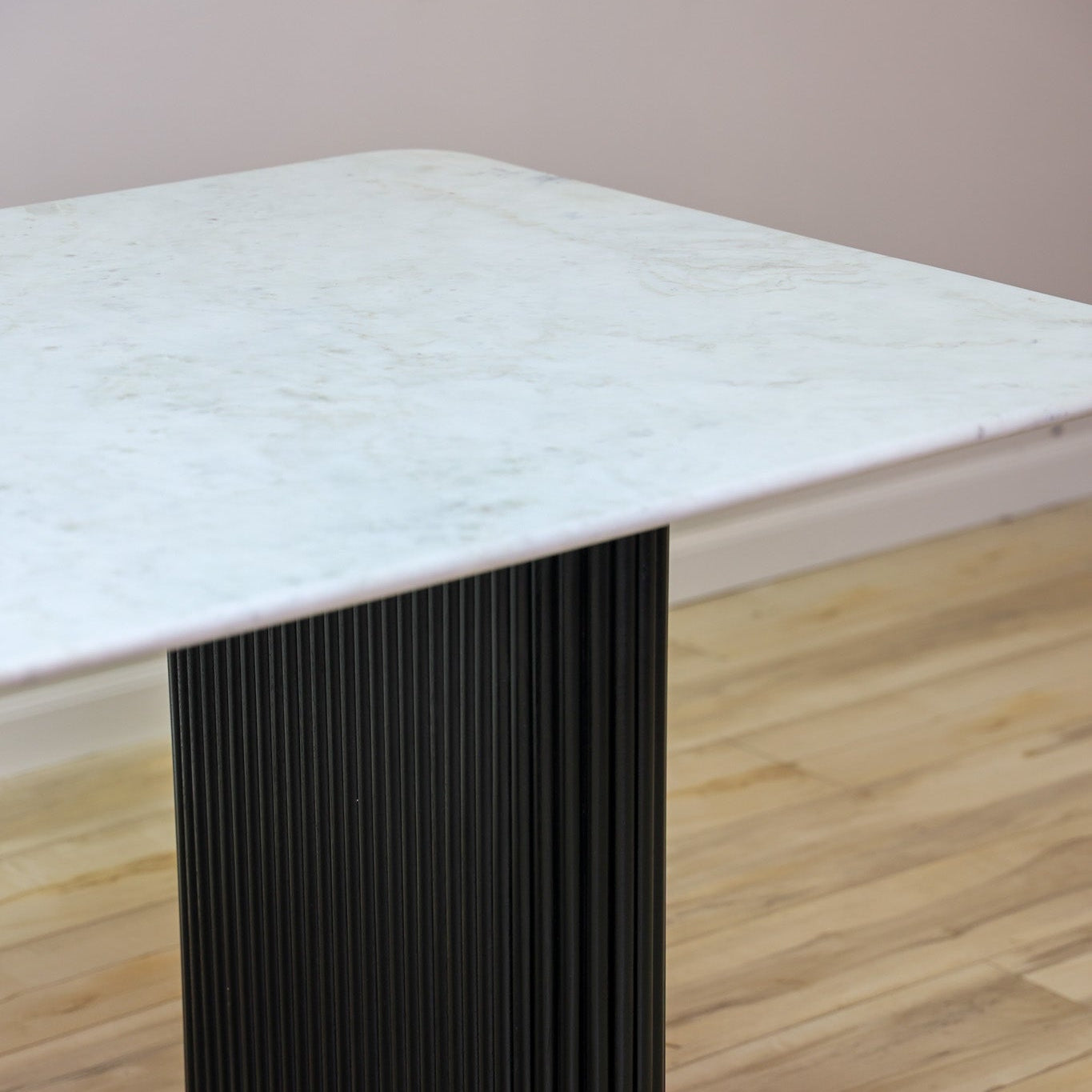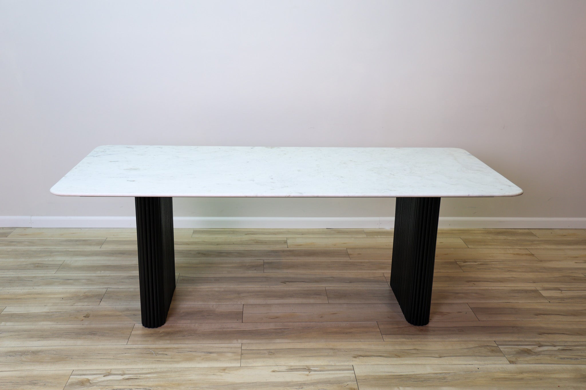 This Gatsby Rectangular Dining Table features a luxurious white marble top and elegantly reeded black legs. Perfect for hosting dinner parties or adding a touch of sophistication to your dining room. Upgrade your dining experience with this stylish and durable table.