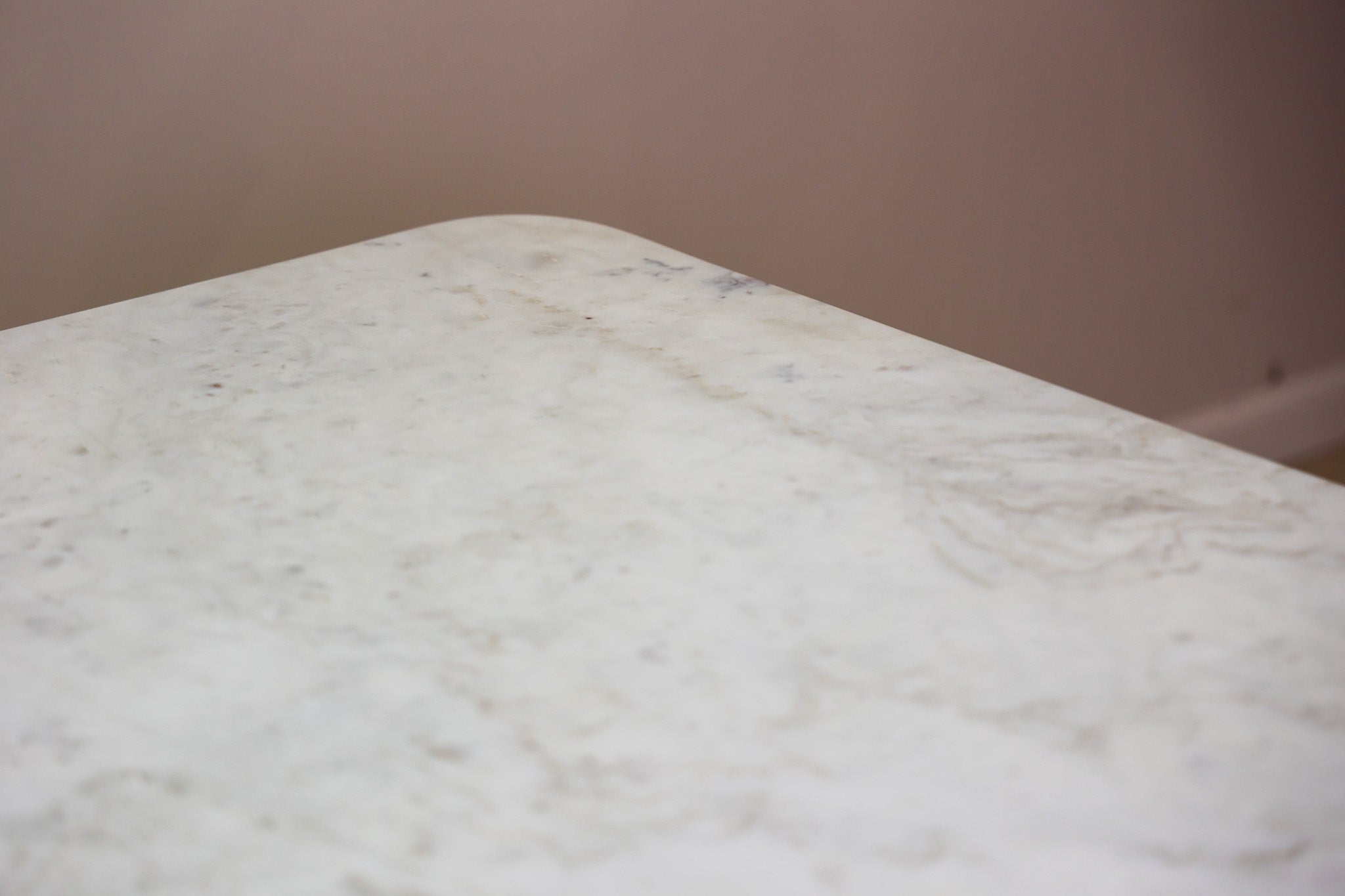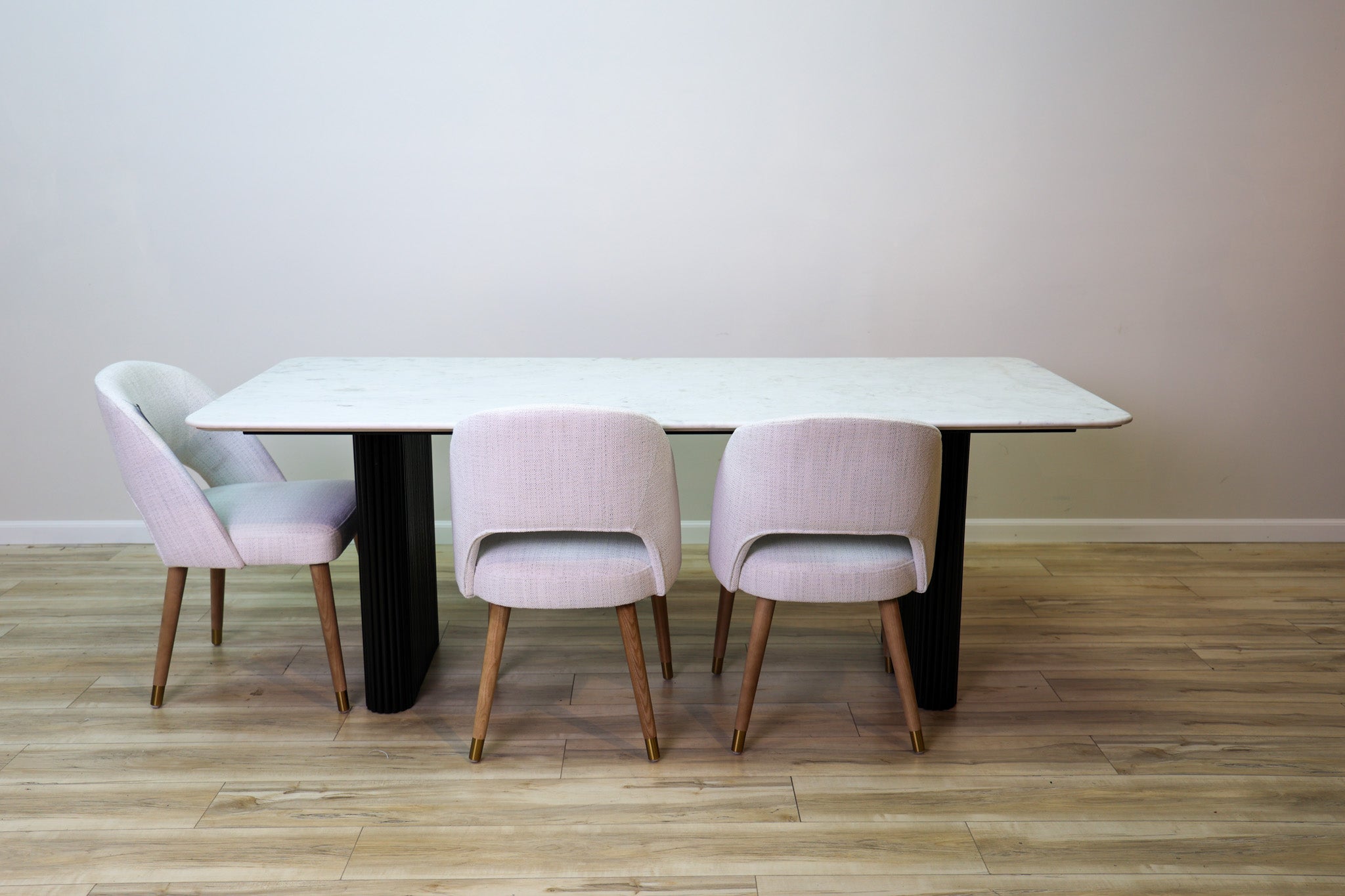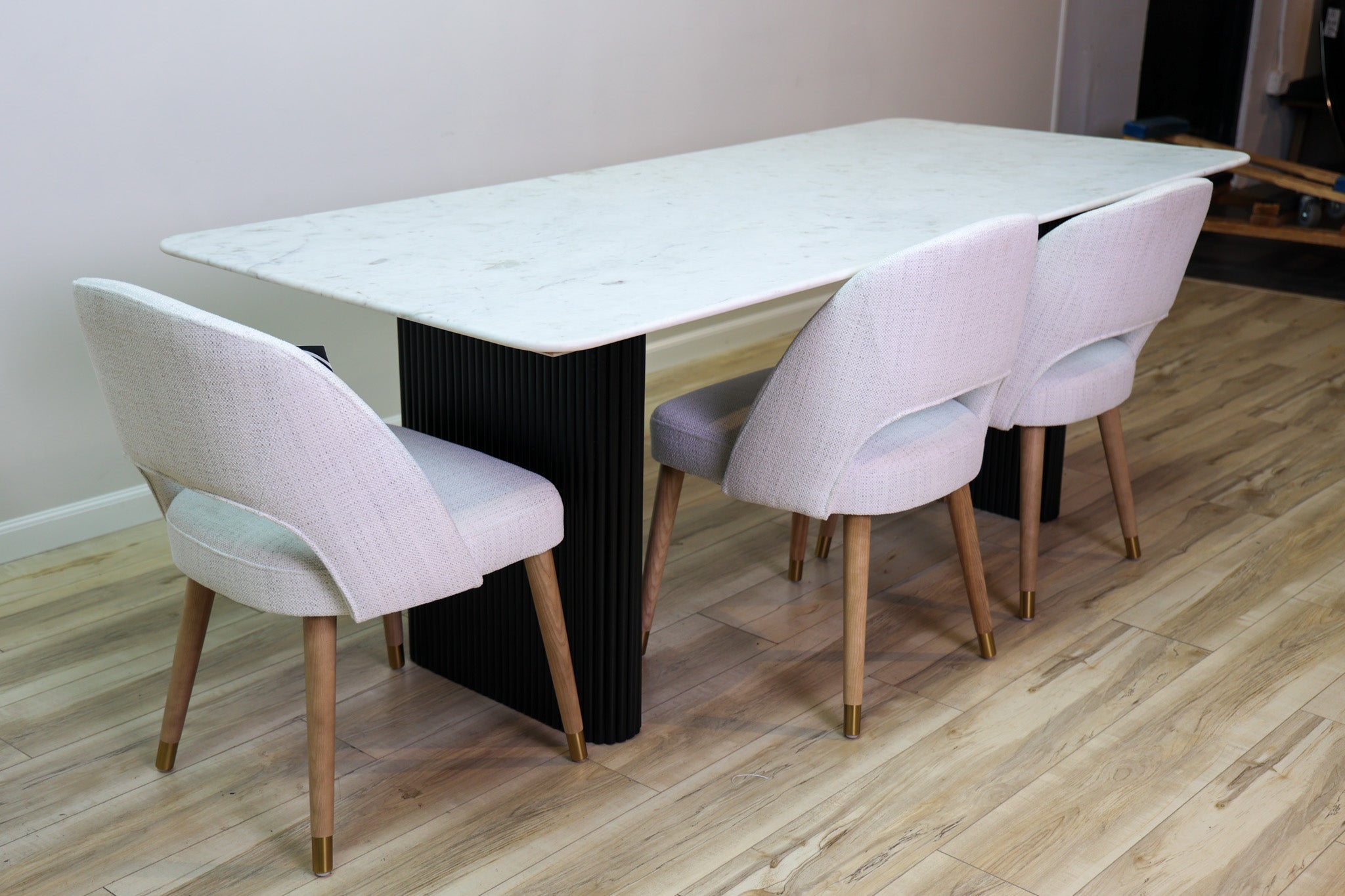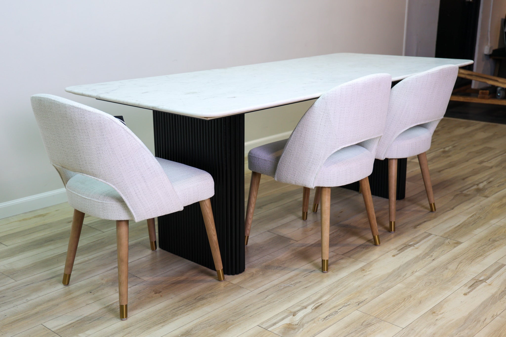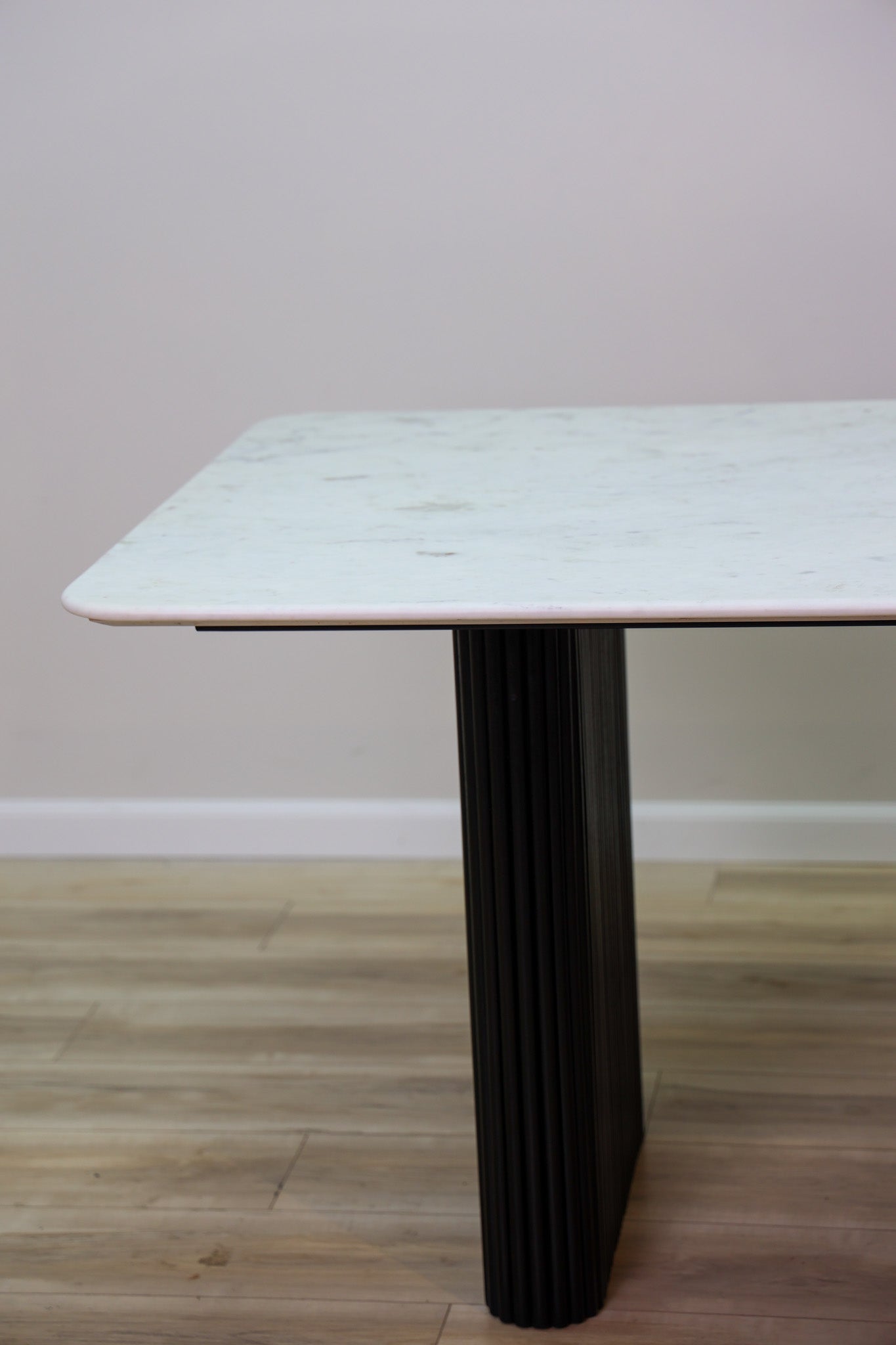 This Gatsby Rectangular Dining Table features a luxurious white marble top and elegantly reeded black legs. Perfect for hosting dinner parties or adding a touch of sophistication to your dining room. Upgrade your dining experience with this stylish and durable table.