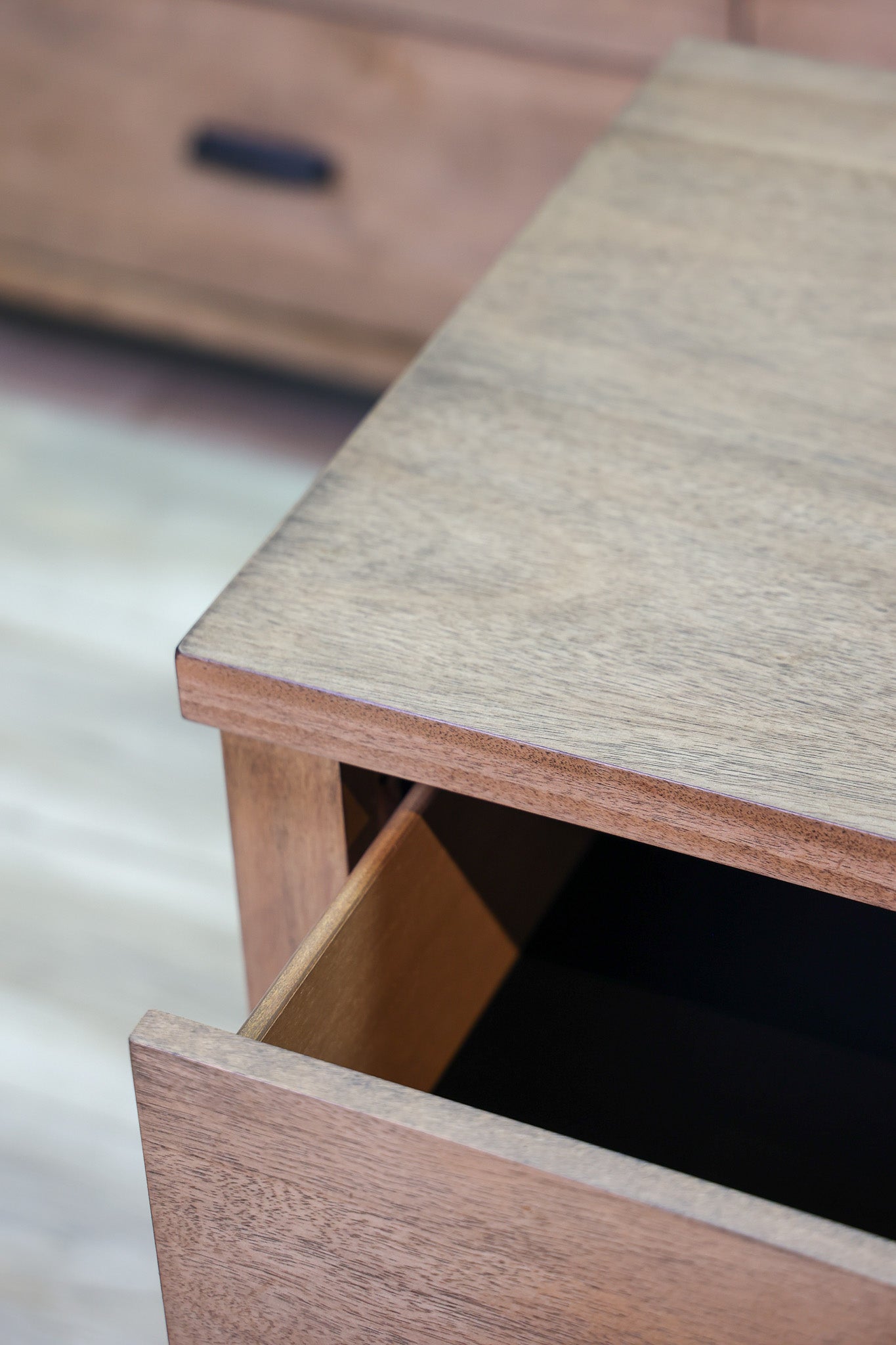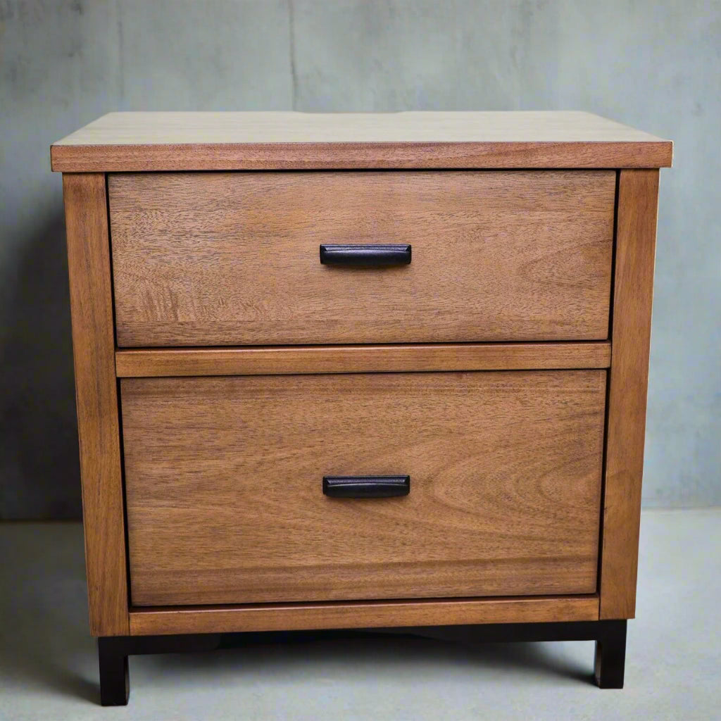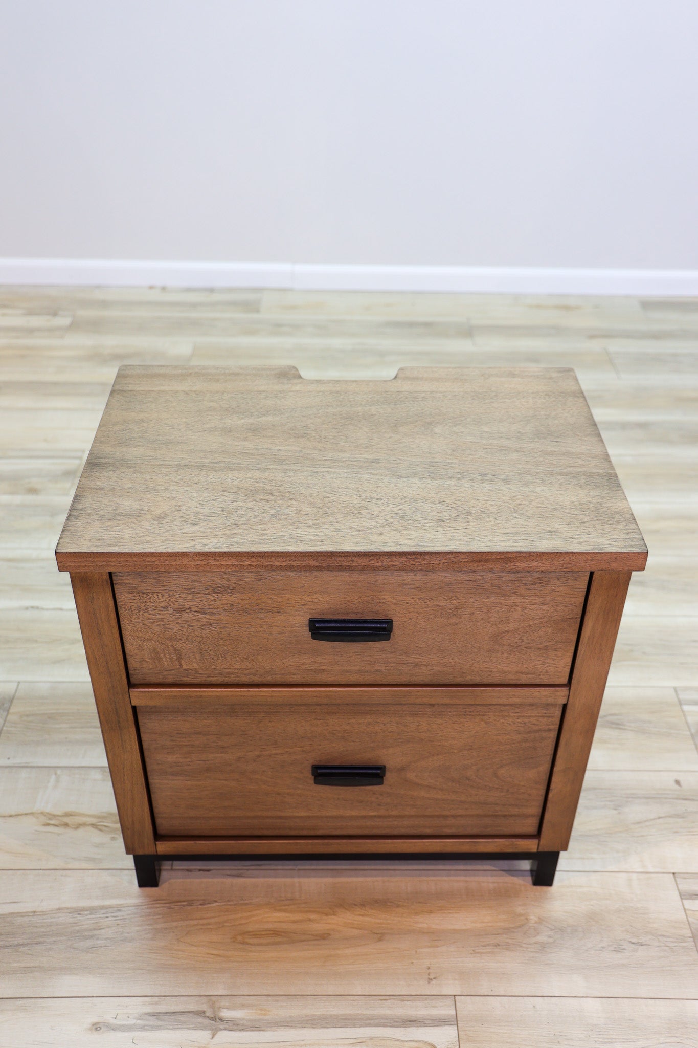 This Graham Wooden Nightstand is made of high-quality wood with sleek black accents. It includes two outlet slots and a usb charging port, making it a convenient addition to any bedroom. Keep your devices charged and your bedside organized with this stylish nightstand.
