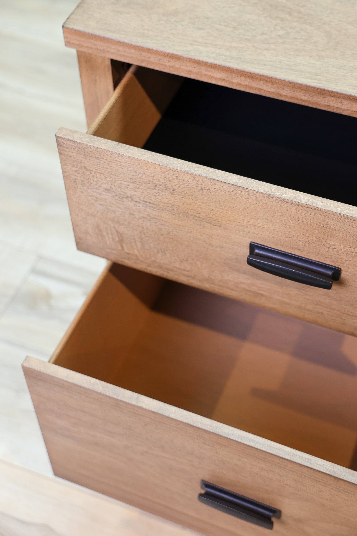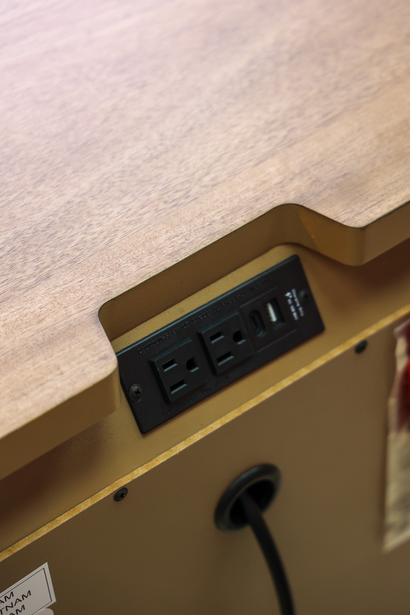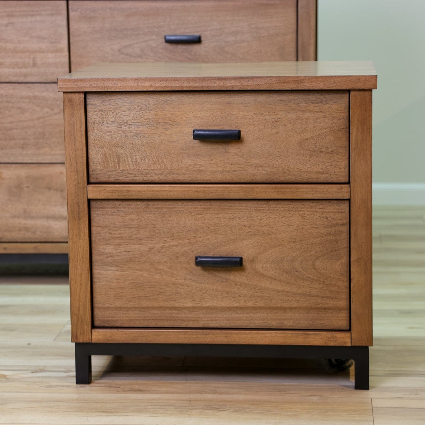 This Graham Wooden Nightstand is made of high-quality wood with sleek black accents. It includes two outlet slots and a usb charging port, making it a convenient addition to any bedroom. Keep your devices charged and your bedside organized with this stylish nightstand.