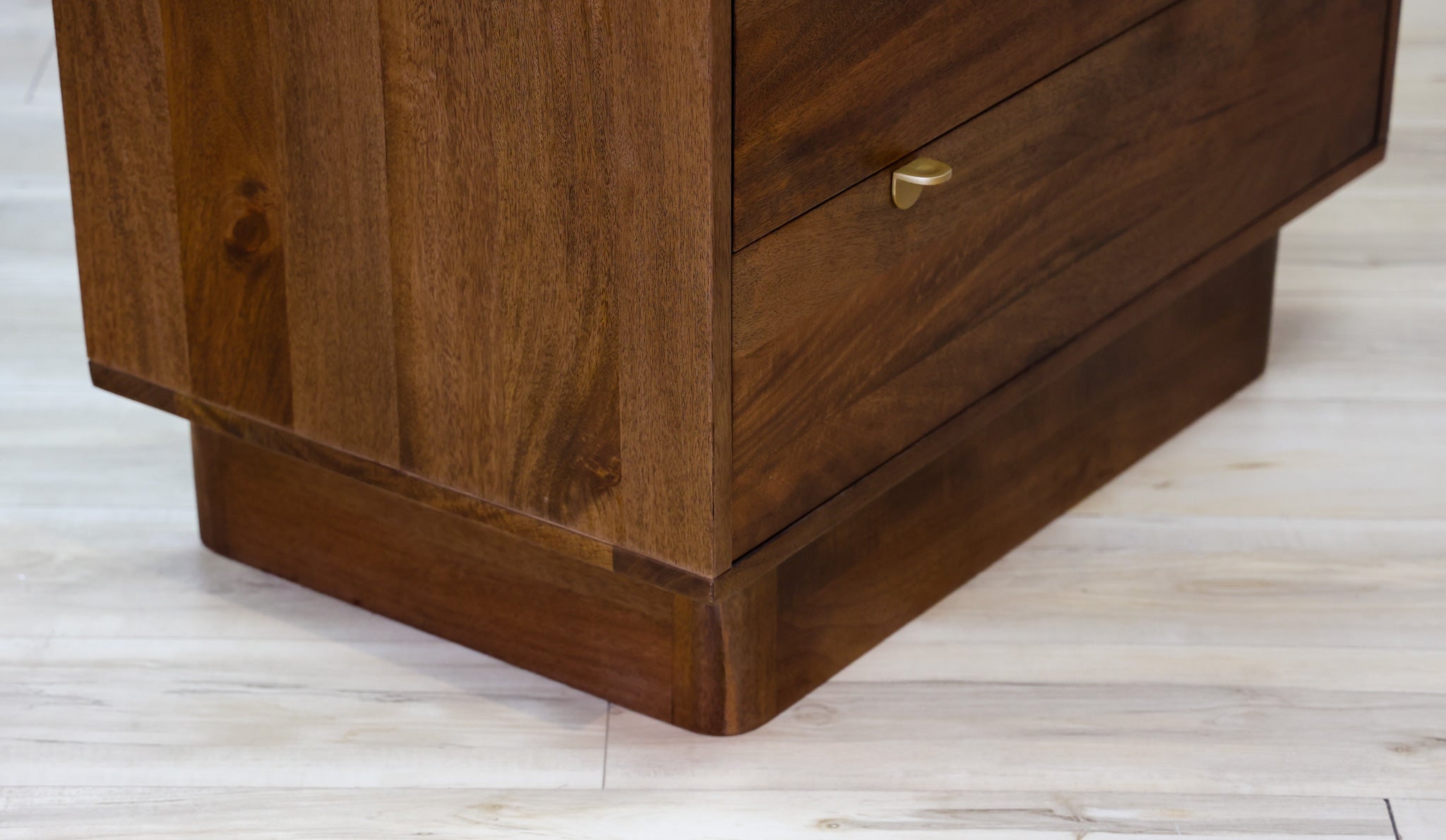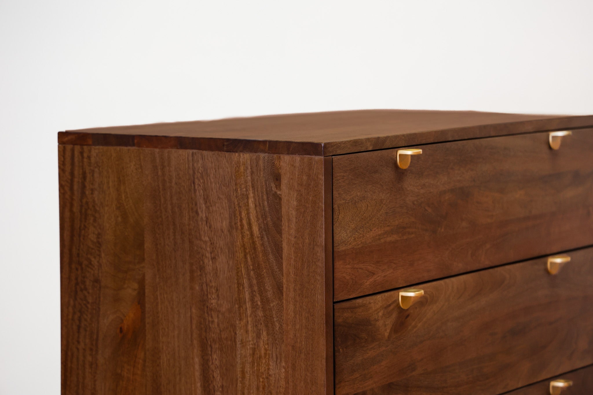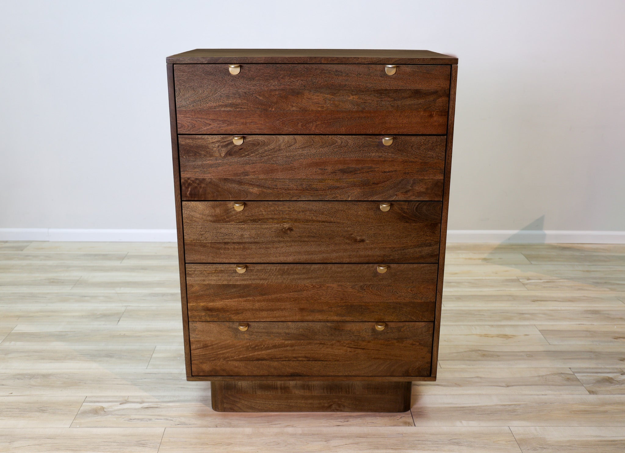 Completing the Harper Bedroom set originally designed by Dwell & Company, the Harper chest continues showcasing the beauty of solid mango wood, with its rich, dark finish not covering up the natural color and tone variations this wood is famous for. Soft close drawers decorated with small gold handle pulls for a piece that looks, feels, and functional like luxury.