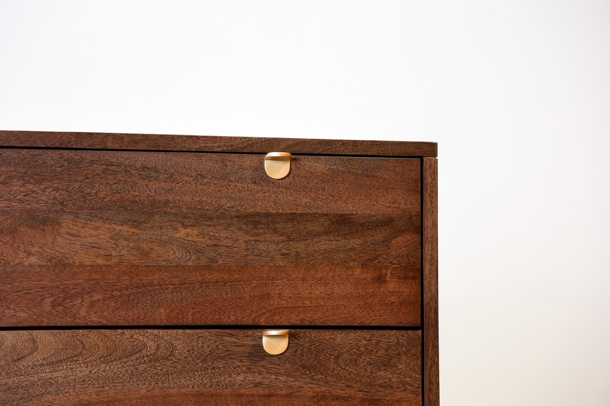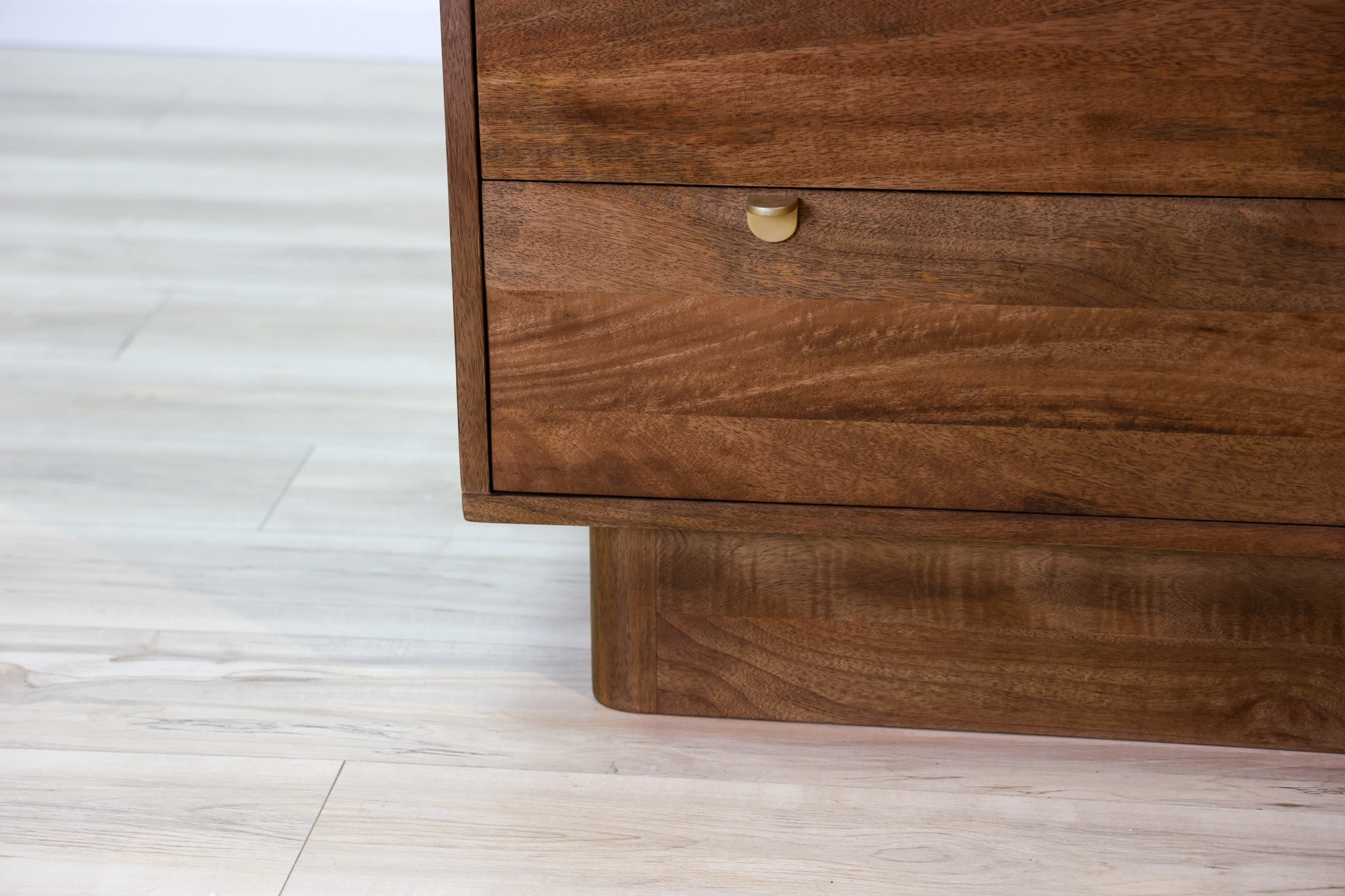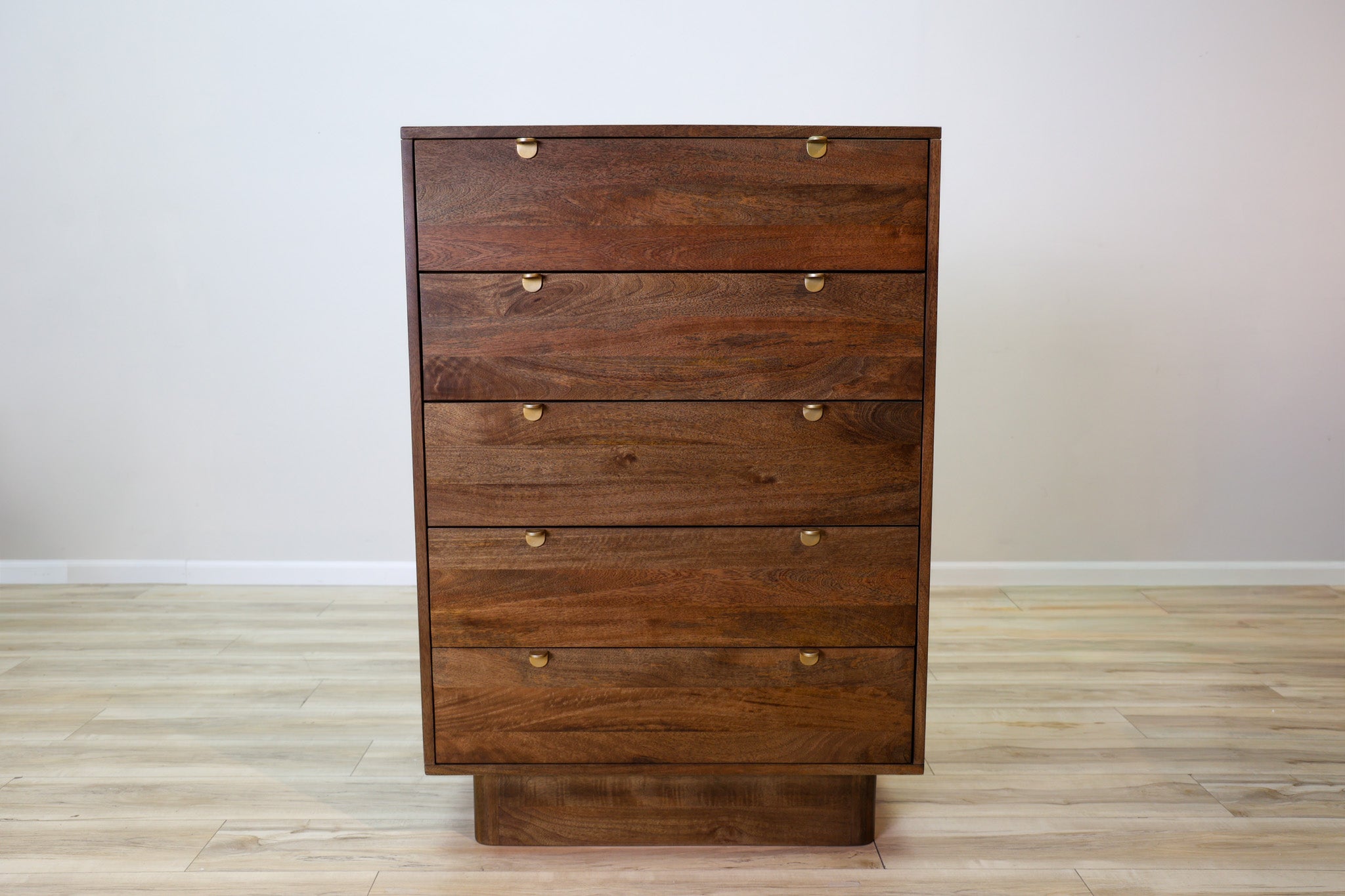 Completing the Harper Bedroom set originally designed by Dwell & Company, the Harper chest continues showcasing the beauty of solid mango wood, with its rich, dark finish not covering up the natural color and tone variations this wood is famous for. Soft close drawers decorated with small gold handle pulls for a piece that looks, feels, and functional like luxury.