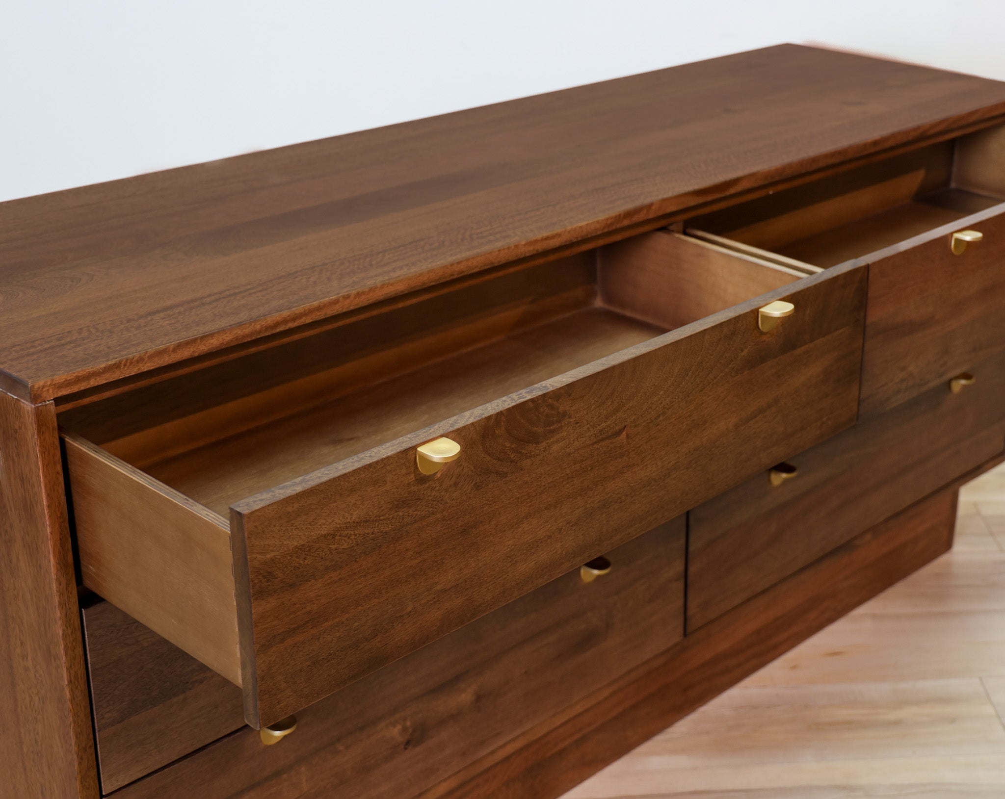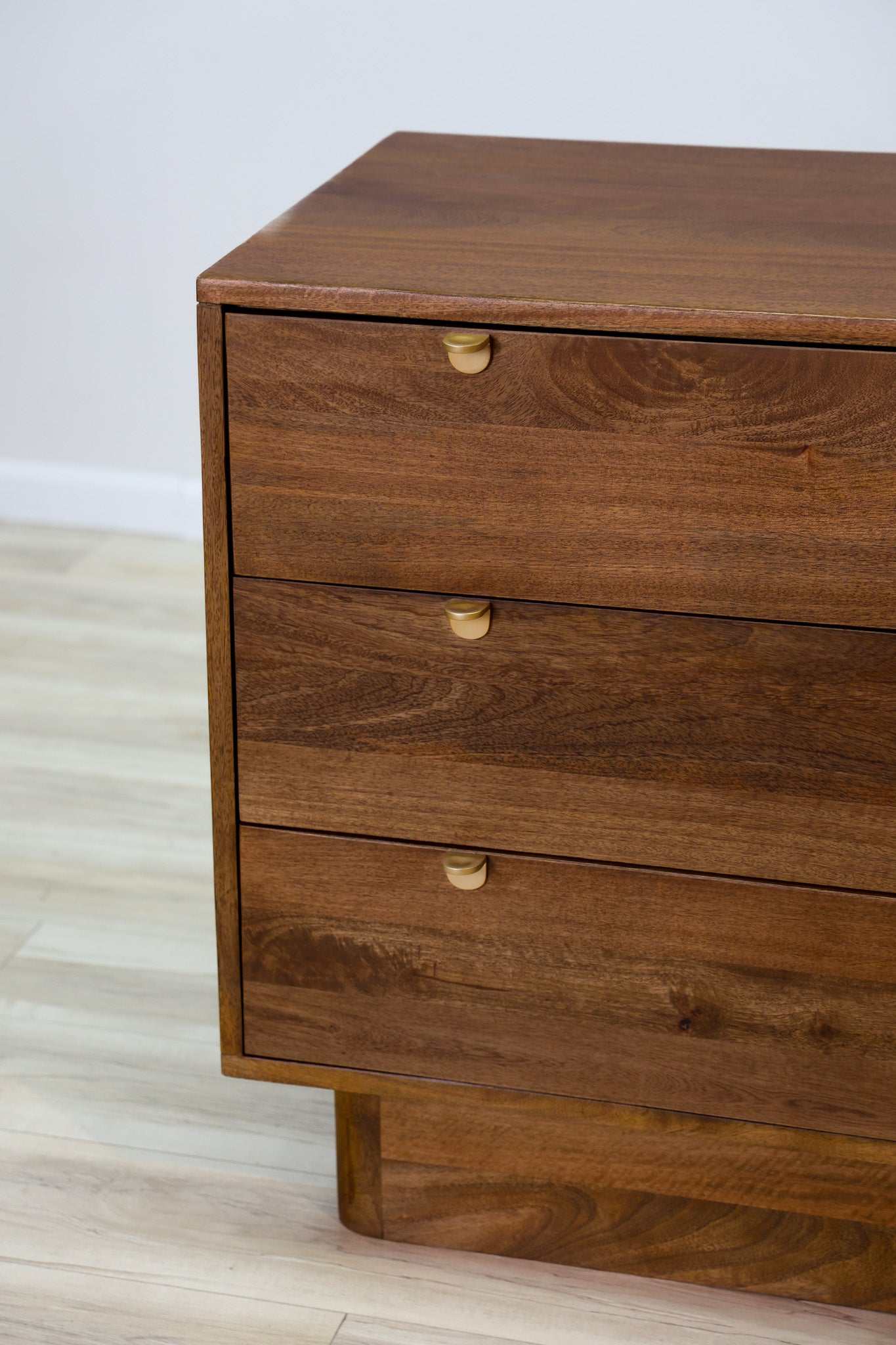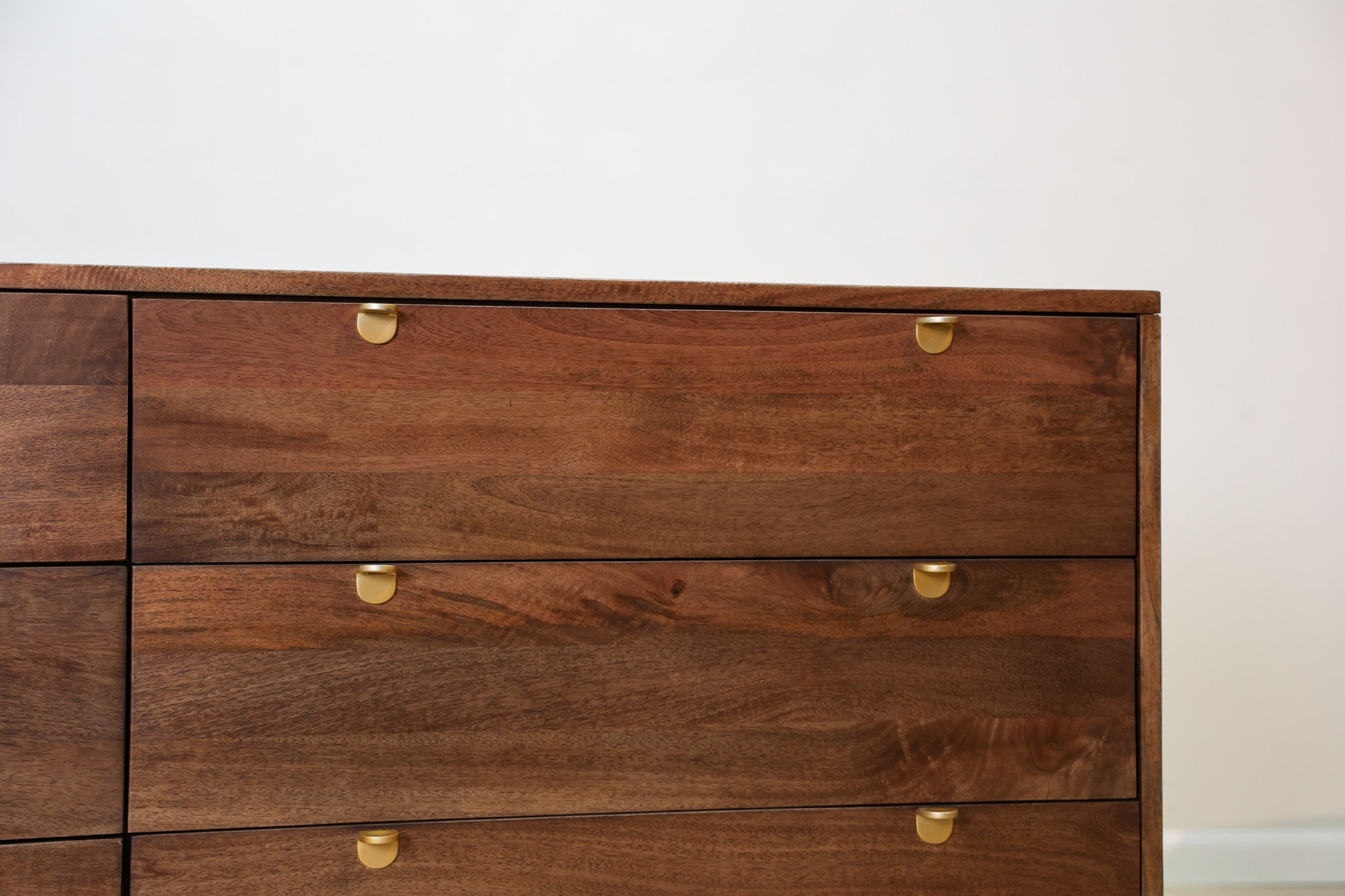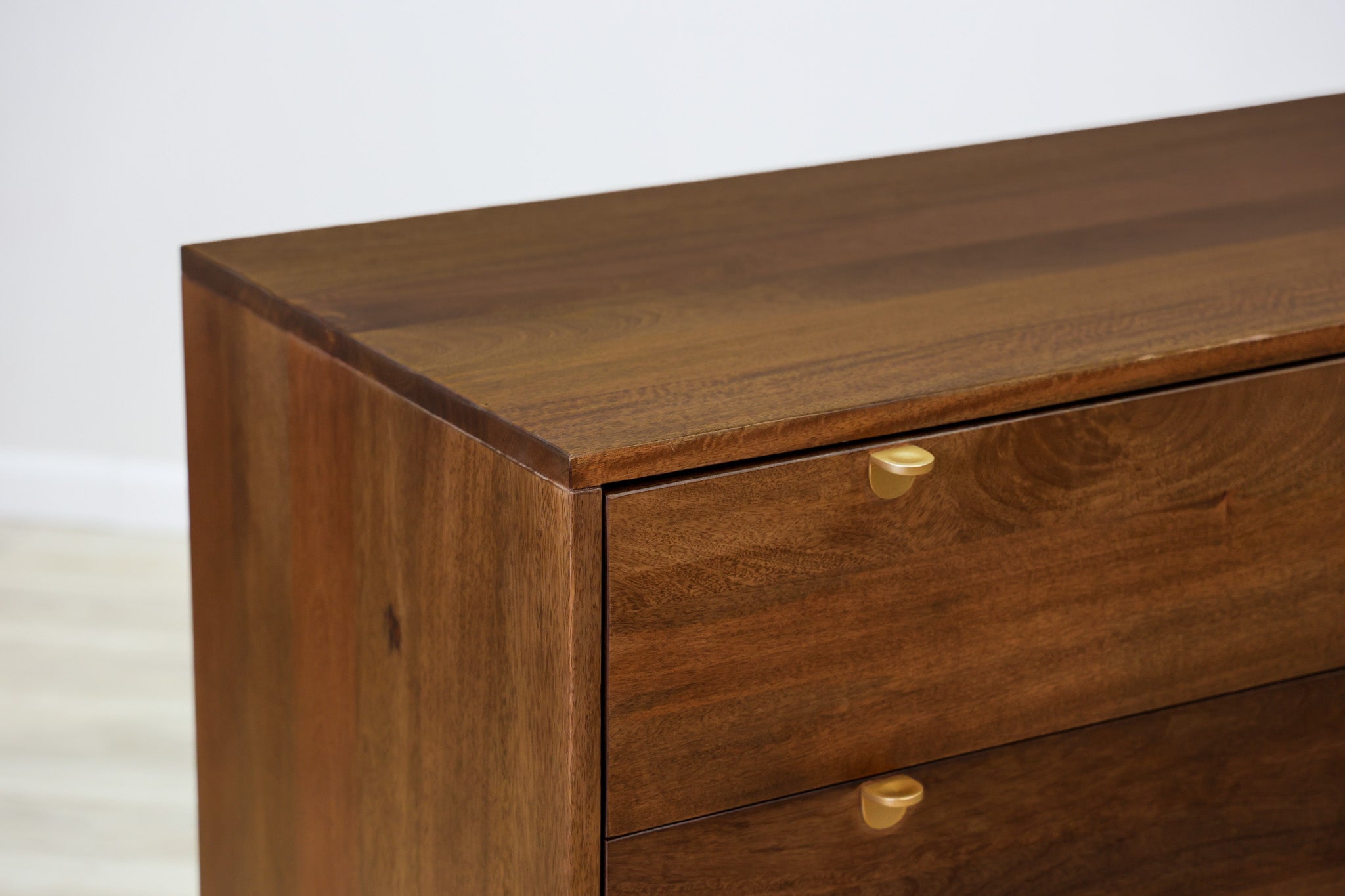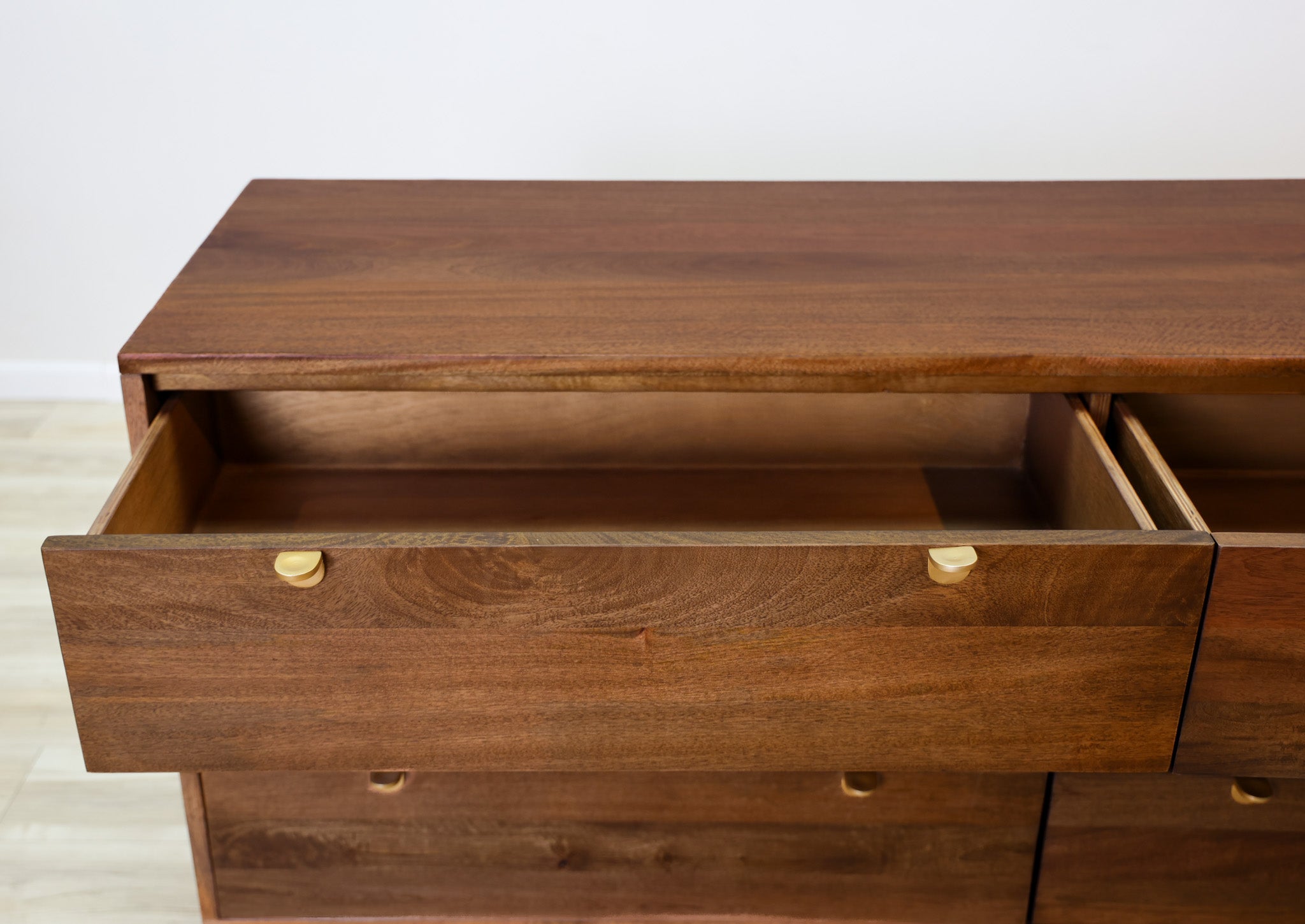 Solid mango wood steals the show in this collection - its rich and striking natural variations allowed to show through a rich dark finish. Small gold handle pulls add a soft touch of elegance and luxury and contrasts gorgeously with the dark wood. Equipped with soft close drawers and ample storage space, we're proud to claim this set as a Dwell & Company original!