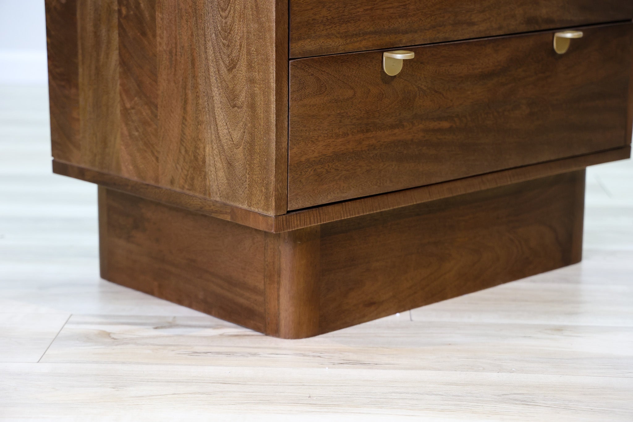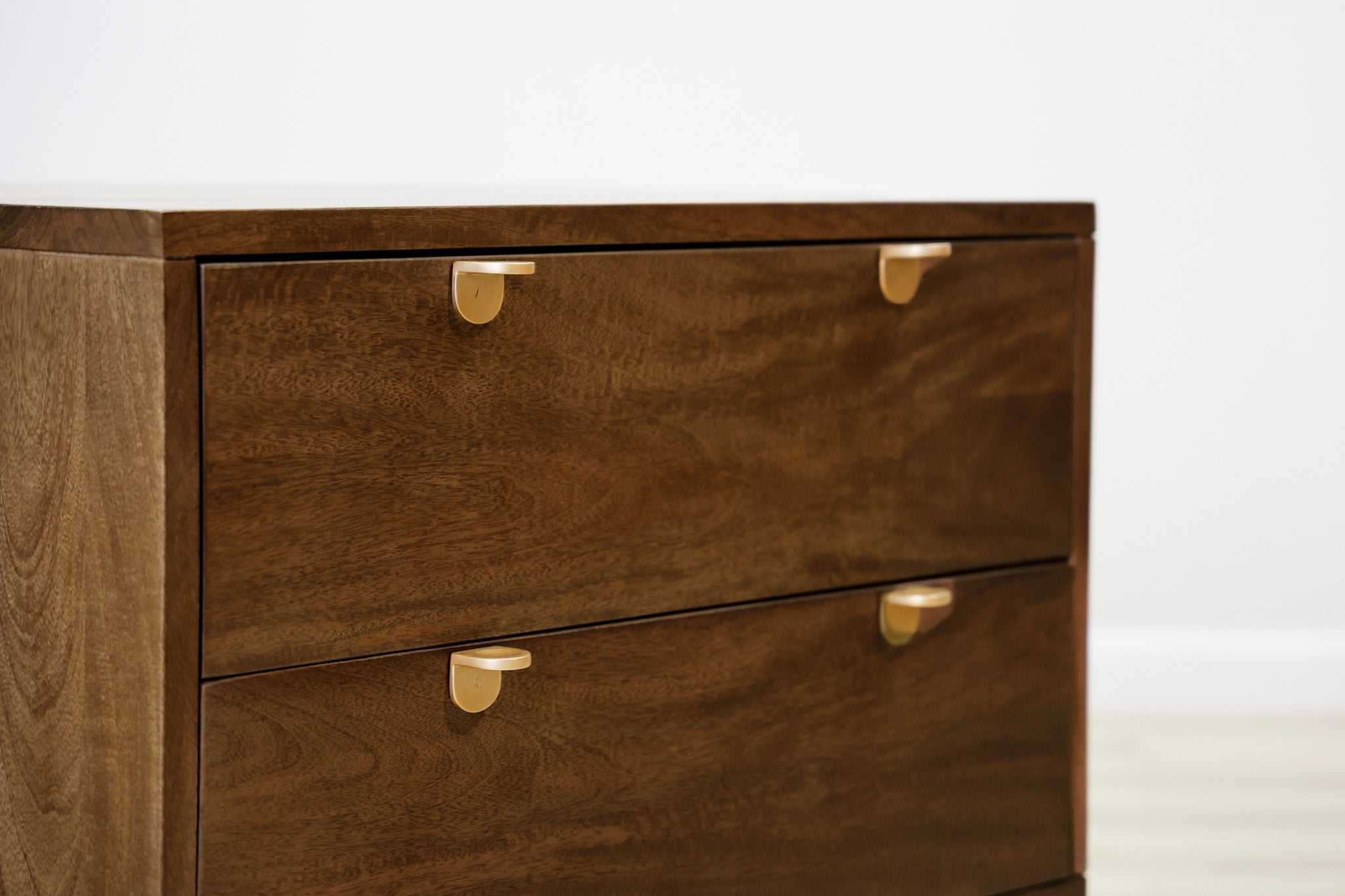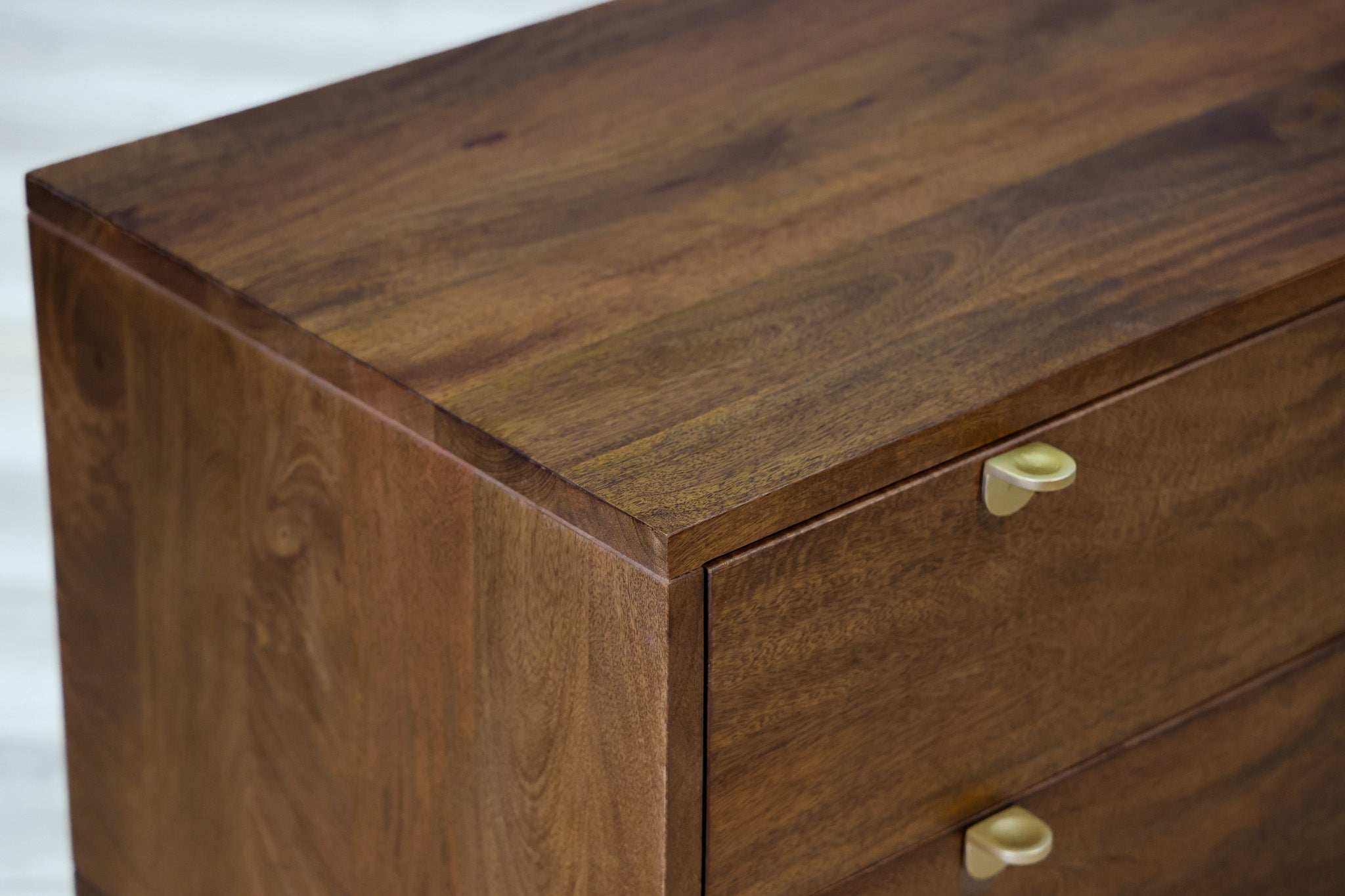 No trickery with this one - this is pure elegance in design. Dark finished mango wood allows its natural wood tones and variations to shine though, while small gold handles pulls that add a touch of sophistication without distracting from the main star of the show. Designed and built by Dwell & Company to be sturdy, durable, and functional with its deep drawers and soft close system.