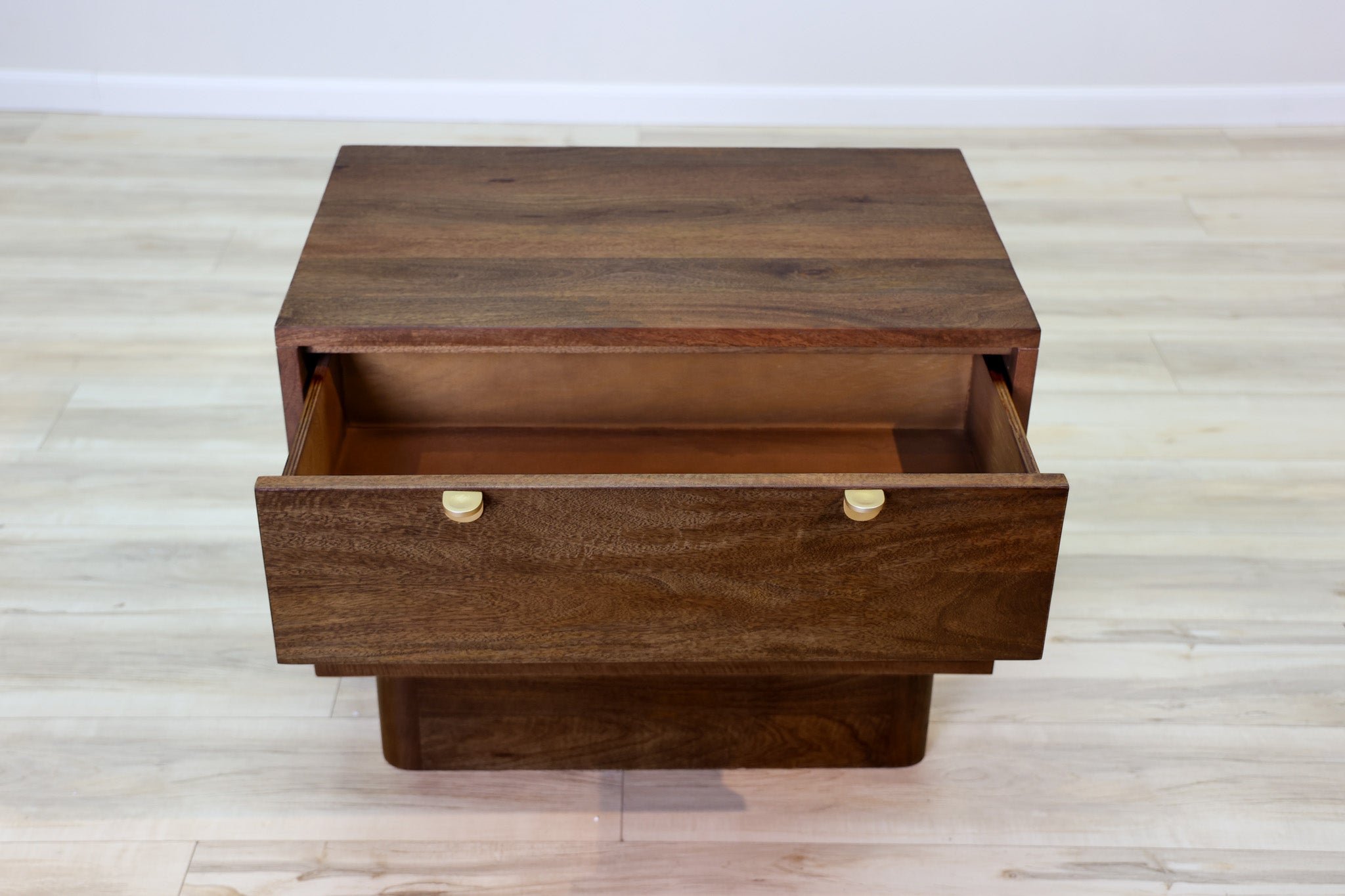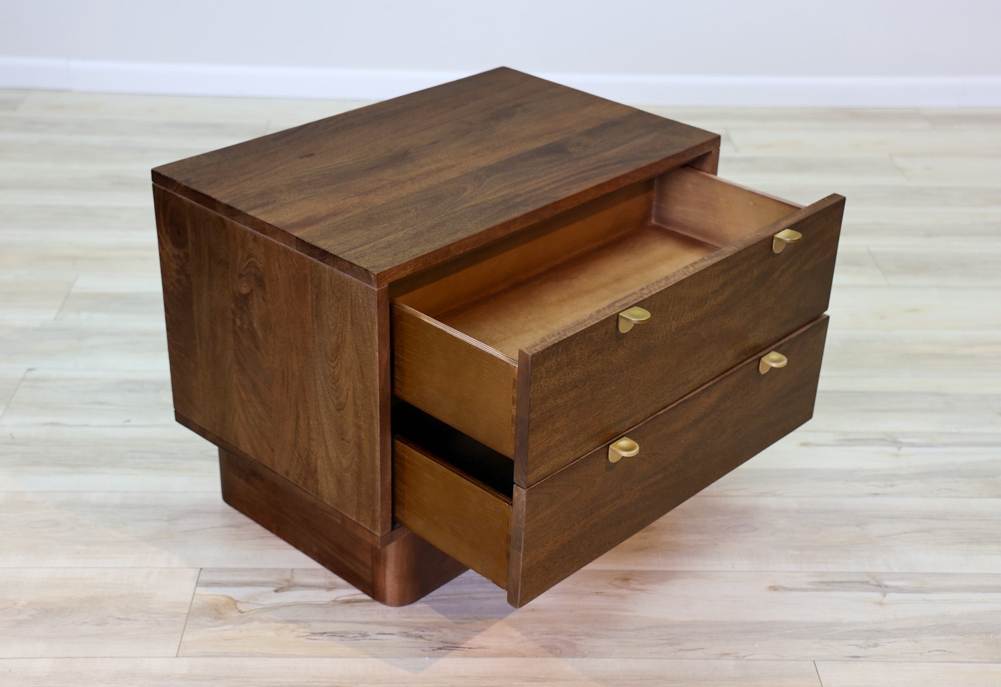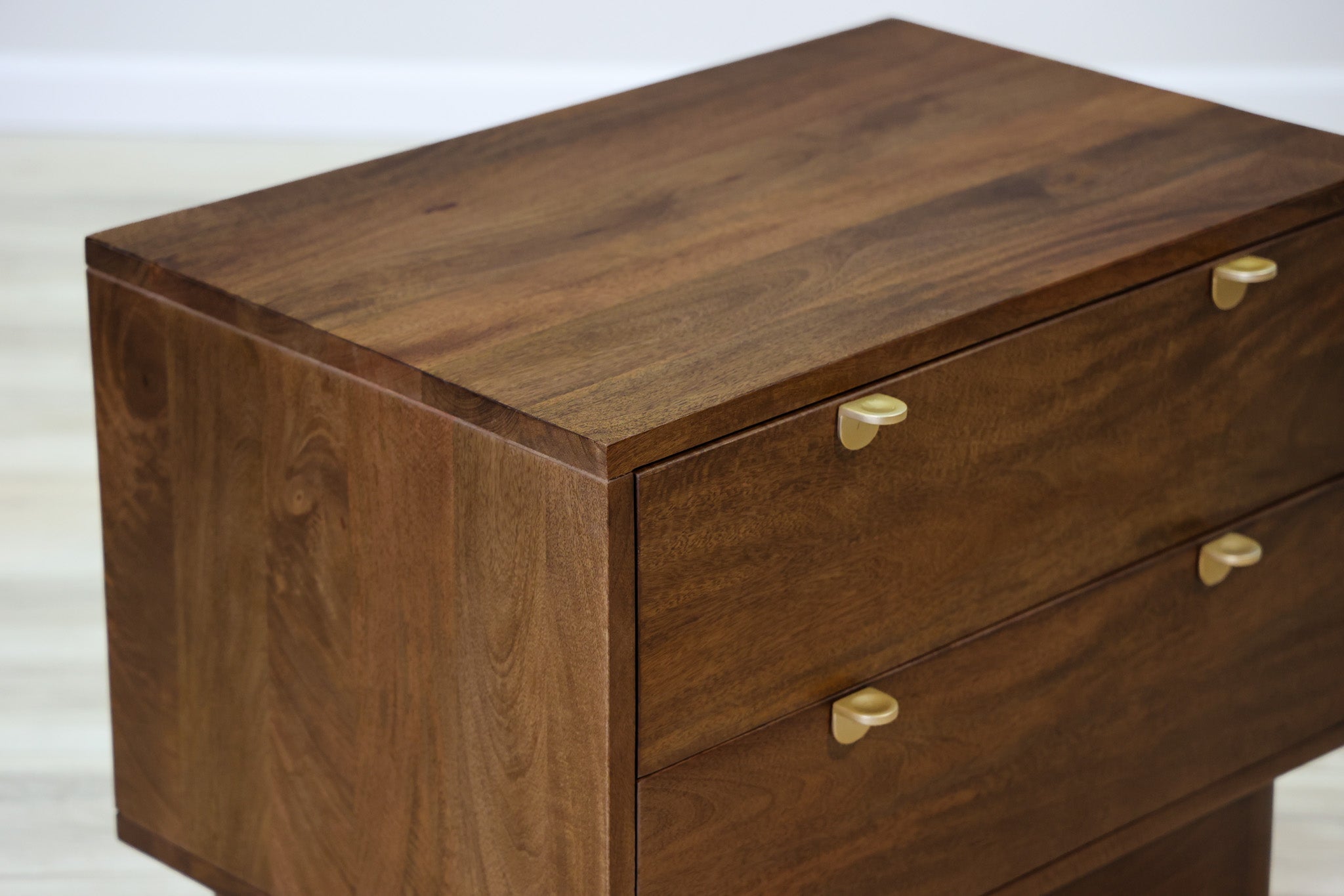 No trickery with this one - this is pure elegance in design. Dark finished mango wood allows its natural wood tones and variations to shine though, while small gold handles pulls that add a touch of sophistication without distracting from the main star of the show. Designed and built by Dwell & Company to be sturdy, durable, and functional with its deep drawers and soft close system.
