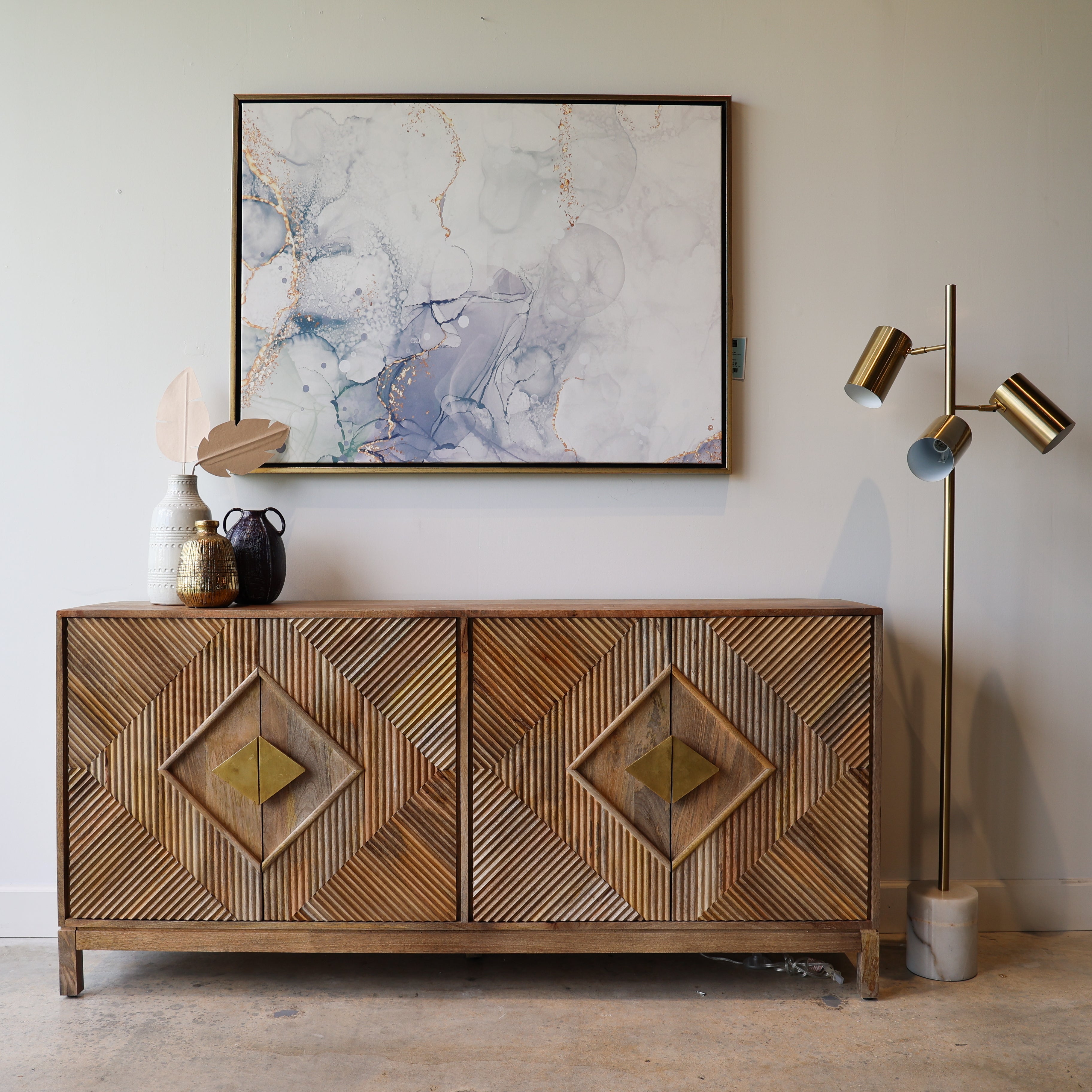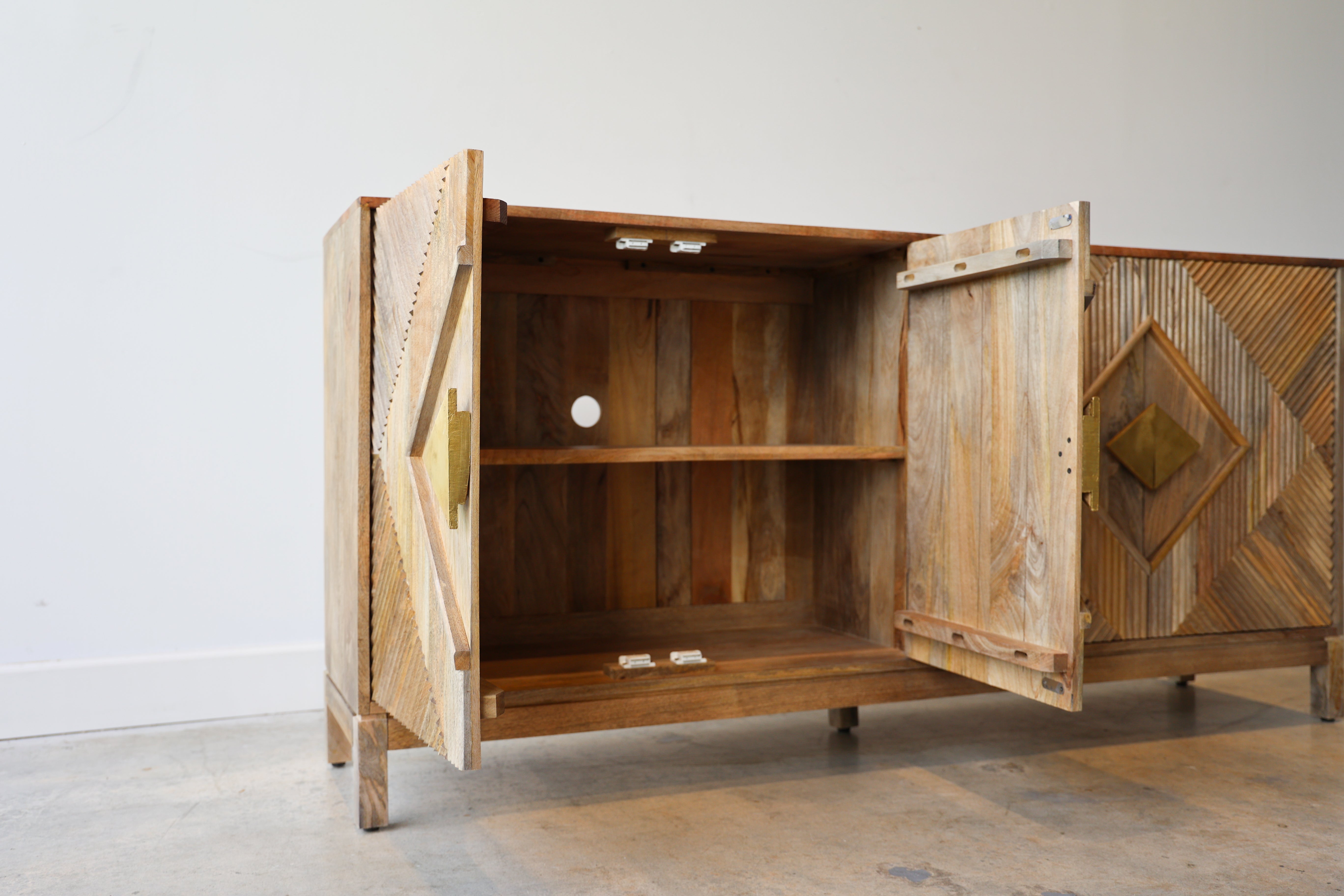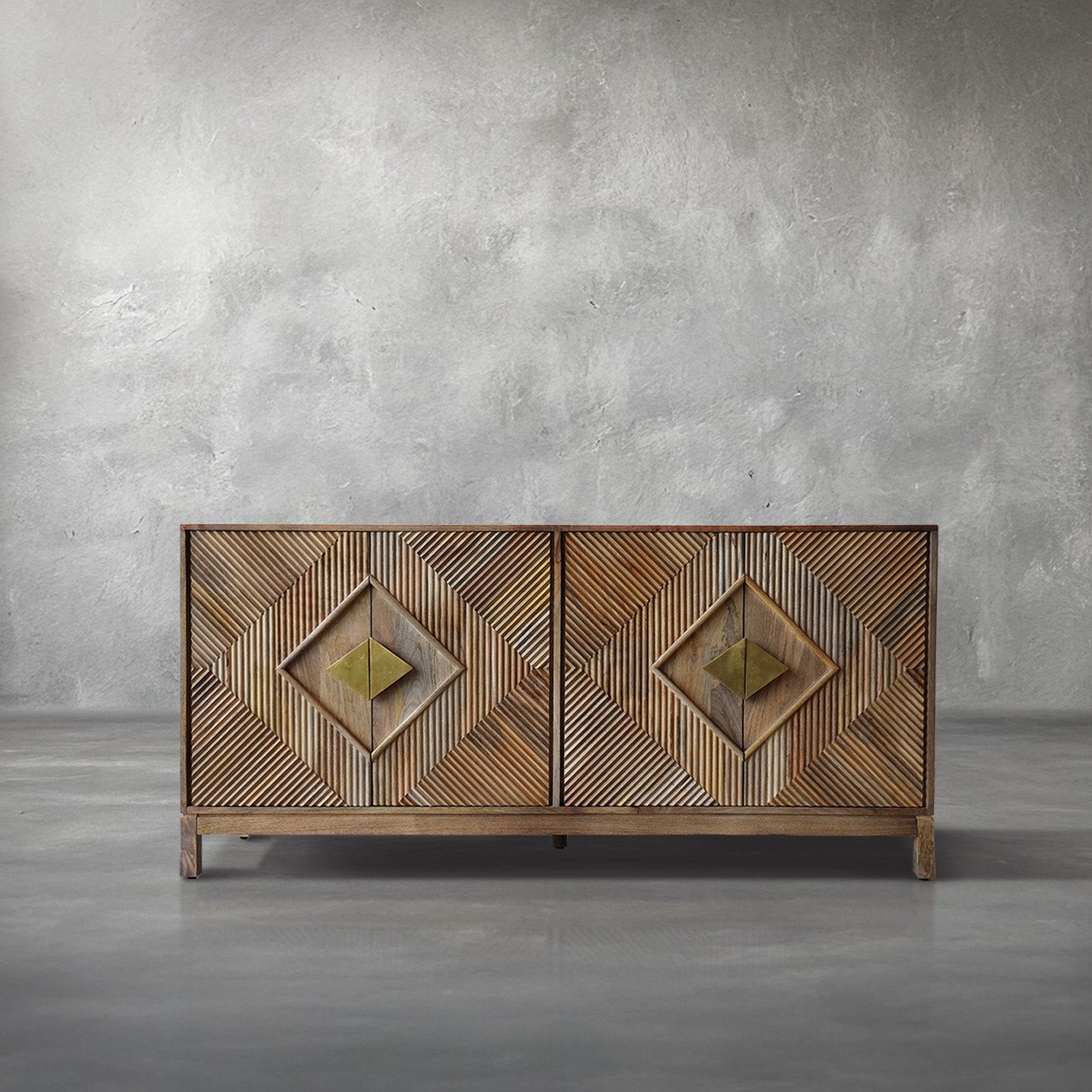 Classic elegance with stunning visual interest join together in the De La Rosa Credenza! This credenza features a reeding elements, painstakingly inlaid to create a gorgeous geometric pattern thats sure to start conversations. Even better, this sturdy construction made of mango wood offers a huge variety of natural wood tones, making it amazing in any space!