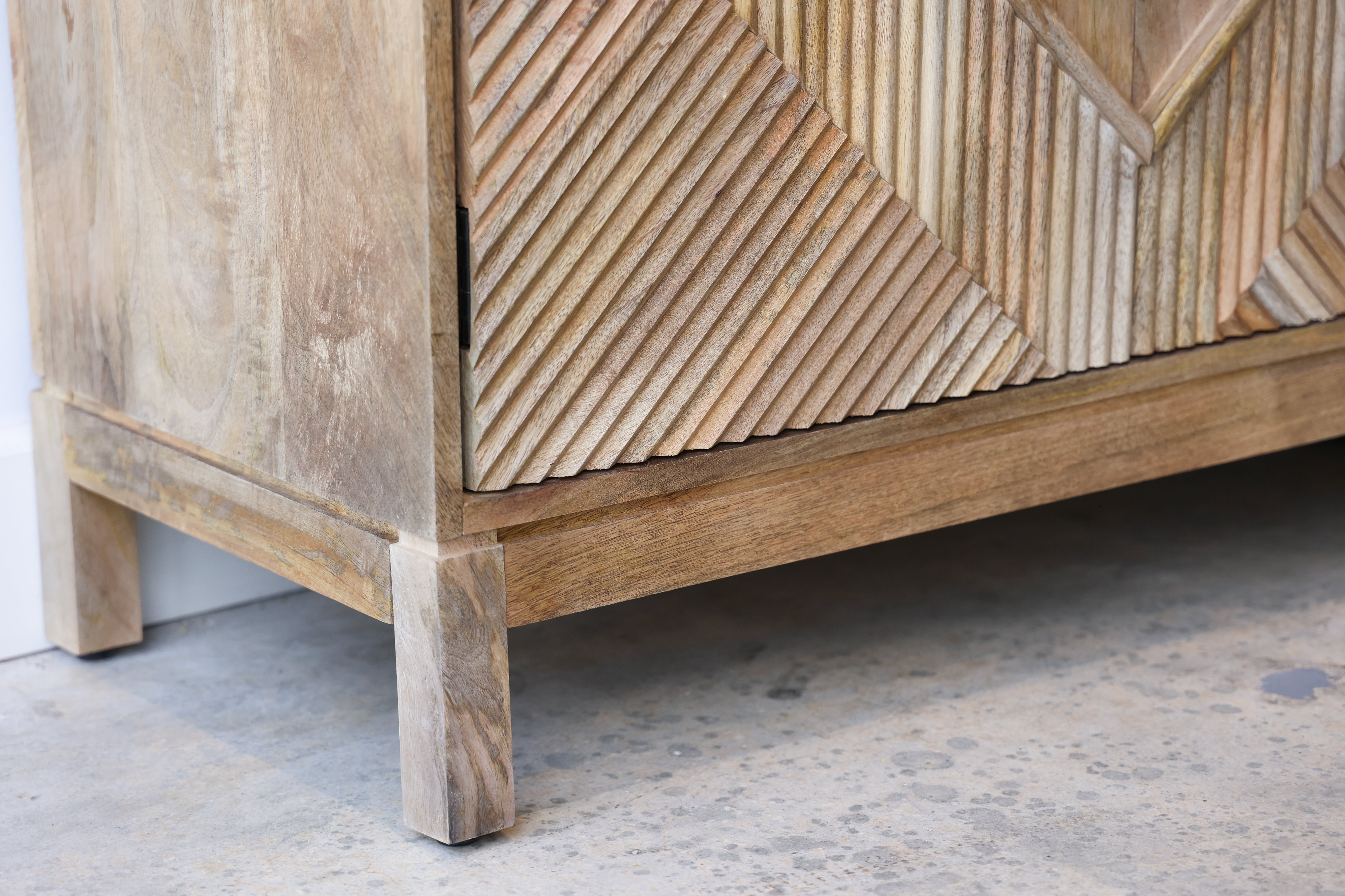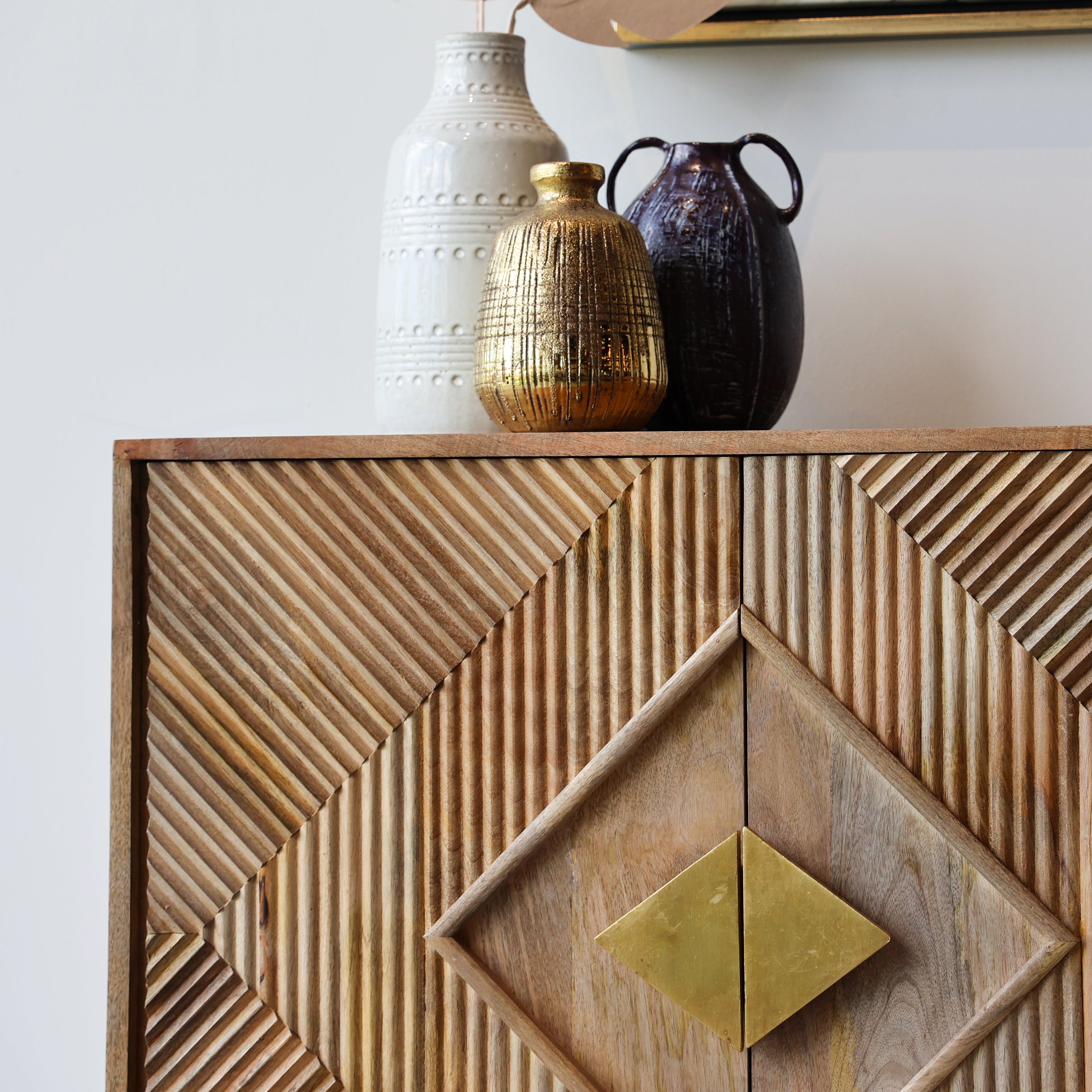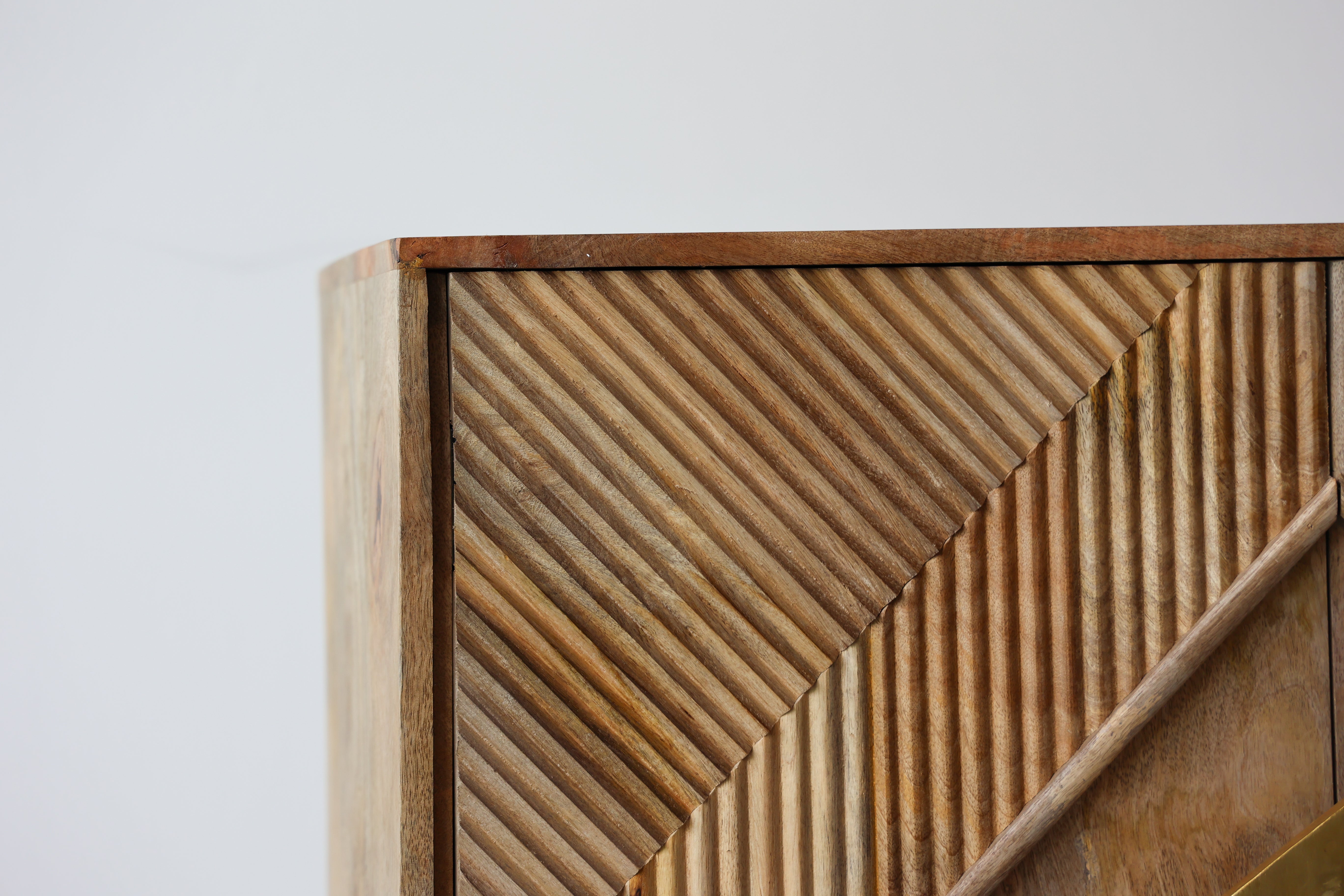 Classic elegance with stunning visual interest join together in the De La Rosa Credenza! This credenza features a reeding elements, painstakingly inlaid to create a gorgeous geometric pattern thats sure to start conversations. Even better, this sturdy construction made of mango wood offers a huge variety of natural wood tones, making it amazing in any space!