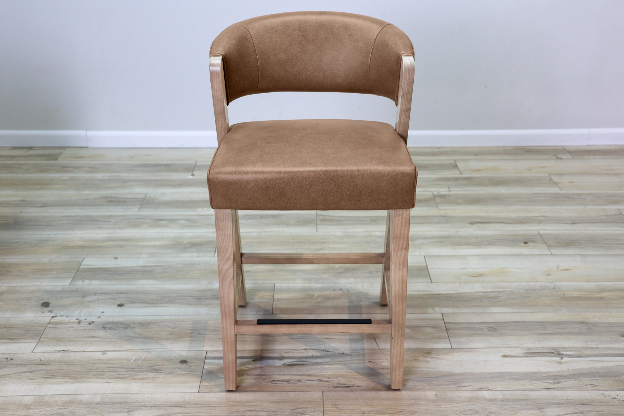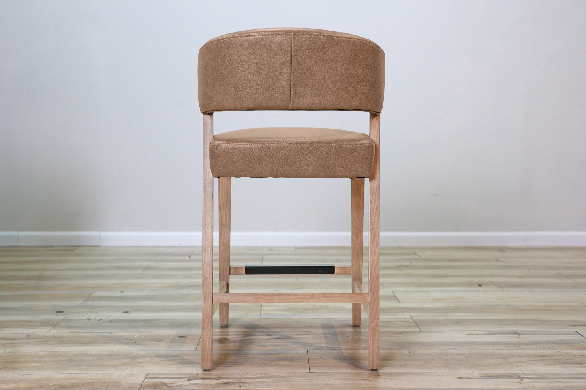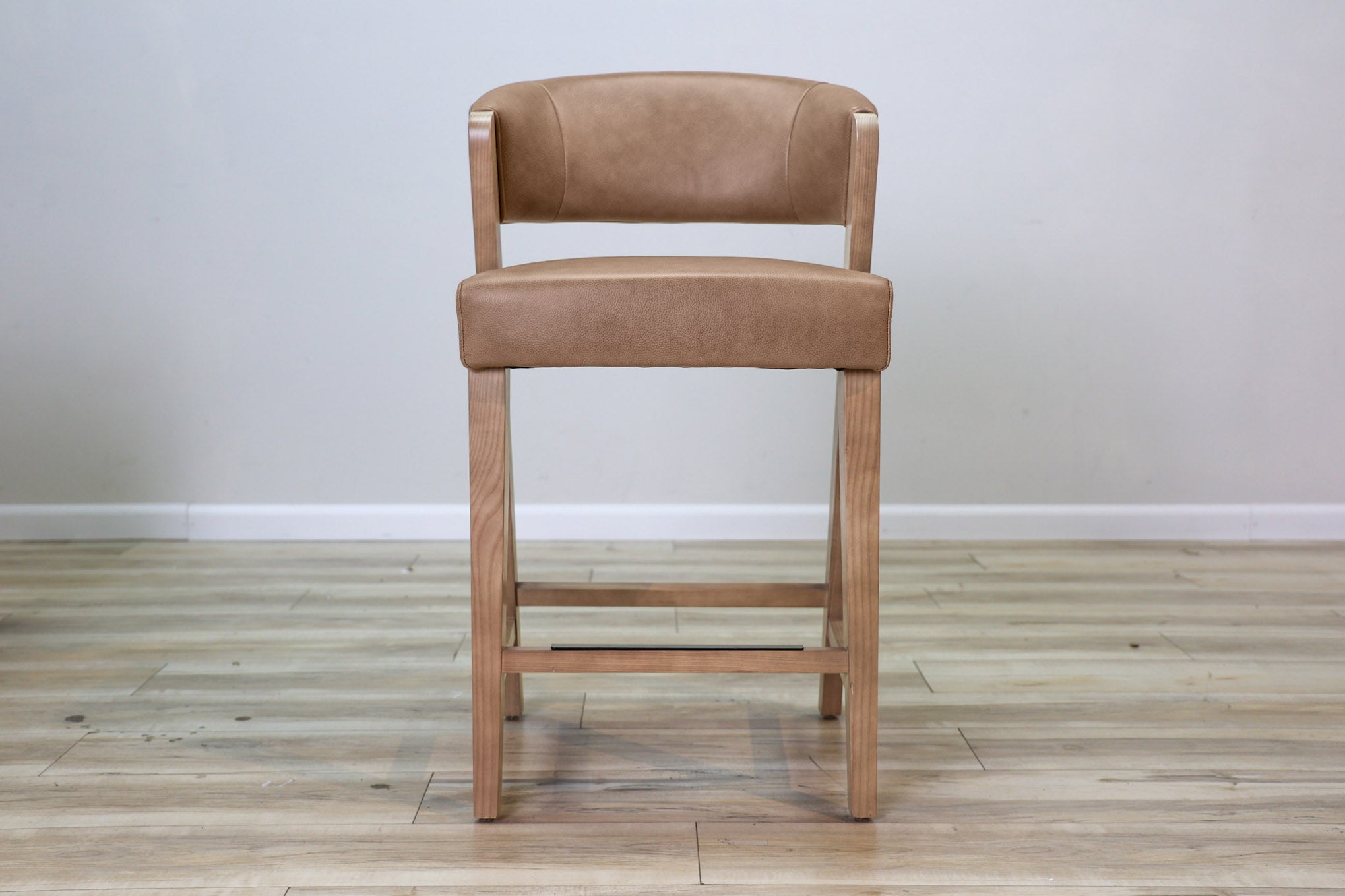 Warm Brown top grain leather wrapped around high density foam and all supported by a solid wood frame - this stool is as durable as it is stylish. Designed to stand the test of time in both performance and style, this sleek and modern dining chair is the perfect addition to any dining or bar space!
