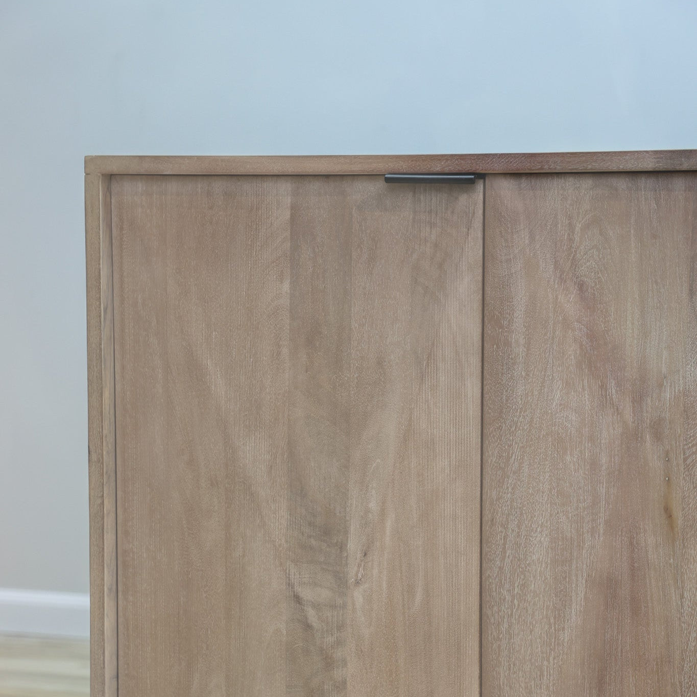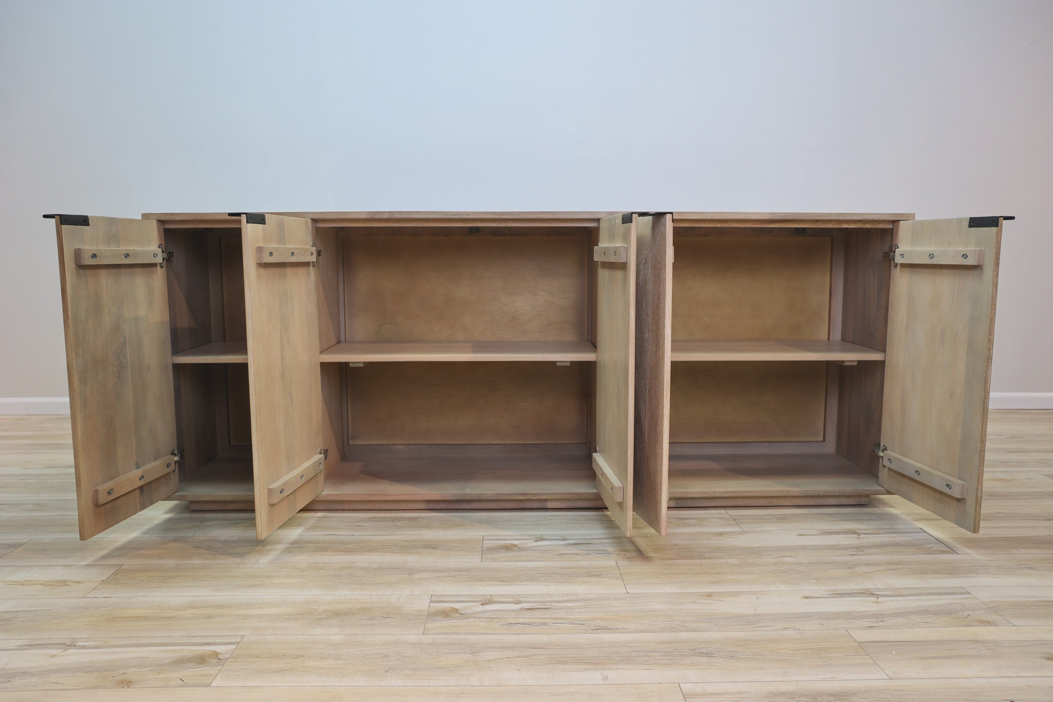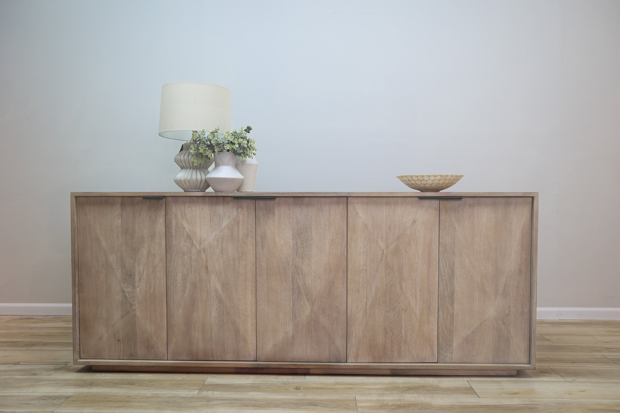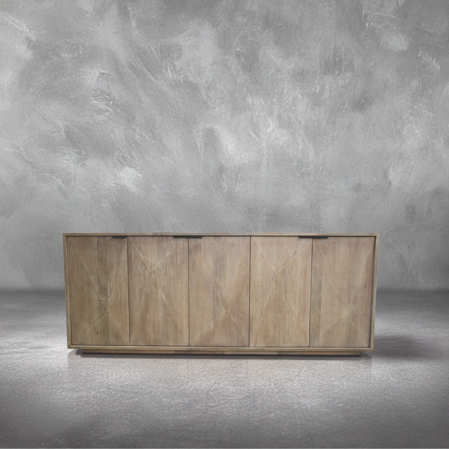 Crafted from sustainable mango wood, the Juliet Credenza boasts a subtle 3D geometric design on its cabinet doors. With an original design, this credenza combines style and sustainability for a unique addition to any space.