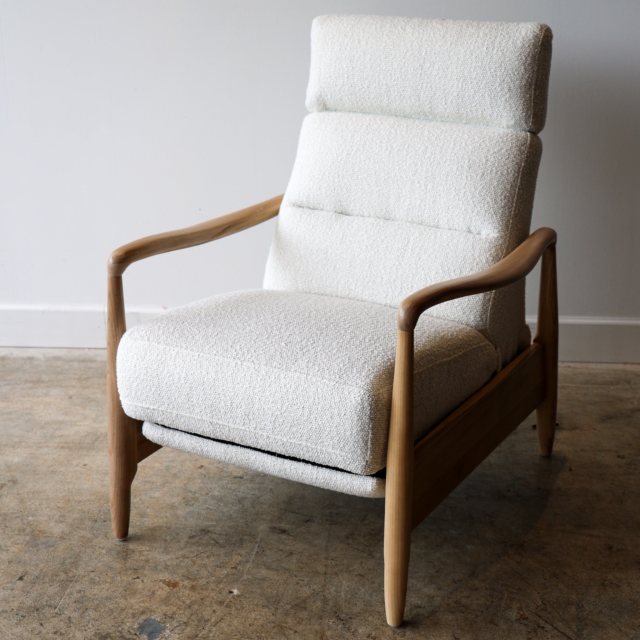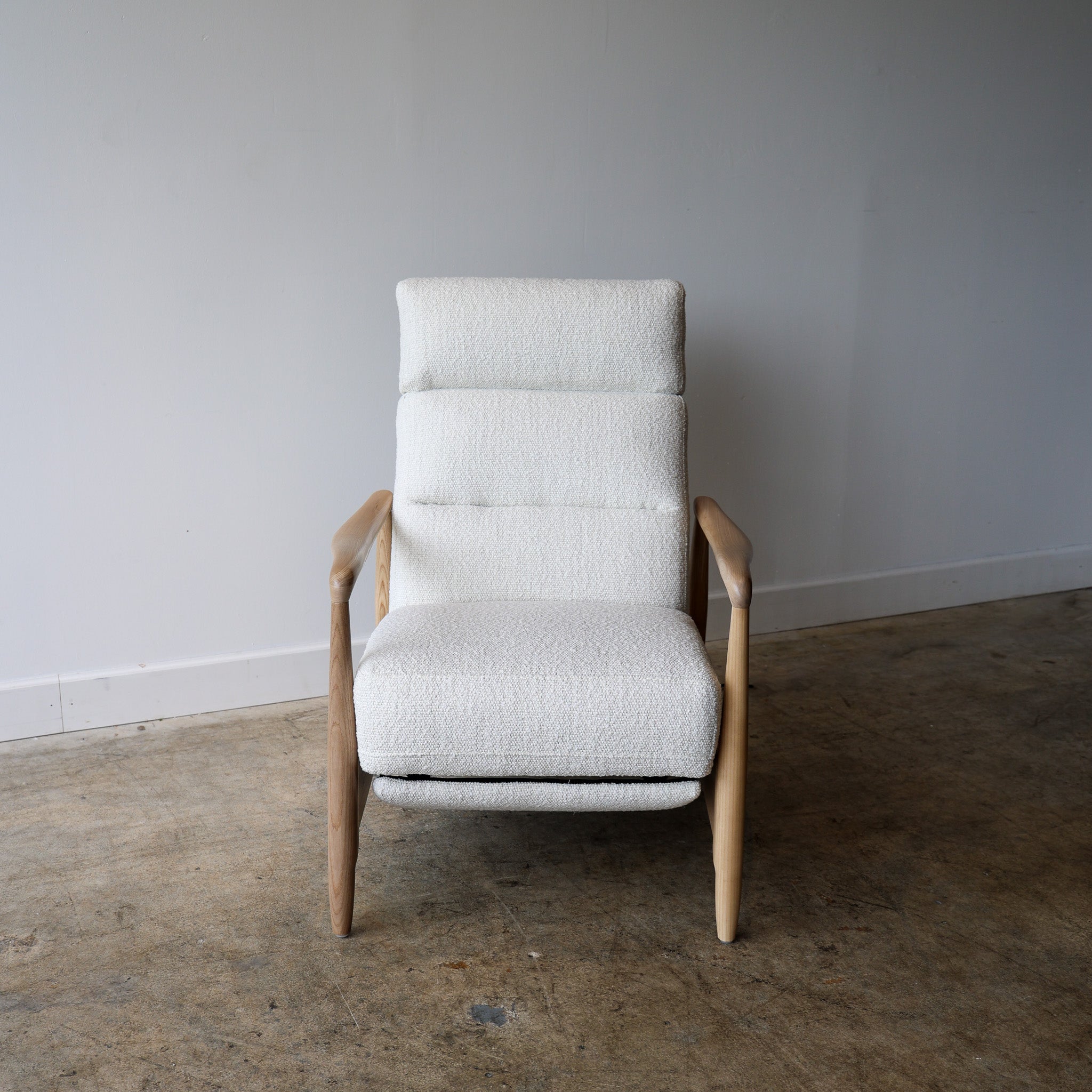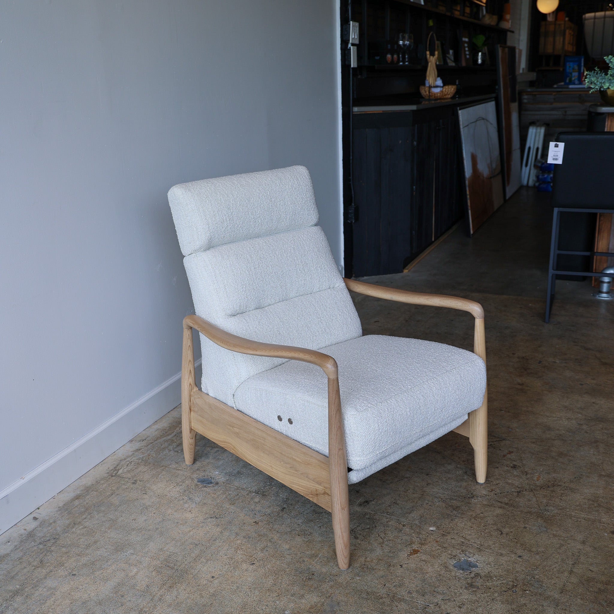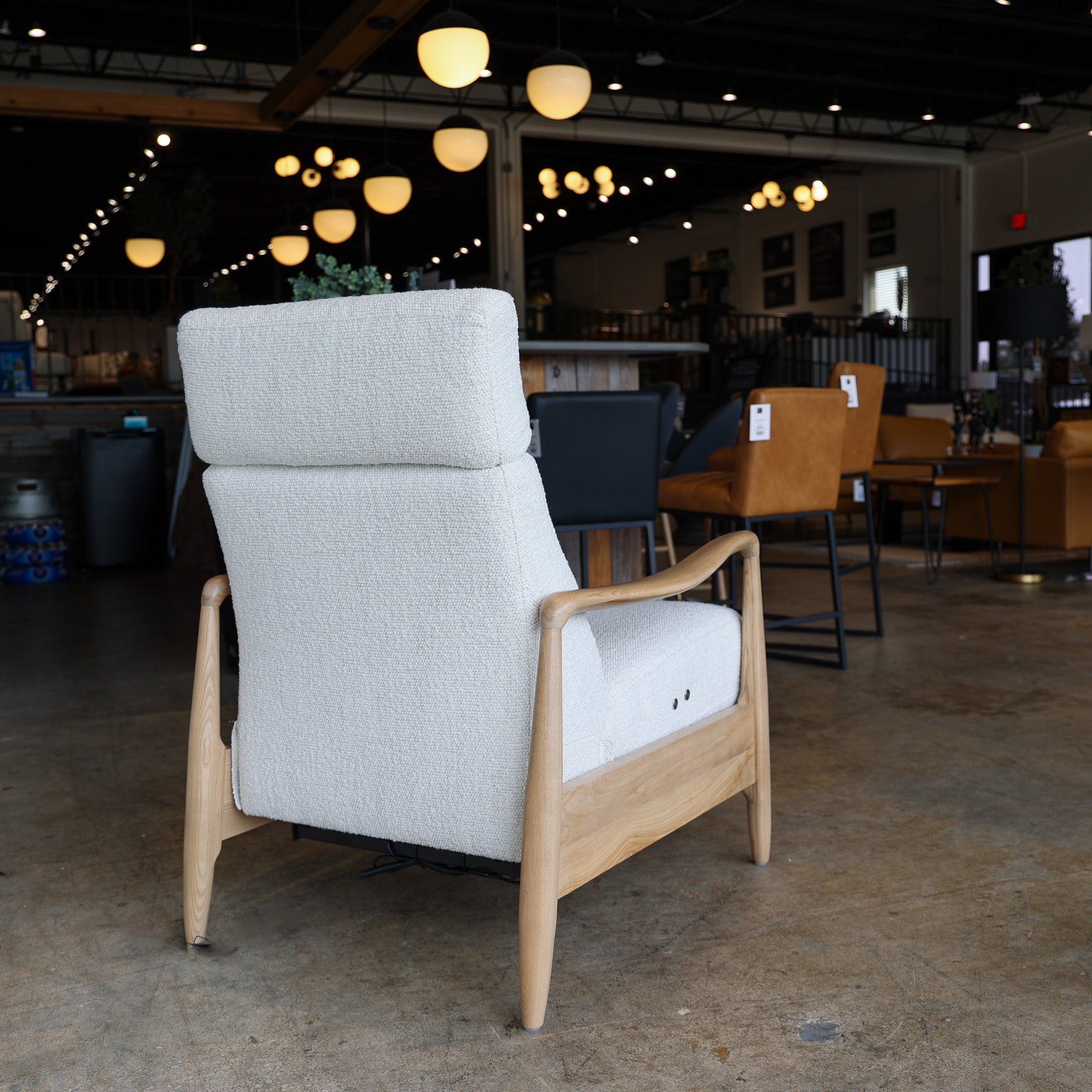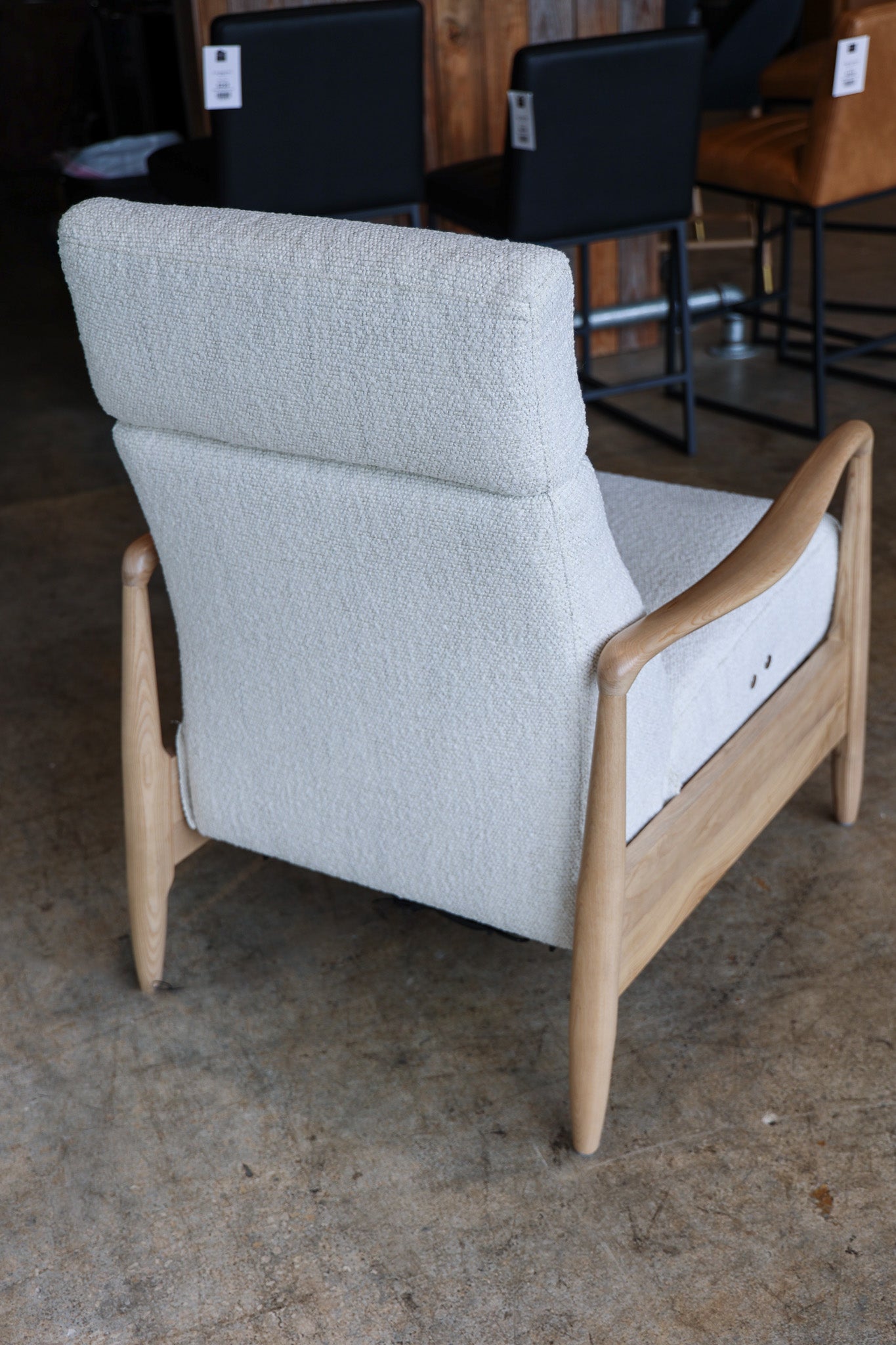 Experience luxurious comfort and style with our Magnolia Boucle Reclining Chair. With its soft boucle fabric and elegant lightwood accents, this chair adds a touch of sophistication to any room. Relax and recline in total bliss as you sink into the plush cushioning and ergonomic design. Upgrade your space today!