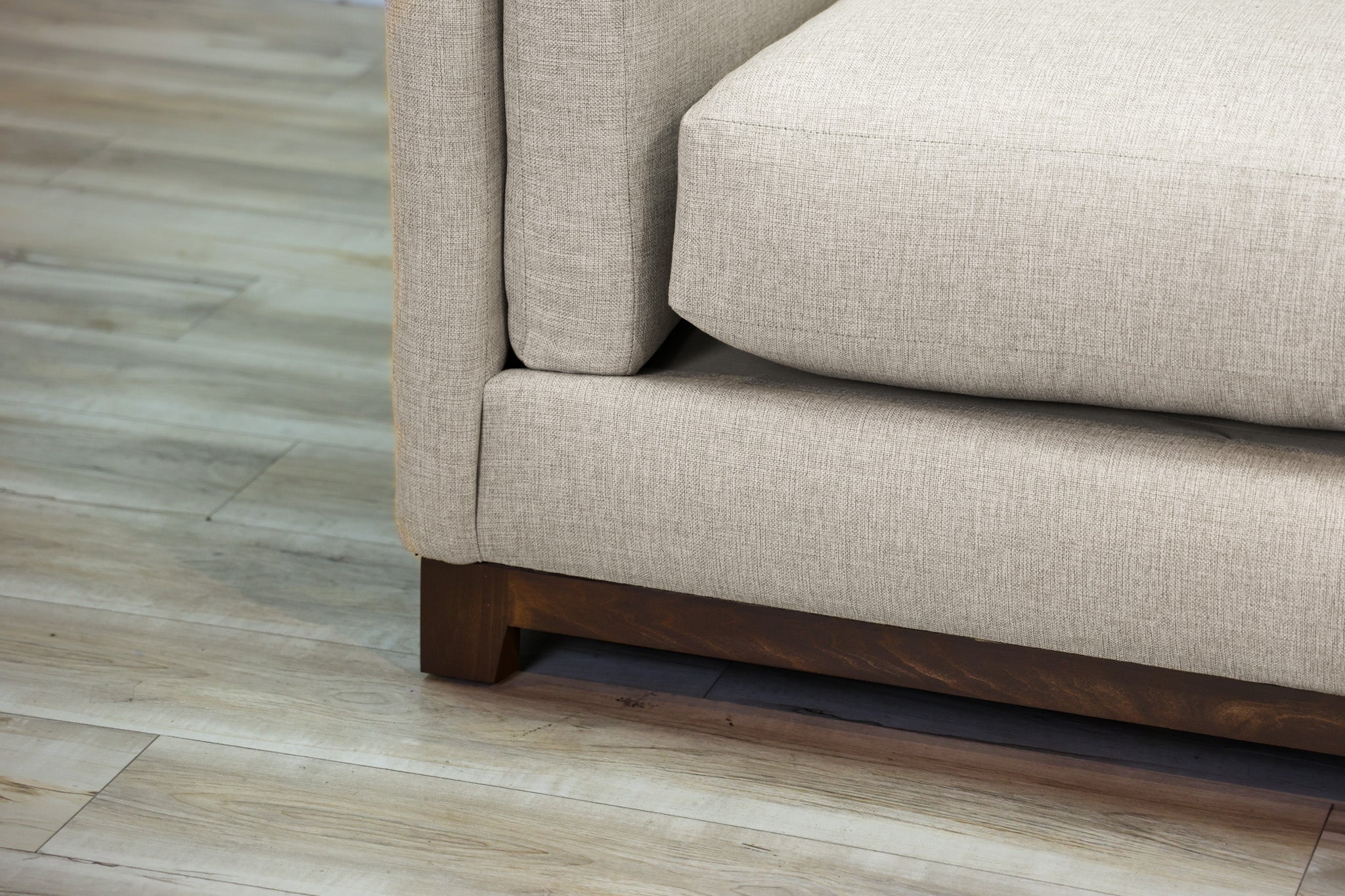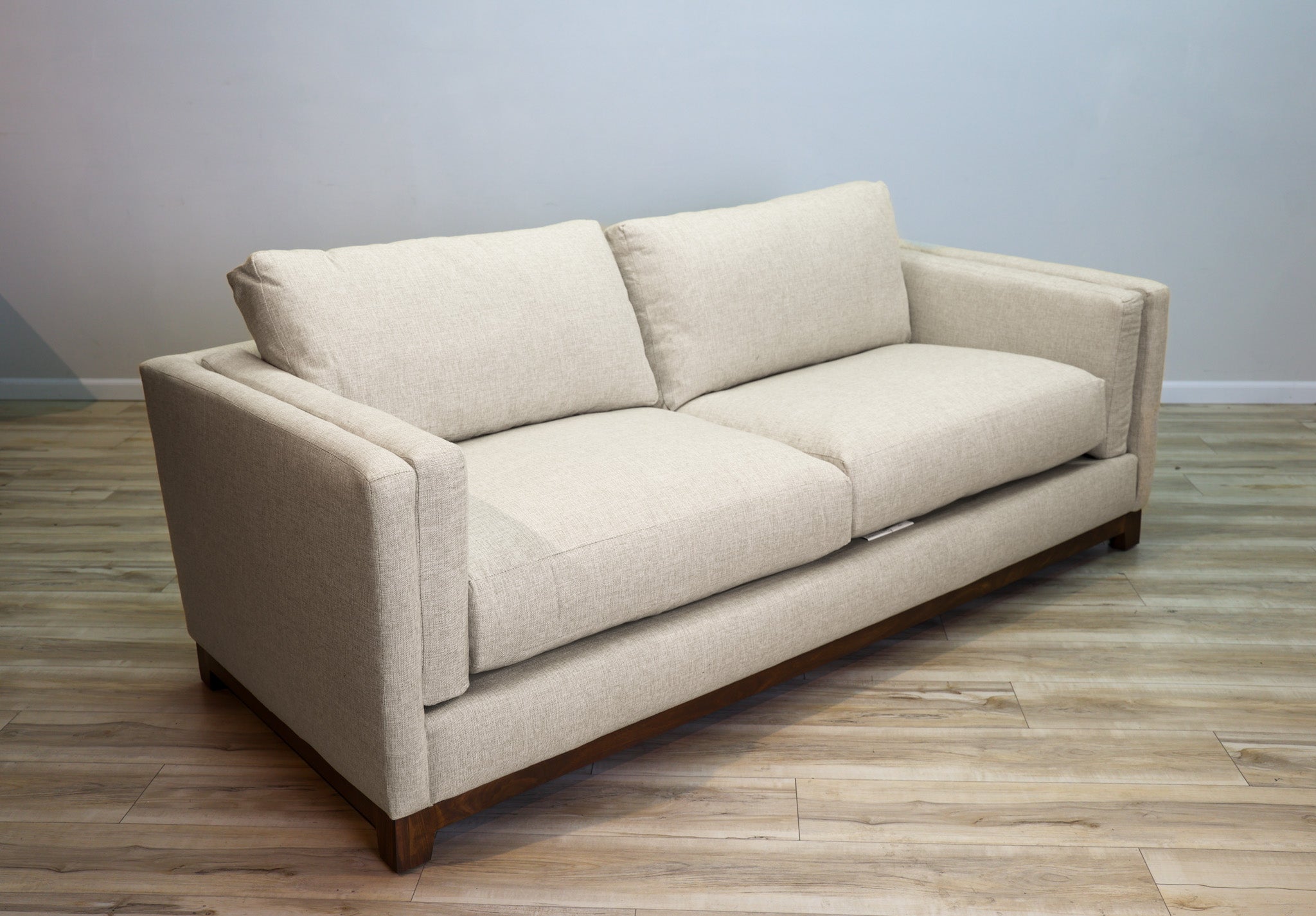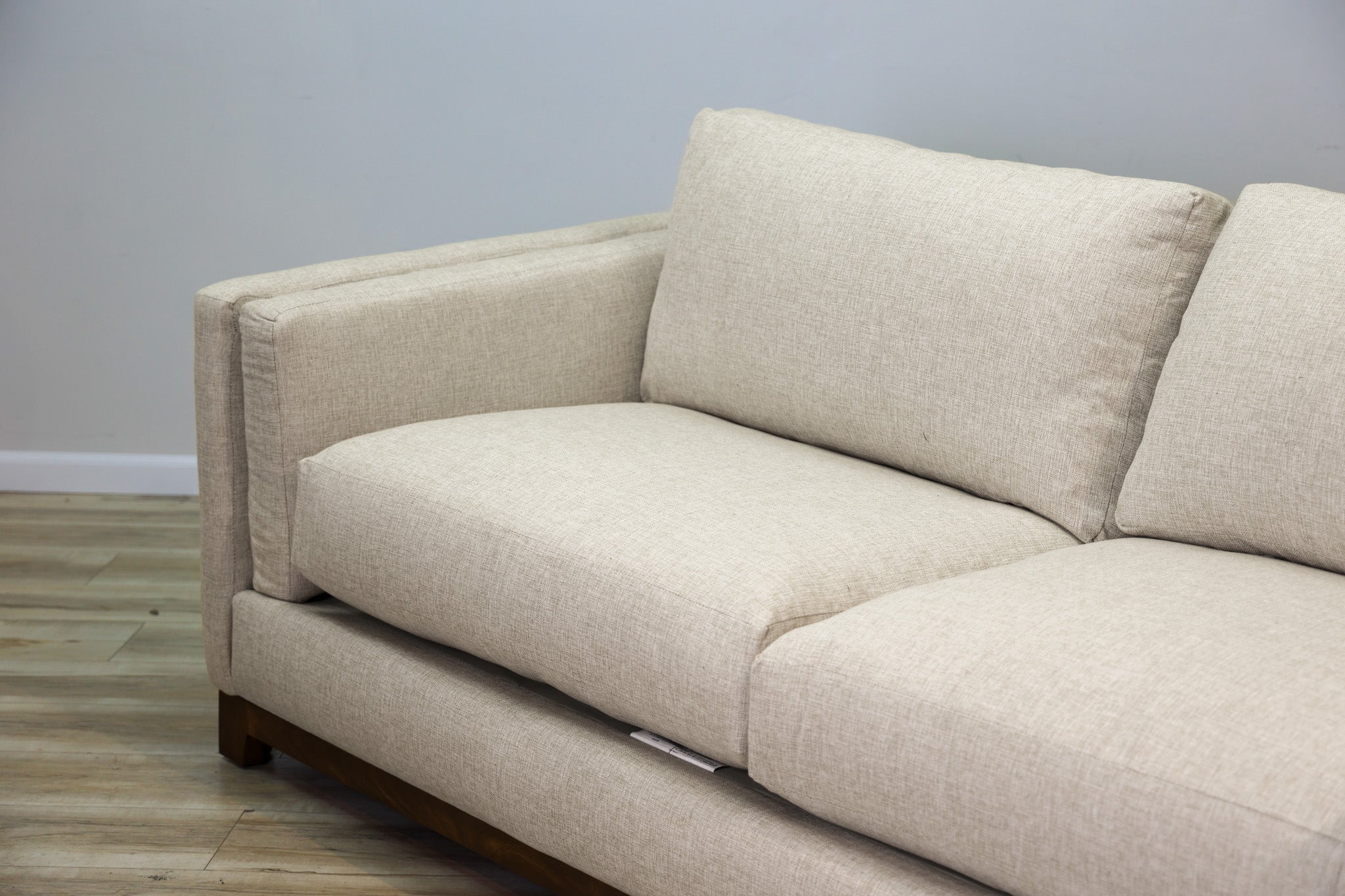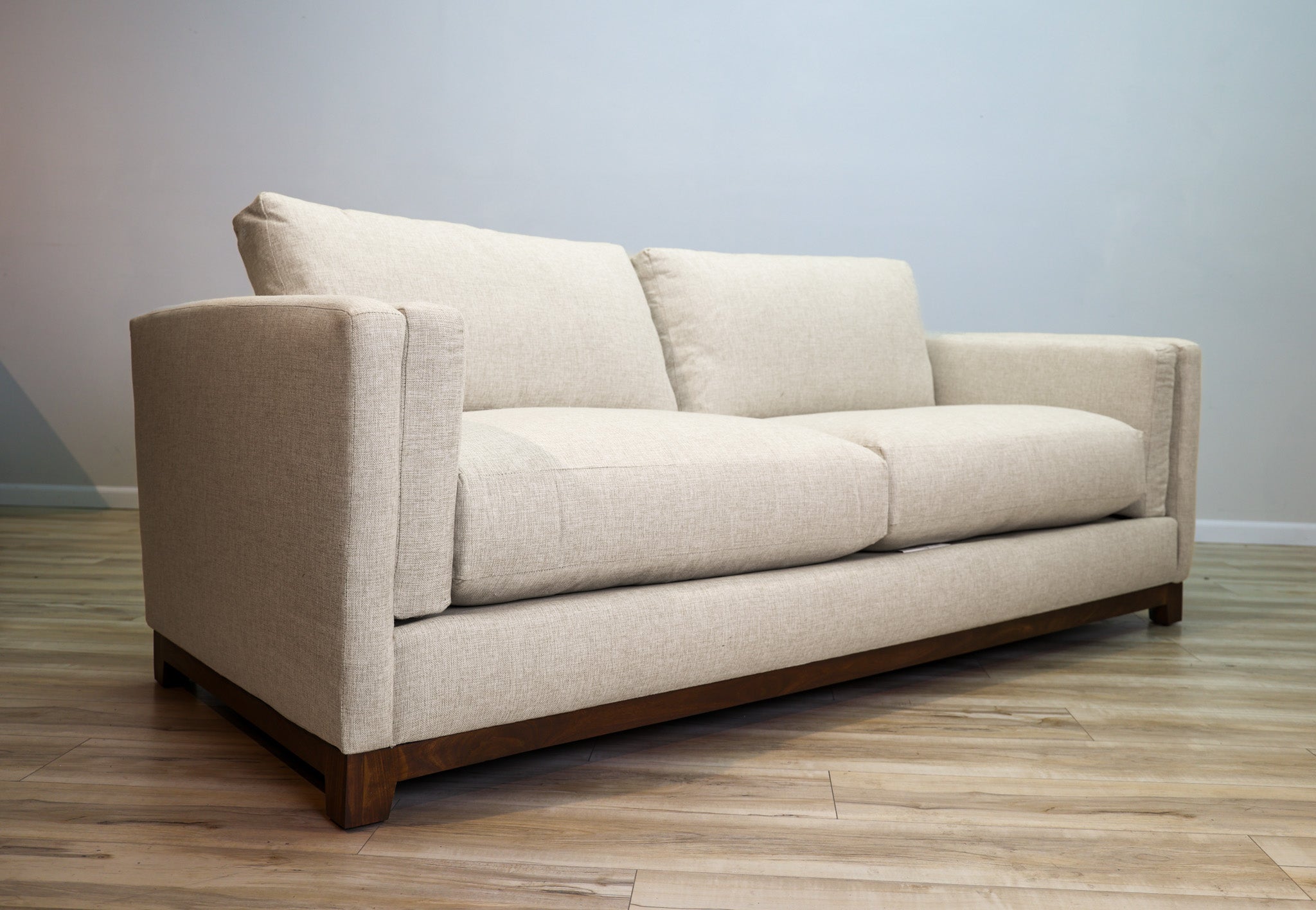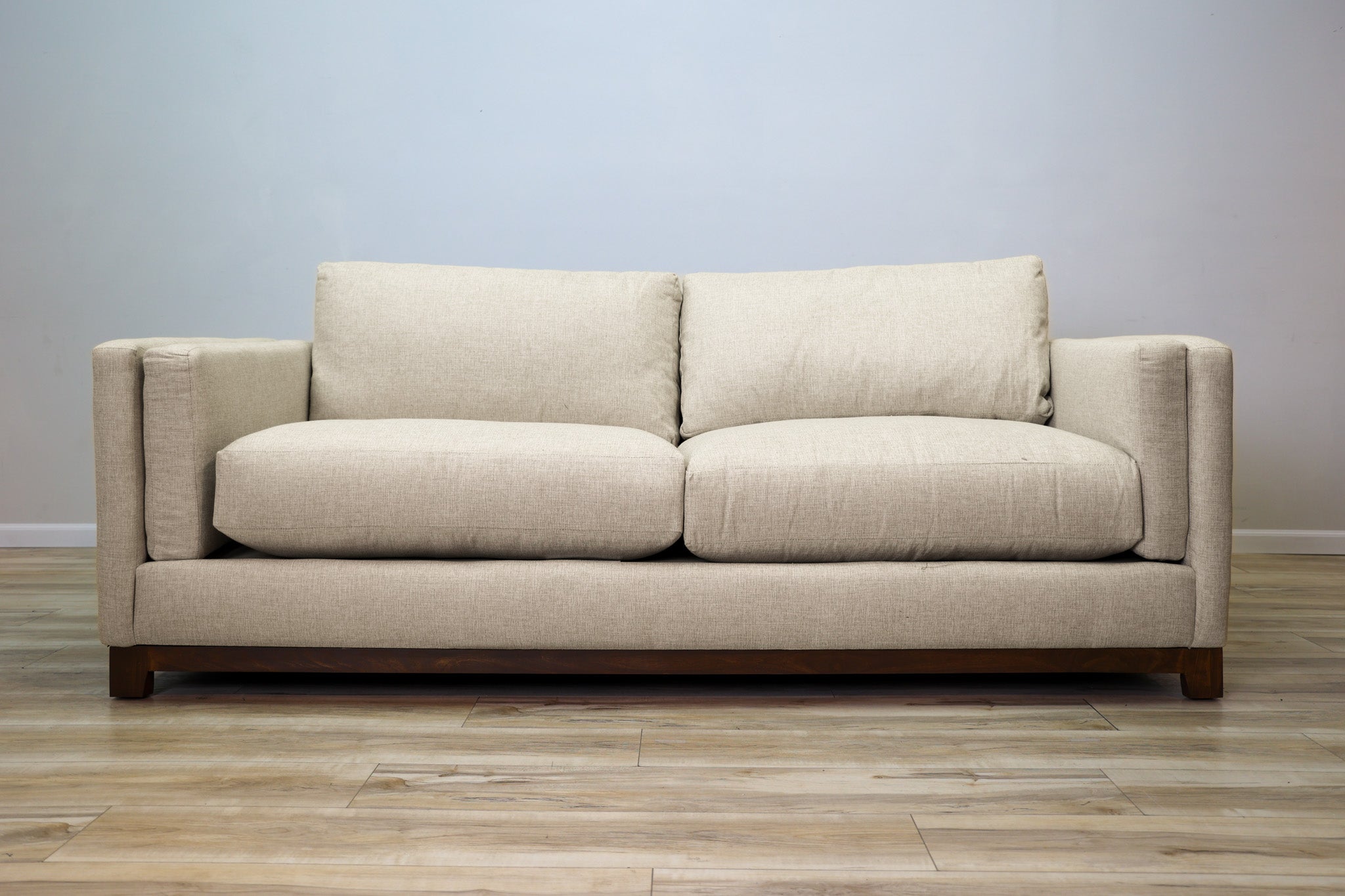 A simple, clean lined, modern sofa with plush cushions you wont want to get up from! Covered in a Revolution fabric that will stand the test against everyday wear and stains. Wrapped in an elegant linen colored fabric that will bring a touch of warmth to your living space, make the Marco sofa apart of your space today!