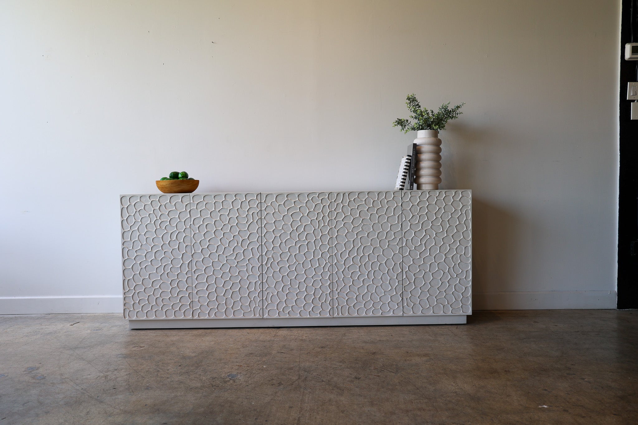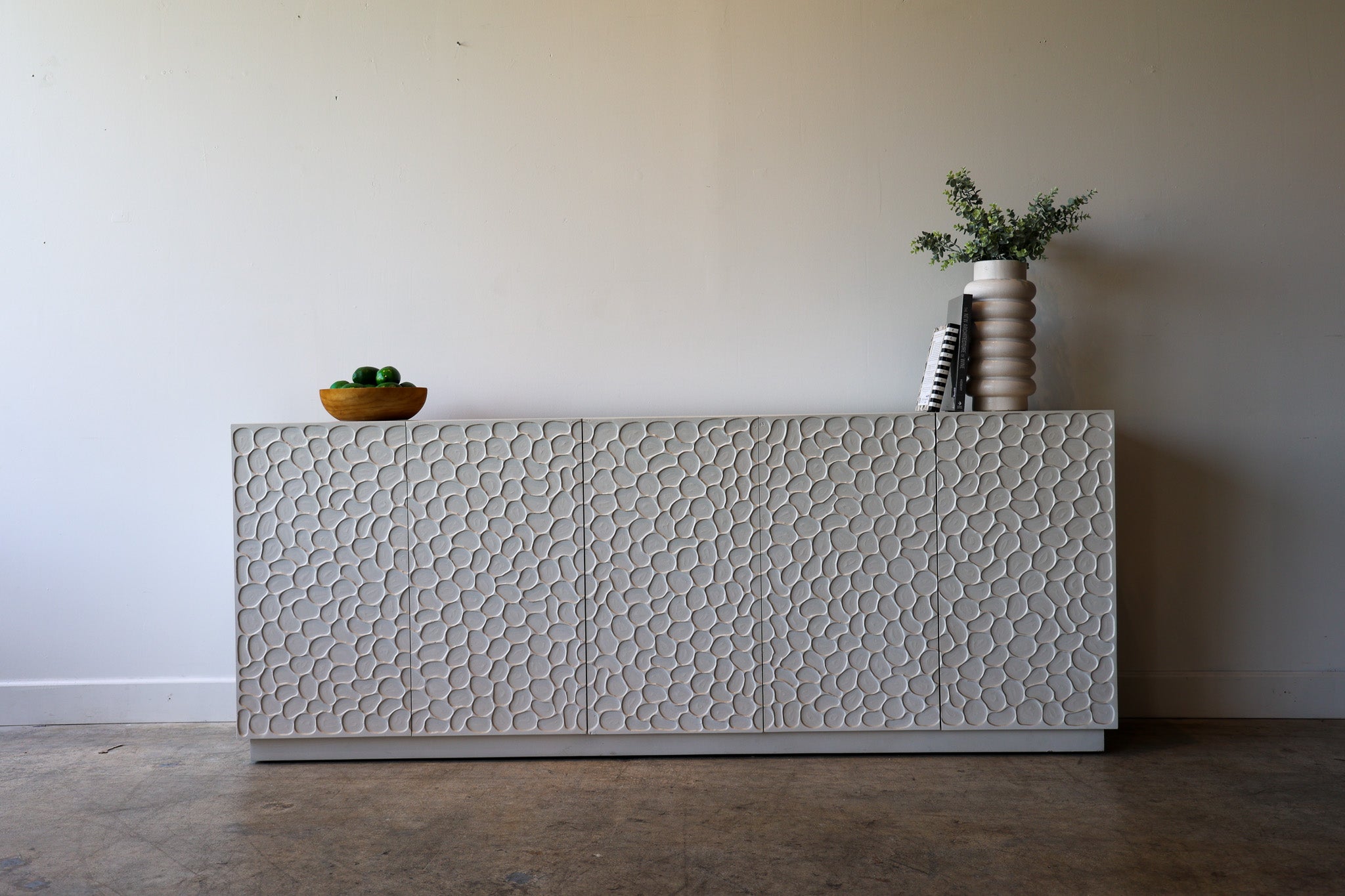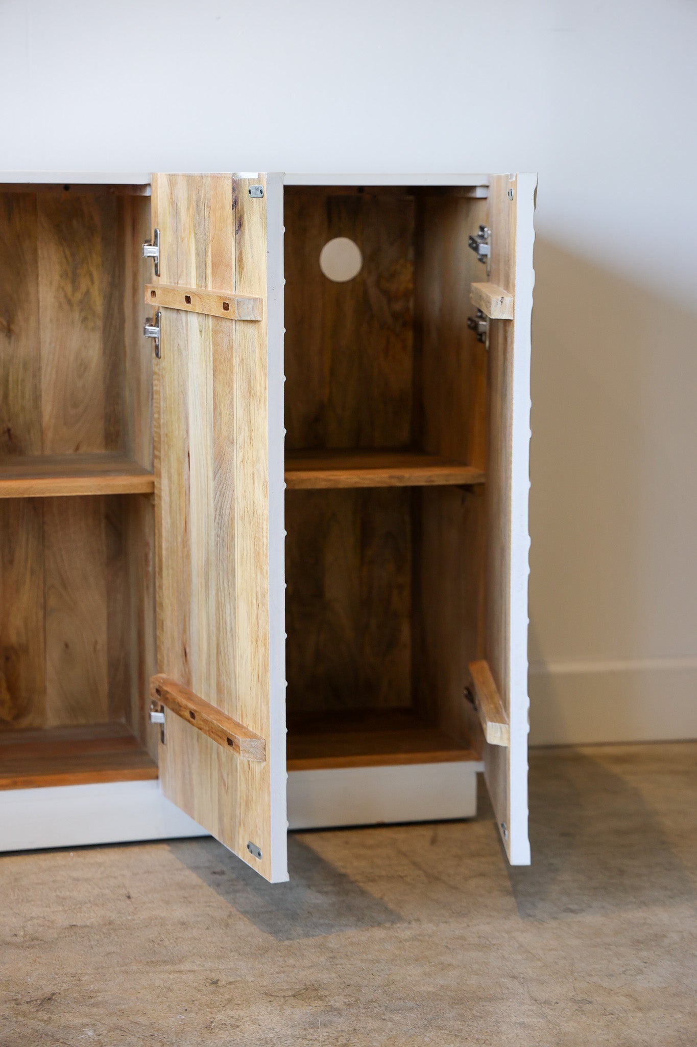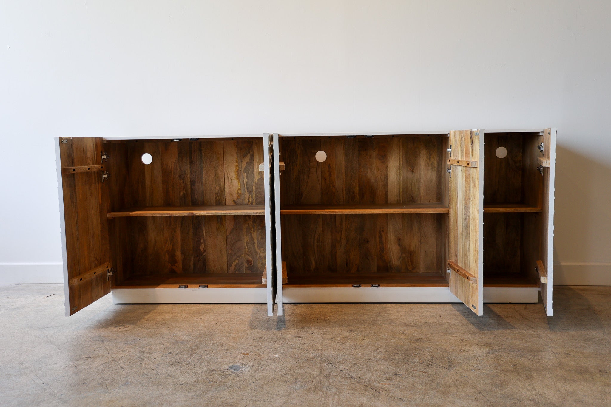 Crafted from the finest solid wood, the Mayfield Credenza boasts elegant hand-carved details and a sleek white finish. Perfect for storing and displaying your belongings, this credenza adds a touch of sophistication to any space.