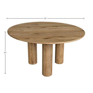 Crafted with solid oak wood with an oak veneer, this three pedestal dining table is all about "Flow". Its rounded table top and round legs invite you to sit and stay and while, and keep the conversations flowing around dinner. Sturdy, stylish, simple with an organic touch - this table has everything you could want and more for your dining space!