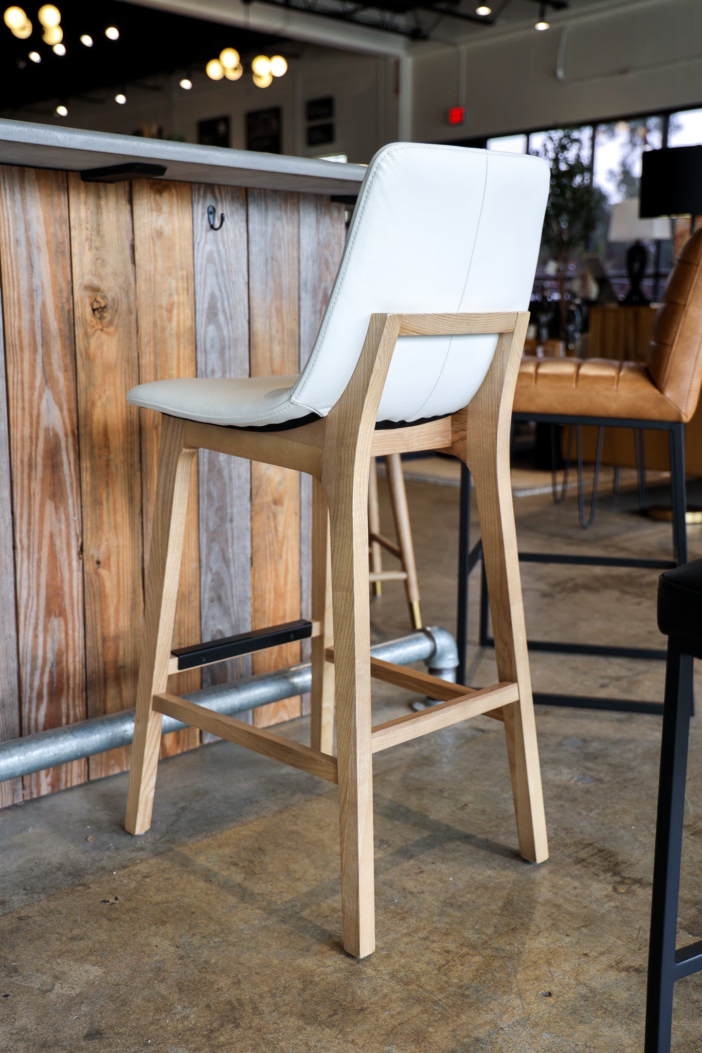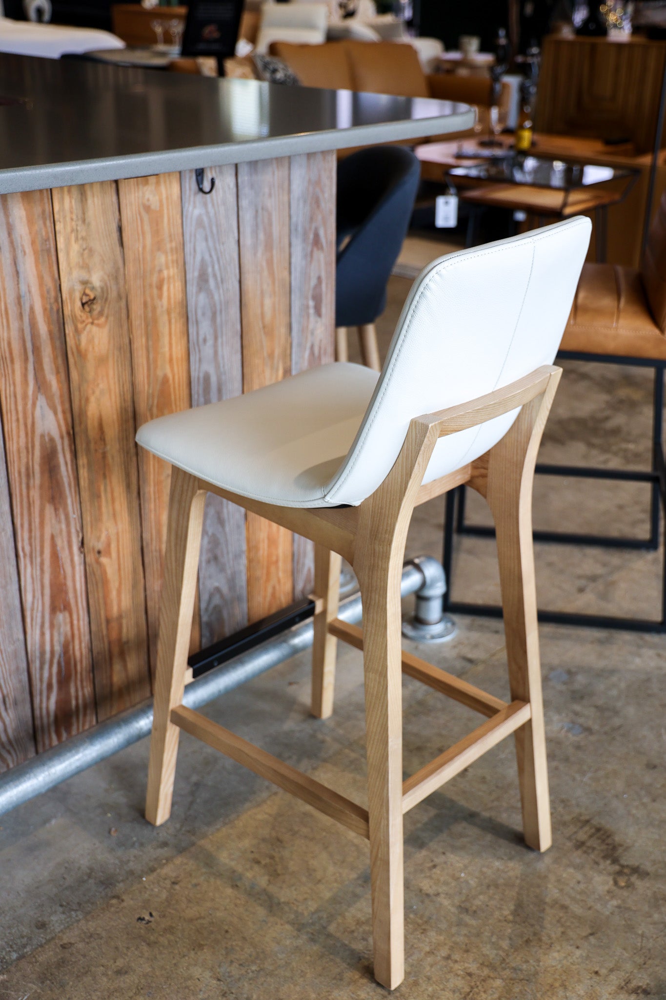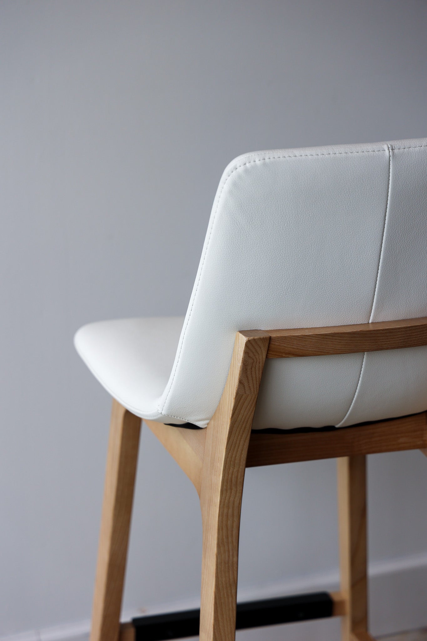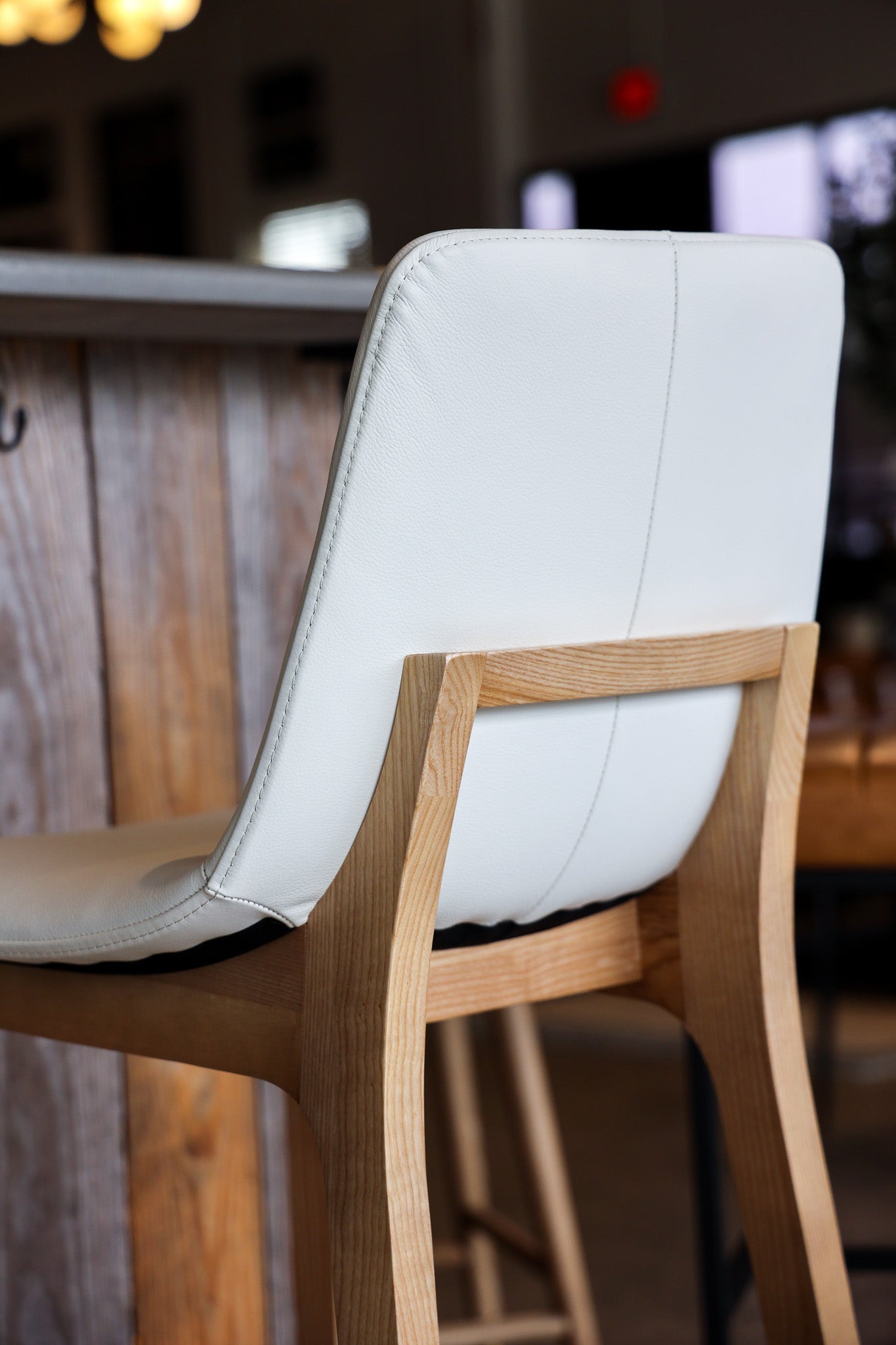 Elevate your kitchen or bar with our Noble Bar Stool. Crafted with genuine white leather and sturdy mango wood legs, it exudes luxury and durability. Indulge in ultimate comfort while enjoying your favorite meals or drinks. Upgrade your space with this elegant and timeless addition.