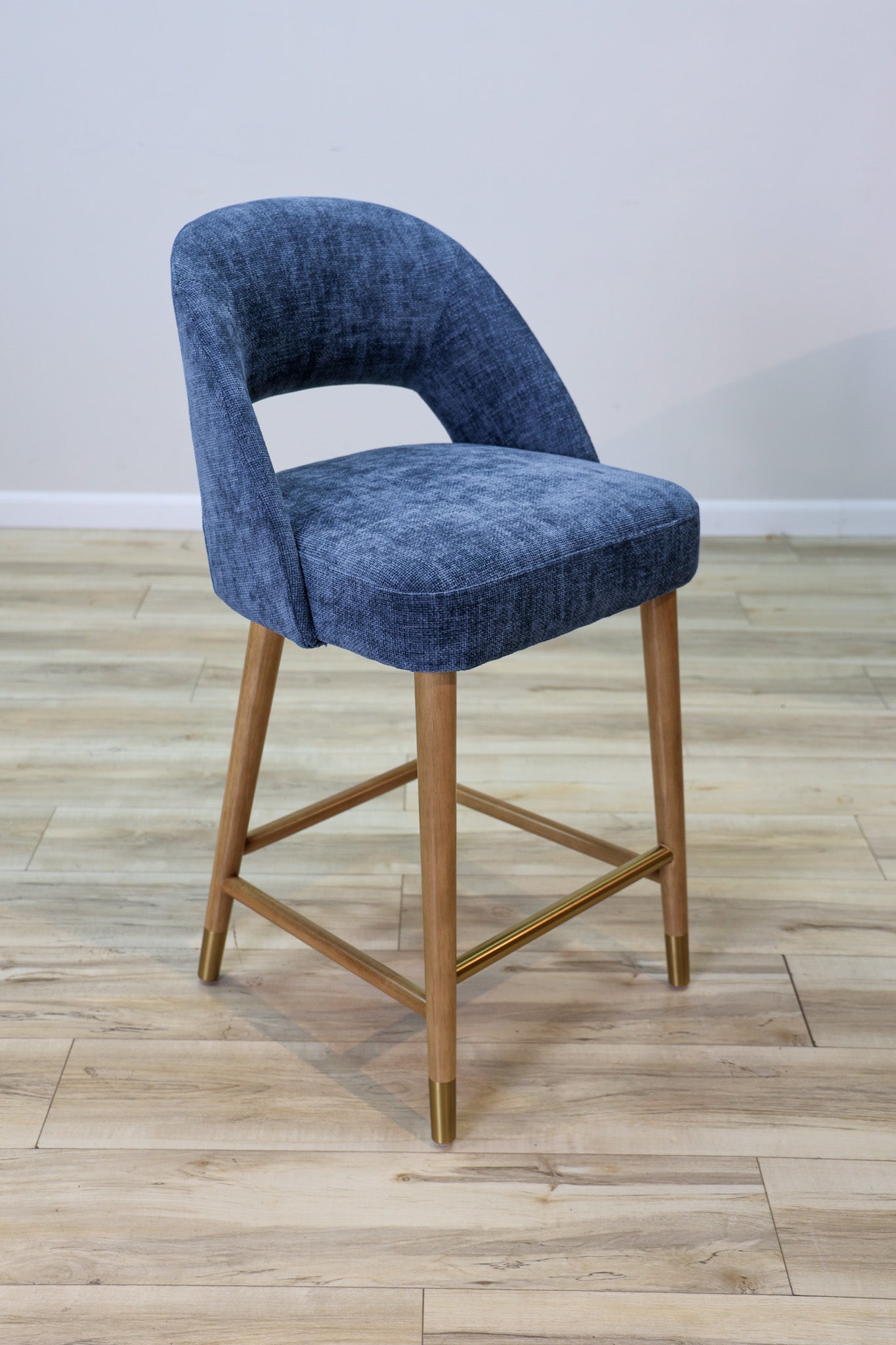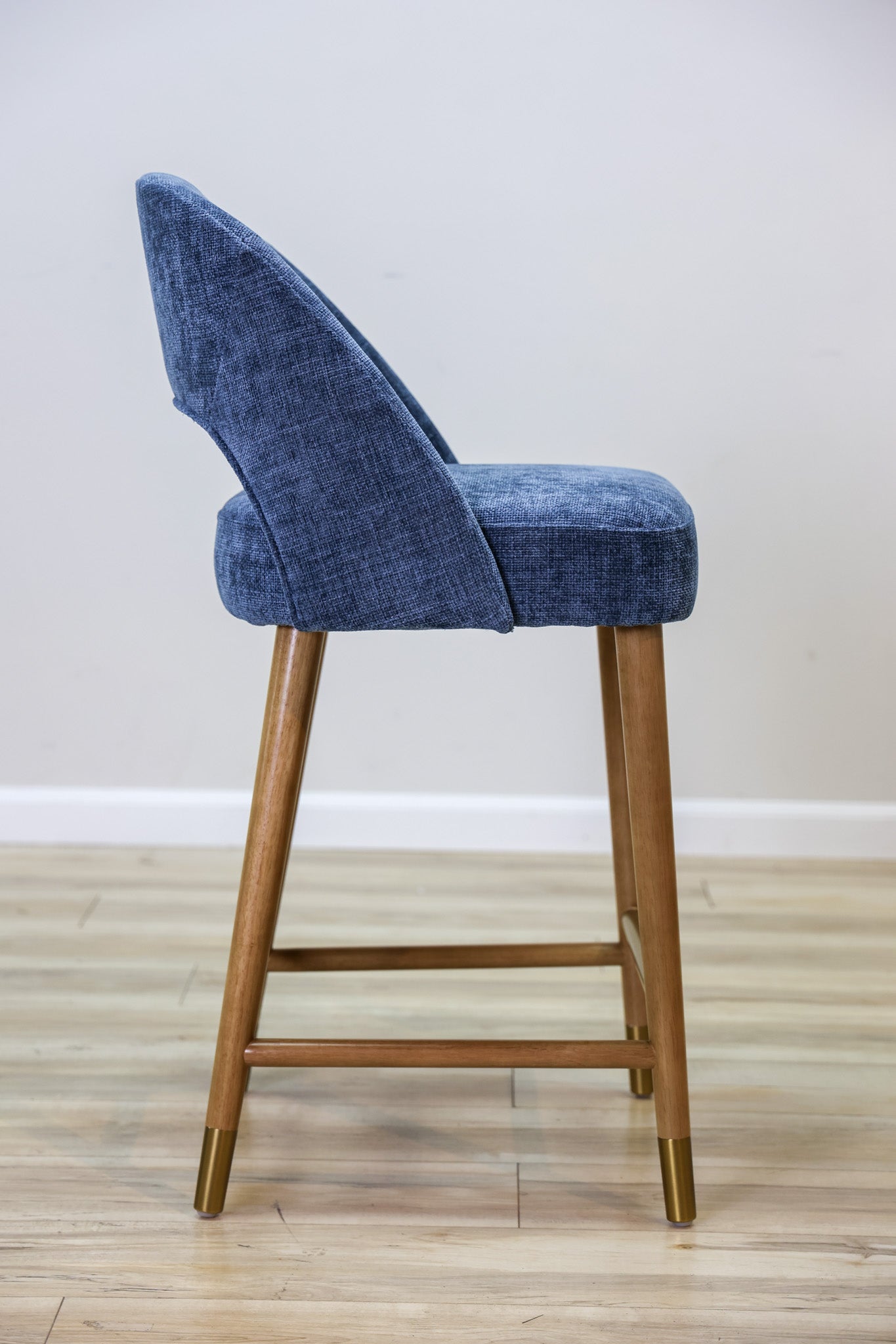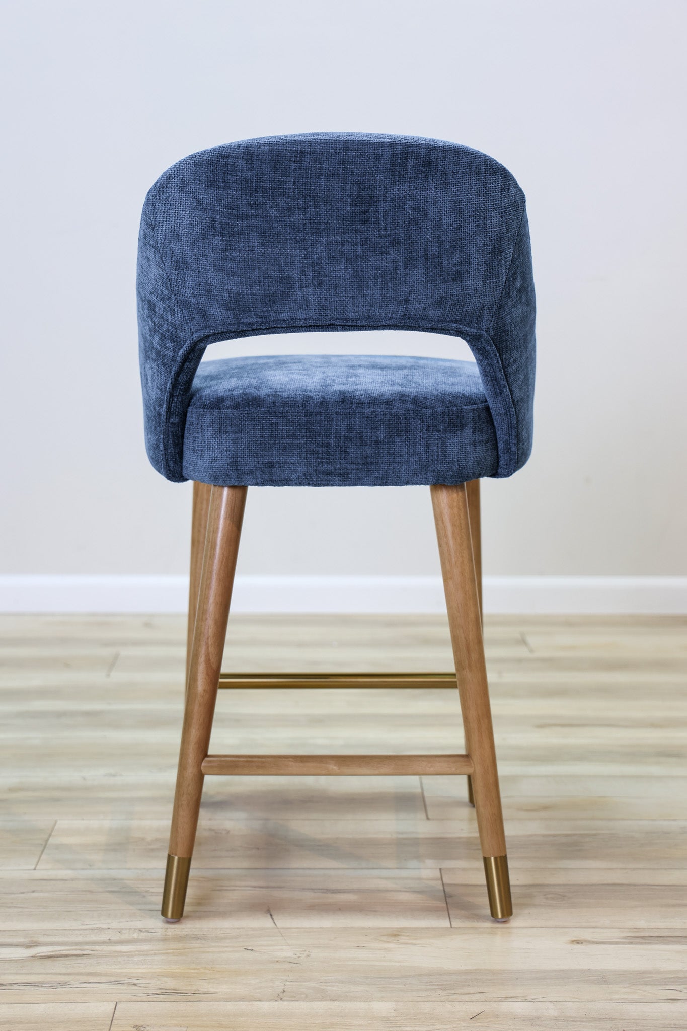 Meet a new pop of color in one of our most popular barstools models ever - the Perry Barstool features a woven blue performance fabric that'll help you rest easy about staying clean in the dining room. Solid rubberwood legs with a touch of gold detailing for added elegance and style. Elevate your dining space today! Also Available in Bar Height