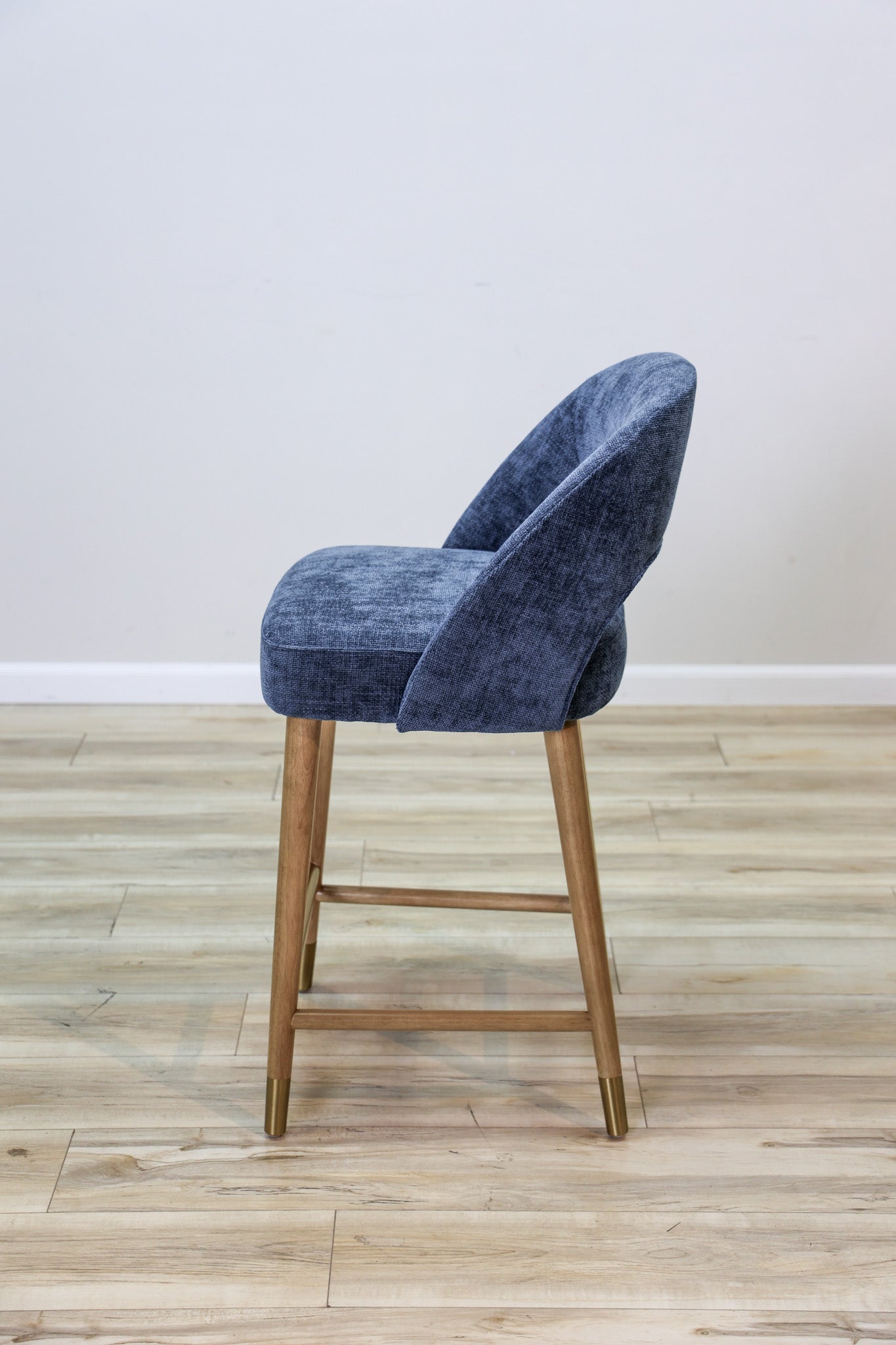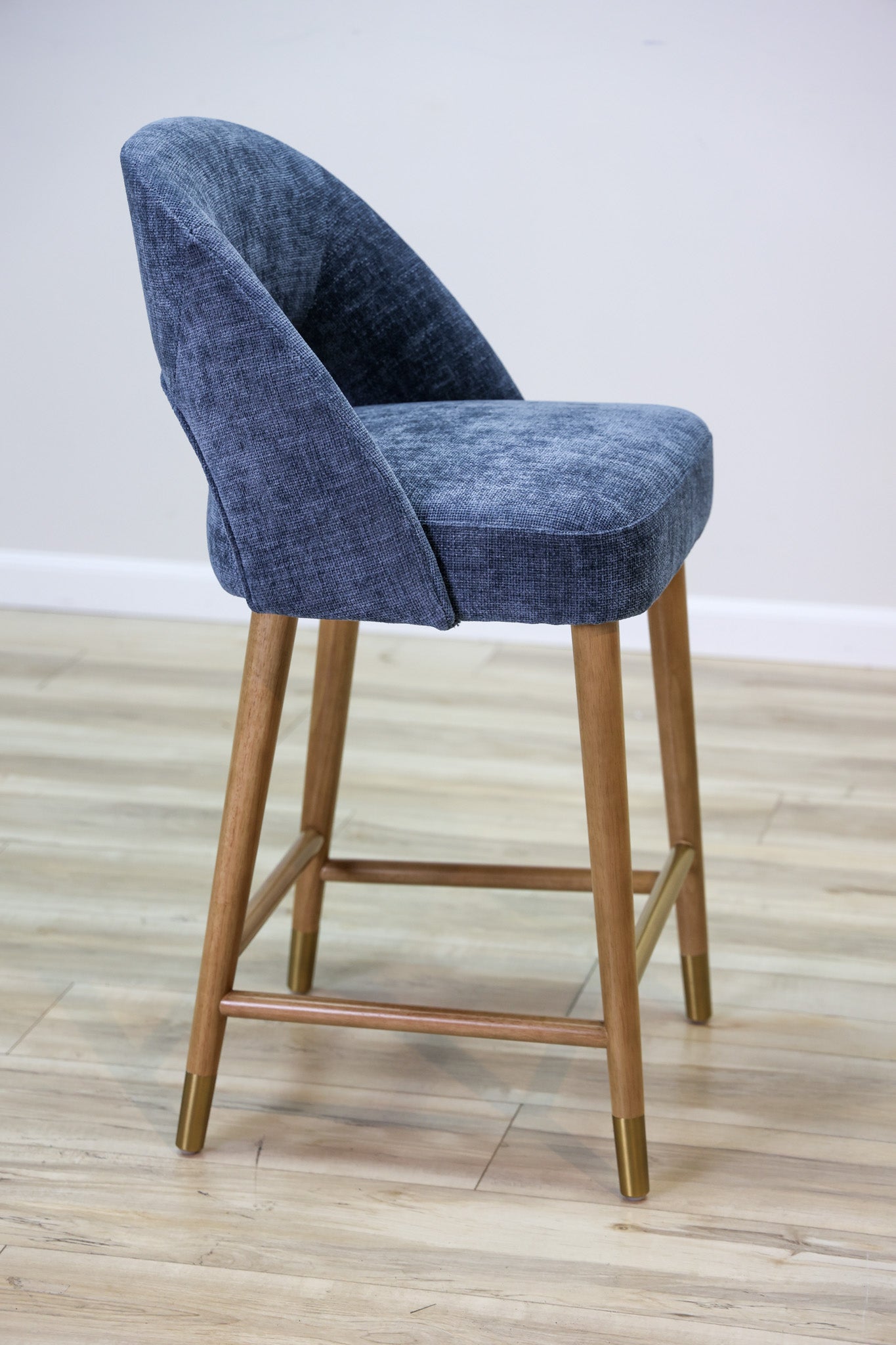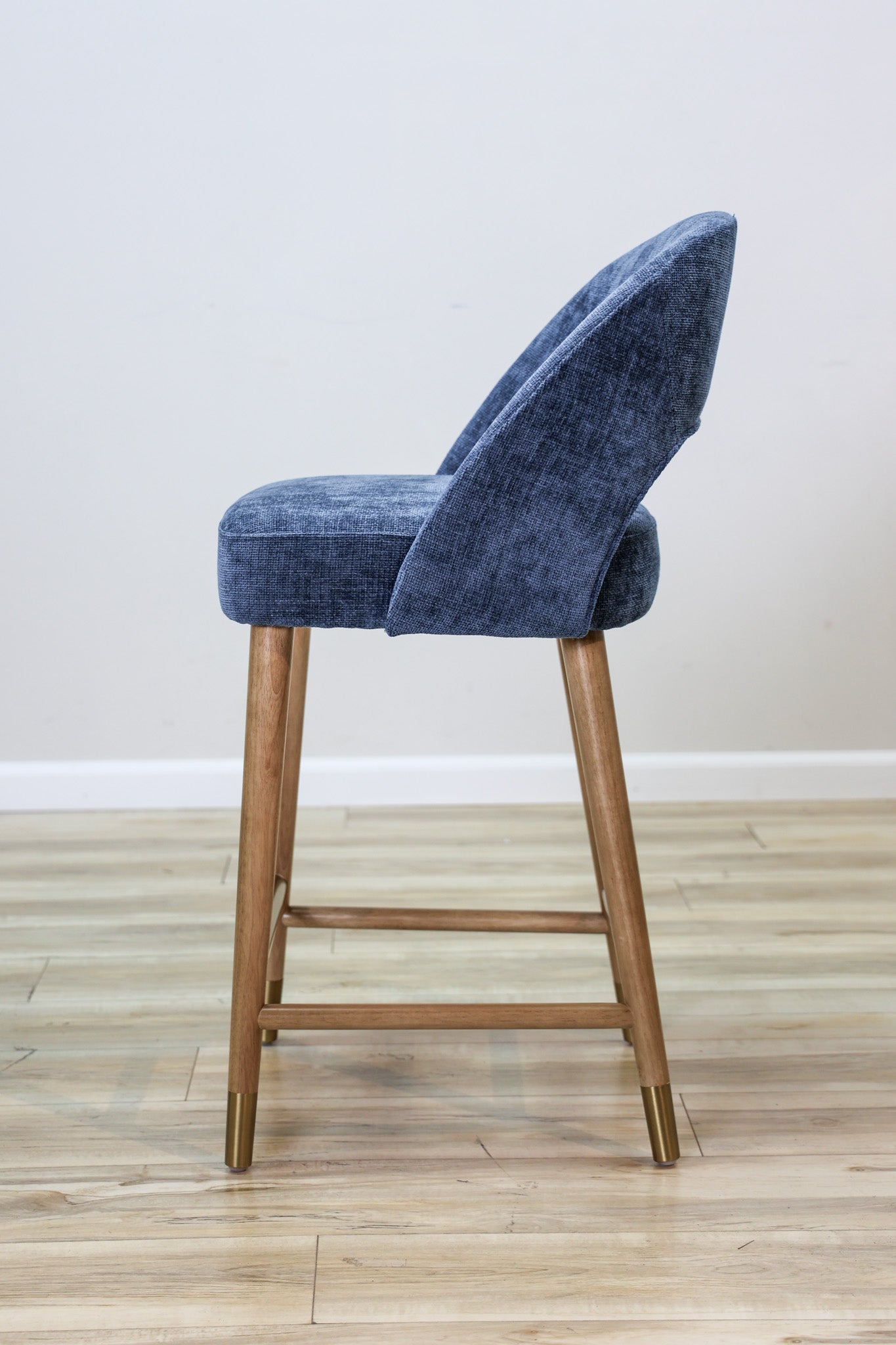 Meet a new pop of color in one of our most popular barstools models ever - the Perry Barstool features a woven blue performance fabric that'll help you rest easy about staying clean in the dining room. Solid rubberwood legs with a touch of gold detailing for added elegance and style. Elevate your dining space today! Also Available in Bar Height