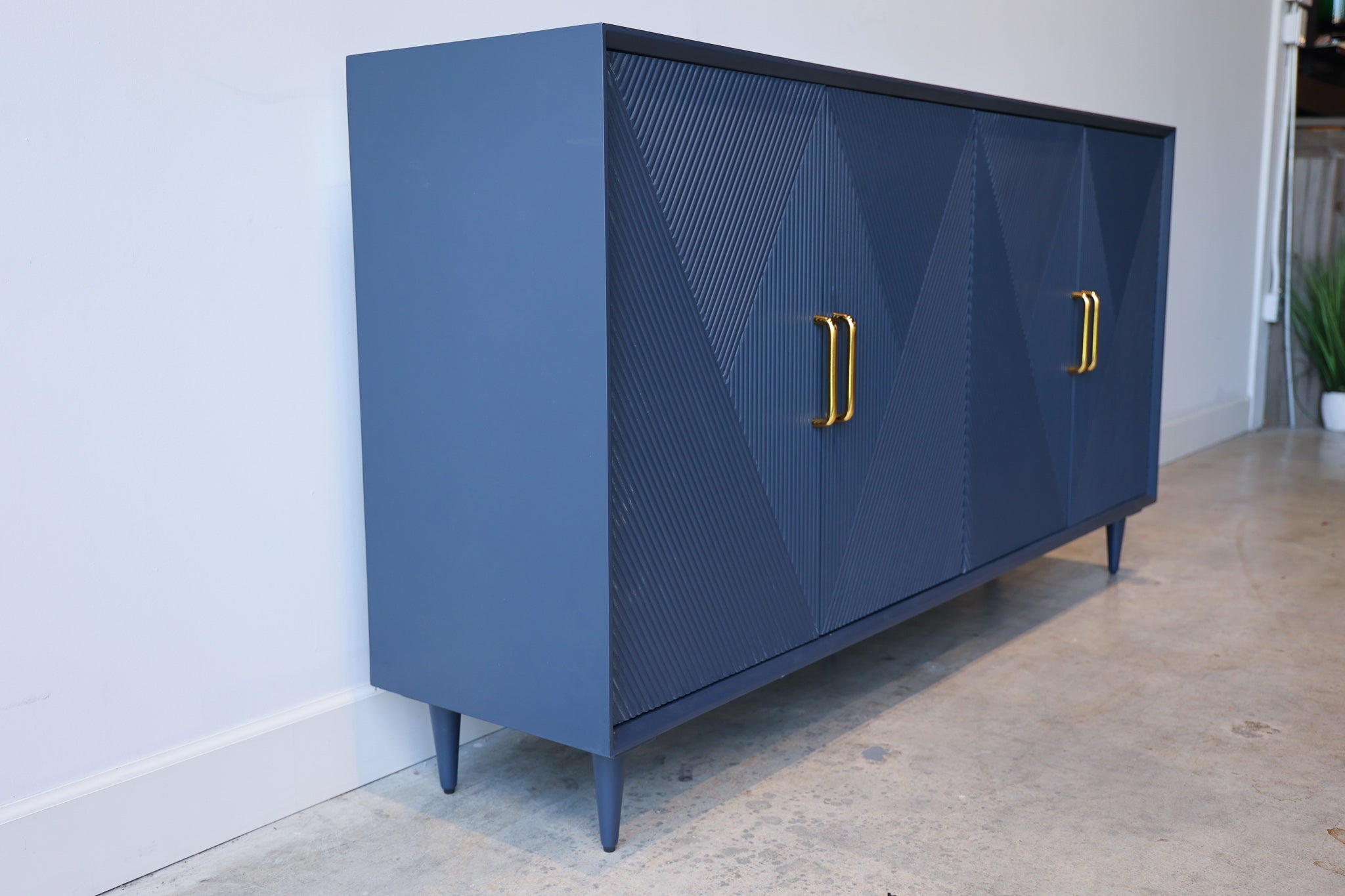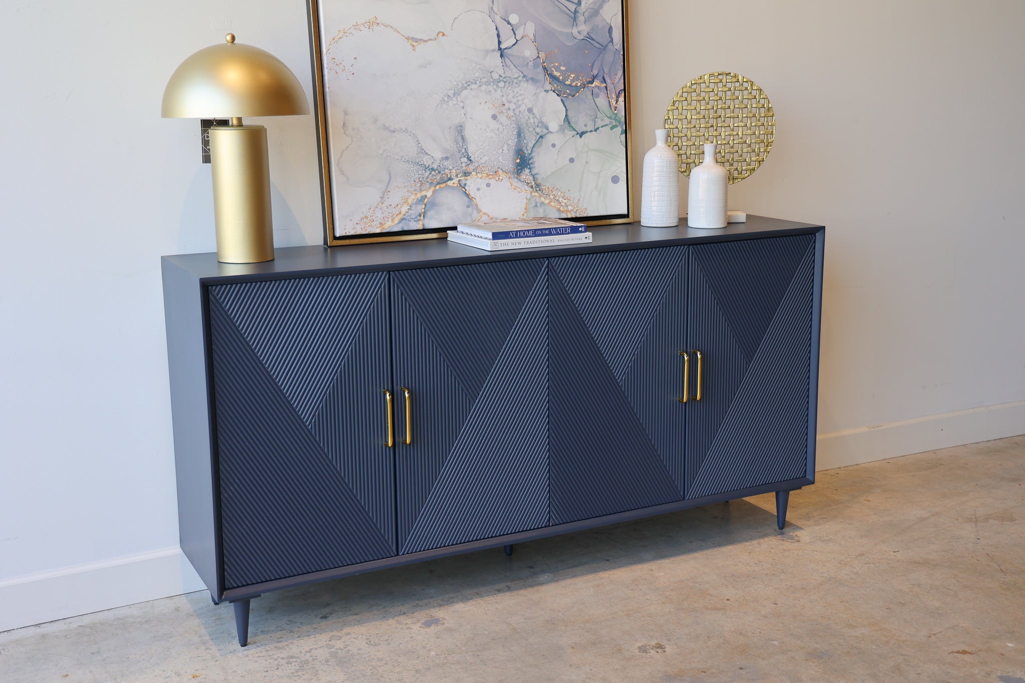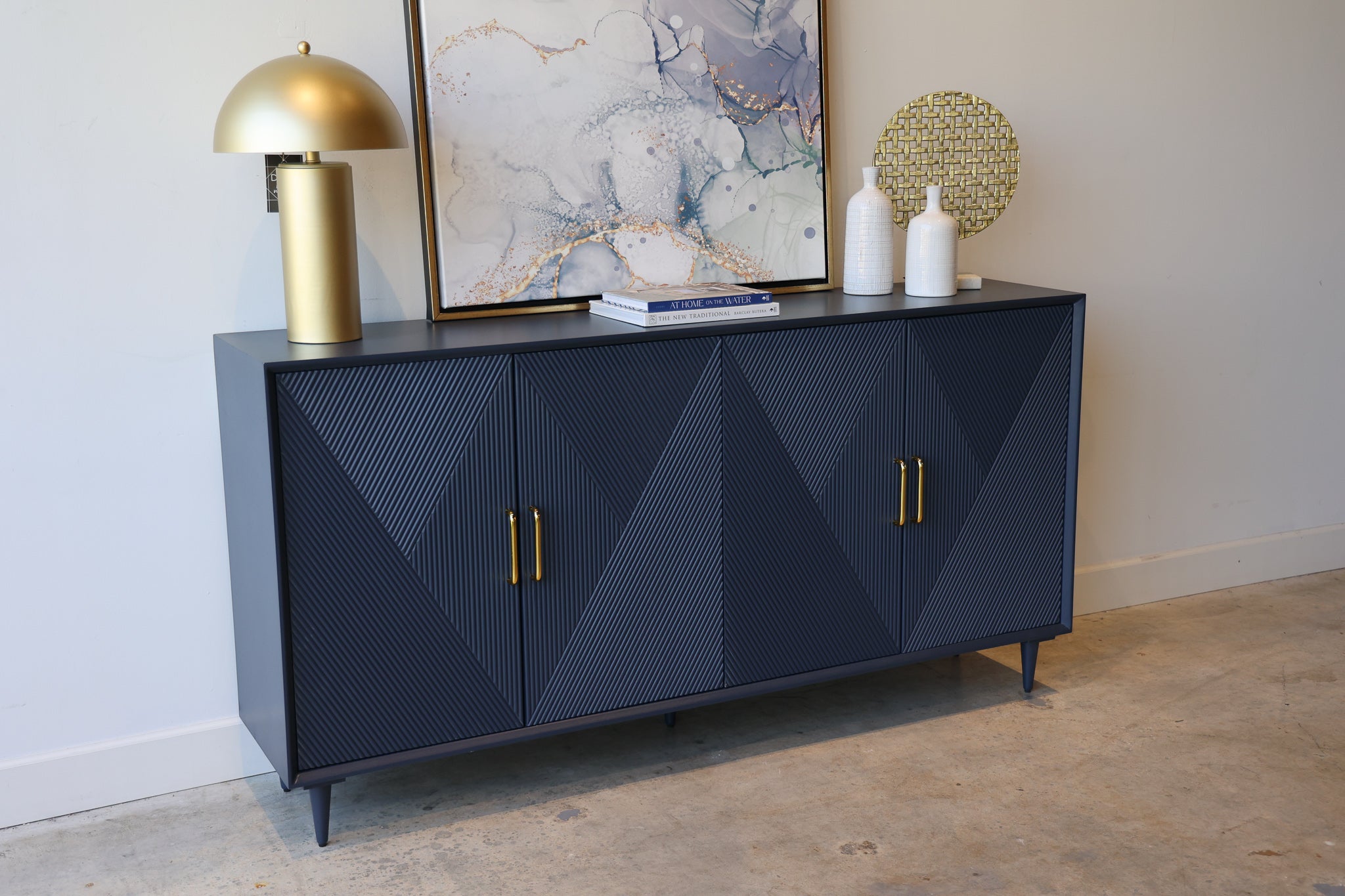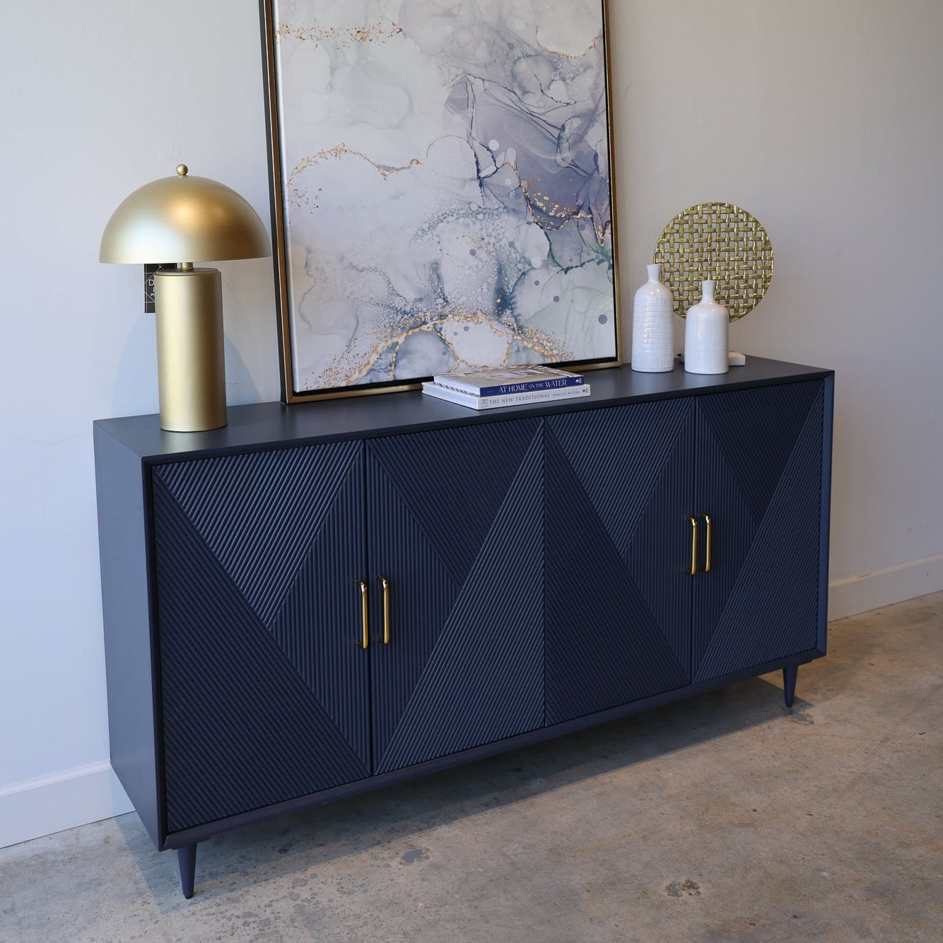 Add sleek mid-century charm to your room with the Phoebe blue wood credenza. This sideboard has a vintage diamond pattern with gold handles that give your living room or dining room a pop of color, along with plenty of storage.
