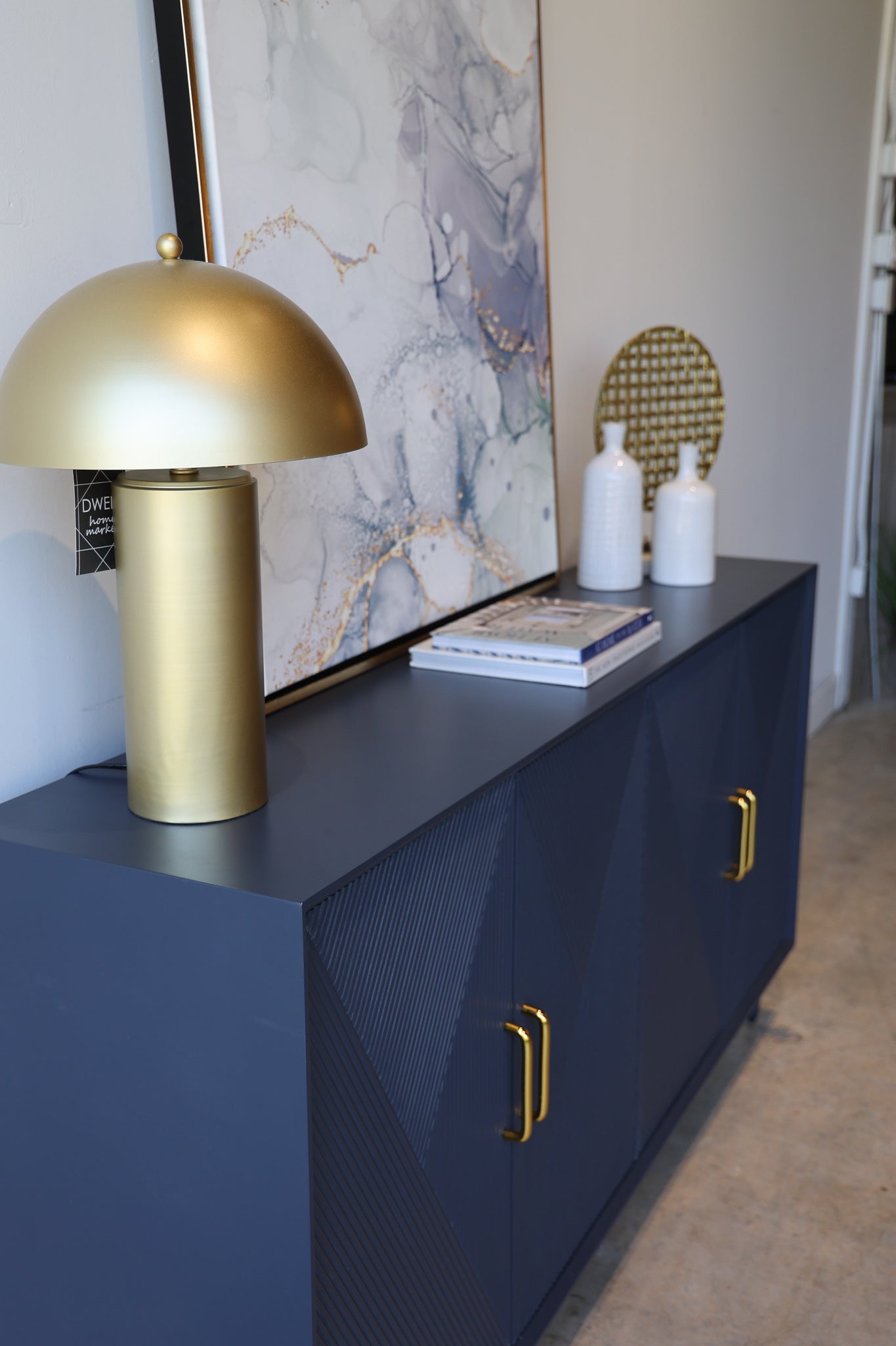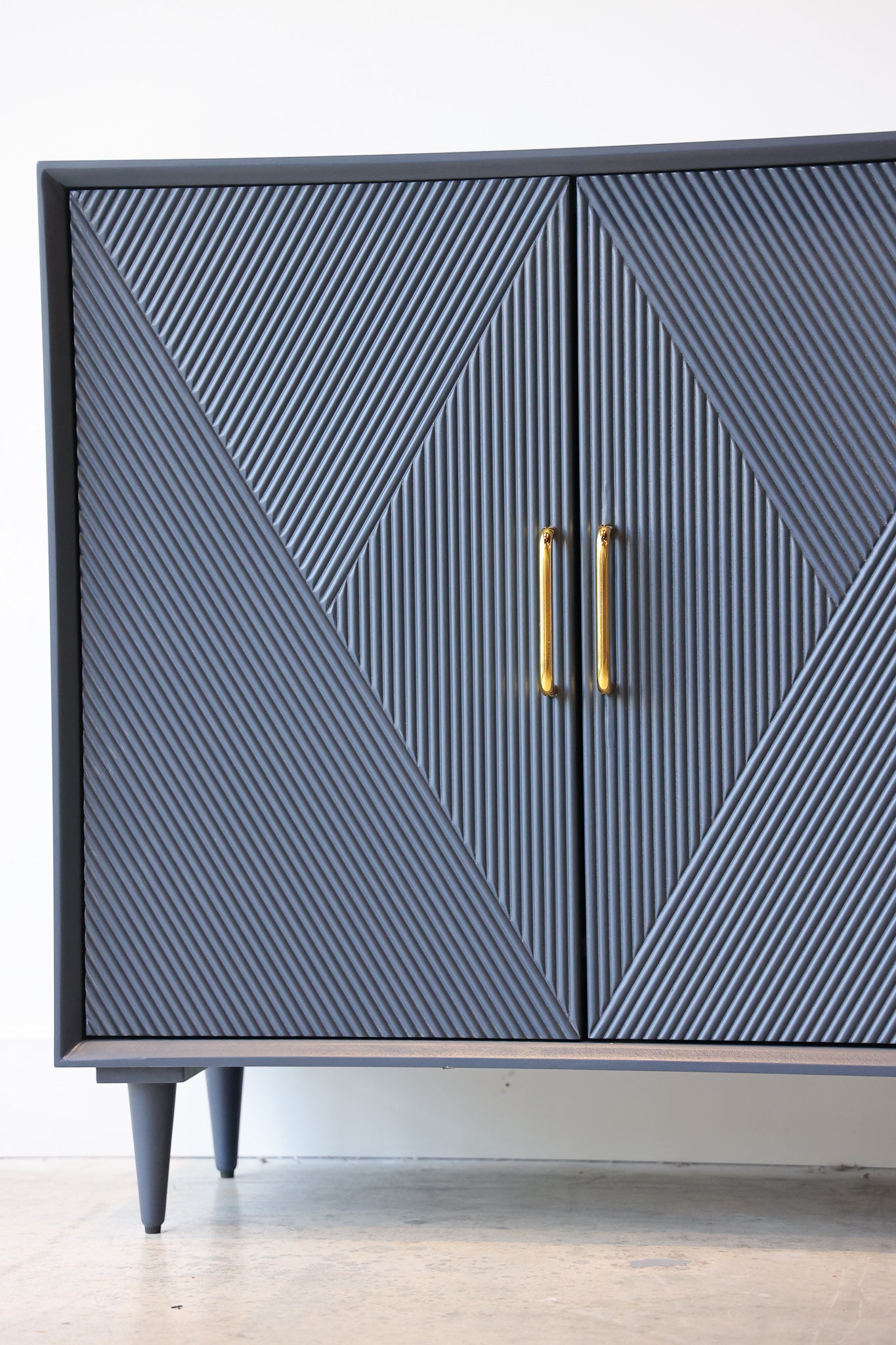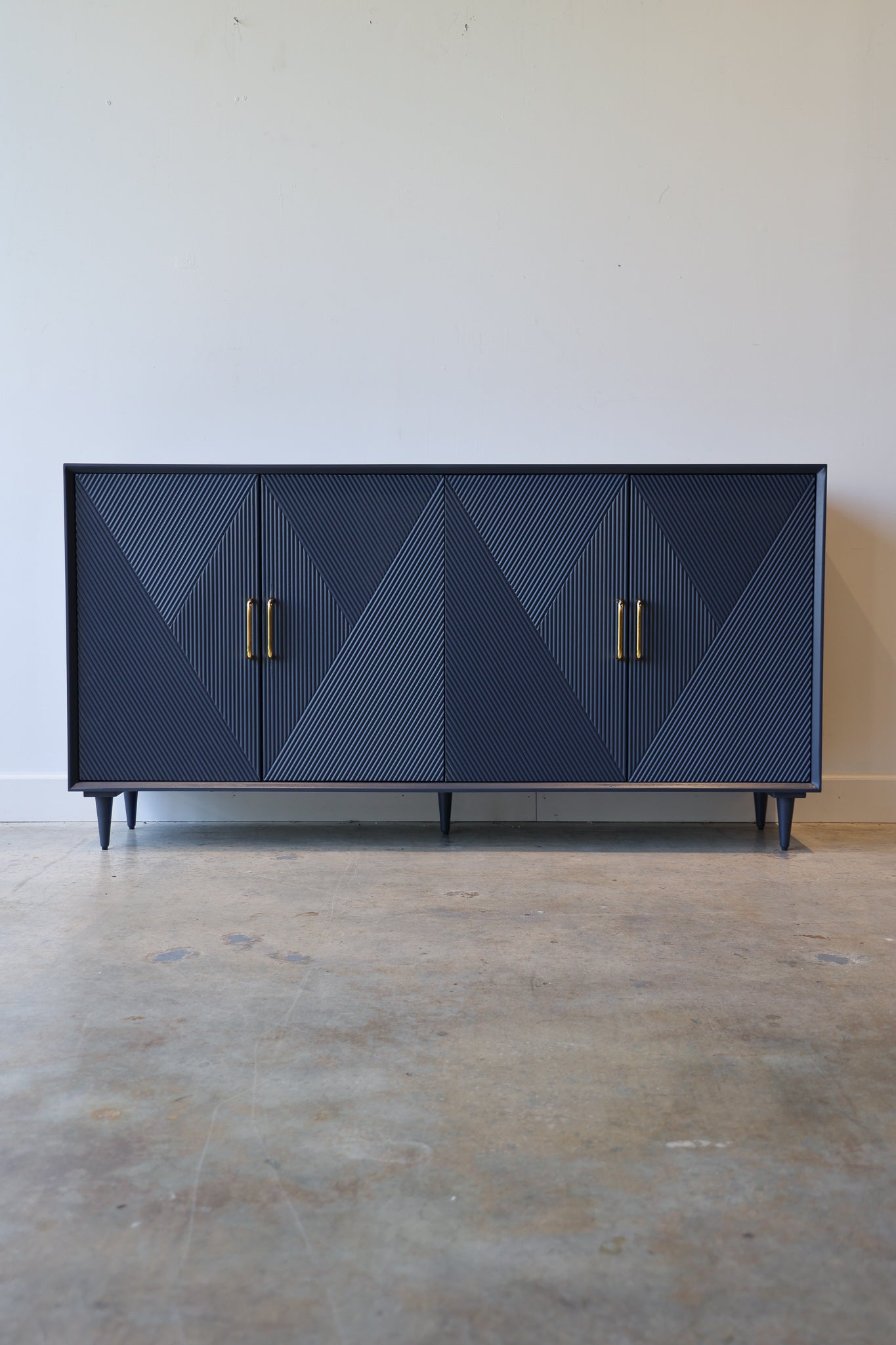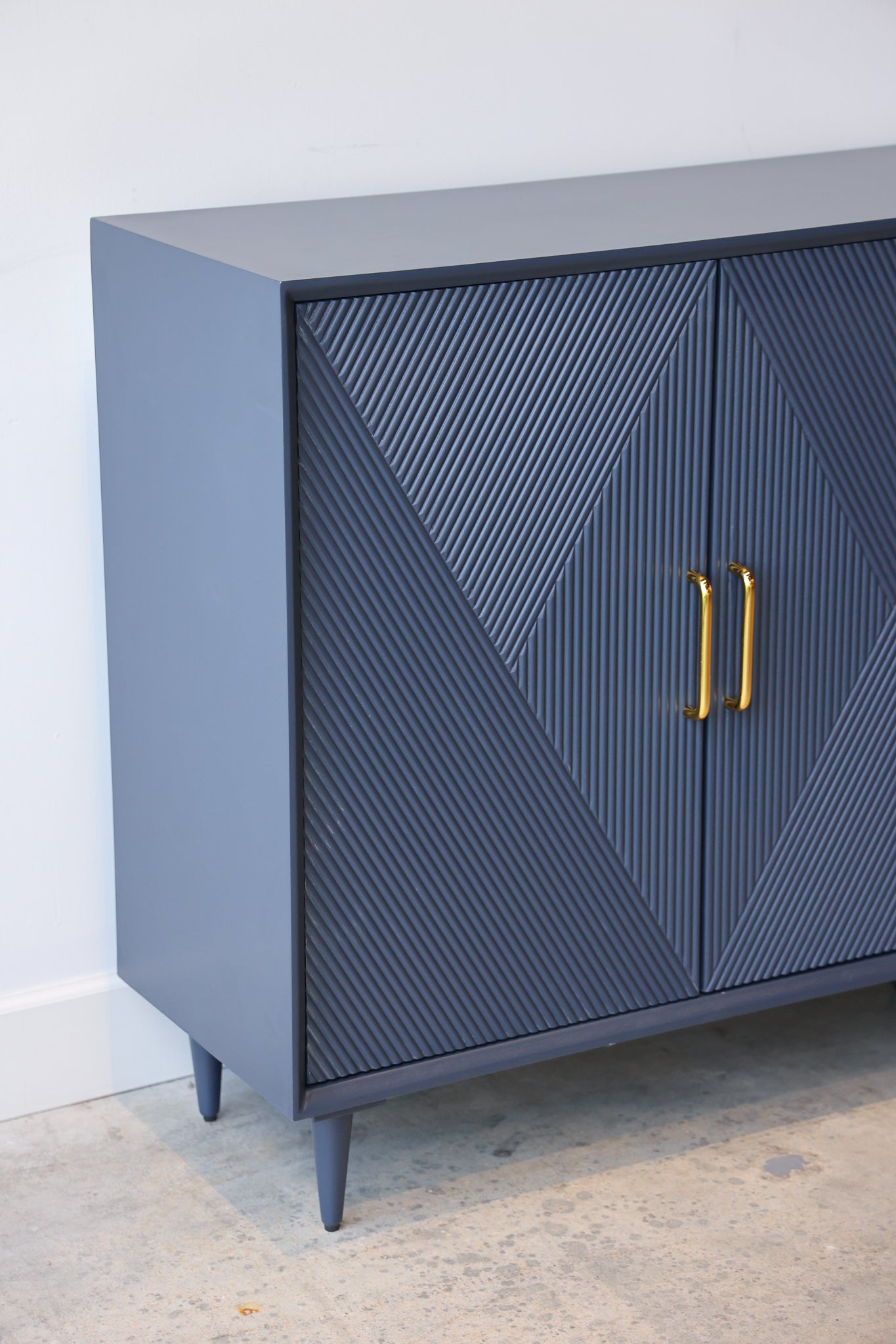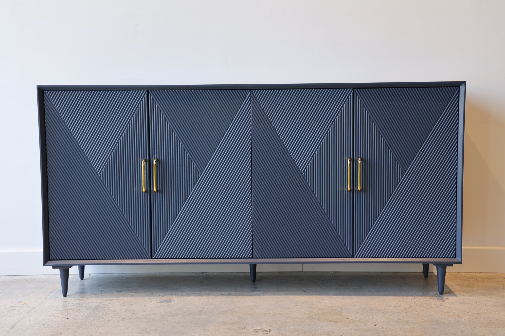 Add sleek mid-century charm to your room with the Phoebe blue wood credenza. This sideboard has a vintage diamond pattern with gold handles that give your living room or dining room a pop of color, along with plenty of storage.