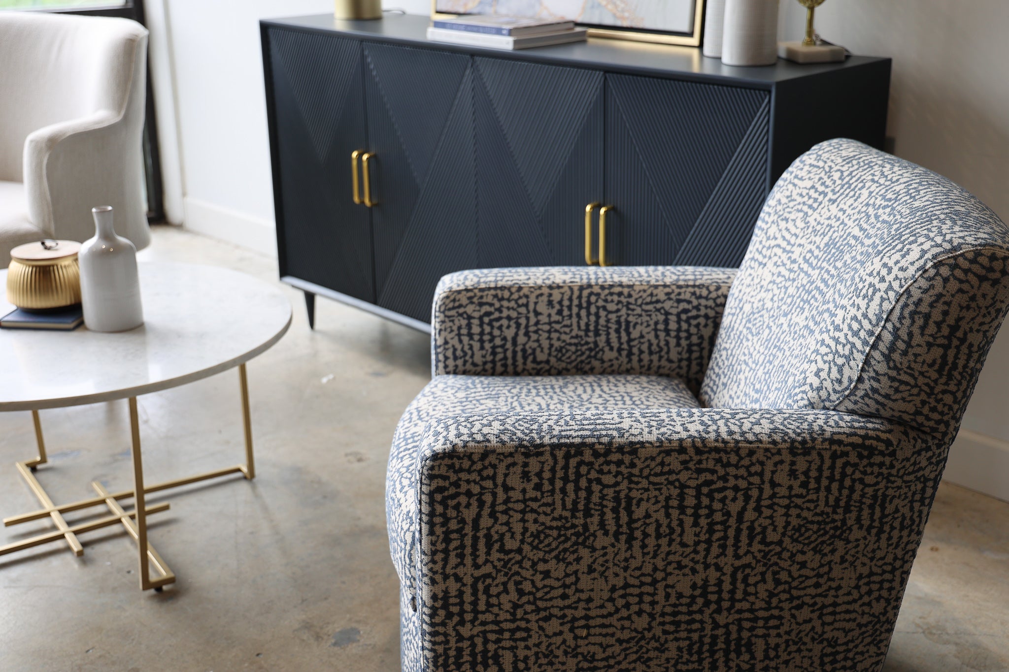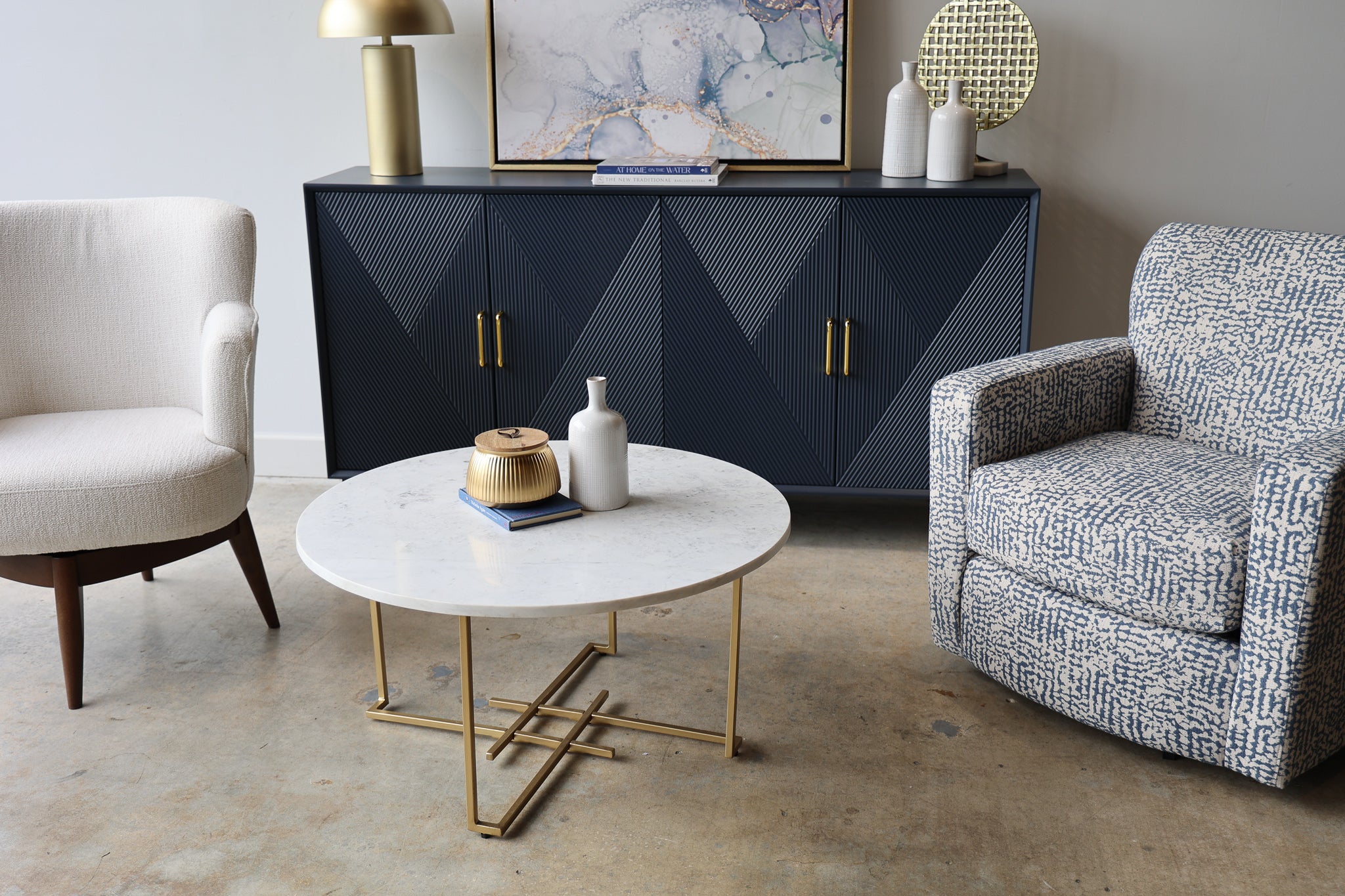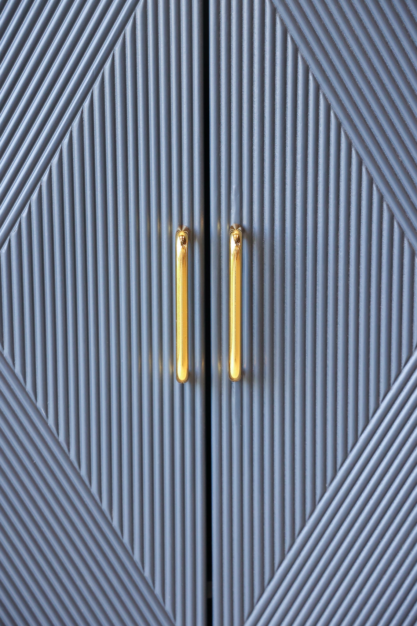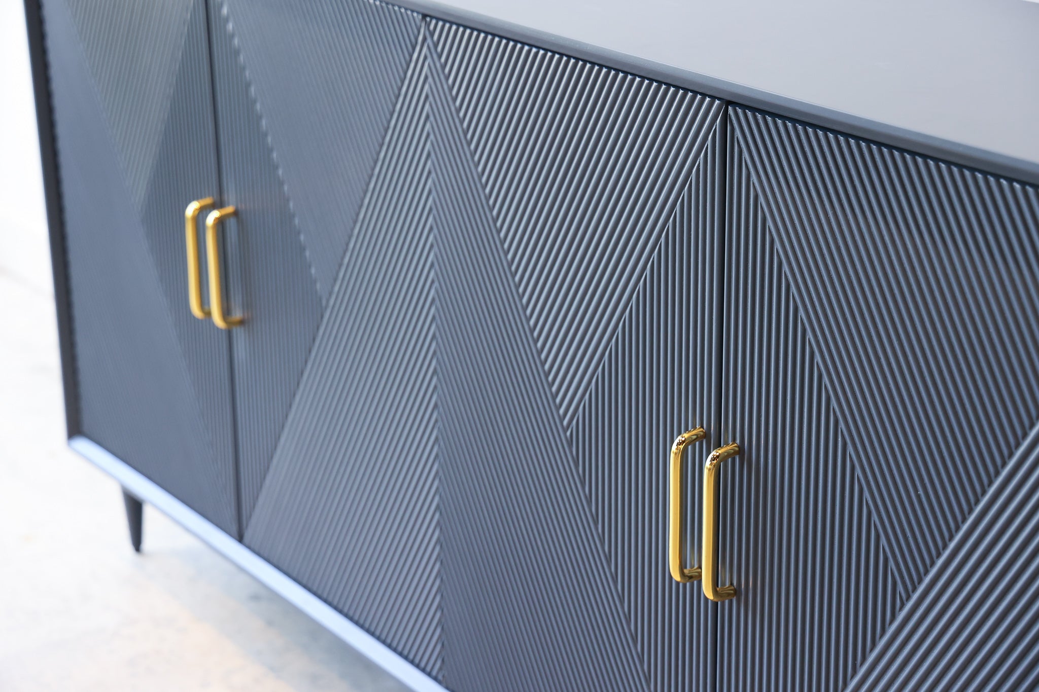 Add sleek mid-century charm to your room with the Phoebe blue wood credenza. This sideboard has a vintage diamond pattern with gold handles that give your living room or dining room a pop of color, along with plenty of storage.