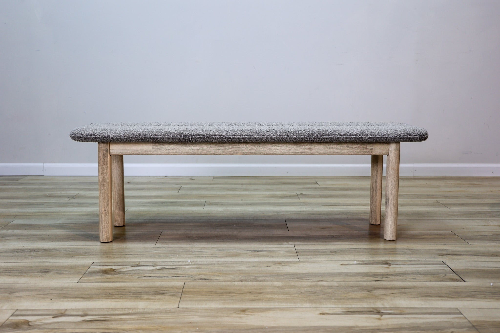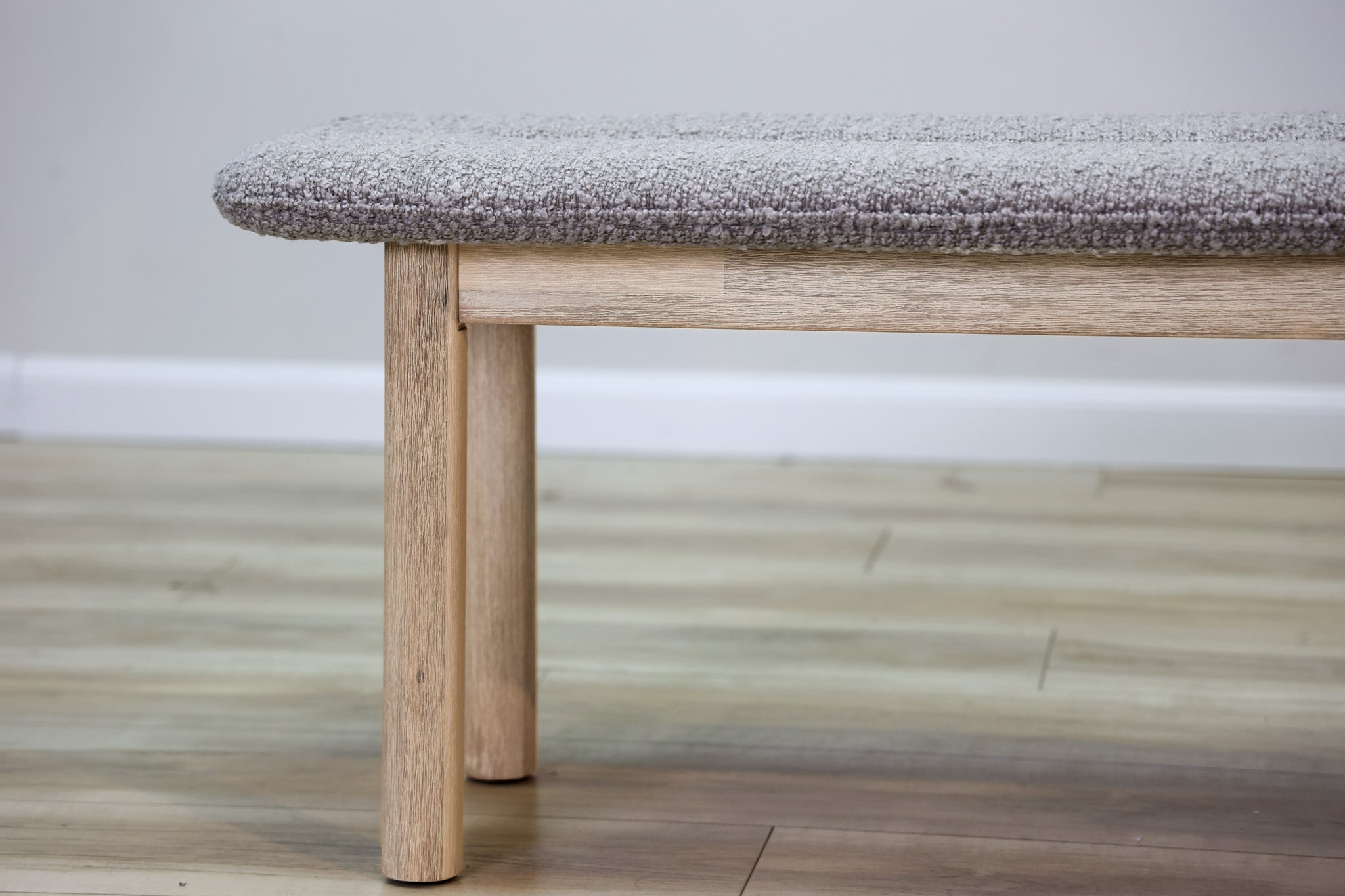 This dining bench is crafted from solid Acacia wood, made to last and withstand everyday use. The upholstery is comprised of 90% polyester and 10% acrylic, creating a soft, yet durable piece to easily match any style.