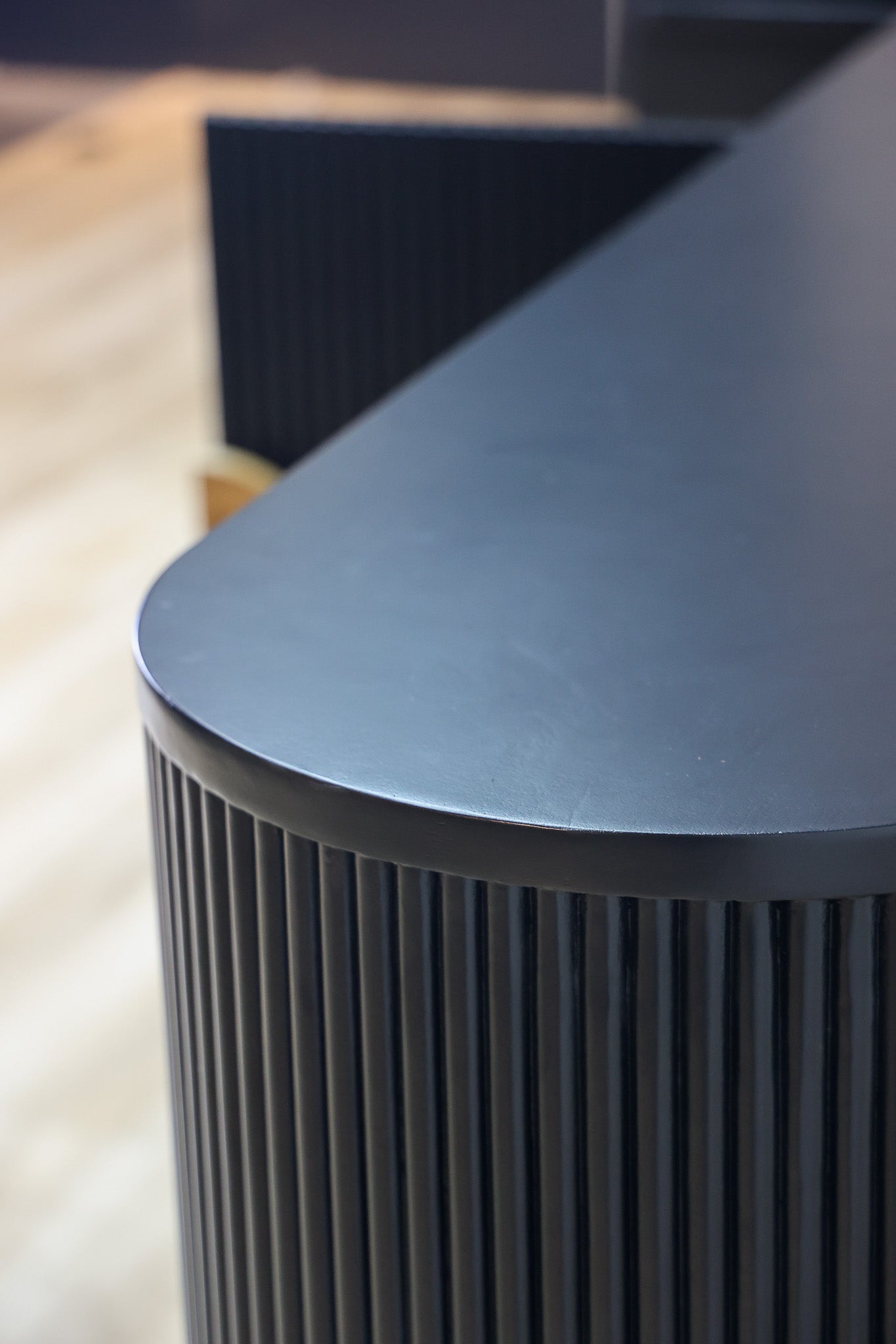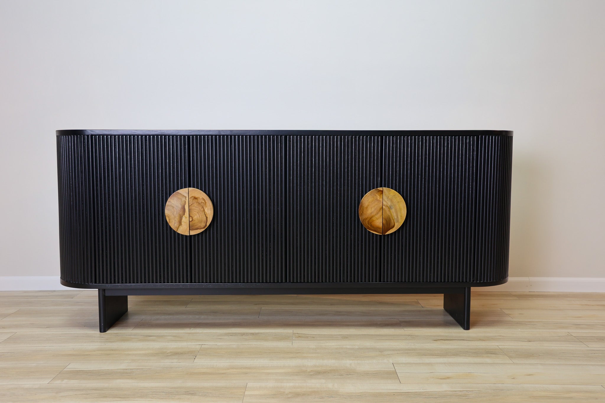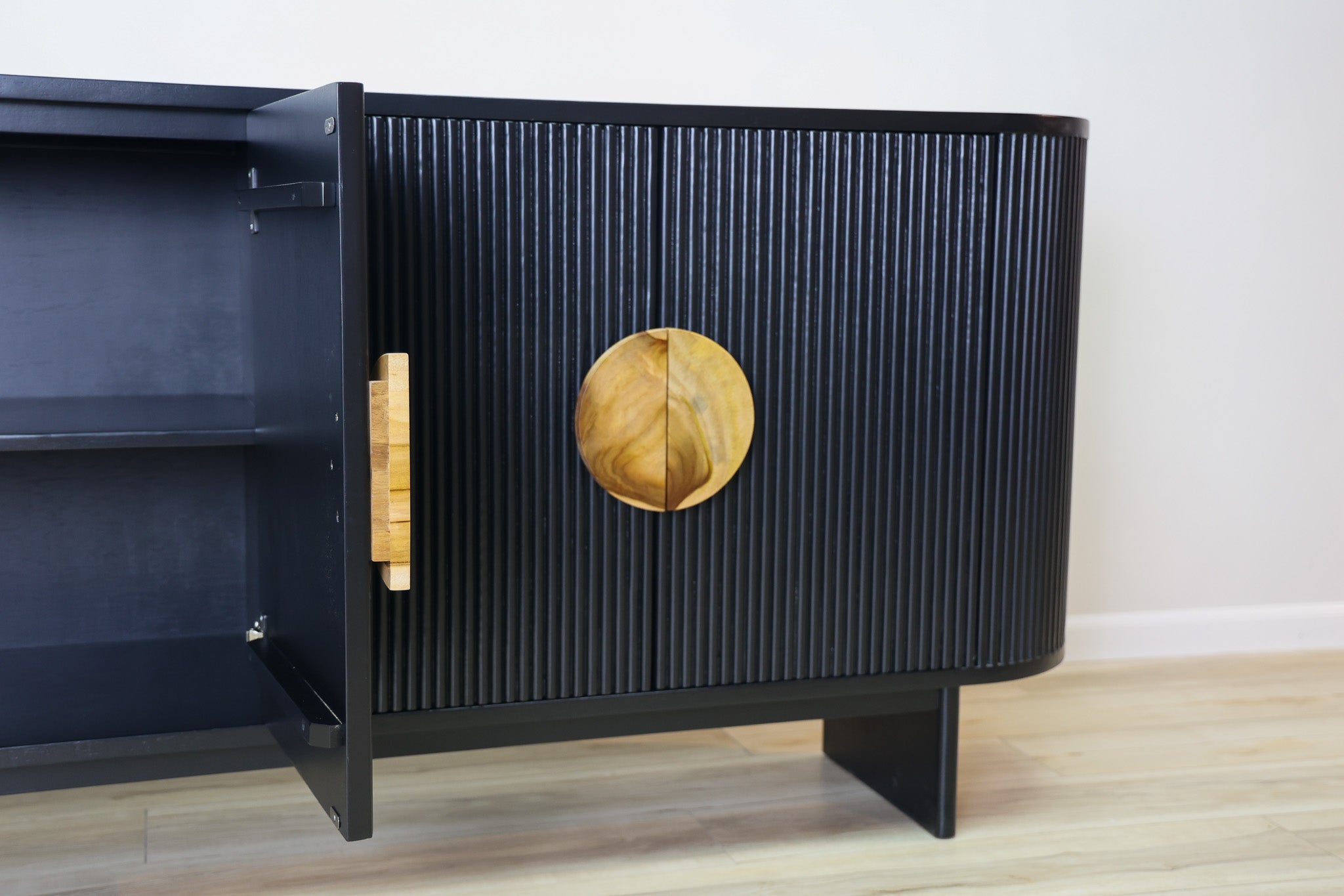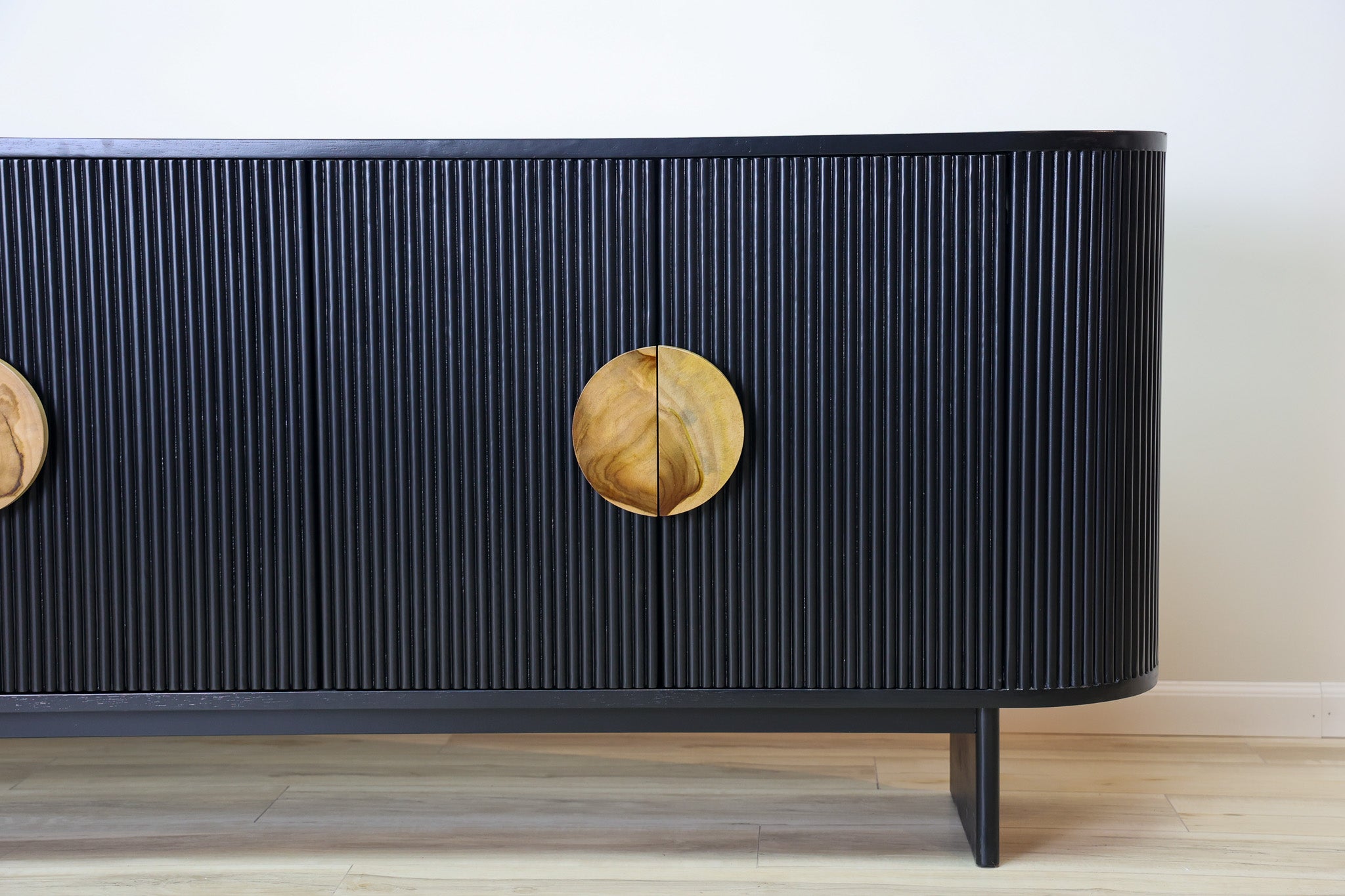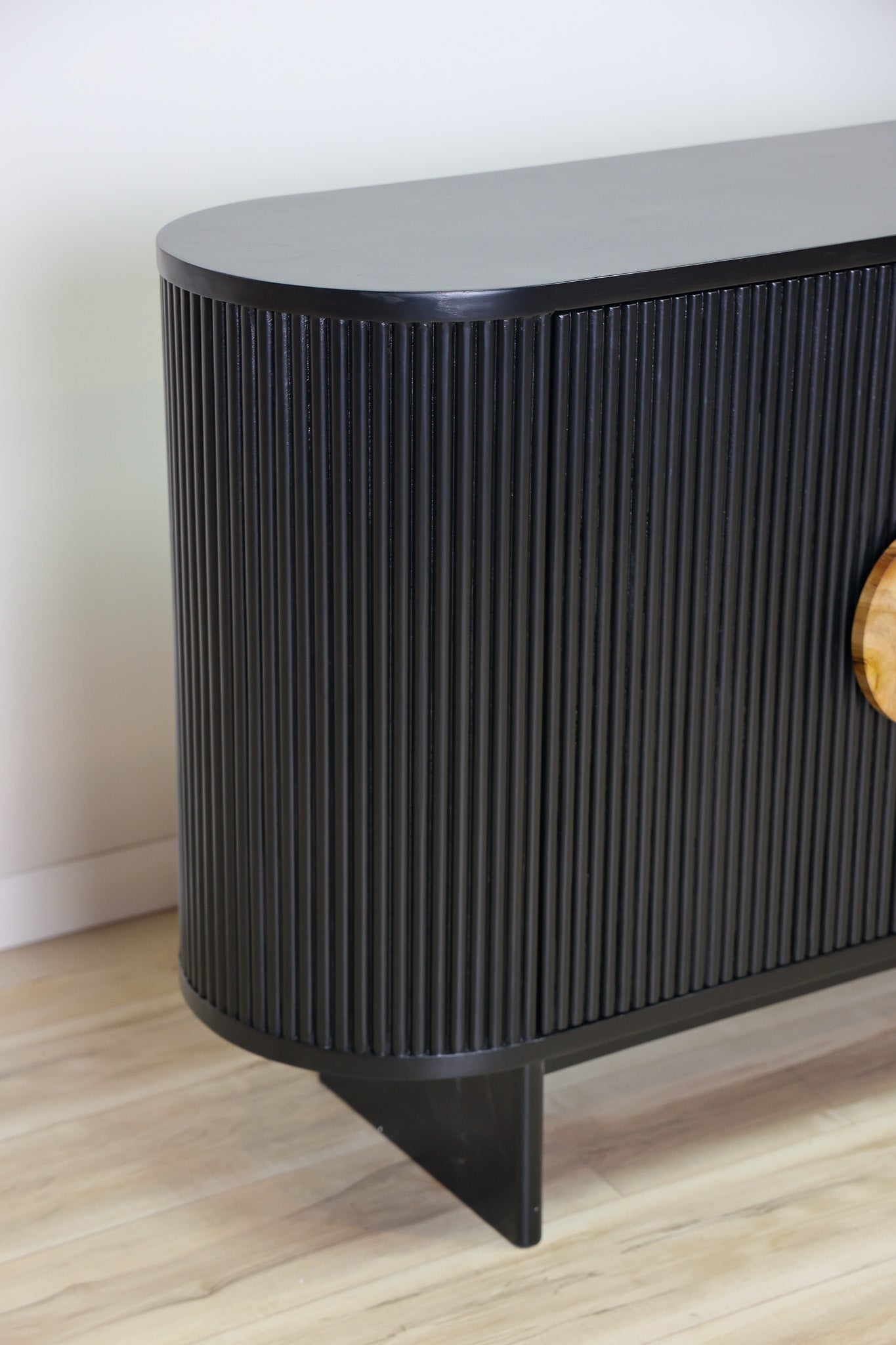 Introducing the Rafael Black Fluted Credenza, expertly crafted with rounded design and elegant black finish. This modern piece adds sophistication and style to any room, while offering ample storage space. Upgrade your home or office with this stunning credenza.