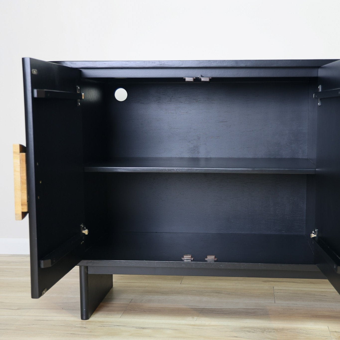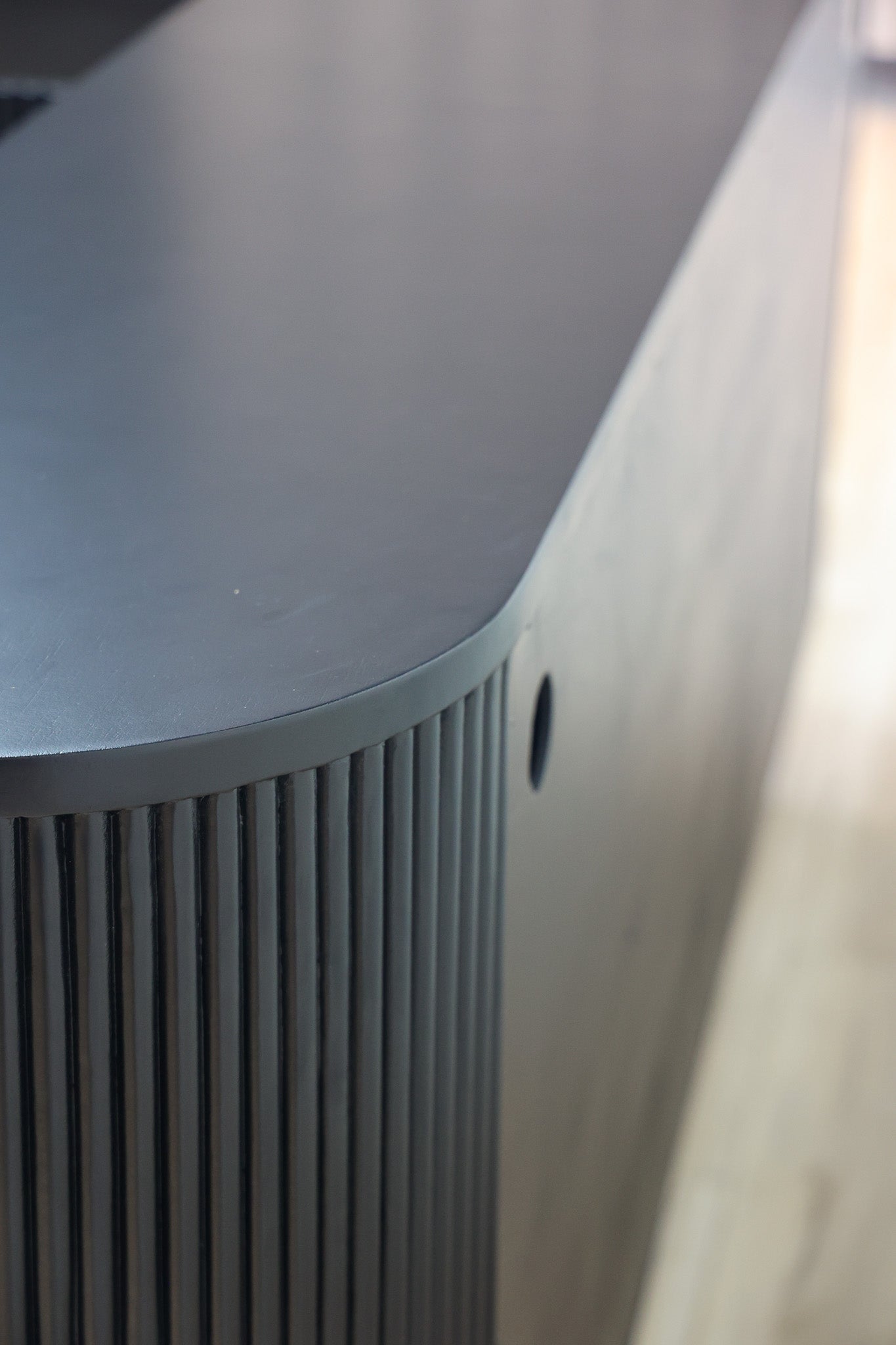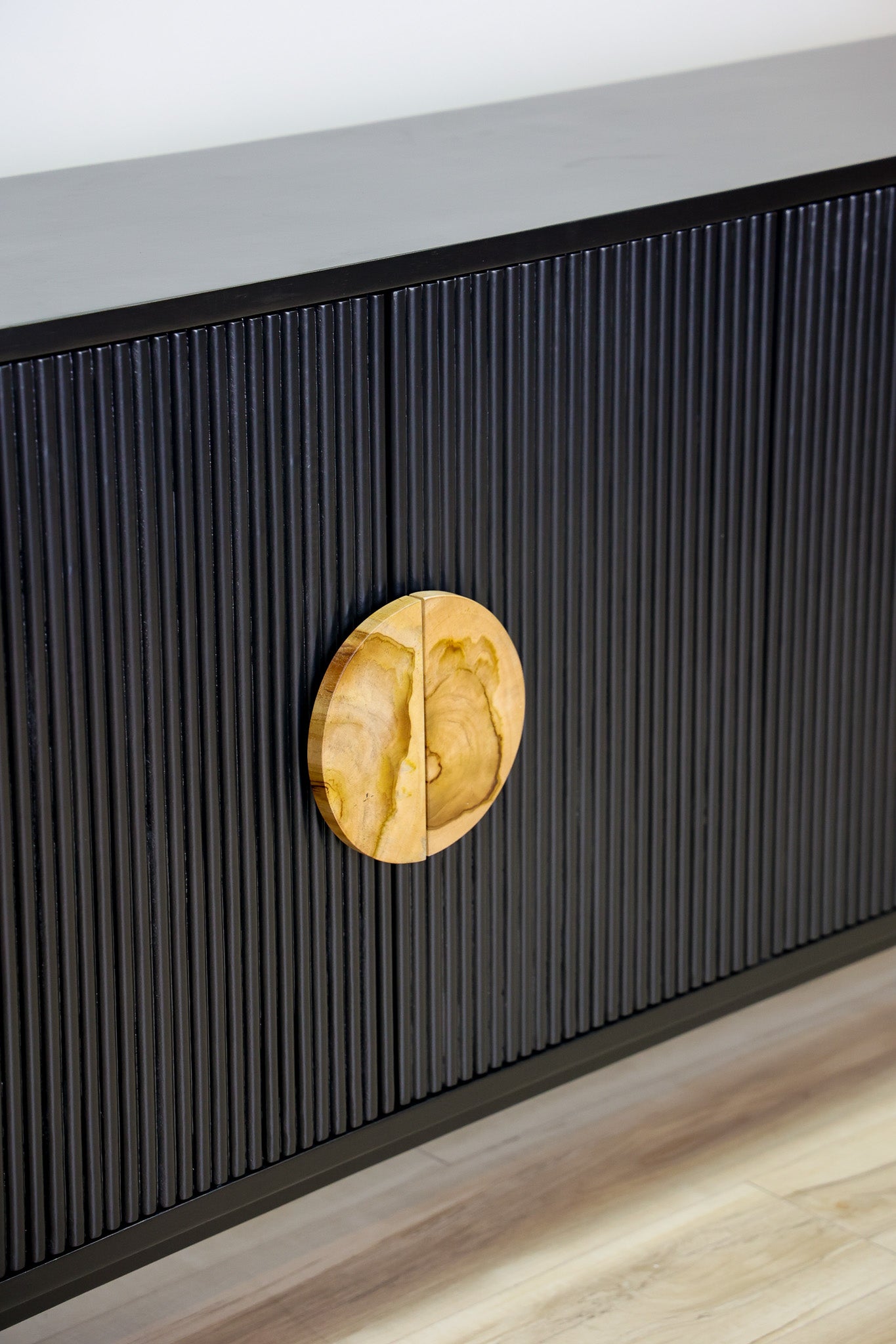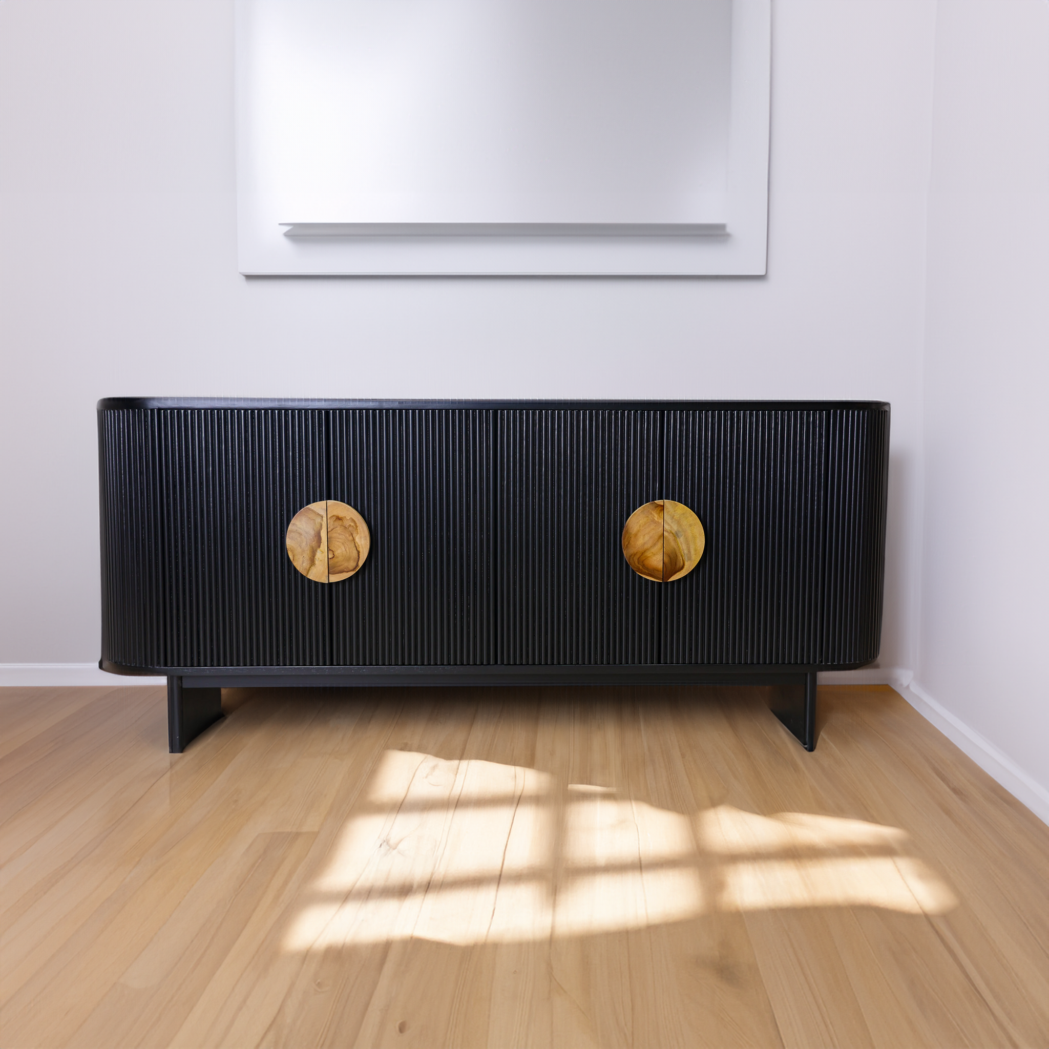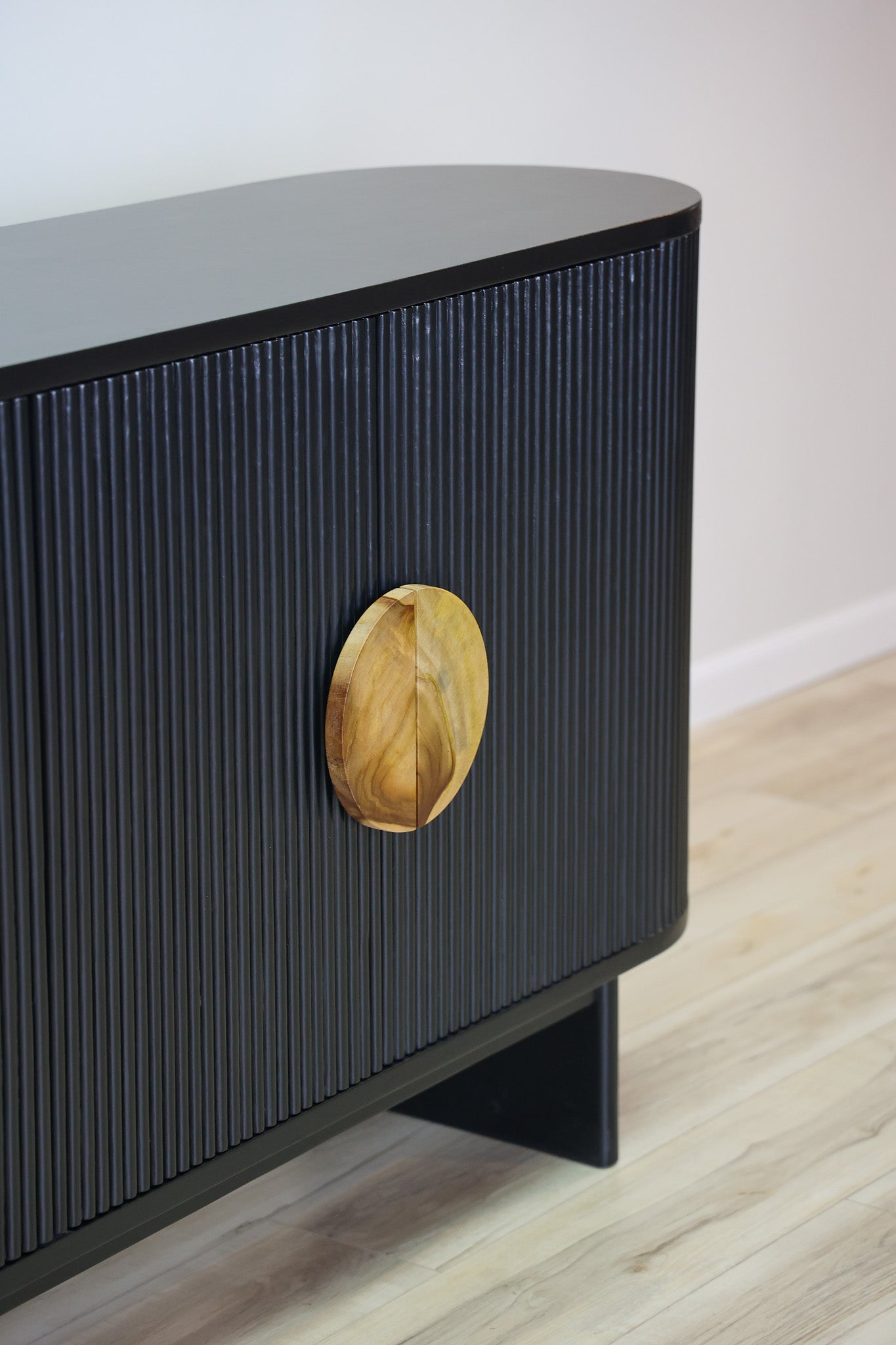 Introducing the Rafael Black Fluted Credenza, expertly crafted with rounded design and elegant black finish. This modern piece adds sophistication and style to any room, while offering ample storage space. Upgrade your home or office with this stunning credenza.