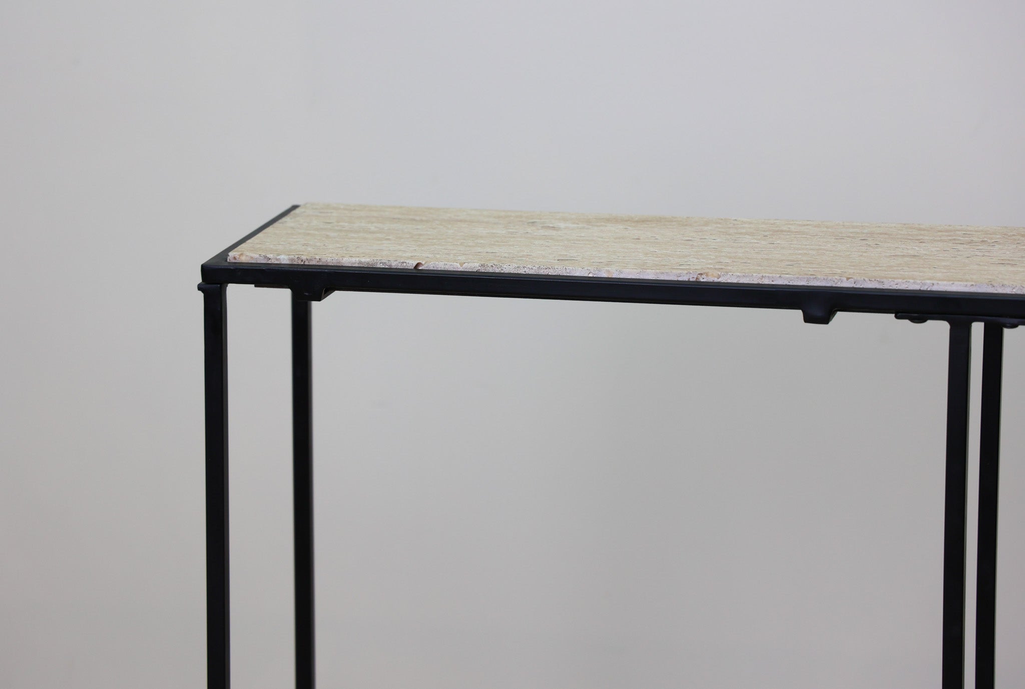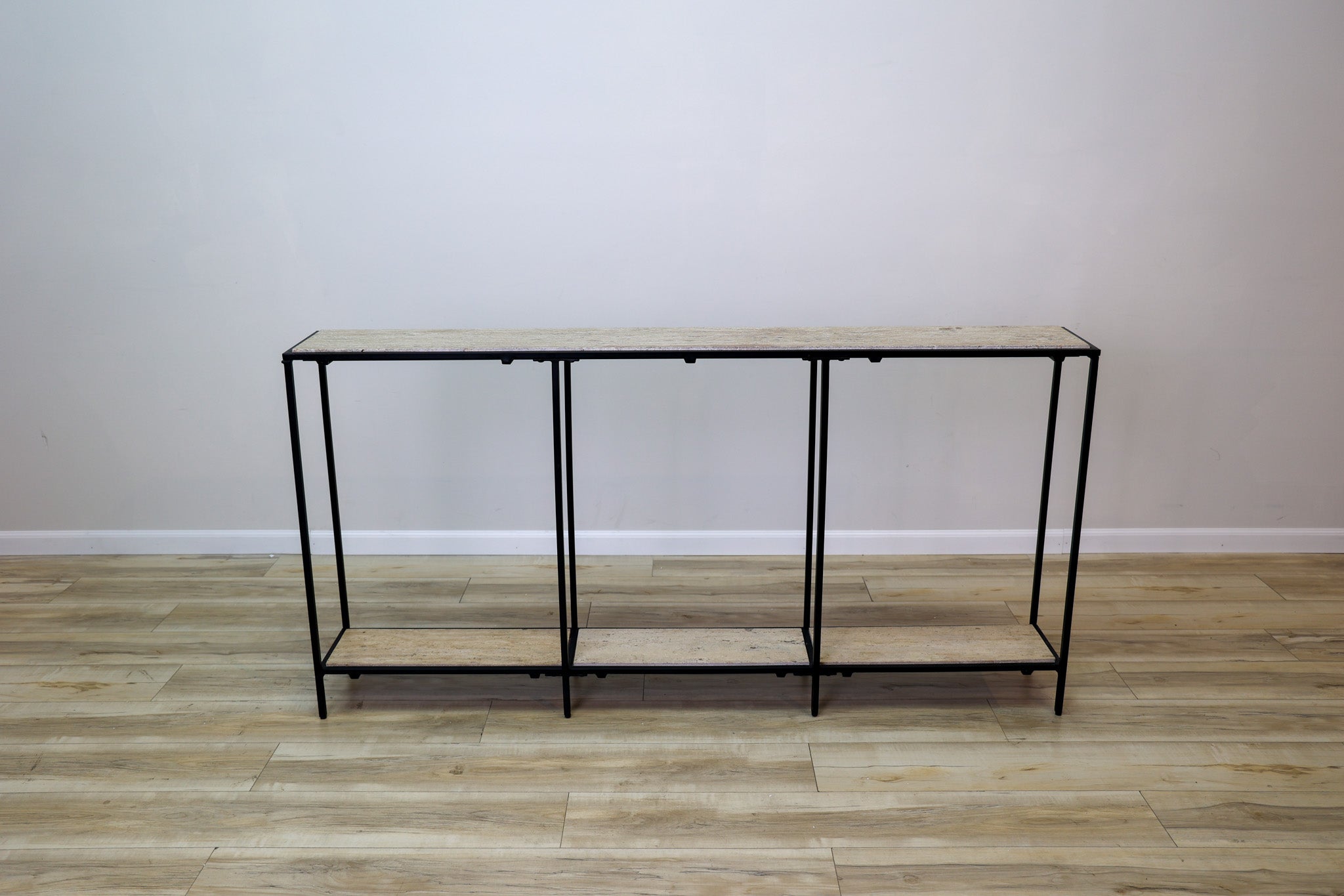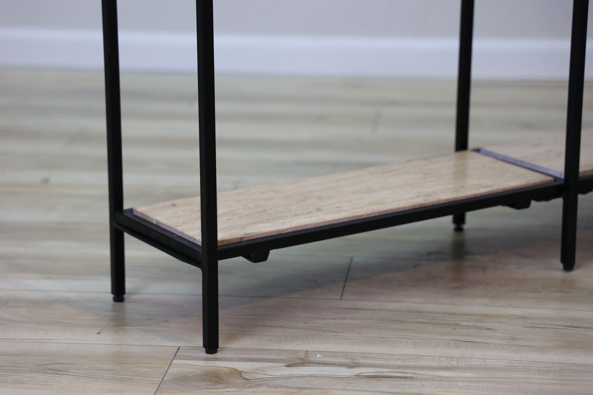 Blend natural and industrial styles with the Rocca Console Tables. Crafted with legs of sleek, black metal and shelves of natural stone, you can have the best of both worlds with this modern organic piece. Comes with two shelves allowing you to maximum storage space and functionality, with an open design that will still allow any space to breathe.