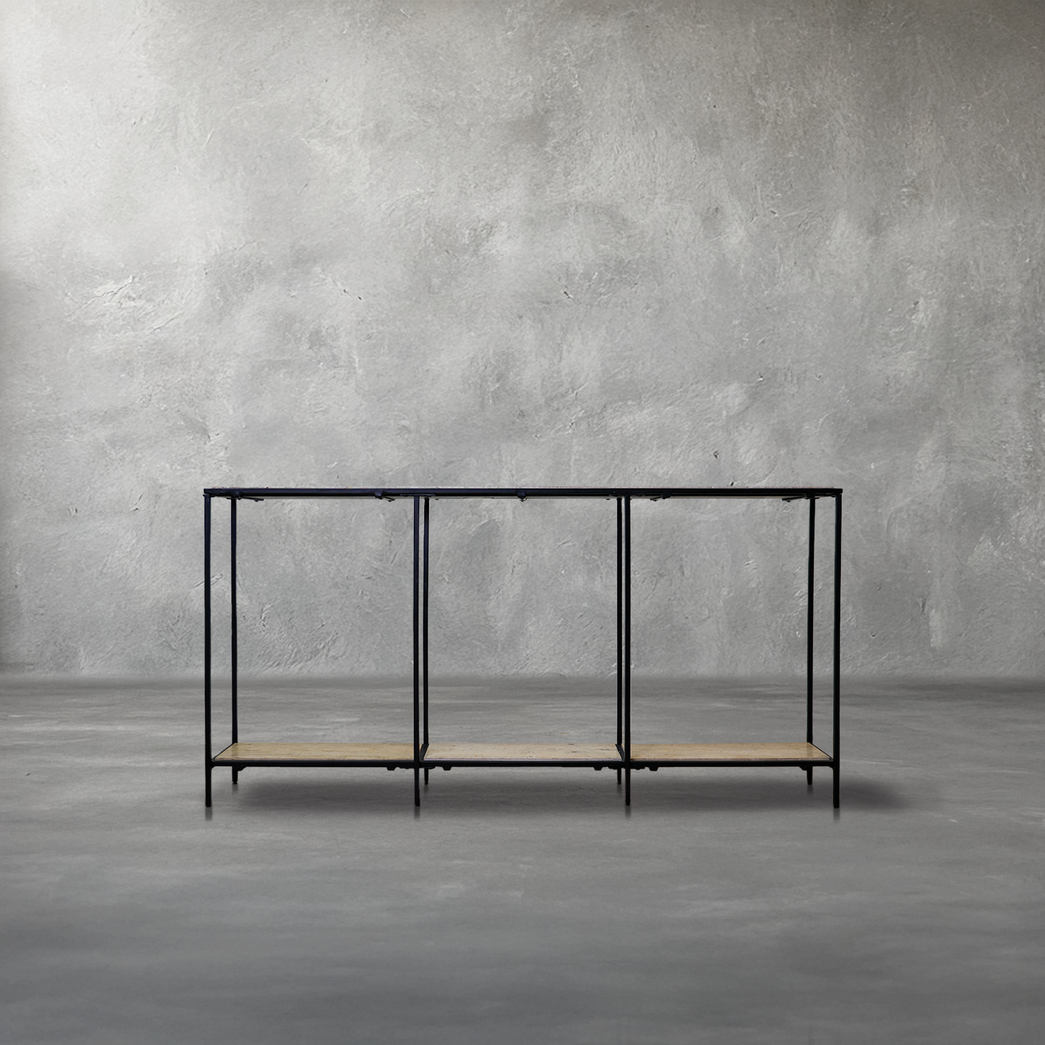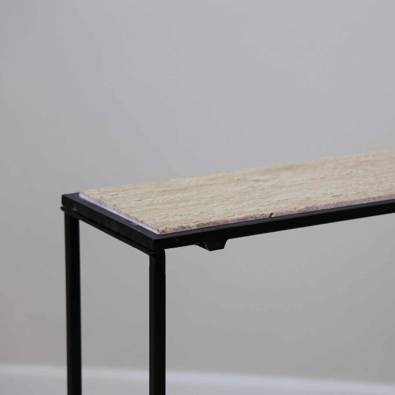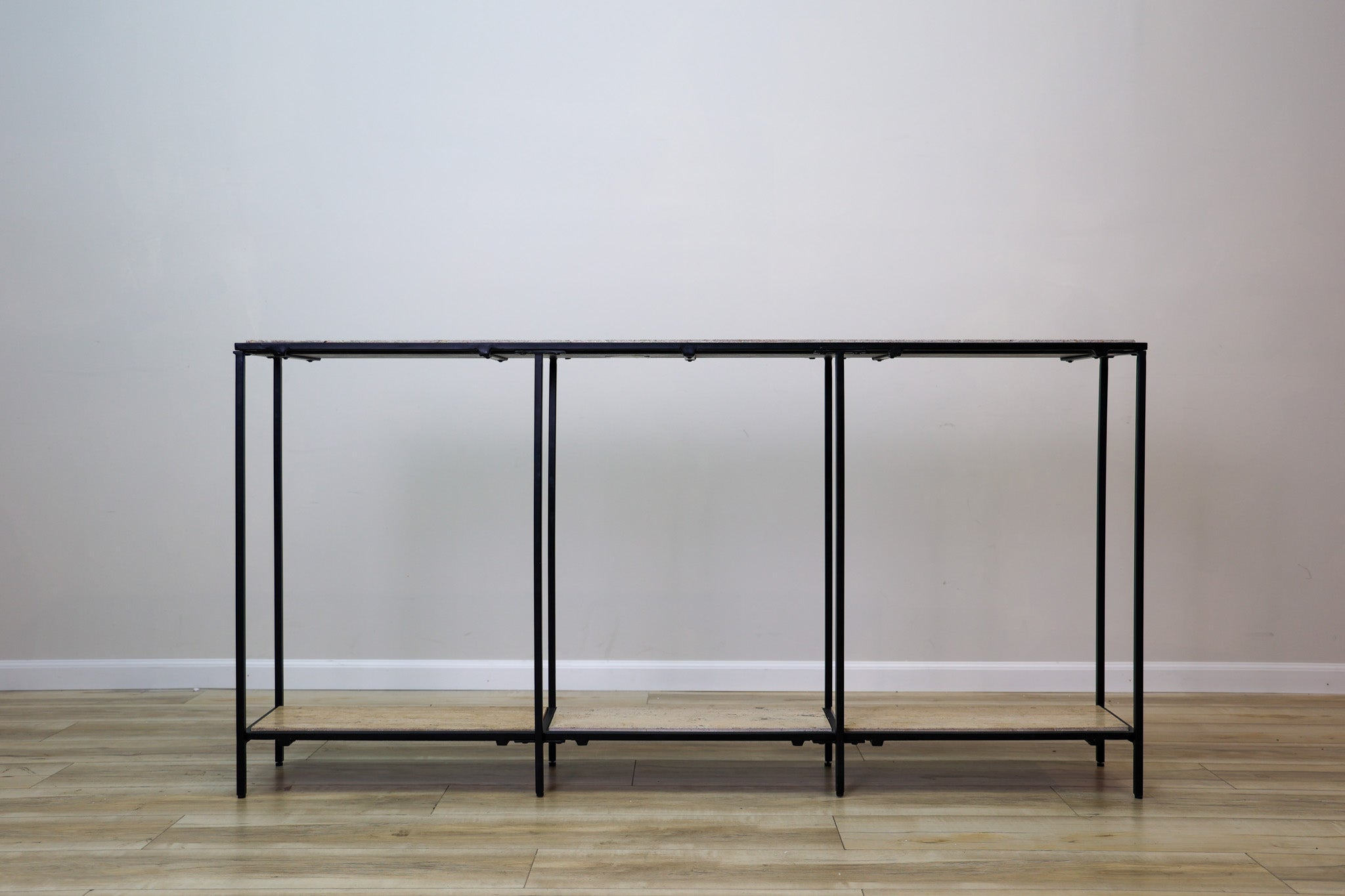 Blend natural and industrial styles with the Rocca Console Tables. Crafted with legs of sleek, black metal and shelves of natural stone, you can have the best of both worlds with this modern organic piece. Comes with two shelves allowing you to maximum storage space and functionality, with an open design that will still allow any space to breathe.