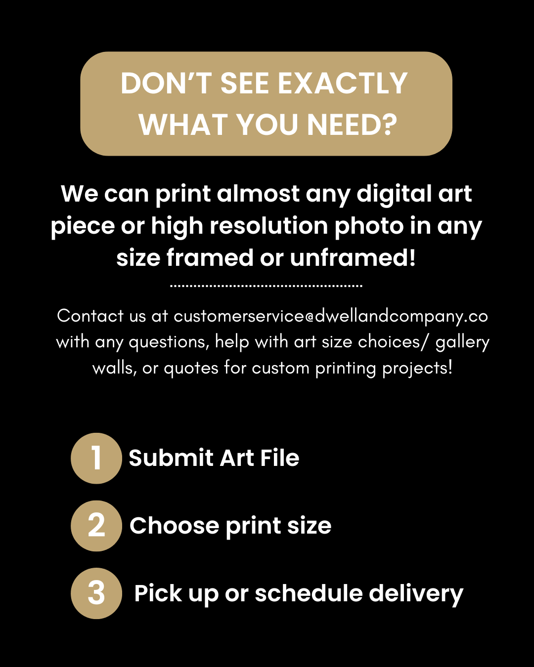Please allow 2-3 weeks for art to be printed in-house by your favorite Dwellers. Once a purchase is made, the team will begin working on your piece & contact you when it's ready for pickup or delivery!