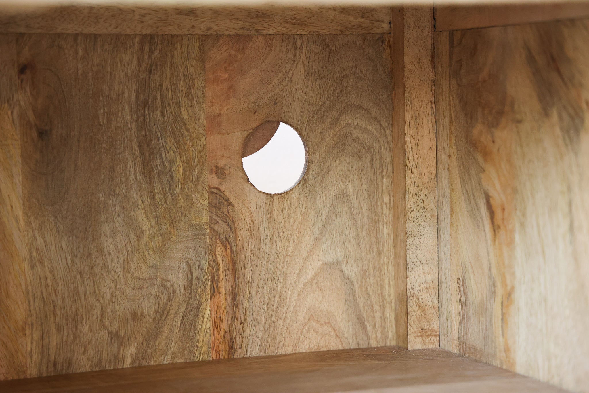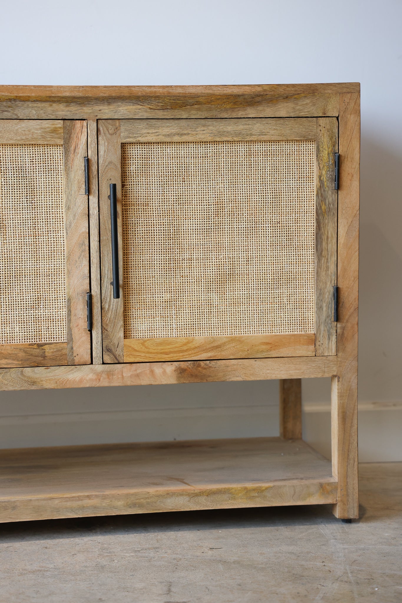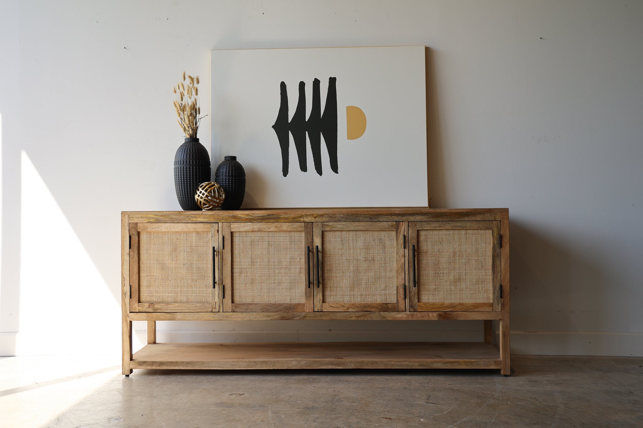 Warm wood tones and textured rattan are the highlights of this 76" Savannah Wood and Rattan Credenza featuring 4 doors and adjustable shelves inside. You'll find a long open shelf on the bottom to highlight your favorite decor pieces or place some shallow baskets for more storage.