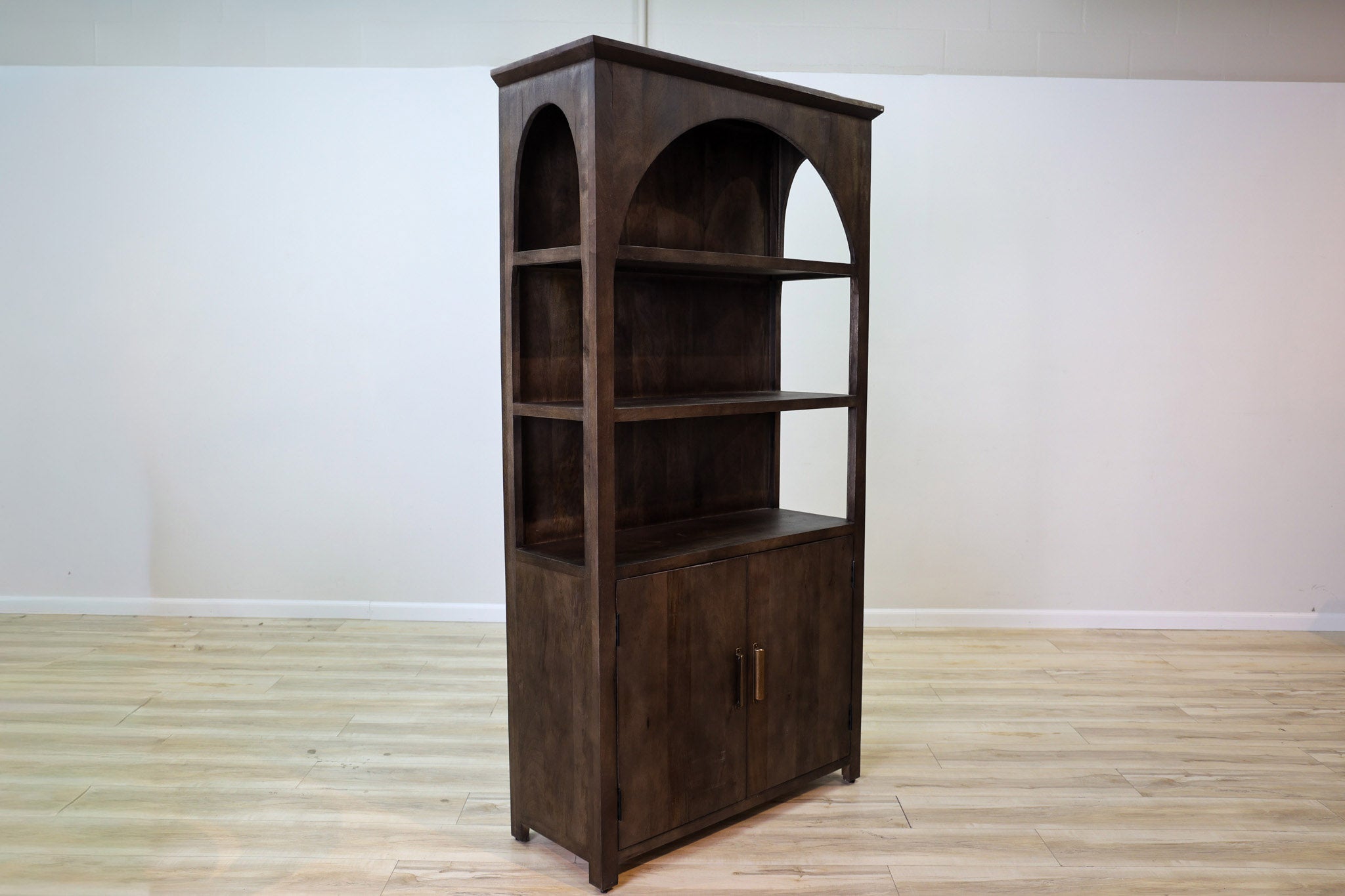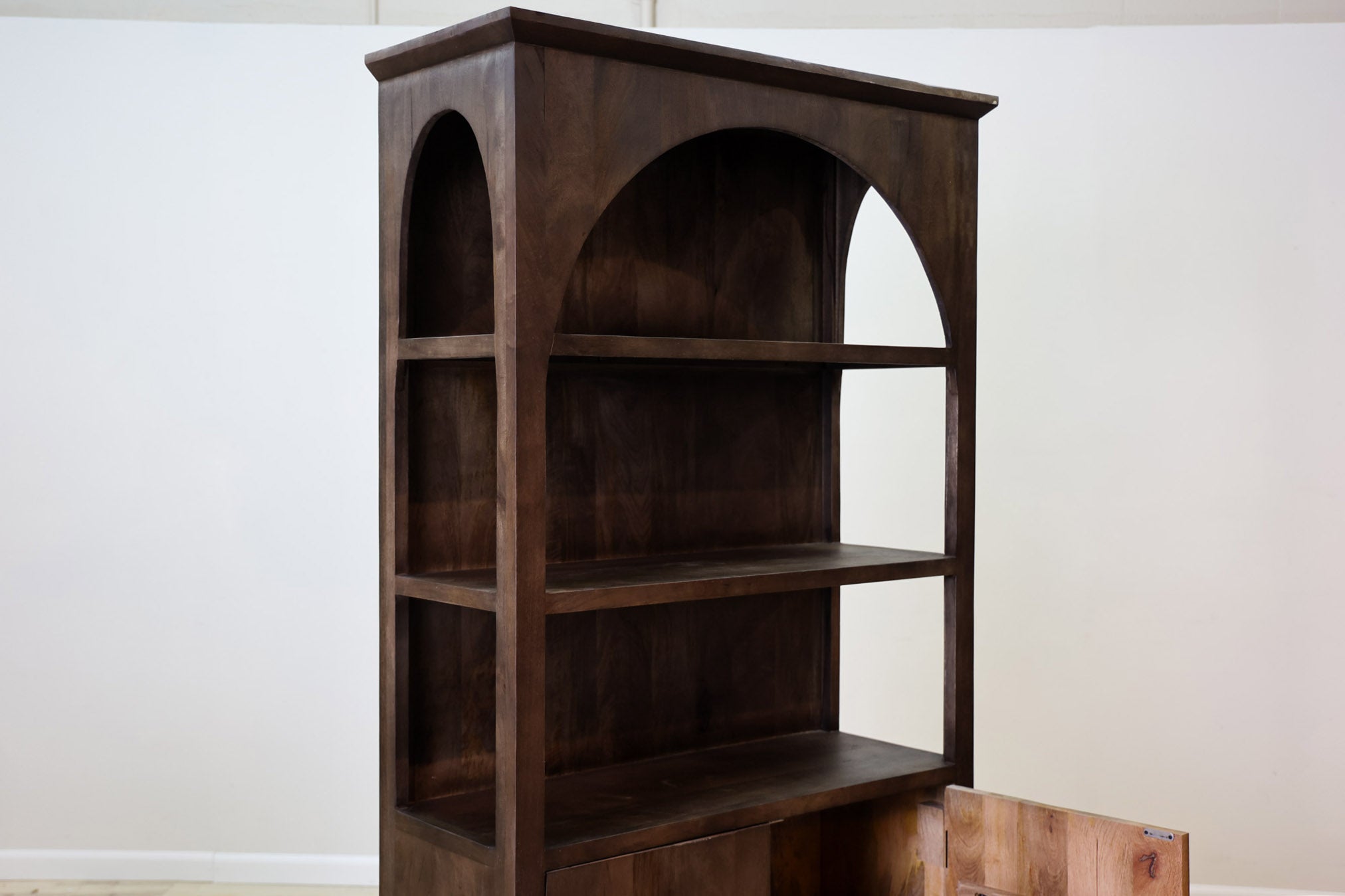 Versatile, elegant, sleek - the Selma bookshelf combines clean lines and classic arches to give a timeless touch to a sleek design. With both open and concealed storage, it's versatile in both style and function. Constructed with solid mango wood with a deep stain finish that darkens without covering the rich wood tones and variation that's staple of this wood - this isn't a pieces you'll want to miss out on!